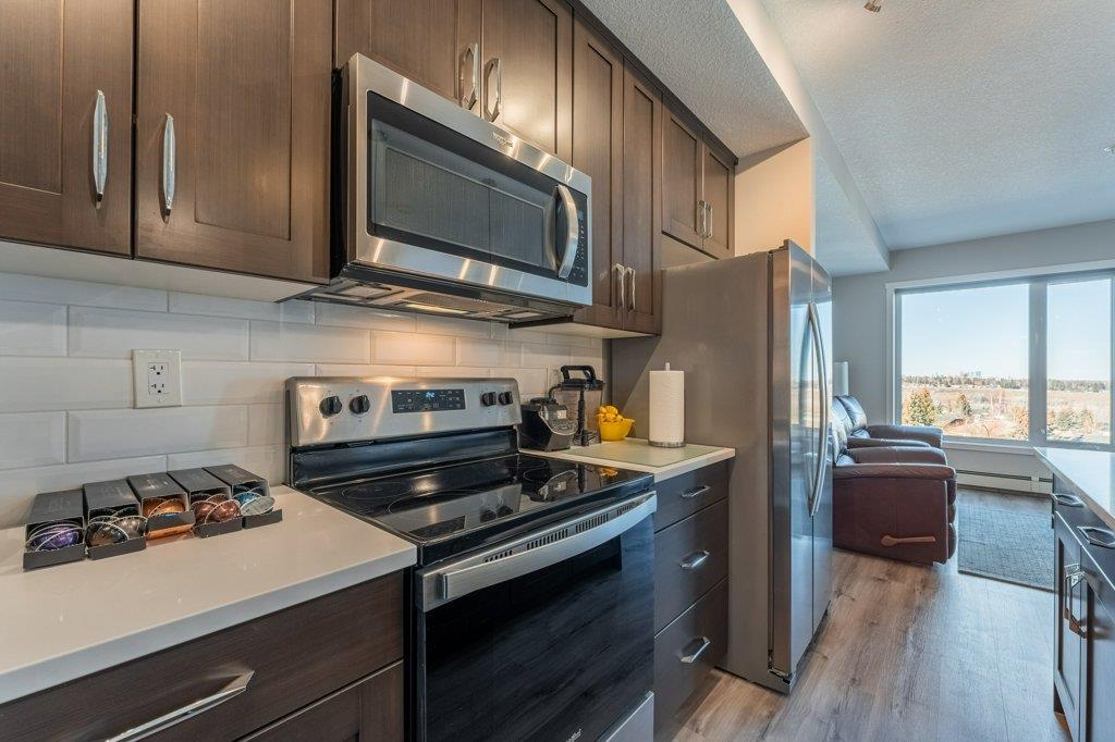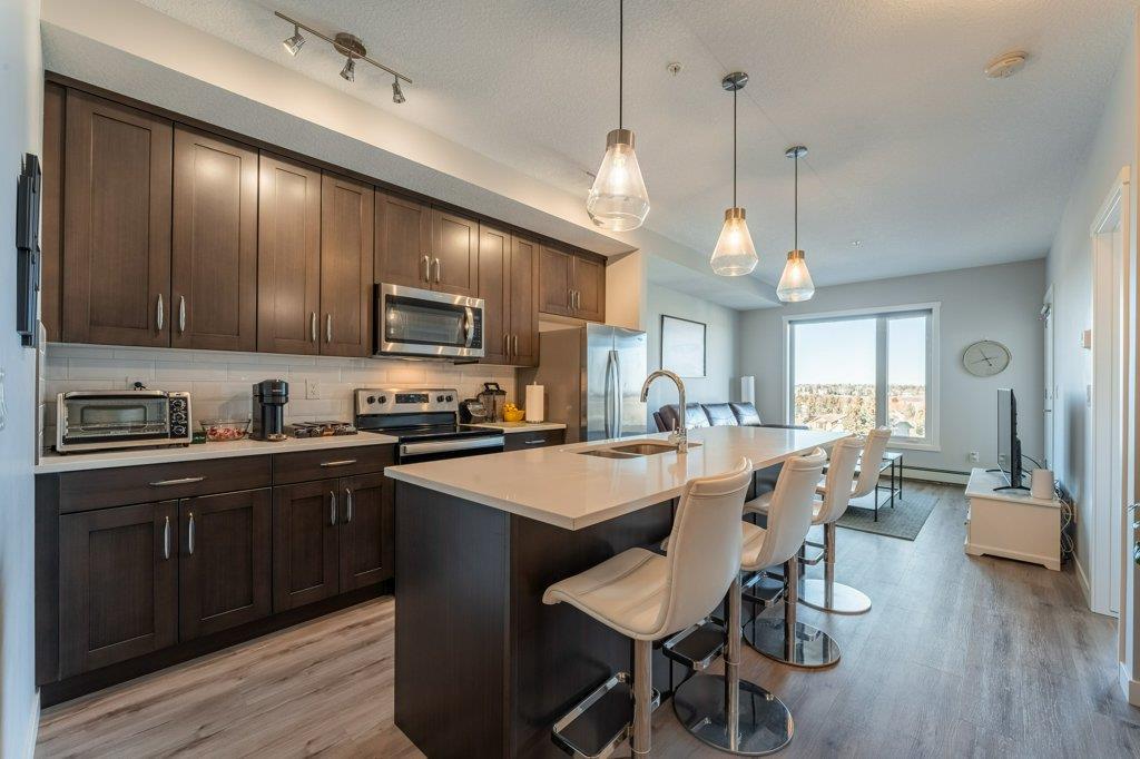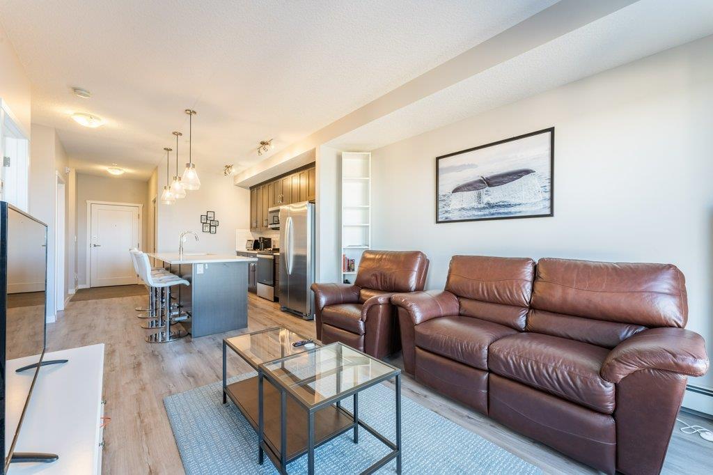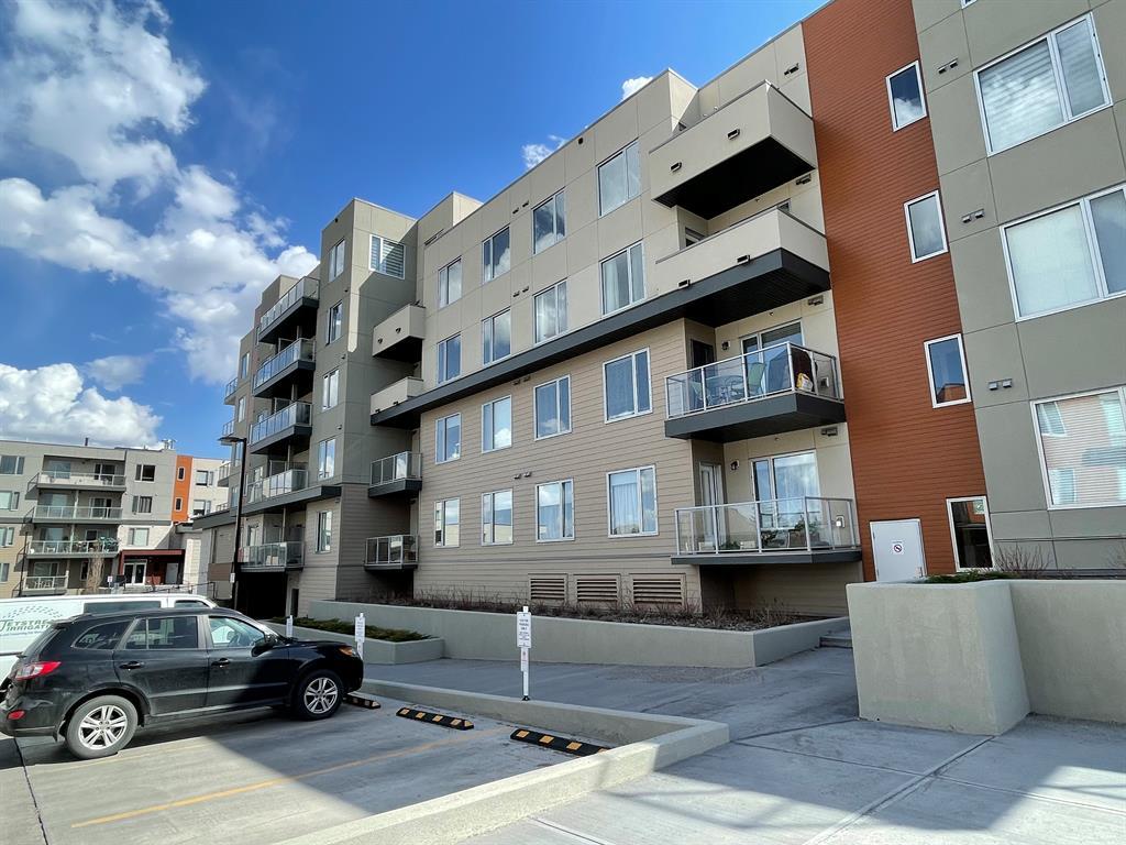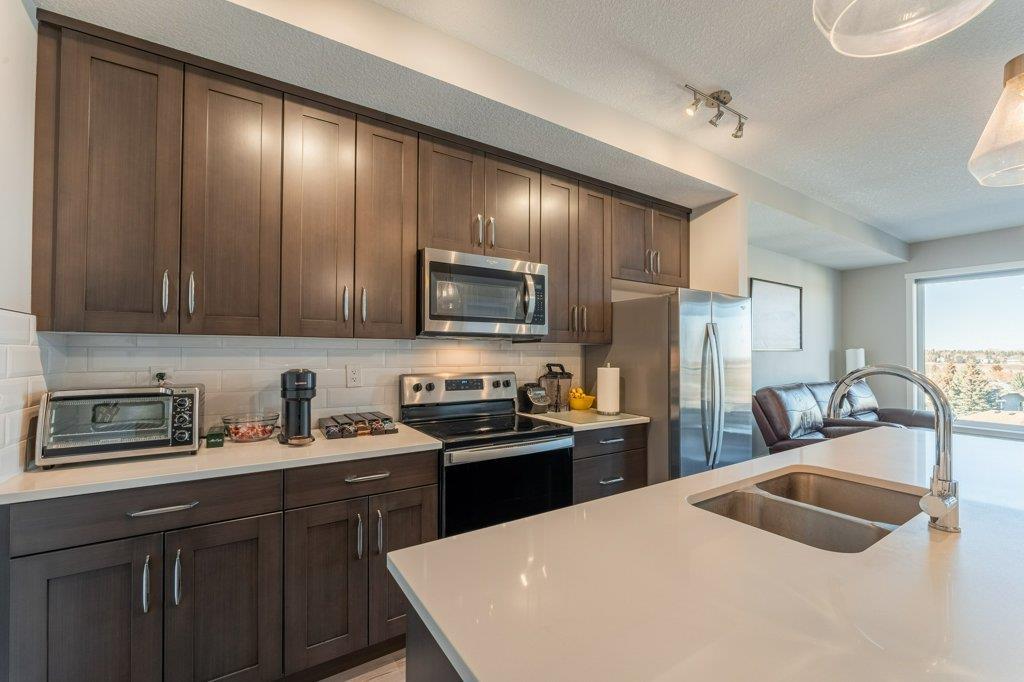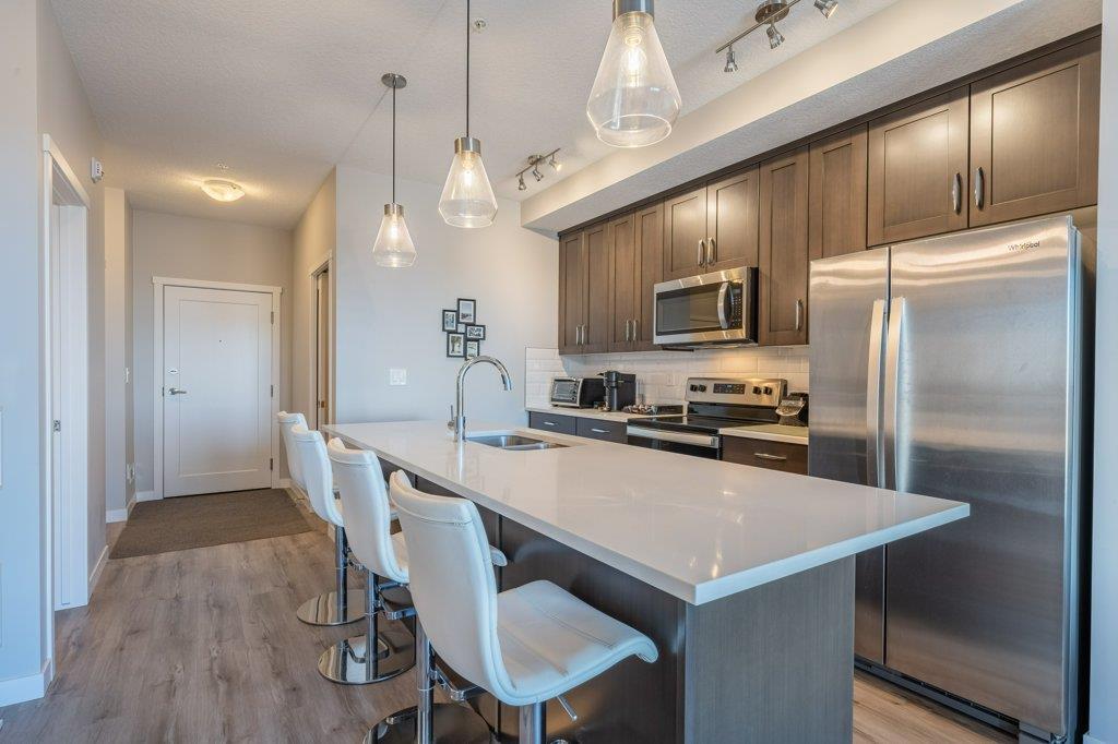Luxurious & Modern 1 Bedroom PLUS Den apartment, steps from C-train access, Walk/bike in Fish Creek Park—this unit offers views of Fish Creek park & a peek of the mountains. The apartment has convenient underground TITLED parking w/remote access for added security, as well as secure bicycle storage, TITLED storage locker, even a Dog Wash. It features a large balcony & exterior glazing w/low-e glass, allowing you to enjoy the beautiful views in a comfortable and energy-efficient environment. Access to exterior amenity areas incl community gardens, outdoor common gathering area and community courtyard. Enjoy Shawnee Park Regional Pathway system w/links to community parks & Fish Creek Provincial Park, perfect for walkers, joggers and bikers interested in a modern new unit, with nature and access to easy commute (bus/c-train). Inside the apartment, you will find a professionally coordinated interior color palette. The apartment has a high-quality solid-core fire-rated entry door with designer hardware. The unit has 9' ceilings (approx.) with knockdown texture finish (no popcorn finish), giving the space an open & spacious feel. LUXURY vinyl plank flooring upgraded throughout. Stylish closet doors with designer series hardware. GOURMET kitchen features contemporary, designer-selected, Shaker-style cabinets, convenient island w/breakfast bar. Premium QUARTZ countertop with tile backsplash, under-mount stainless steel sink w/pull out single-lever faucet and integral vegetable sprayer, & Energy Star-rated stainless steel appliance package are perfect for those who enjoy cooking. The apartment comes with an over-the-range, exterior vented microwave oven/hood fan, LED lighting in kitchen & dining areas w/designer-selected pendant lights above kitchen islands, & pot light upgrade in kitchen and dining areas.The spa-inspired bathroom features a vanity to complement kitchen cabinet selection, including premium QUARTZ countertop, TILE backsplash, under-mount sink and single-le ver faucet, as well as contemporary low-flush toilets, exterior vented exhaust fan, full-width vanity mirror.The apartment offers enhanced safety and security, including a secure entry telecom system in the lobby vestibule and an electric fob-based access system at the main building entry point. The apartment is fully equipped with sprinkler fire protection. Builder size: 691 sqft, see photos and Virtual Tour for Details. Come and experience luxurious living at its best! Call your favorite agent to book a viewing today. (id:22211)