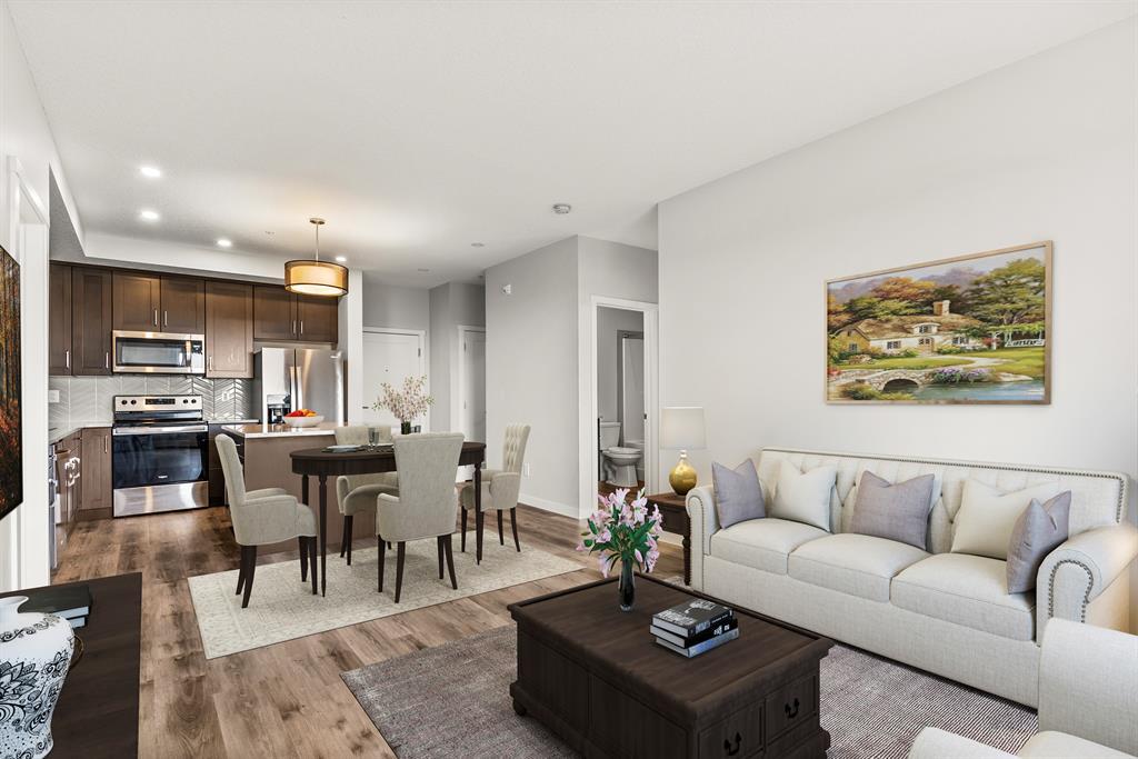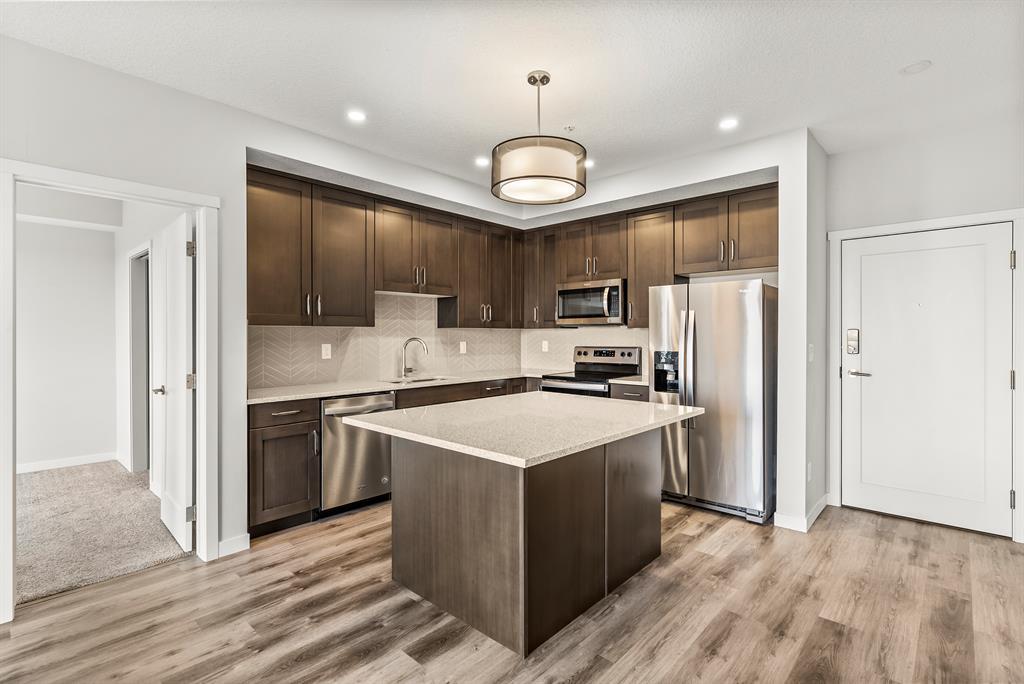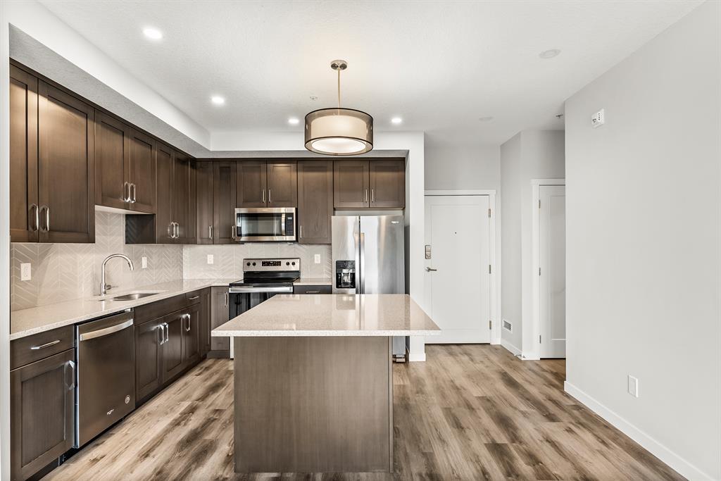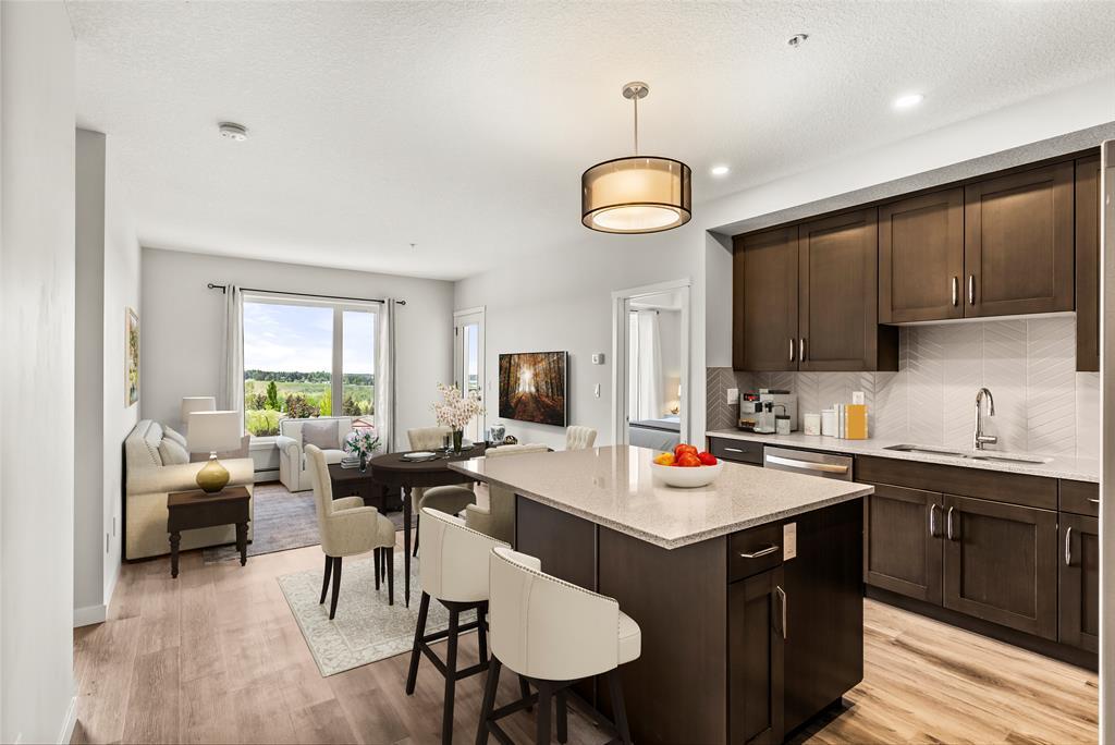 This is the perfect time to grab your dream apartment in an amazing location. The Fish Creek Exchange backs right onto the gorgeous Fish Creek Provincial Park and is located in the new community of Shawnee Slopes. No details were spared when making this gorgeous 2 bedroom, 2 bathroom condo; from the open concept floor plan, herringbone backsplash, mountain views, and the use of space. The moment you walk through the front door you’ll be imagining yourself soaking up everything this place has to offer. Direct sight lines to the large windows that overlook Fish Creek Park and bathe the livingspace is sunlight. The kitchen is modern and offers all stainless steel appliances, undermount sink, cabinet lighting, plenty of storage space, huge kitchen island and quartz countertops. The living room has access to a large patio perfect for your next summer bbq! The spacious master has a large window that looks out at downtown and the mountain skyline, it has its own ensuite bathroom and walk-in closet. This unit has an additional generously sized bedroom, a 4pc bathroom, and storage space with room for insuite laundry. Fish Creek Exchange also offers its residents underground parking, bike room and a secure storage locker. Next take a look around the gorgeous provincial wonder that sits right in your backyard. Fish Creek Park creates a gorgeous space for people to enjoy the outdoors all year round. Talk about the amenities of all amenities, a slice of heaven for you to enjoy whenever you want. The community has plenty to enjoy with retail shops close by, schools, dog park, restaurants and LRT station within walking distance to simplify your daily commute. This stunning condo sits in the perfect location and now it’s just waiting for you to make it yours! Call to get your showing today! (id:22211)