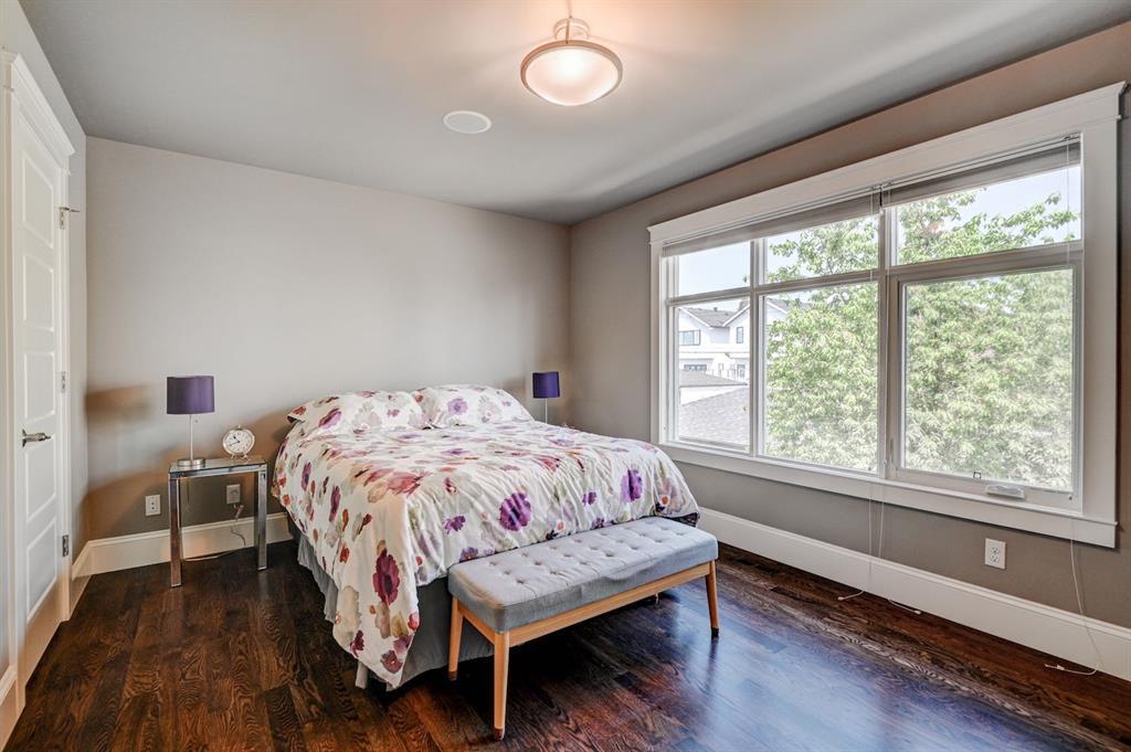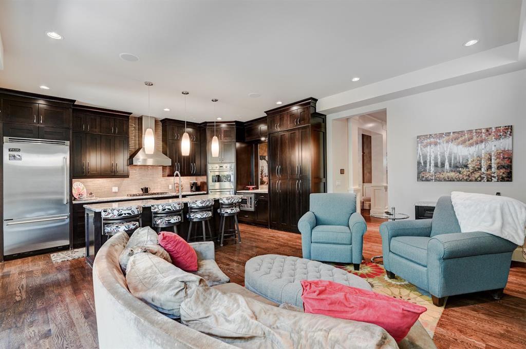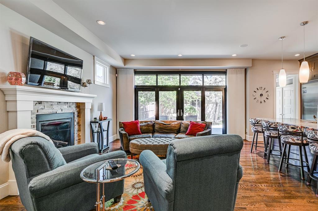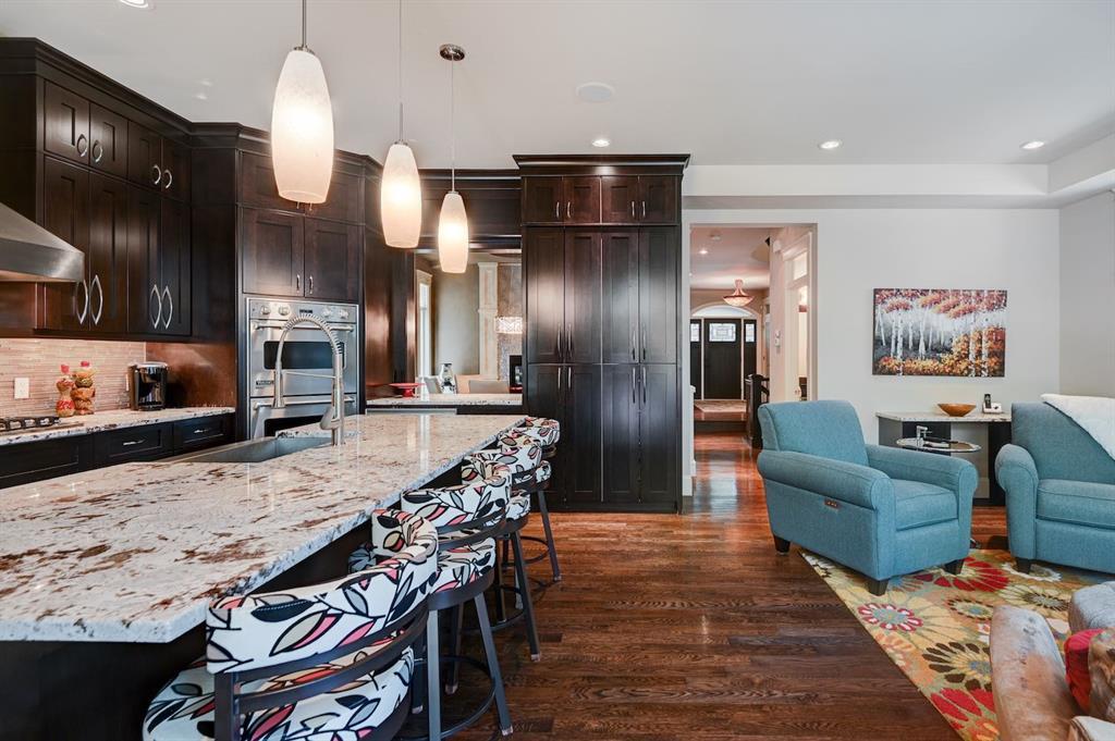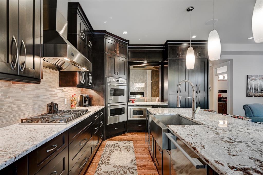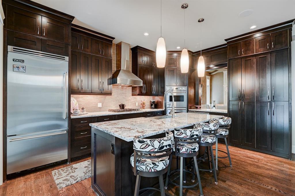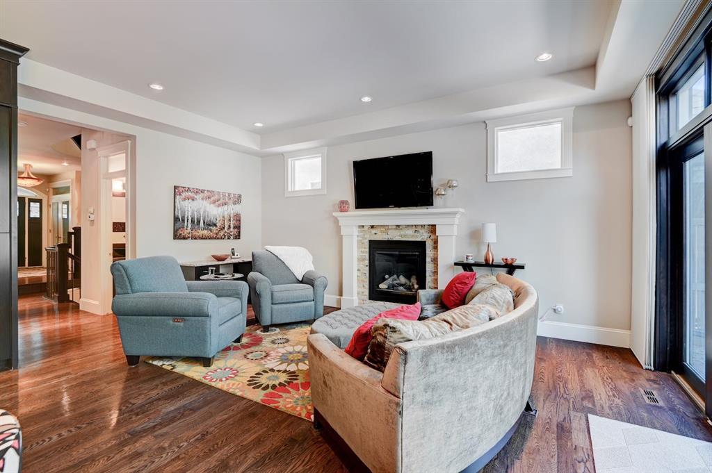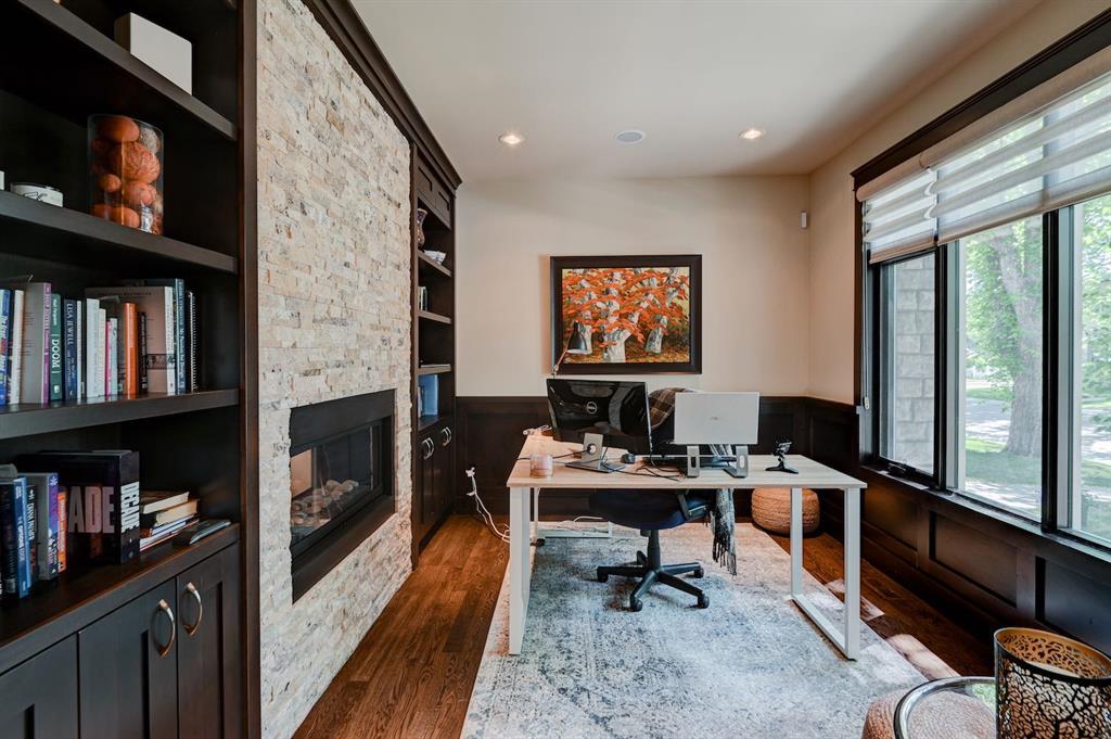 Ideally situated on a beautiful tree lined street, this immaculate and impressive home blends high-end finishes and exceptional millwork. A grand foyer welcomes you inside the home where you'll instantly notice the stunning hardwood floors. A front home office overlooks the street while gorgeous built-in shelving surrounds the two-way fireplace that is shared with the dining room. The family dining room features elegant wainscoting details, gorgeous architectural detailing on the ceilings, boasts a unique serving window to the chef's kitchen. Your inner chef will be inspired in this superior kitchen with espresso cabinetry, several pull-out drawers, large extensive eat-up island, and high-end Viking and Miele appliances. A dramatic open riser staircase leads up to the second level hosting a convenient laundry room and two gracious bedrooms, all suited with walk-in closets, including the master retreat. The serene master features large windows, a sitting area with access to the private south exposed balcony, and a luxurious 6pc ensuite with his/her sinks, soaker tub, and shower with body sprays. A quick trip up to the third level where you're greeted with a bright bonus room and third bedroom suite with a full ensuite. The fully finished basement is an entertainers delight with heated concrete floors, games are with custom shelving, family room and large wet bar. French doors open up into a cozy den while a massive fourth bedroom can ideally function as a home gym. The rear yard is treed and private, which makes it lovely for weekends and evenings spent outdoors and features and oversized double garage. Steps away is the Mount Pleasant Community Sportsplex and Outdoor Pool where you can enjoy year-round activities or take a short stroll over to the pathways of Confederation Park. This exemplary home is ready for your family and one you won't want to miss out on. (id:22211)