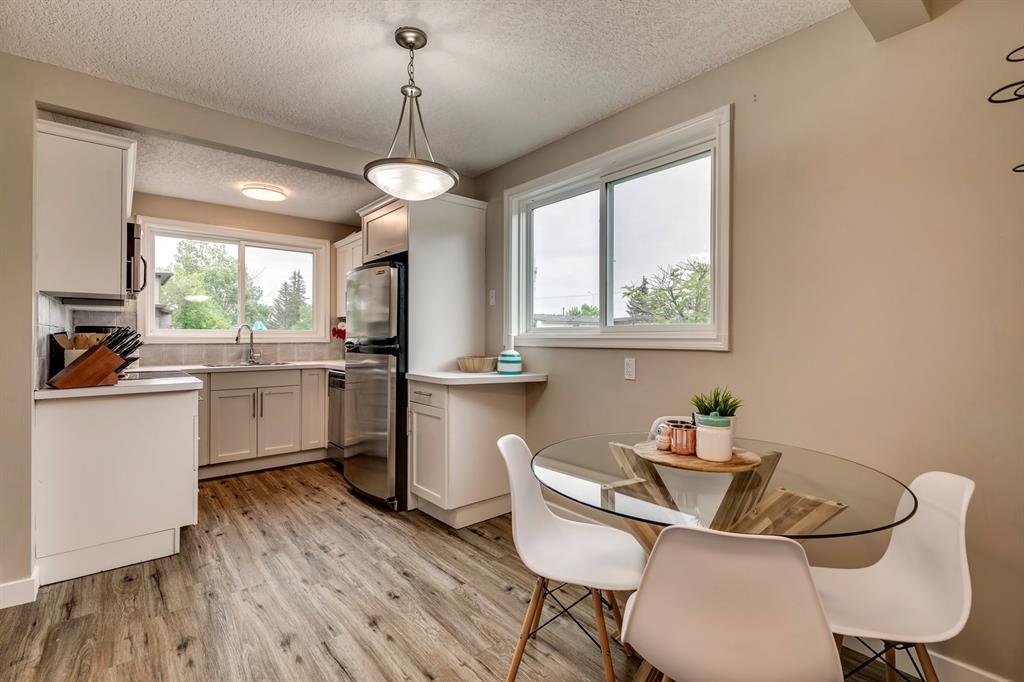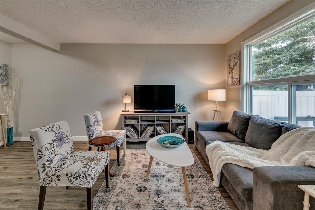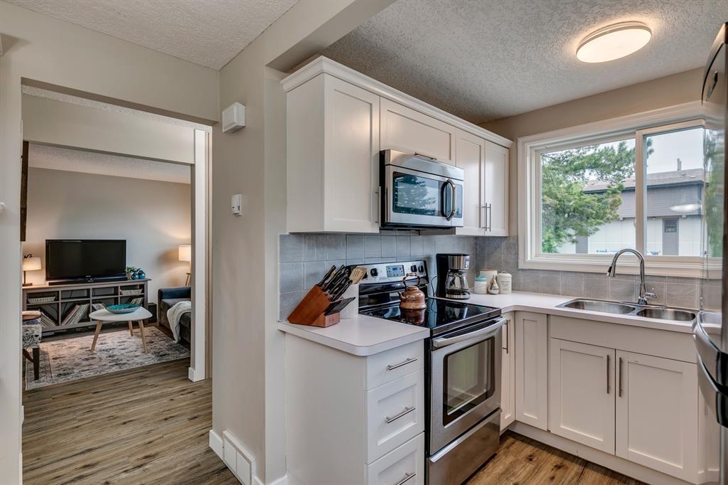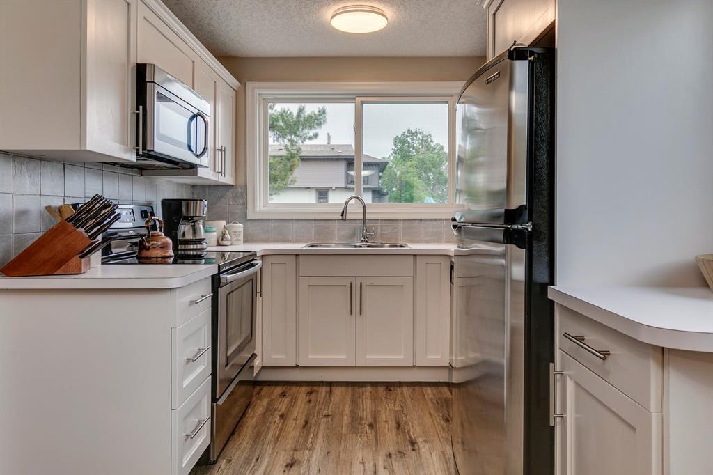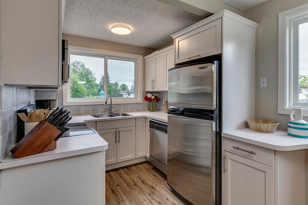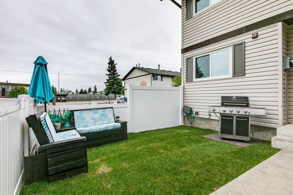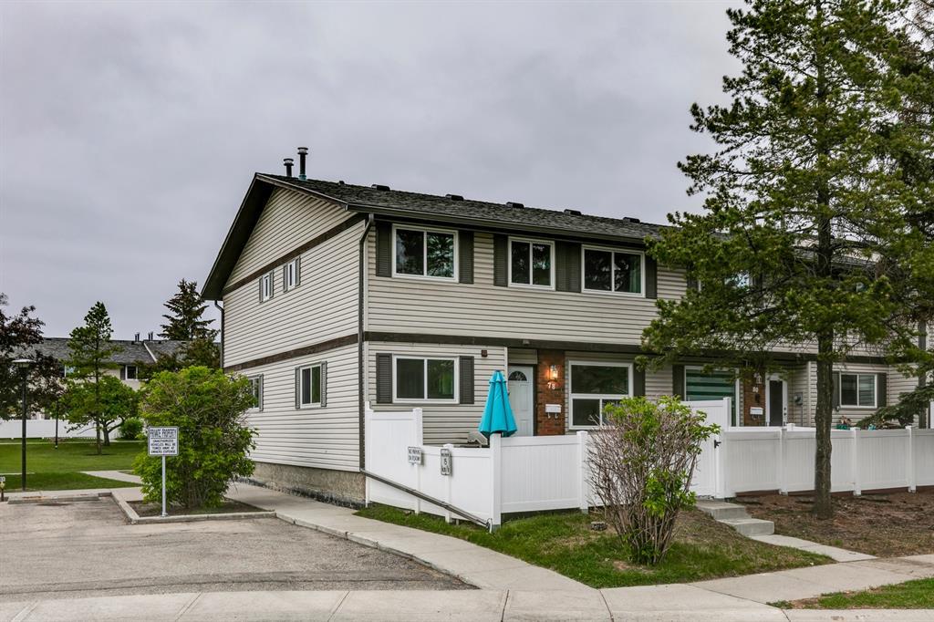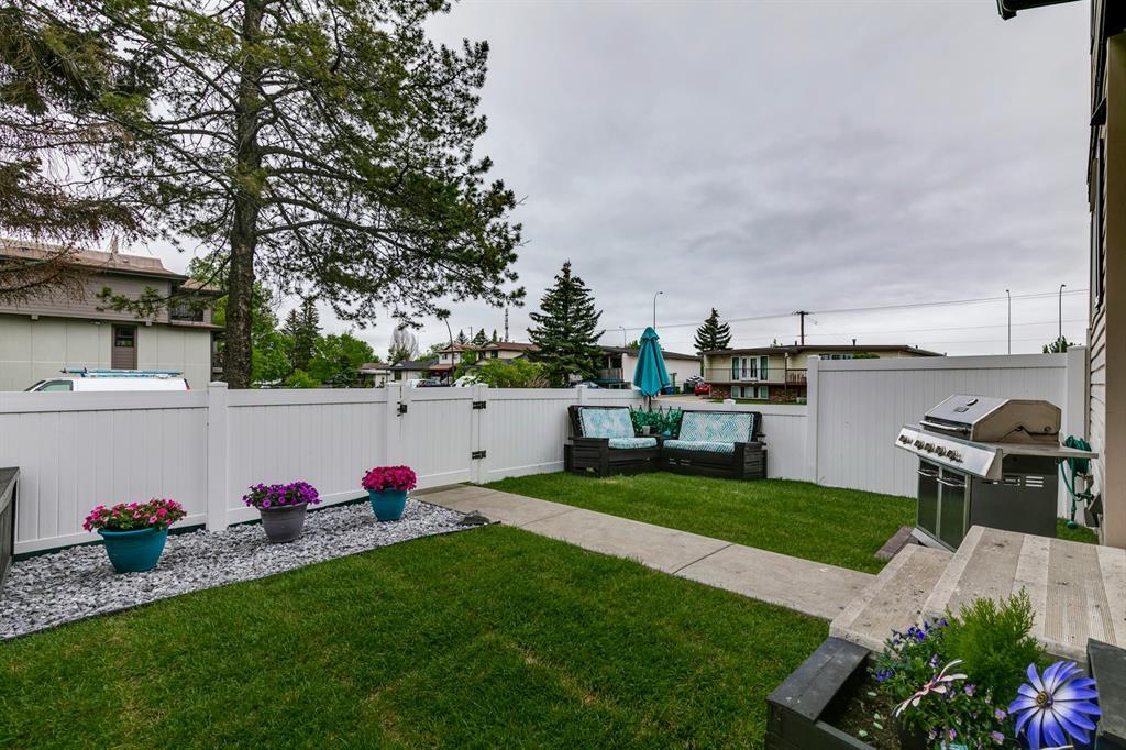 Nicely updated townhome in a pet-friendly complex in Braeside. This end-unit offers a spacious floor plan. You are greeted with a newly landscaped outdoor space with all new sod, gas hook up for BBQ, crush and fully fenced in (great for pets). You are greeted with a spacious foyer and new LVP flooring and knock down ceilings throughout the main floor. The eat-in kitchen features new countertops, stainless steel appliances, newly refinished white shaker door cabinetry including built-in hutch for necessary storage. A bright expansive living room is flooded with natural light and overlooks mature foliage. Main floor powder room is convenient and great for guests. Upstairs you will find a king-sized primary bedroom with walk-in closet, 2 generous bedrooms, updated 4-piece bathroom with new vanity, soaker tub with ceiling height marble tile. The lower level is fully developed with ample space for rec room + games area/play space, or home gym! Freshly painted home including doors, banisters and trim. Other recent upgrades: Carpet on second level, LVP flooring 2023, Hot water tank 2020. The complex has recently upgraded all vinyl fencing, windows (May 2023) and roof. This condo is move in ready and is steps away from local shopping complex, Braeside Park, and offers close proximity to all levels of schools, Southland Leisure Centre, Community Centre, Glenmore Reservoir, and ring road making the entire city easily accessible. (id:22211)