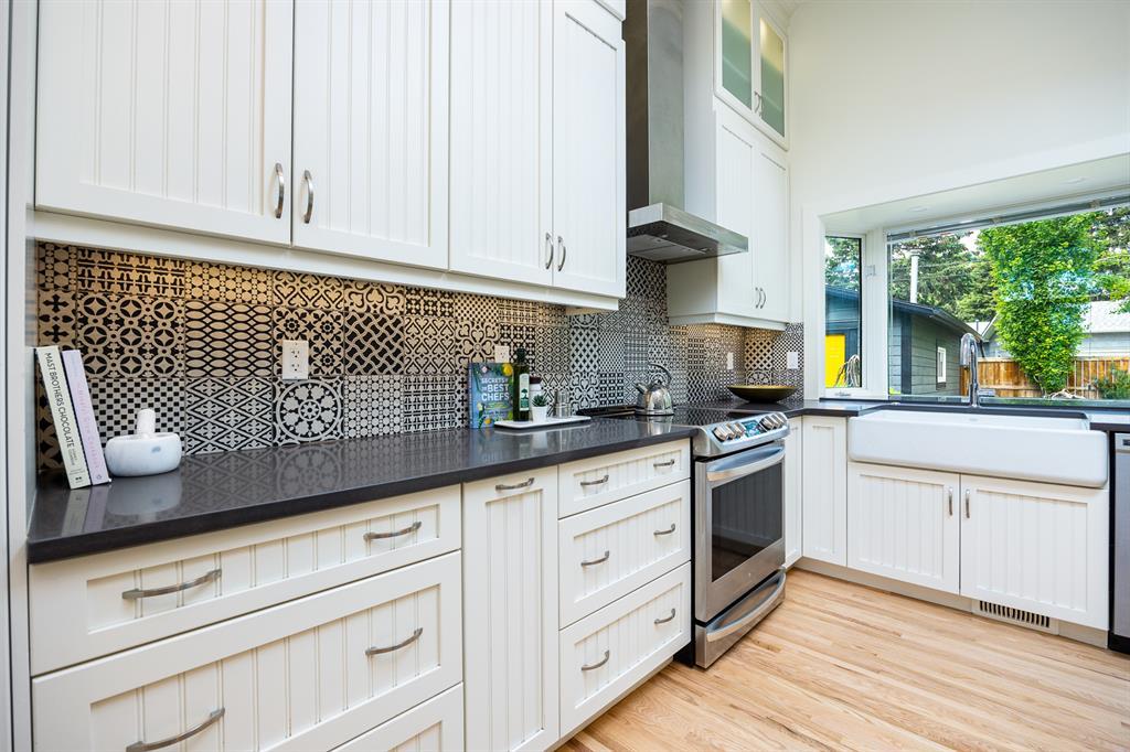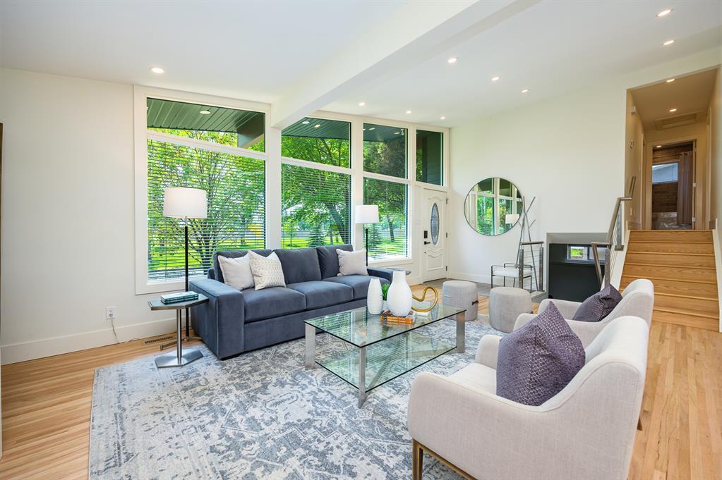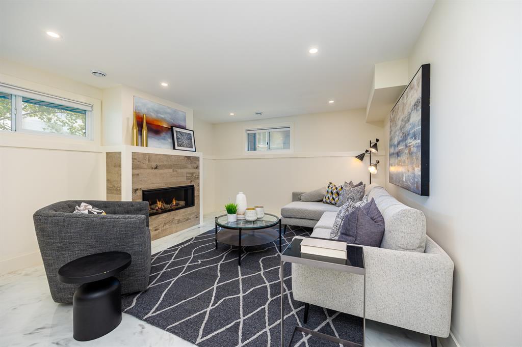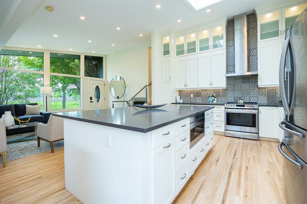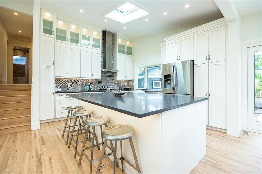 Modern and extensively updated, this bright and open (with over 2,400 sqft of developed space) four bedroom, four level split has it all. Sunlight pours in the huge windows and skylight (replaced in 2019) showcasing the vaulted ceilings and well appointed kitchen - enormous quartz island, extra under and in cupboard lighting, wine fridge and stainless steel appliances. Hardwood floors on the upper two levels, tile in the bathrooms (heated in the primary ensuite) and fabulously rich looking (and durable) polyurethane floors on the lower two levels. The dining area is complemented by a Tesoro folding door system so you can effectively blend indoors and outdoors. Major interior renovations in 2016 include two gas fireplaces with remotes, spray foam insulated vaulted ceiling with other component upgrades since - water softener (2017), HE furnace with DC motor & humidifier (2017), central A/C (quieter design), flooring refinish & painting (2023). Exterior updates in 2017 include Hardie board siding, Proslat wall trim in the garage, roof, eaves, and fencing (2018). Three full bathrooms - ensuite with dual sinks, bedrooms with closet organizers, and the lower floor rec room has another bar fridge plus a custom home gym area with a 10 mm glass door and rubber flooring. There's also a generous storage room so you have room for everything. Extra lighting in the soffits, front and rear, plus an oversized, insulated, and heated double garage (with 220V) round out the well landscaped backyard (two patio areas) with two gas lines. Full sprinkler system and paved back lane are a further bonus. Well loved by the community, there's a popular greenspace/dog park out front. This well cared for home is ready for it's next family, so book your private showing today. (id:22211)