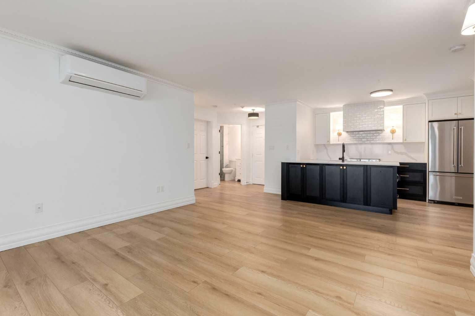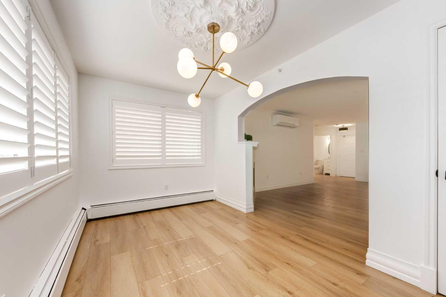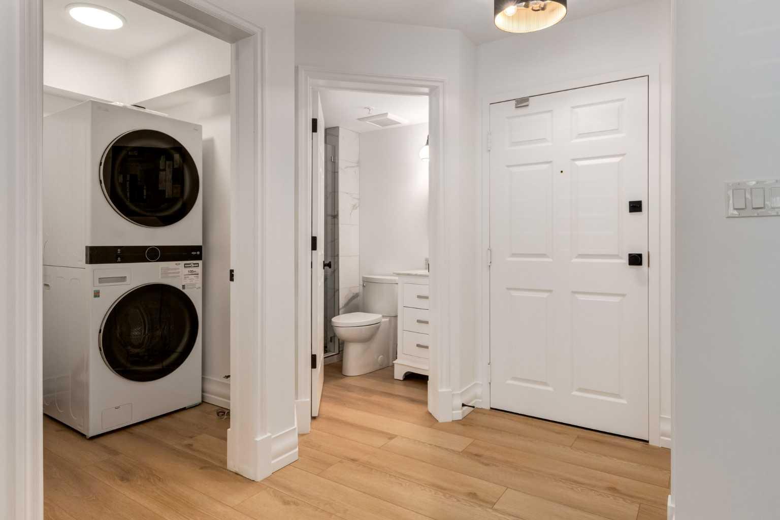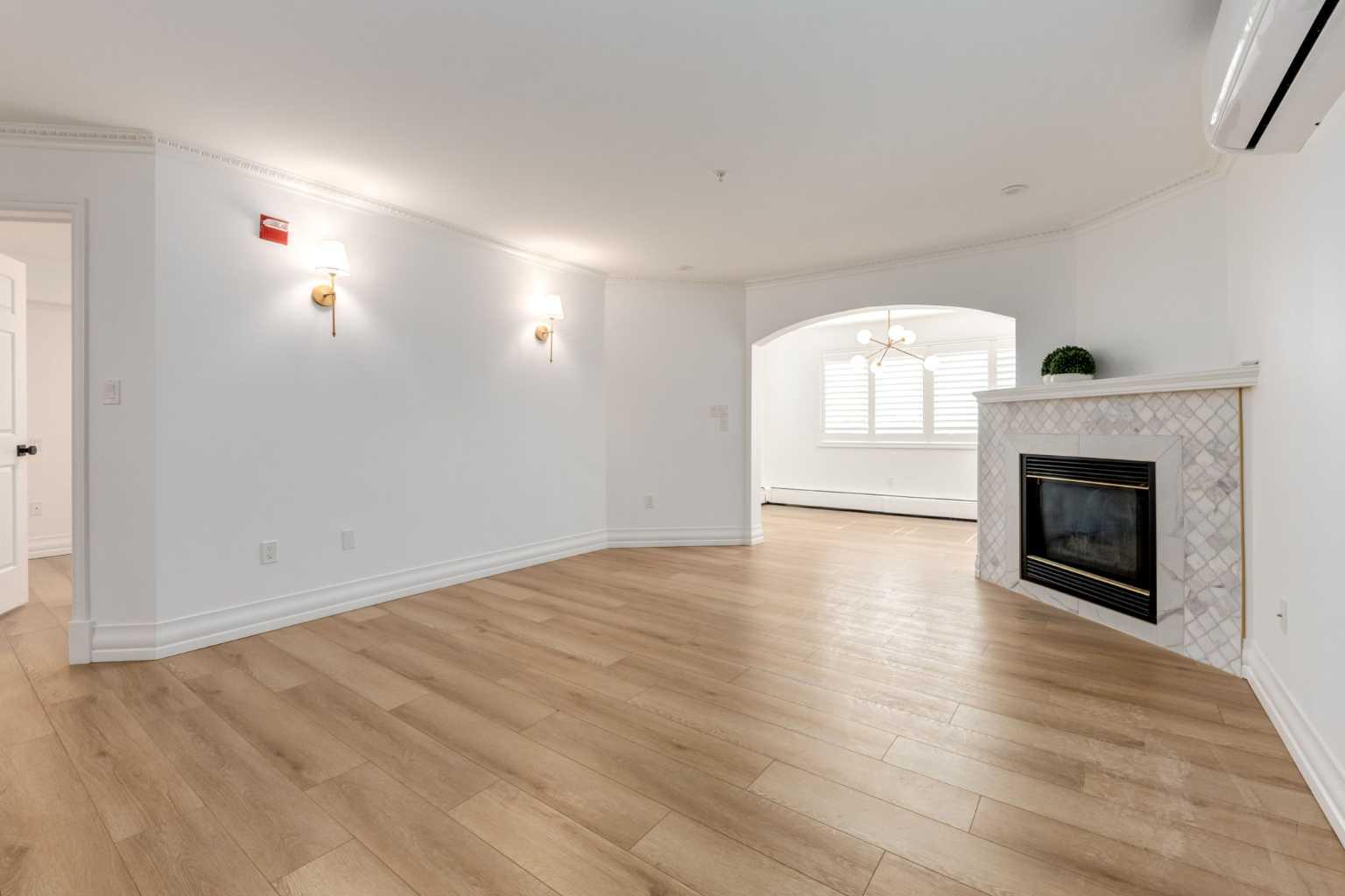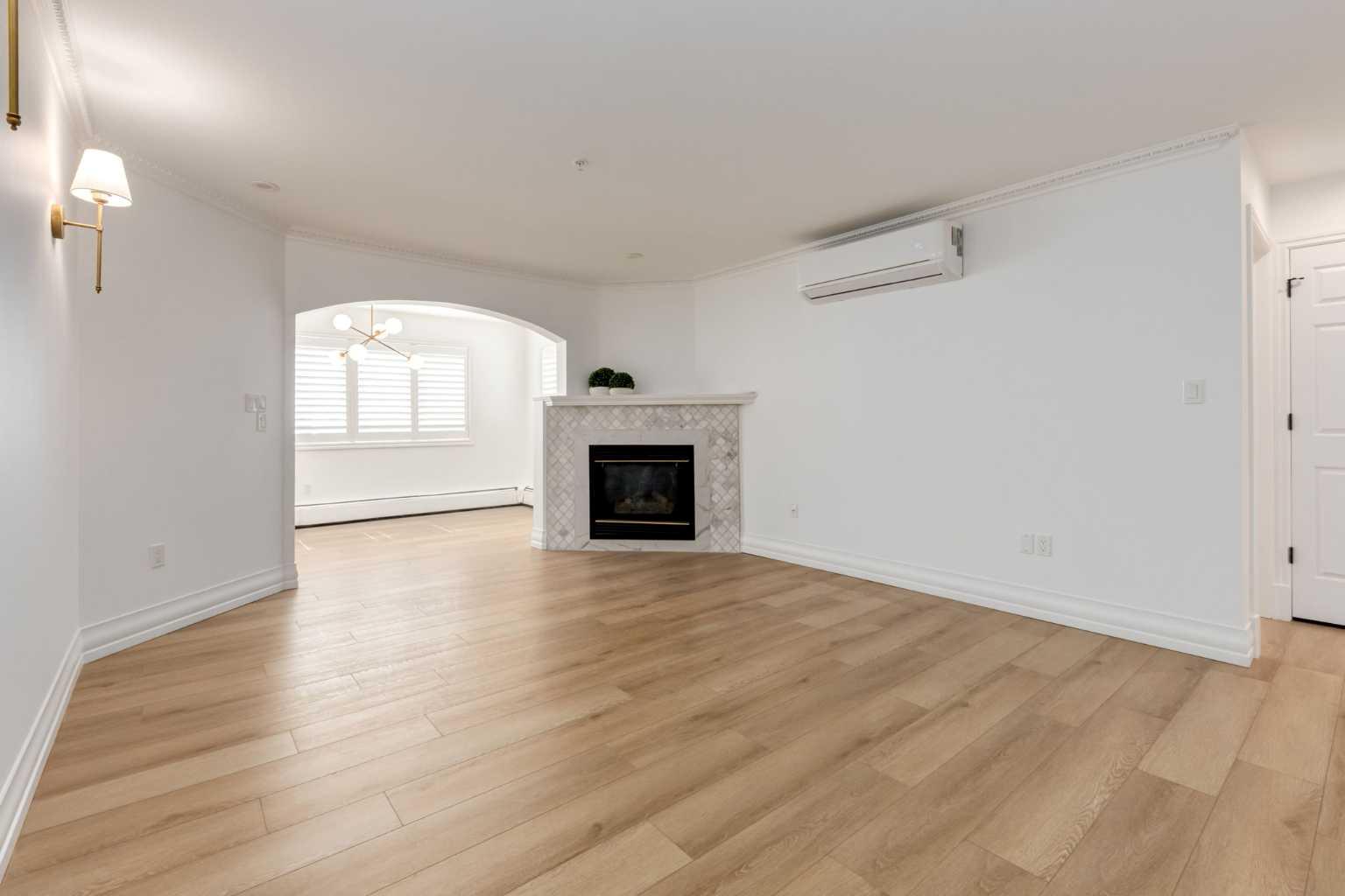 This unit includes a spacious primary bedroom with ample closet space and a stylish bathroom featuring modern fixtures. Additional highlights include marble and porcelain tiles, all new plumbing, and lighting. Smooth ceilings, new custom shutters, new air conditioning unit installed. Pipe drawer vanities, updated fireplace surround, new stacked LG washer and dryer, and updated closet interiors. Charming character trim work, in-suite laundry, ample storage, and secure underground titled parking. The building offers amenities such as a party room, visitor parking and secured underground parking.
