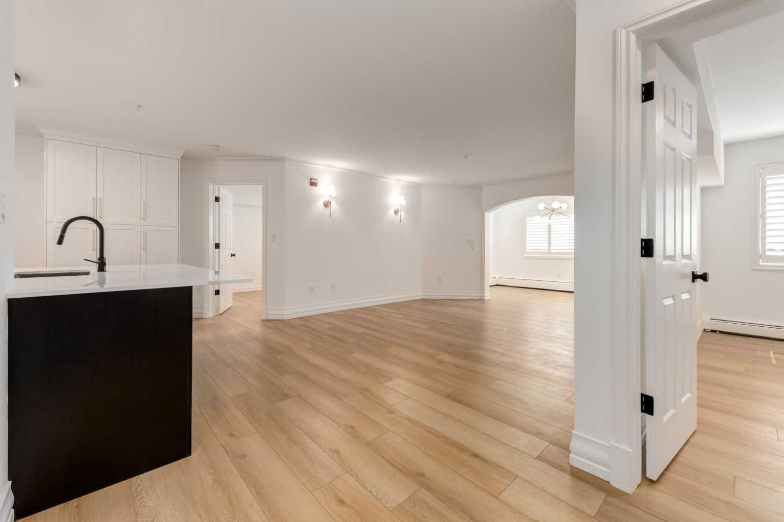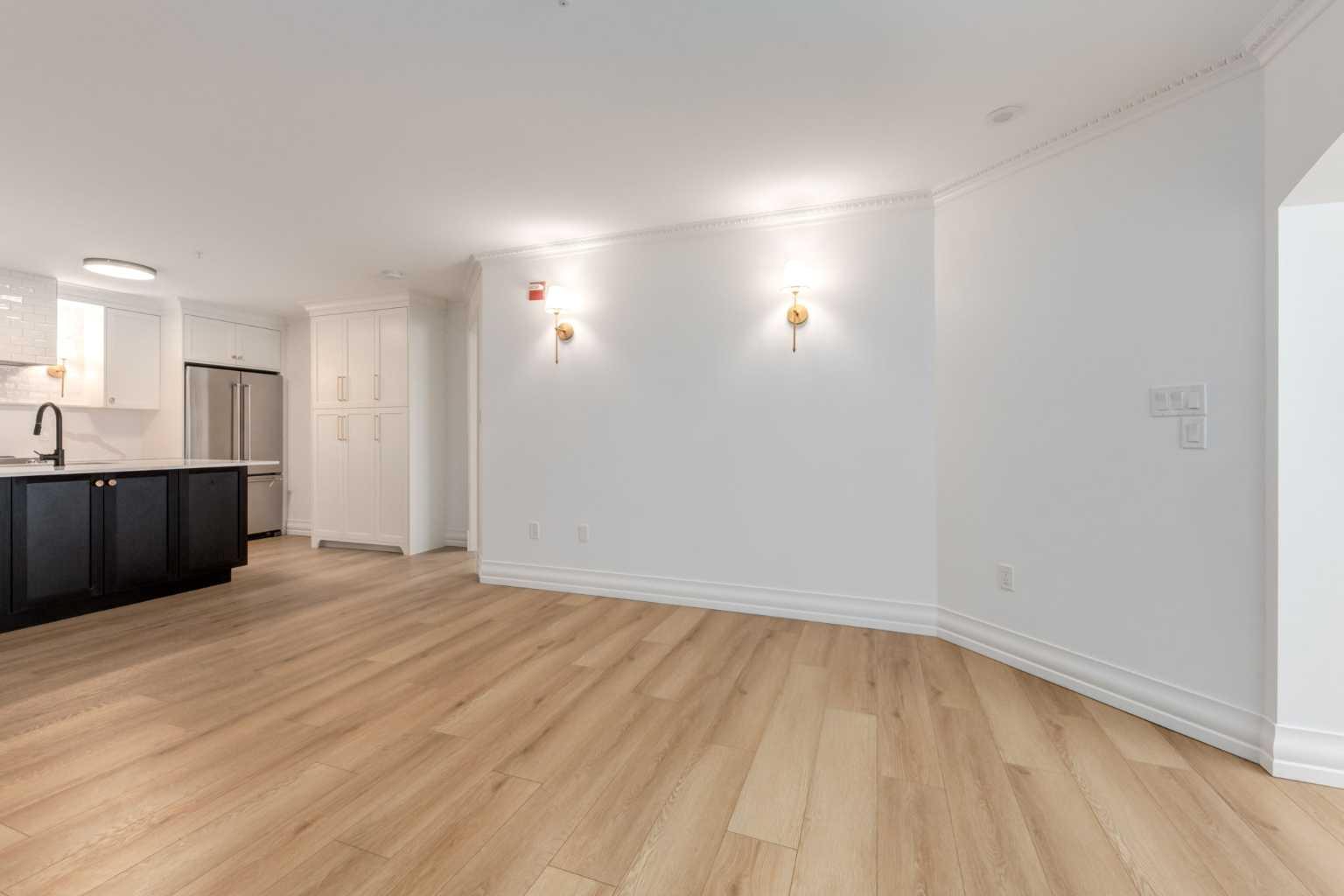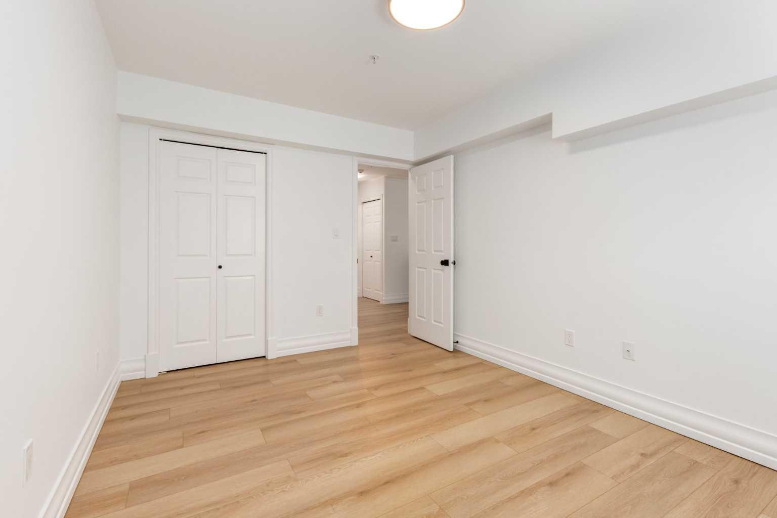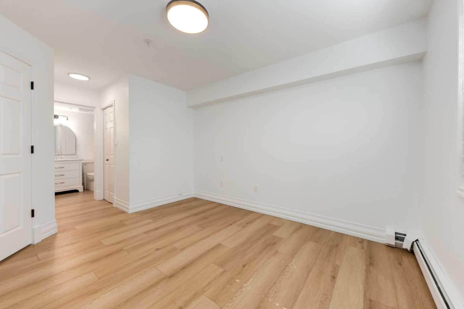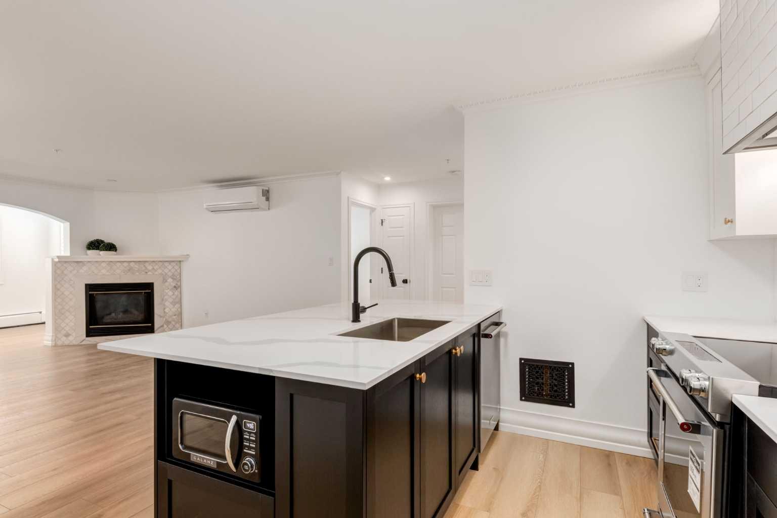 This unit includes a spacious primary bedroom with ample closet space and a stylish bathroom featuring modern fixtures. Additional highlights include marble and porcelain tiles, all new plumbing, and lighting. Smooth ceilings, new custom shutters, new air conditioning unit installed. Pipe drawer vanities, updated fireplace surround, new stacked LG washer and dryer, and updated closet interiors. Charming character trim work, in-suite laundry, ample storage, and secure underground titled parking. The building offers amenities such as a party room, visitor parking and secured underground parking.
