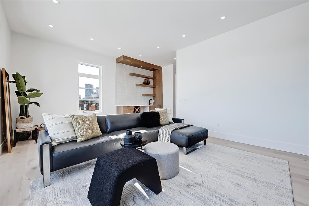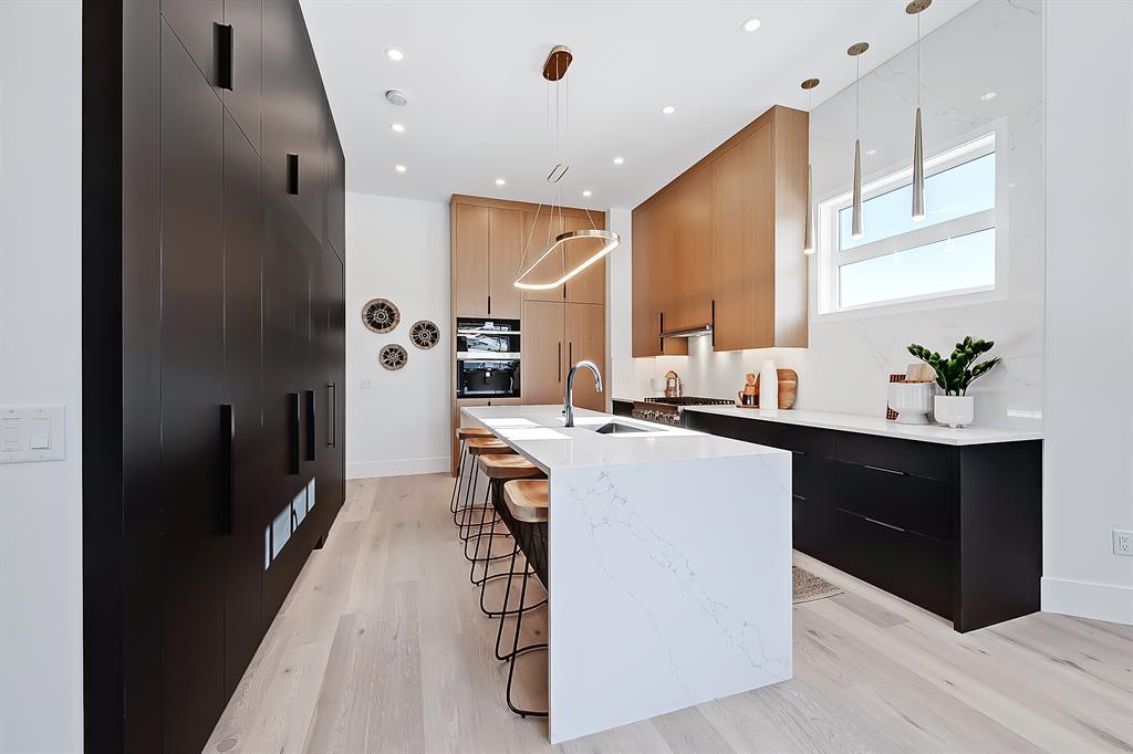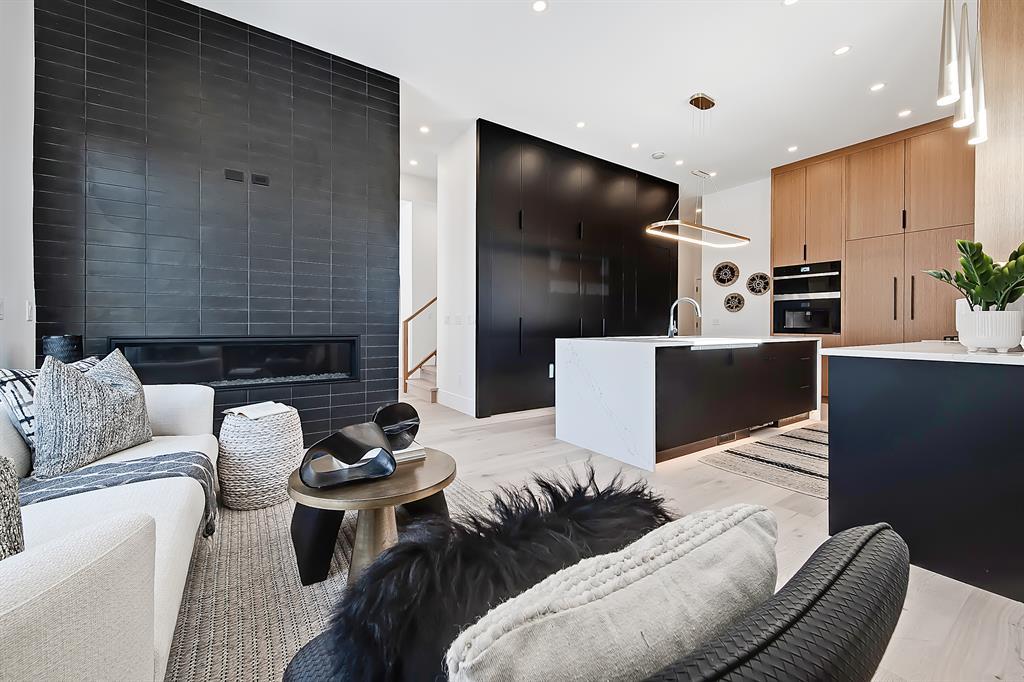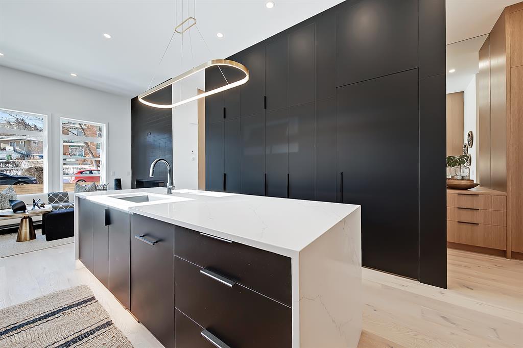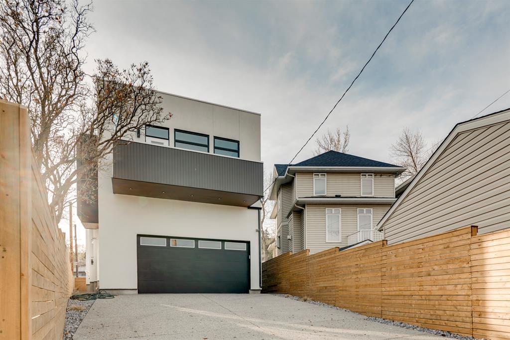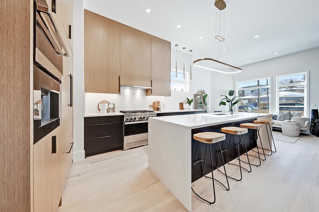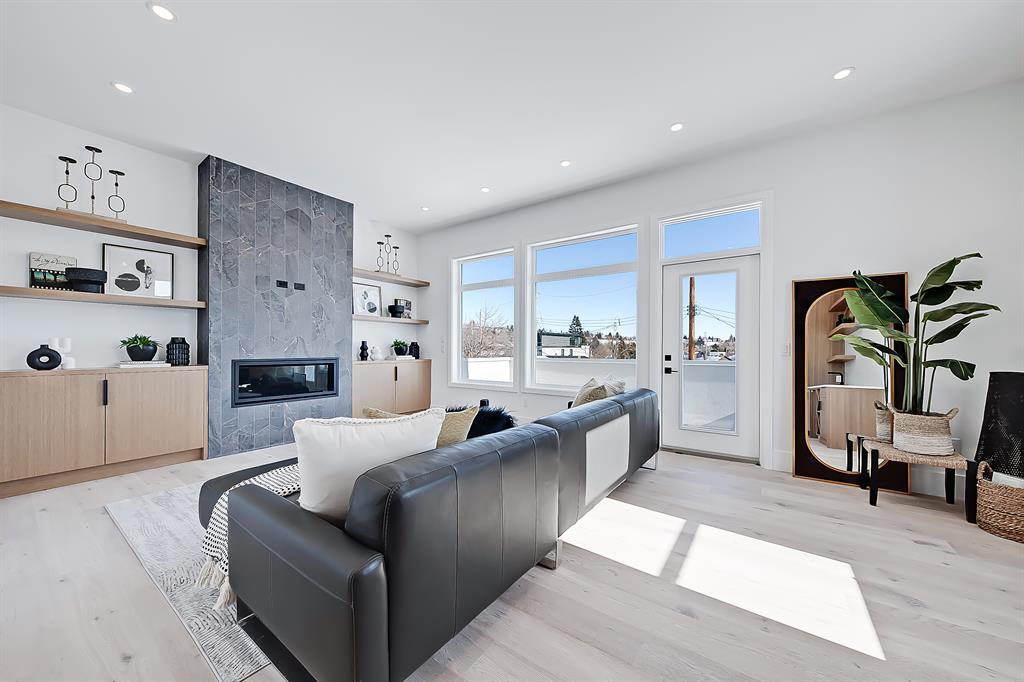MOVE IN READY! This opulent DETACHED home on a 50’ x 110’ PIE SHAPED LOT w/ a LEGAL 2 BEDROOM BASEMENT SUITE, SOUTH BACKYARD, & DOWNTOWN VIEWS in BRIDGELAND is a modern masterpiece, brought to you by Le Riva Homes! Boasting over 3,400 sq ft across all levels, a lavish exterior & elegant interior finishes & upgrades all come together in this modern home, starting w/ the main floor. The main floor features exclusive 7” wide plank engineered white oak hardwood floors, 11-ft ceilings, & a OVERSIZED DOUBLE ATTACHED GARAGE. The chef-inspired kitchen centers on a 10-ft oversized island & has upgraded appliances, including a gas range, a panelled fridge/freezer, & a built-in coffee machine. Quartz counters sit alongside an elegant white porcelain backsplash w/ two-tone cabinetry for a highly modern, luxury aesthetic. The formal dining room enjoys a lavish feel w/ a dropped ceiling w/ LED accent lights, a black ink feature wall, & a designer chandelier. After dinner, relax in the great room around the Napoleon gas fireplace w/ white porcelain surround. Use the main floor bedroom for guests or a home office, w/ its built-in study desk & cabinetry. The main bath is also convenient for guests, fully equipped w/ two-tone cabinetry, Vicostone quartz counter, & walk-in shower w/ full-height bevelled subway tile surround. Upstairs, the modern luxury continues w/ 11-ft ceilings in the master & 2x bedrooms, w/ 10-ft ceilings in the living room. The dreamy master suite has an opulent ensuite w/ a free-standing soaker tub w/ stone feature wall, a walk-in steam shower w/ stone surround, a dual vanity, & natural stone flooring. The attached walk-in closet is straight out of the movies w/ custom built-in shelving, hanging storage, drawers, & more. 3x extra bedrooms also reside upstairs, along w/ 2x full bathrooms, a family room w/ access to the rear deck w/ DOWNTOWN VIEWS, & a fully equipped laundry room w/ a linen tower & sink. The legal basement suite is just as modern & chic as the res t of the home & has a private entrance & separate parking space. This level provides options for extra rec space, a mother-in-law suite, or an avenue for revenue. A fully equipped two-tone kitchenette w/ a slide-in range, fridge/freezer, dishwasher, & wall microwave is at the heart of the suite, & expands into a rec room w/ Napoleon electric fireplace w/ full-height stone-like surround, two bedrooms, & a full bathroom. **The upgraded features are too vast to list, VISIT MULTIMEDIA LINKS FOR VIDEO WALKTHROUGH!** (id:22211)