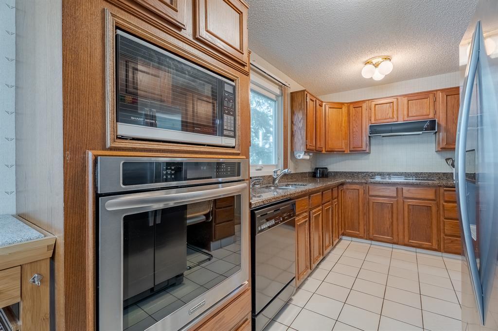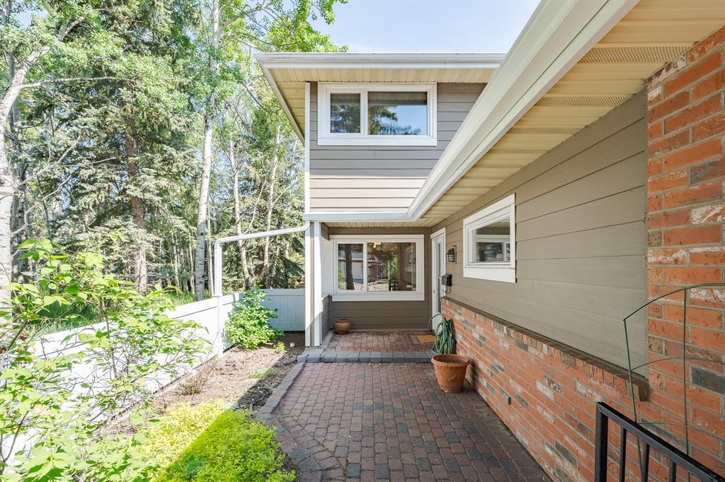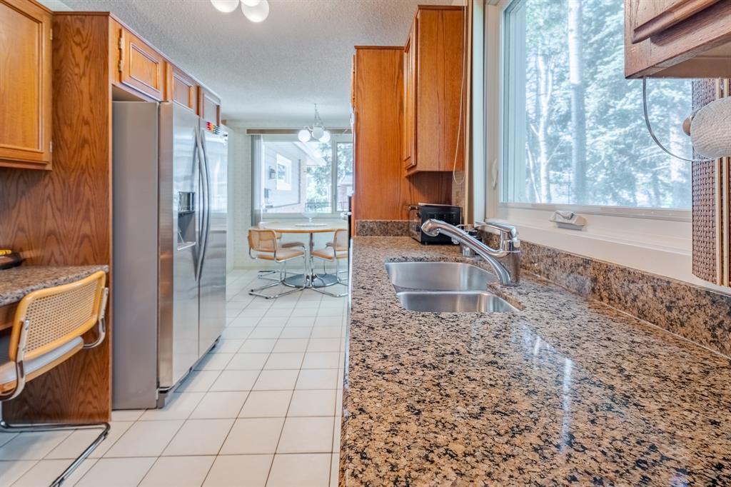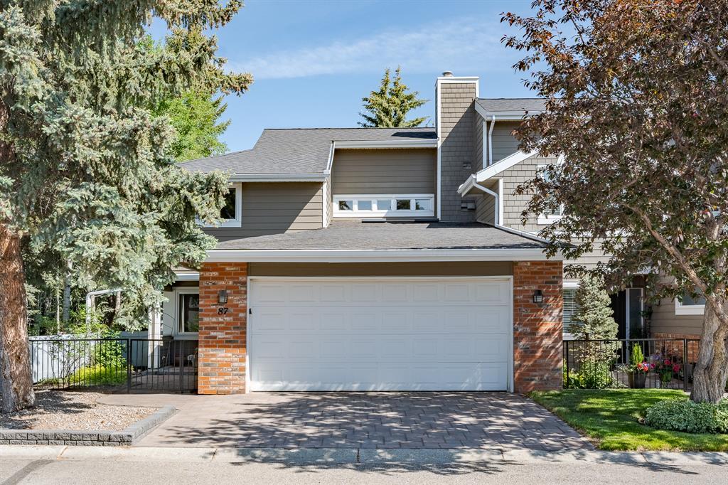 Your home is awaiting you. A very special large three bedroom, double car garage, upgraded home was worth the wait. Enter through the south facing gated yard to the expansive front door onto the wide open foyer. The kitchen has granite countertops and tile flooring with an eat-in nook that compliments the modern day stainless steel appliances. Your villa/2 storey has spectacular, heaven to earth vaulted ceilings in the living room that includes a gas lit natural fireplace for warmth & comfort. The tile flooring in the kitchen & foyer is easy to keep clean and maintain. Your company welcoming dining room features a built in, very appealing buffet cabinetry featuring marvelous sunshine filled windows highlighting the room. The den offers quiet solitude. The large primary bedroom is on the main floor and is status quo. Your bedroom is very comfortable which includes the master 5Pce ensuite bath that has been renovated with a dual person, walk-in glass shower, warm heated tile flooring and quartz built in multiple sinks with premium hardware. The upstairs features 2 bedrooms and loads of storage with a walk in closet. Main floor laundry, more spacious storage, and A/C bonus. The premium location home is siding onto Sherwood Forest. Brilliant large glass windows are masterfully located thru out on your corner home that is situated for peaceful solitude. Enjoy your private, seclusive, sunshine deck, off the den thru the sliding glass doors. Call for your private showing. Drive buy 87 Woodmeadow Close SW and make it your home. Space to roam with approx. 2,100sqft of imaginable living space in the community of Woodlands, close to all amenities from golf, recreation, medical, retail shopping and education. Note-Recent price adjustment. Across from the community center. (id:22211)