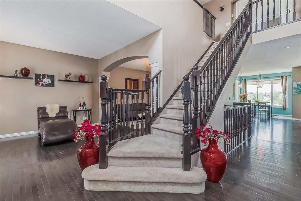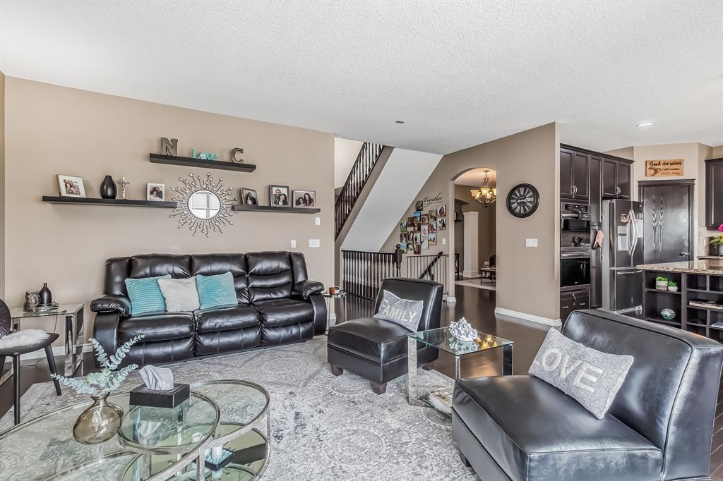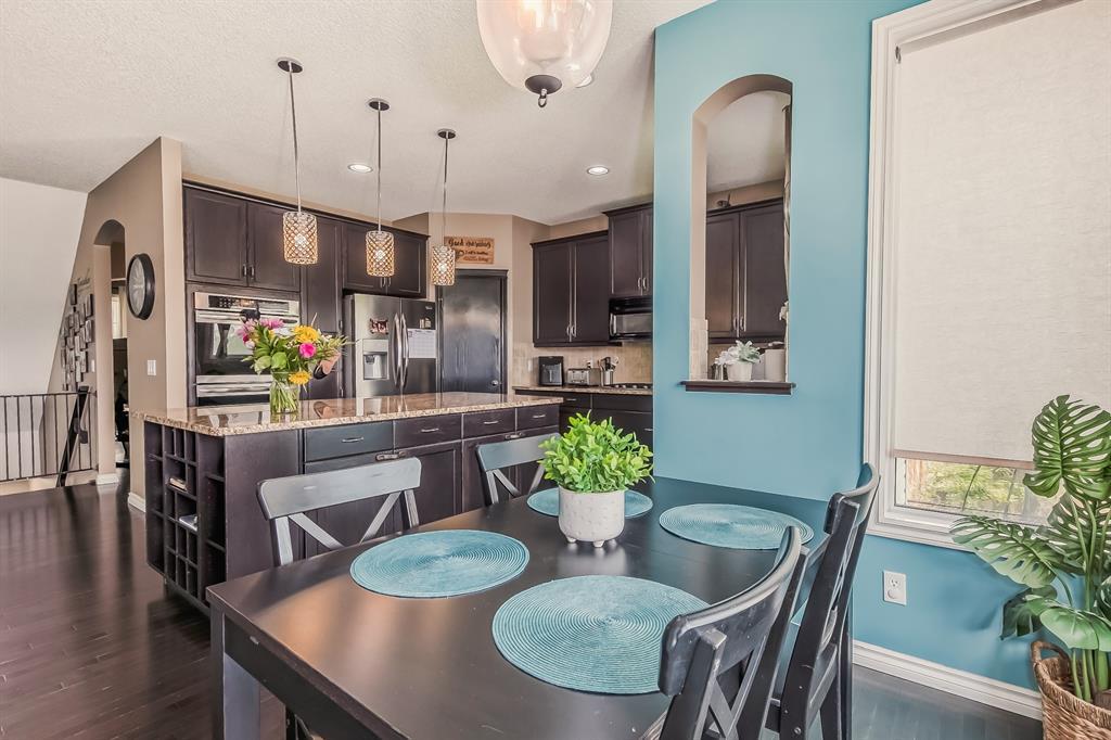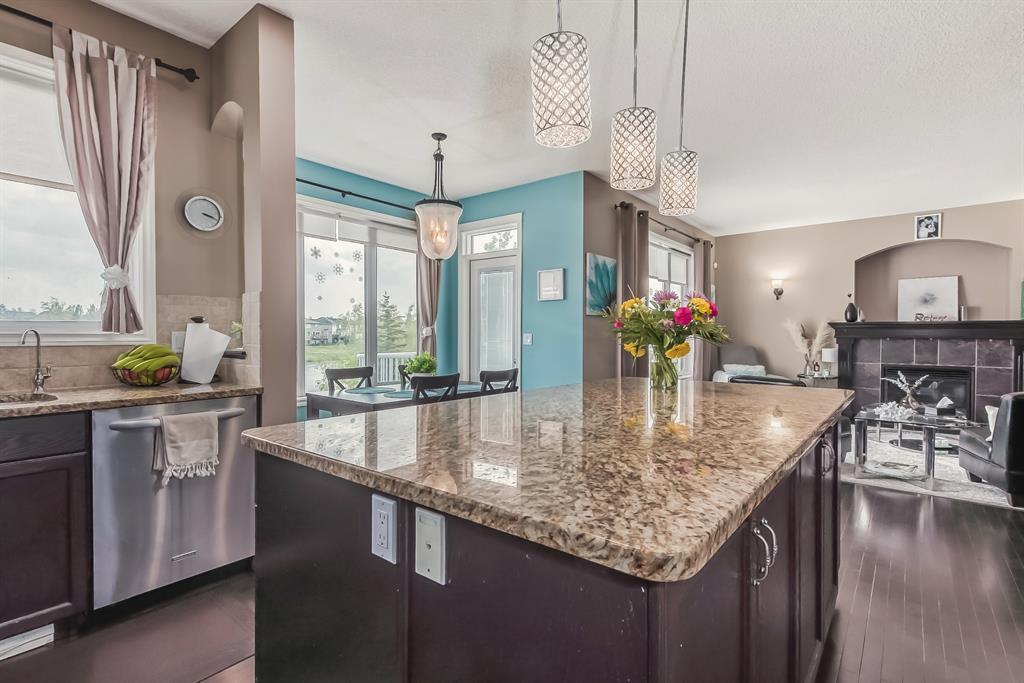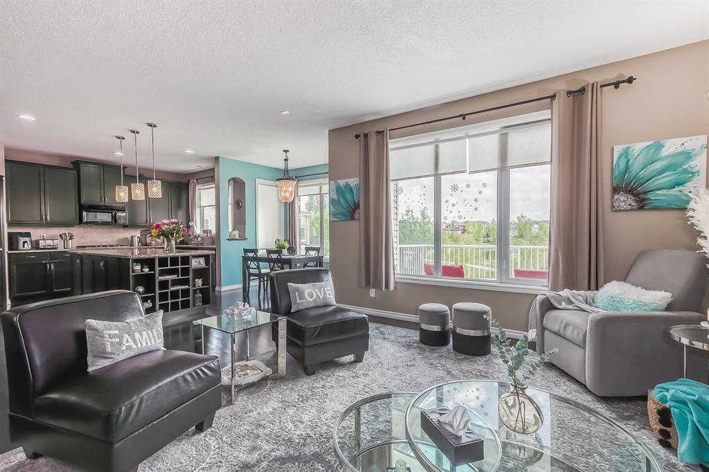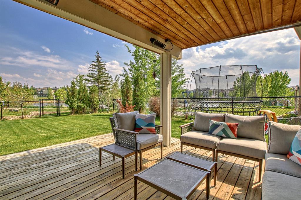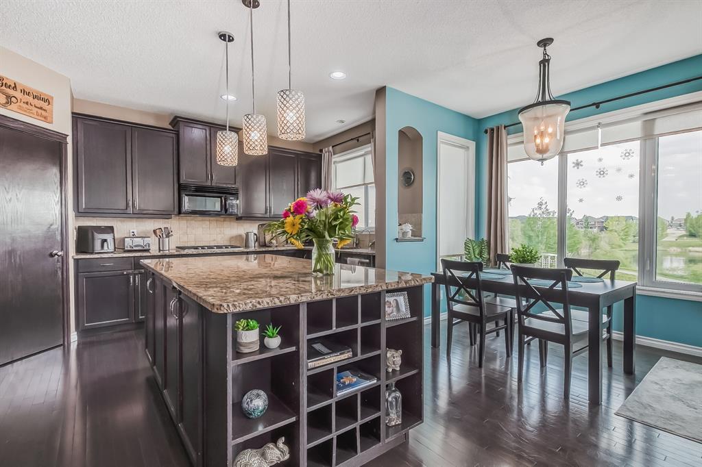 Welcome to the gorgeous 4 seasons lake community! This amazing fully finished walk out home with central air is tucked at the back of a family friendly cul du sac on a huge pie lot (w/ underground sprinklers) & has phenomenal views of the pond & green space it backs on to. The main floor consists of a living room/dining room at the front of the house, office with french doors & beautiful kitchen, breakfast nook & living room. Upstairs you will find the huge master bedroom with fabulous ensuite & massive walk in closet. The 2 additional bedrooms, 4 pce bathroom & the conveniently located laundry room finish off the upper floor. The fully finished walkout with heated floors boasts a fabulous wet bar with built in cabinets featuring a cold wine cellar, 2 large bedrooms, a huge REC room and bathroom. There are 2 new elementary schools as well as a Rec Center, lots of amenities, shopping & the new hospital, a 3 minute walk from the largest YMCA in Calgary and a 5 minute walk from a VIP cinema, what more will you need? (id:22211)