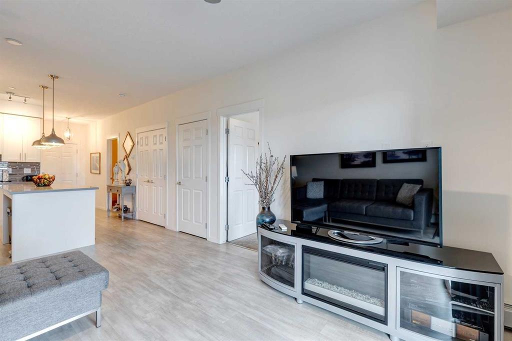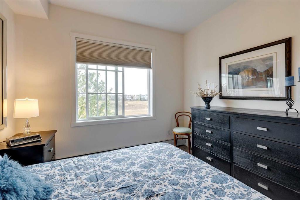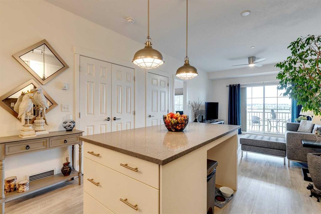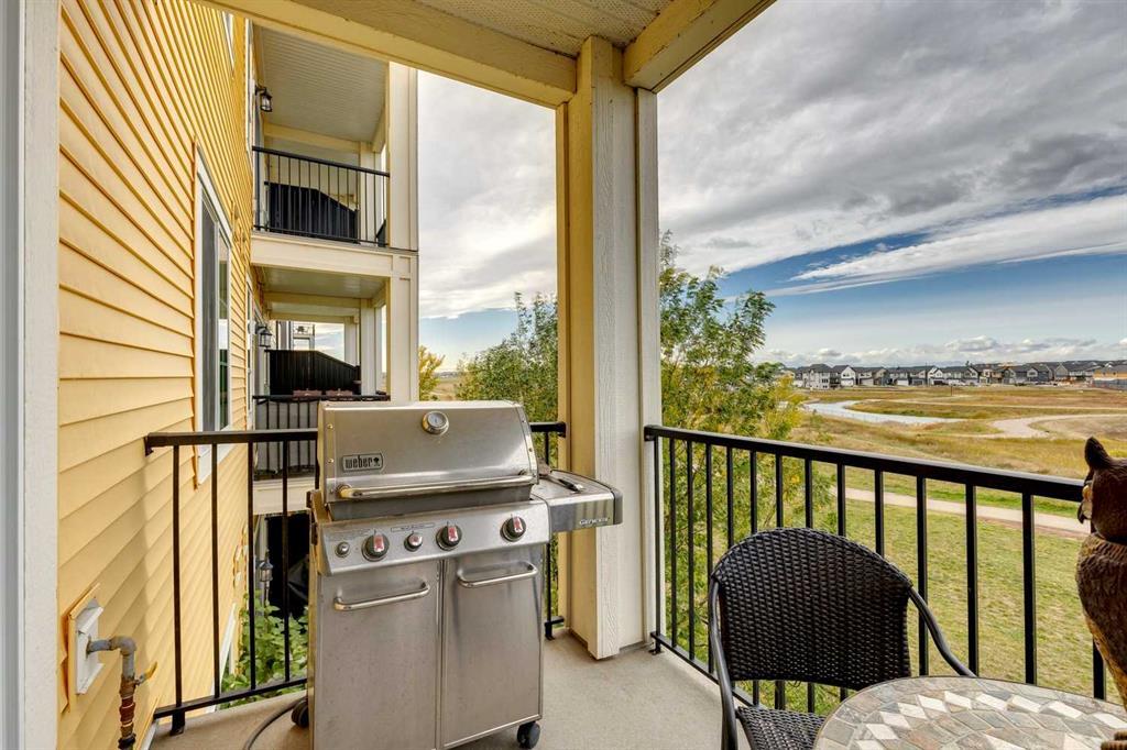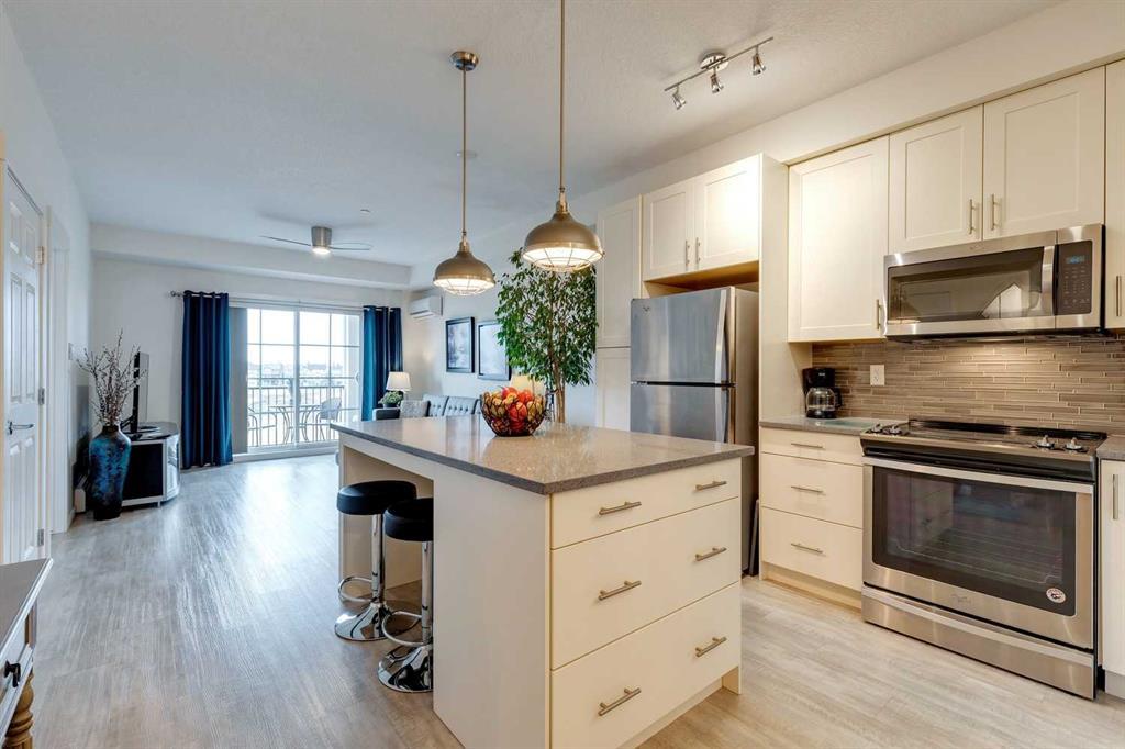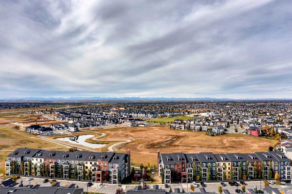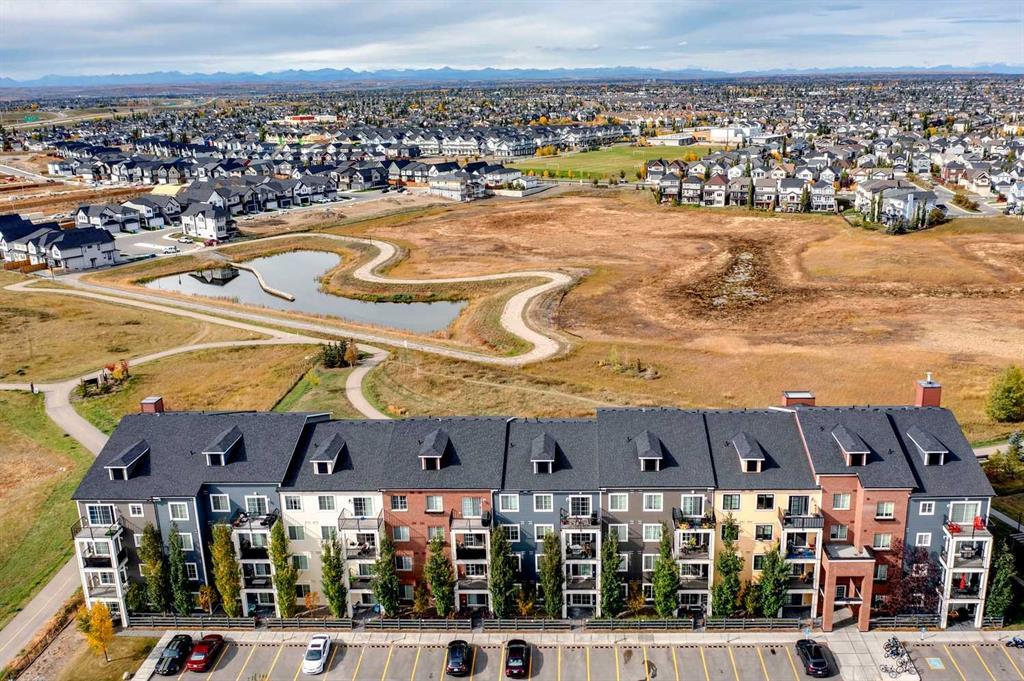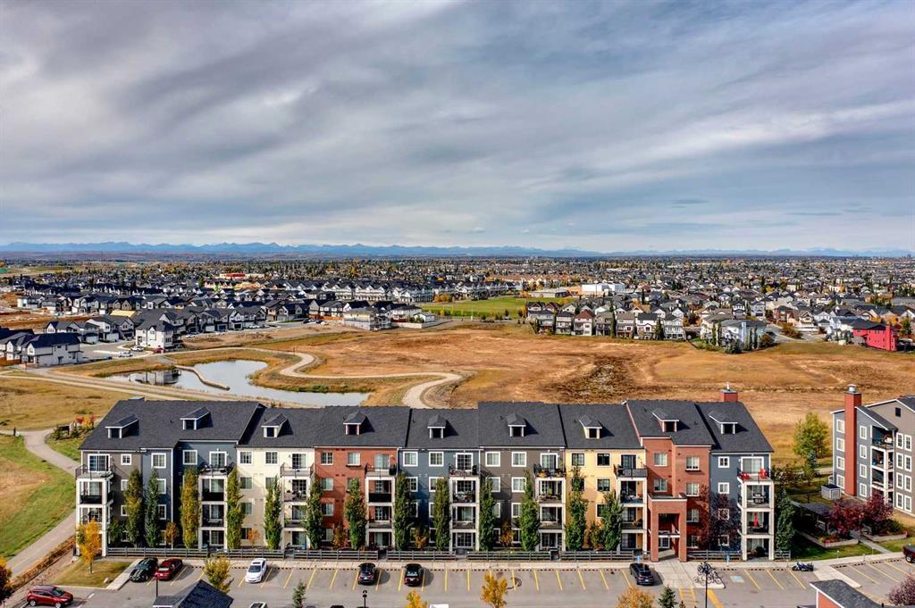 You’ll love this fully loaded 2bed+ 2bath Copperfield condo overlooking an environmental reserve that offers stunning views of the Rocky Mountains! The condo features beautiful luxury vinyl plank flooring that flows throughout the open-concept living space highlighted by an impressive kitchen equipped with every upgrade imaginable including quartz countertops, glass tile backsplash, upgraded appliances, and a custom 6 ft island breakfast bar that allows seating for 4 (unique to this unit only). The cozy living room connects to the generous balcony where you'll enjoy every evening watching the sunset and mornings with your coffee and the beautiful Rocky Mountains. You’ll continue to be impressed by the spacious primary bedroom which offers a walk-through closet and a private ensuite with quartz countertops. The secondary bedroom can also be utilized as a flex room and offers wall to wall closet space providing ample storage! The unit is complete with an upgraded second full bathroom including quartz countertops, full size in-suite laundry, storage, and titled underground parking. ADDITIONAL HIGHLIGHTS INCLUDE: Air conditioning, ceiling fans, Hunter Douglas accordion style blackout blinds, new light fixtures throughout and a bbq gas line. Conveniently located within minutes of all of life's amenities at South Trail Crossing and quick access the future green line LRT and the ring road - this beautiful condo has been extremely well cared for and the building has been extremely well managed making it a great opportunity for an investment property of the perfect fit for a first-time home buyer or downsizer. (id:22211)