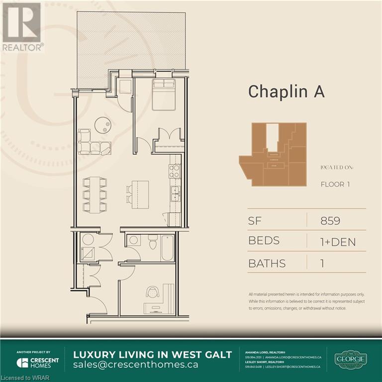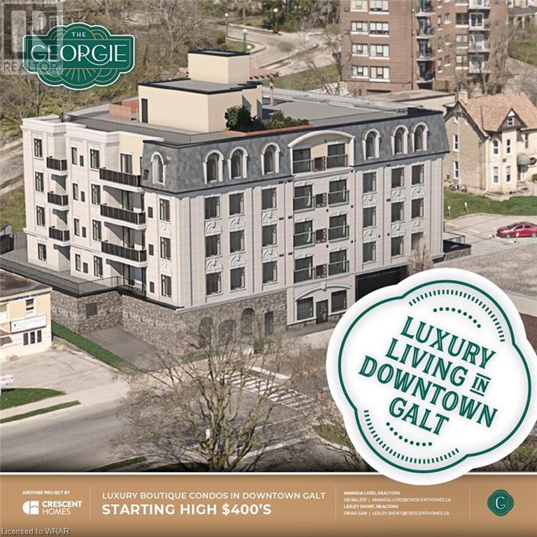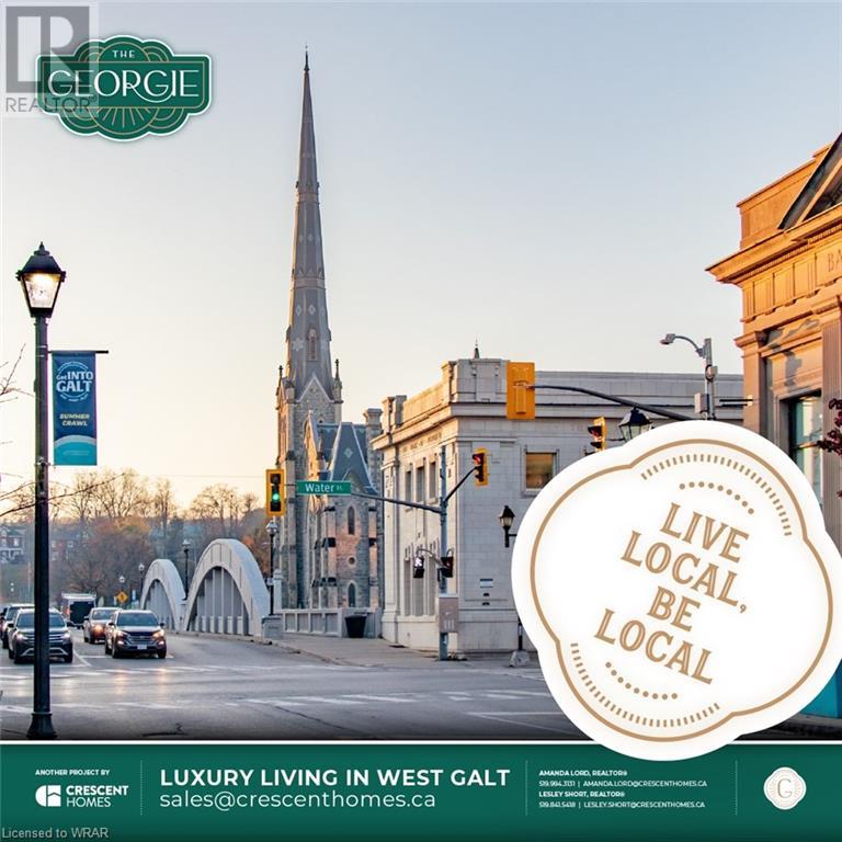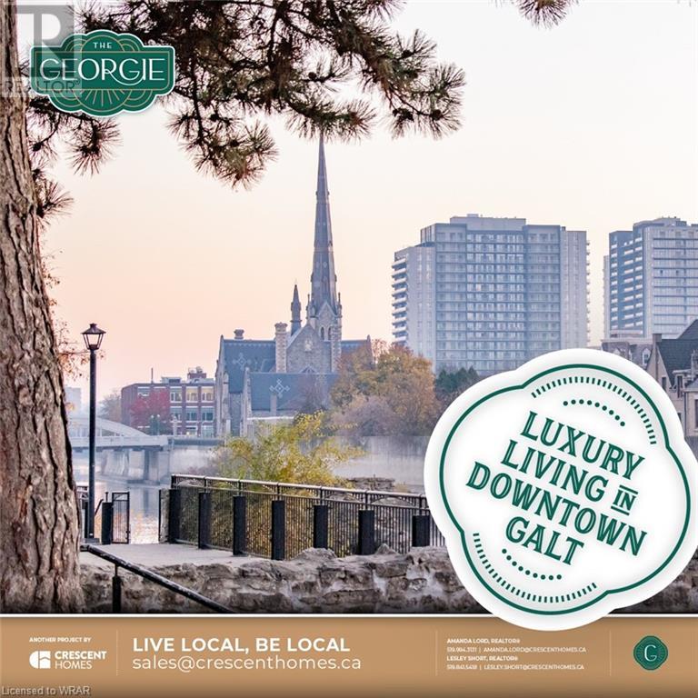 Welcome to the THE GEORGIE. This highly anticipated boutique condo project built by Crescent Homes, offers one-of-a-kind luxury and elegance inspired by the Golden Era of Hollywood, located in the heart of fabulous downtown Galt. This project is unlike any other in the region... even the units have been named after Hollywood's biggest and brightest stars of the Era! There is nowhere else in the region you can you step out your front door and be greeted by Queens Square, the Grand River, wonderful boutiques, great restaurants , patios ,world class theatre, the library and so much more ! This bright spacious model, lovingly called the Chaplin A offers 1 Bedroom plus a Den, 1 bathroom, a large open concept living room and kitchen with 9 ft ceilings, potlights , quality cabinets, quartz counters, luxury vinyl , and a private main floor outdoor living space. Act now to take advantage of $10,000 back towards upgrades and upgraded Stainless Steel appliances. . If carefree living in our beautiful downtown appeals to you, but you aren't attracted to high rise living, this is your opportunity to live your dream. This fabulous boutique has only 35 units, so act quickly to take advantage of the You don't need to be a Hollywood Star to live like one !! (id:22211)