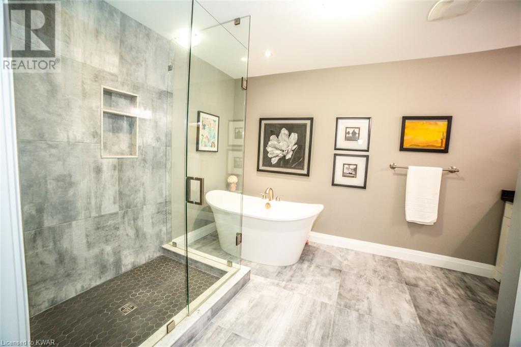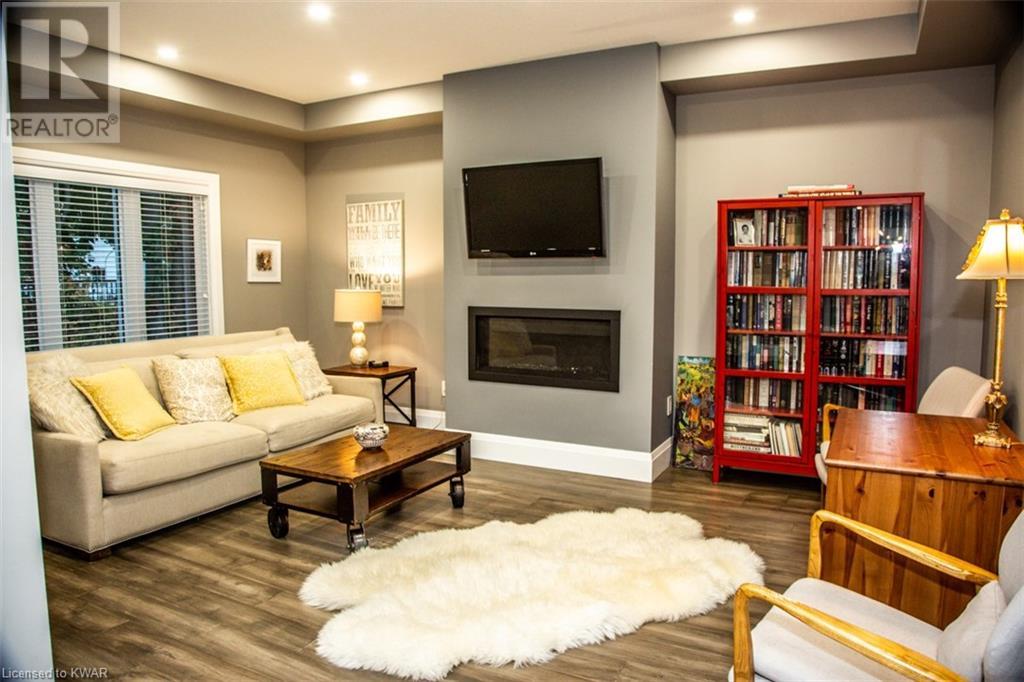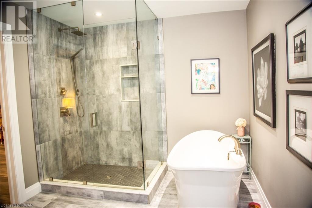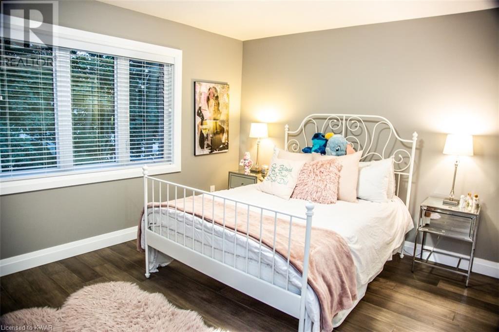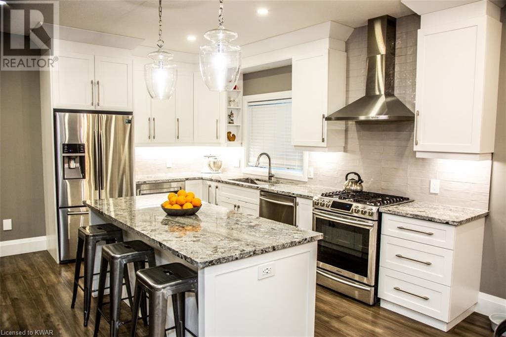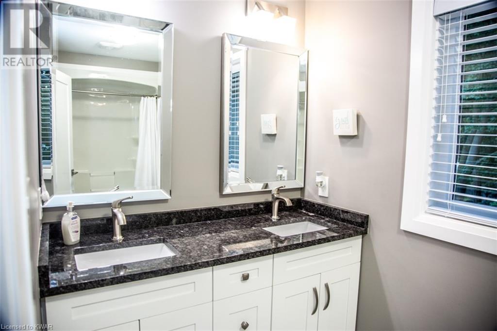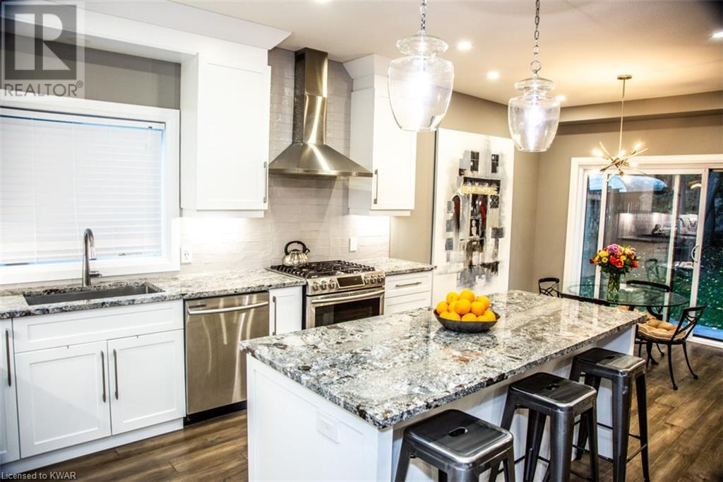 Luxury custom built executive home! Built in 2018 by Pioneer Tower Homes. Featuring over 3,000 square feet, this 5 bedroom 4 bathroom dream home is very well built and tastefully designed. Located in Hespeler Village by the River, one of the most charming locations in Cambridge. Fantastic curb appeal. Concrete driveway. Double car garage with private staircase to the basement. Ideal for a potential in-law suite in the basement. Charming front entry, and the two story foyer is an impressive grand entrance to this welcoming home. Gorgeous engineered hardwood flooring throughout, as well as plenty of pot lights, ensuring this home is beautifully well lit and showcased. Main floor office space, or use it as the 5th bedroom as needed. On the main floor the ceiling height is an upgraded 9 ft tall. The kitchen is the heart of the home with gorgeous granite countertops. Beautiful white ceiling-height cabinetry with crown moulding and stainless steel appliances. 7 ft long island with breakfast bar. Separate dining area, featuring sliding patio doors to the very spacious backyard which is a rare find in large new build homes. Beautiful stamped concrete patio and a convenient shed. Spacious sitting area and living room with fireplace on main floor. Two piece bathroom and spacious mud room. Second floor features four great sized bedrooms and laundry room. Double doors into impressive primary bedroom with tray ceiling and walk in closet. Breathtaking ensuite bathroom with gorgeous glass shower, deep soaker tub, double sinks, and private water closet for the toilet. One of the other bedrooms on this floor features an en-suite bathroom as well. The basement has so much potential. 2 rough in's for bathrooms, kitchenette area, and large windows. Add further value by finishing this massive space, or leave it as a rec room, storage area, or kids play area. Close to so cafes, restaurants, trails, and a very short drive to the 401. Book your showing ASAP! **SEE FULL VIDEO TOUR** (id:22211)