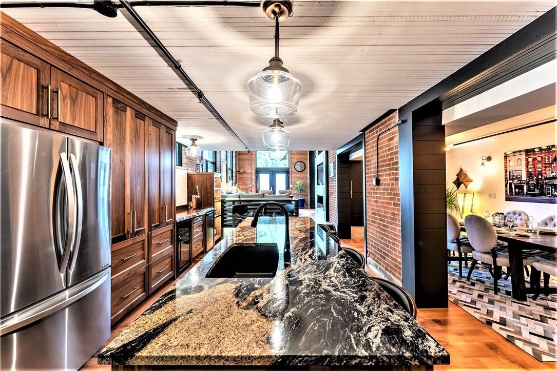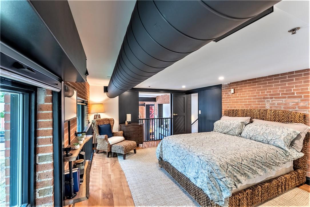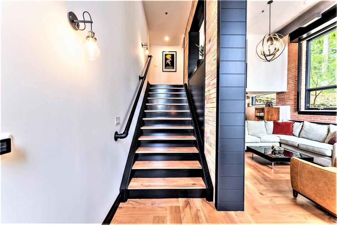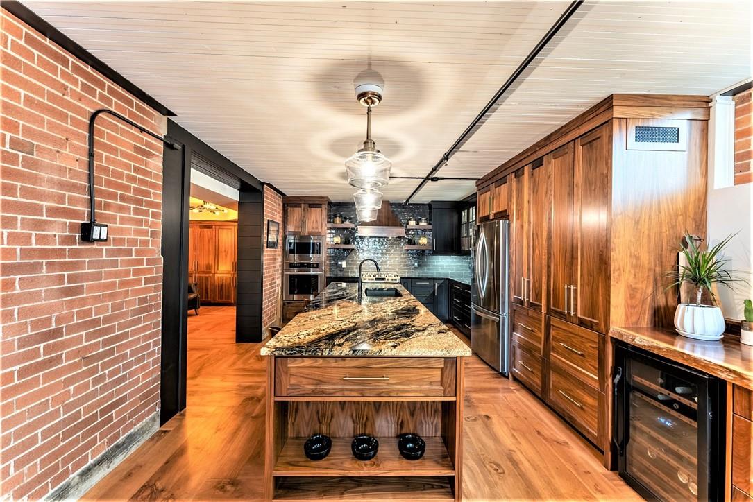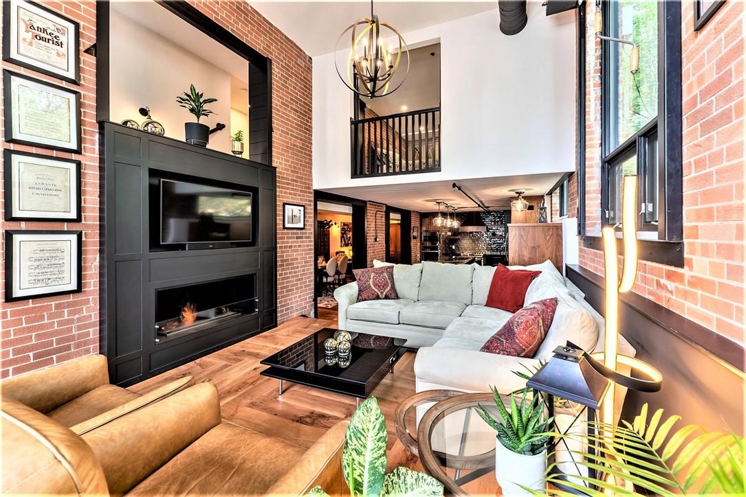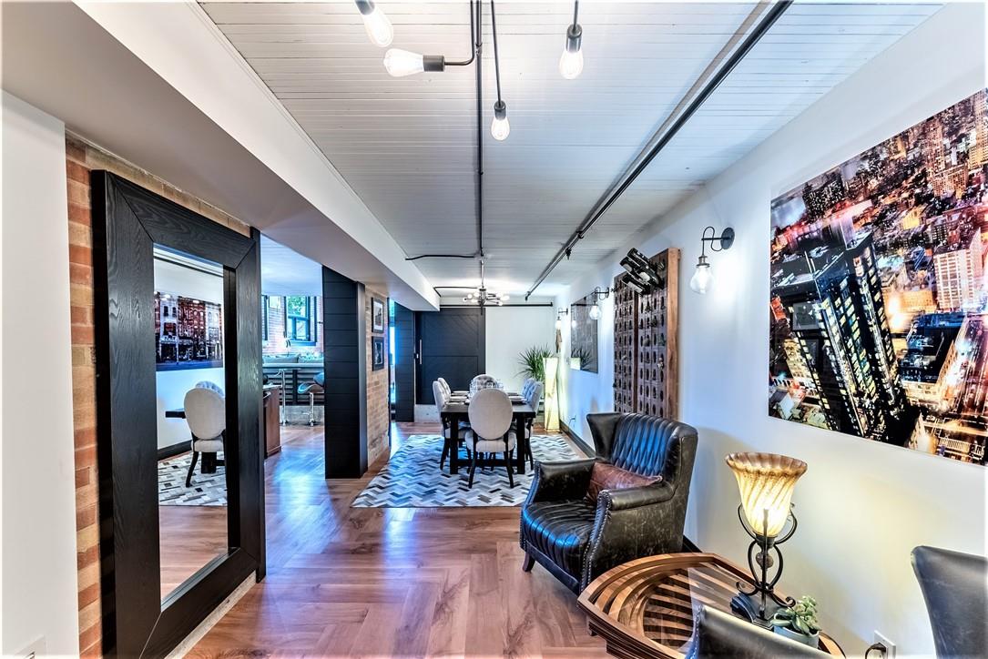 This 2000+ sqft 2 story loft has been completely renovated top to bottom with nearly $300k in upgrades. You'll have the desired lofty exposed brick and industrial accents but will now enjoy all the modern executive luxuries from the recent renovations in 2019/20. Reno's include an ethanol fireplace with integrated staircase media unit, a chefs dream kitchen featuring walnut cupboards, a massive dramatic granite countertop, all new appliances, built-in beer keg and wine cooler, pot lighting throughout with all electrical and plumbing updated. Each of the 3 bathrooms have been completely redone with the upstairs washrooms featuring curb-less showers and heated flooring. Custom closets on both levels with a tailor-made murphy-bed as part of the 2nd bedroom. The exterior and interior doors have been upgraded along with new solid sliding barn doors that match the modern but industrial feel. Designed to cater for those working from home with 2 desk areas. This end unit loft not only has a cool NY designer vibe but features a wish-list of modern luxuries. Note: property/forest next to building is privately owned and not included as part of the sale. (id:22211)