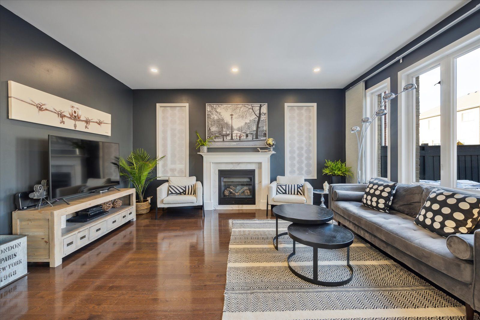 Gas Fireplace Hardwood Floor O/Looks Backyard