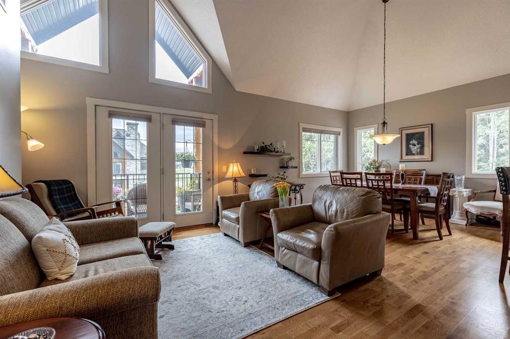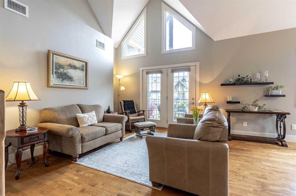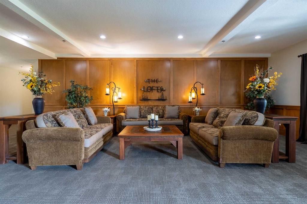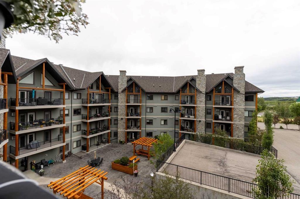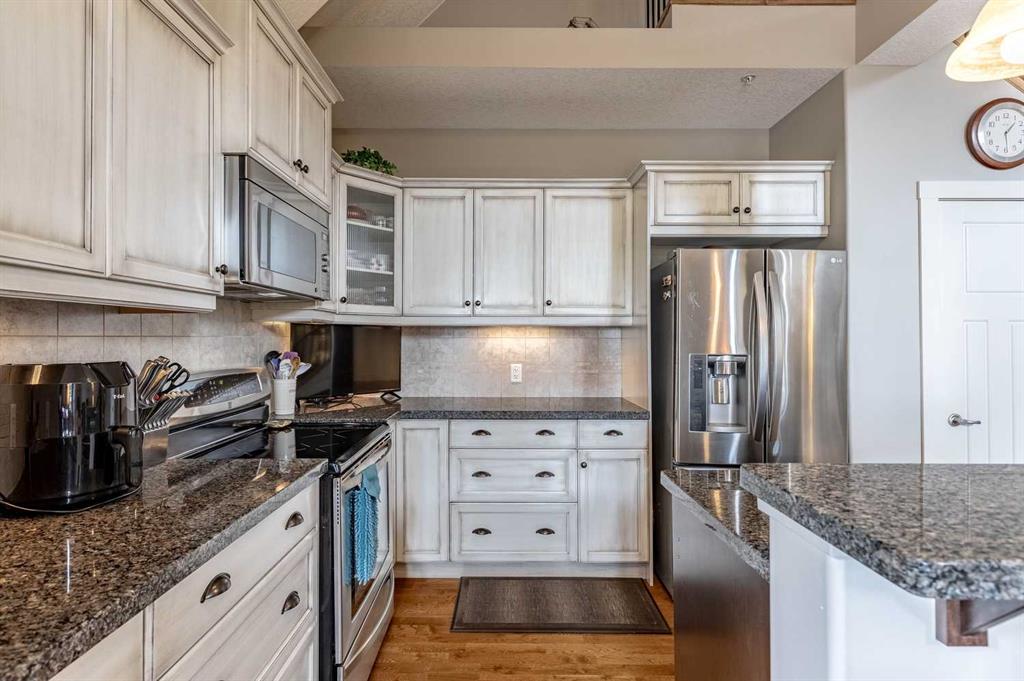 Welcome to the Lofts on the Bow, where upscale living meets tranquility in the heart of Cochrane, just steps from the river. Situated on the top floor of this coveted 55+ adult living building, this spacious unit offers a luxurious and comfortable setting with its impressive features and a prime location. With over 1400 square feet of living space, this unit provides an abundance of natural light and views of the green space to the south. Step inside to discover a thoughtfully designed floor plan that seamlessly combines style and functionality. The unit features two generously sized bedrooms and two modern bathrooms, offering privacy and convenience for residents and their guests. The master suite presents a serene retreat with ample closet space and a well-appointed ensuite bathroom, complete with elegant fixtures and finishes. The open-concept living area is perfect for entertaining or simply relaxing in style. The gourmet kitchen is a chef's dream, featuring sleek countertops, a large island with a breakfast bar, and stainless-steel appliances. Adjacent to the kitchen, the dining area and living room flow together seamlessly, creating a warm and inviting atmosphere. Expansive windows flood the living space with natural light, enhanced by the vaulted ceilings. From here, step out onto the private balcony with gas BBQ hookup and storage locker. This east facing balcony is perfect for taking in your morning coffee, and the reserve land to the south often provides views of local wildlife. The upstairs loft area is great for a number of uses including guest space, office, extra living room and more. Residents of the Lofts on the Bow have exclusive access to a range of amenities designed to enhance their lifestyle. Take advantage of the fitness center, where you can stay active and maintain your health, or gather with friends and neighbors in the communal lounge area. Don't miss this incredible opportunity to own a top floor unit in the Lofts on the Bow building, o ffering luxurious living in a 55+ adult community. Schedule your private viewing today and discover a new level of comfort and sophistication. (id:22211)