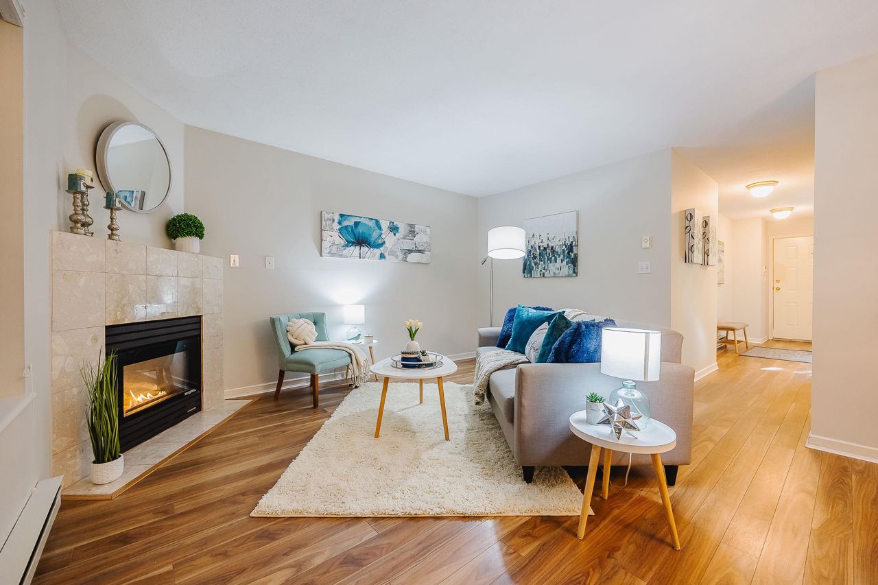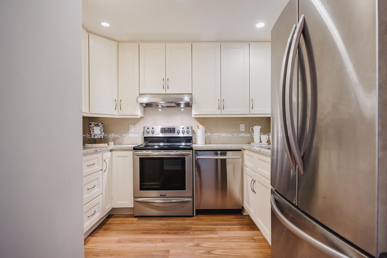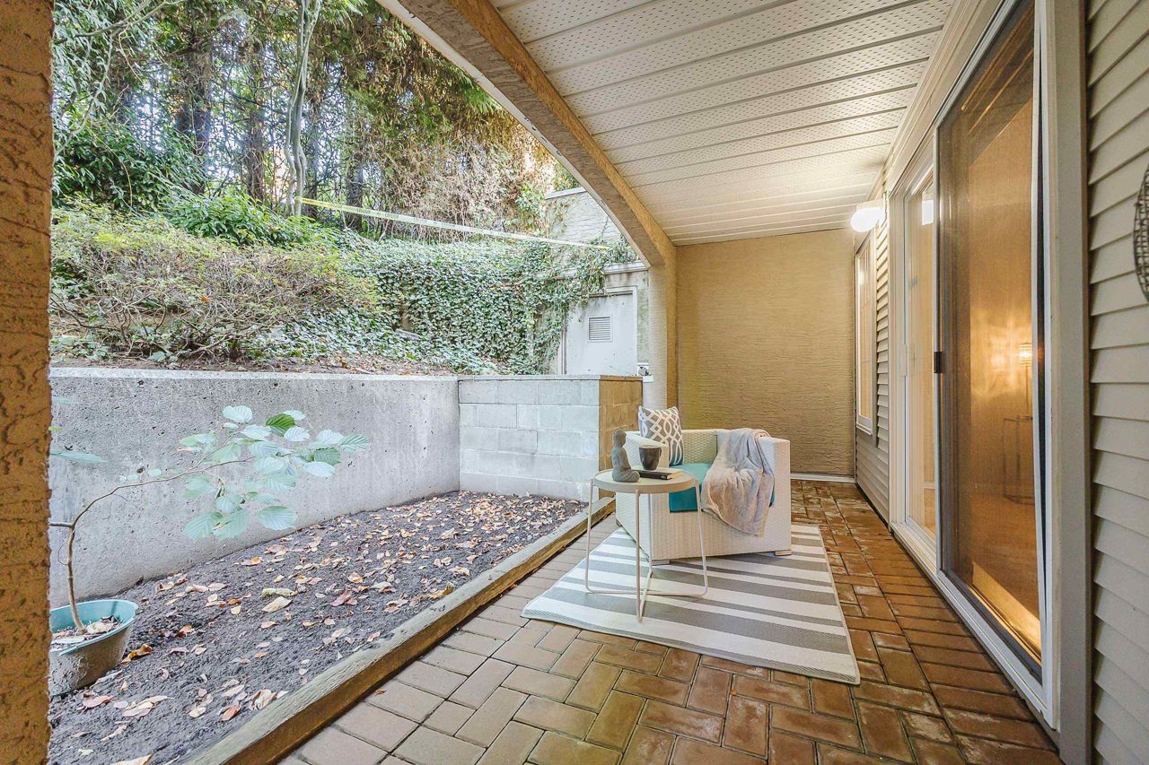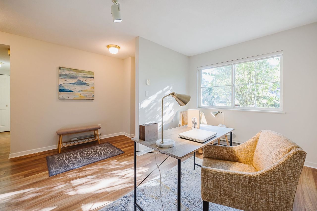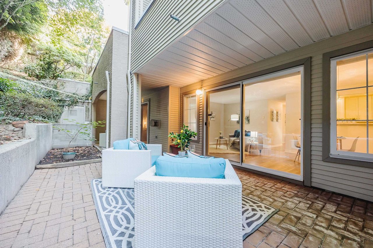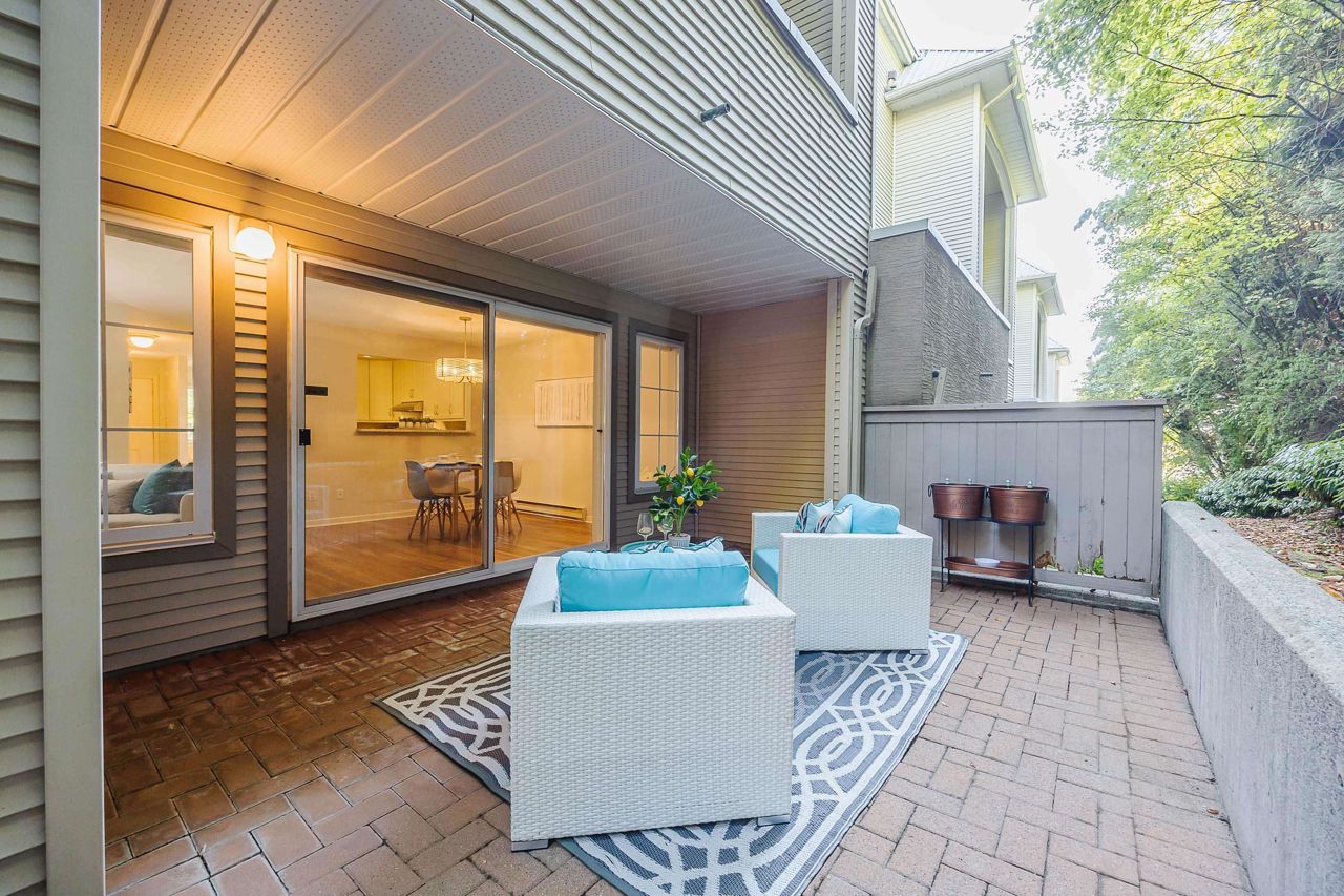With over 1,200 sqft this 2 BDRM + DEN & 2 FULL BATHS Rancher T/house is not to be missed! Fresh Paint, Updated white Kitch w/Quartz Counters & S/S Appl. Dining Rm opens to Lvg Rm w/a cozy corner gas f/p (included in strata fee). Sliders lead out to the Huge Private Patio that runs the full length of the unit! Full size Laundry Rm w/extra storage, Updated Main 4pce Bath, great size 2nd Bdrm. The Lovely & Spacious Primary Bdrm boasts patio access, New Carpet, Updated Spa-like Ensuite complete w/Heated tile flrs & huge walk-in glass Shower. The airy Den/Office makes working from home a breeze. Prime location too – so close to shopping, schools, entertainment & Hwy 1. Be quick and be in before Xmas!