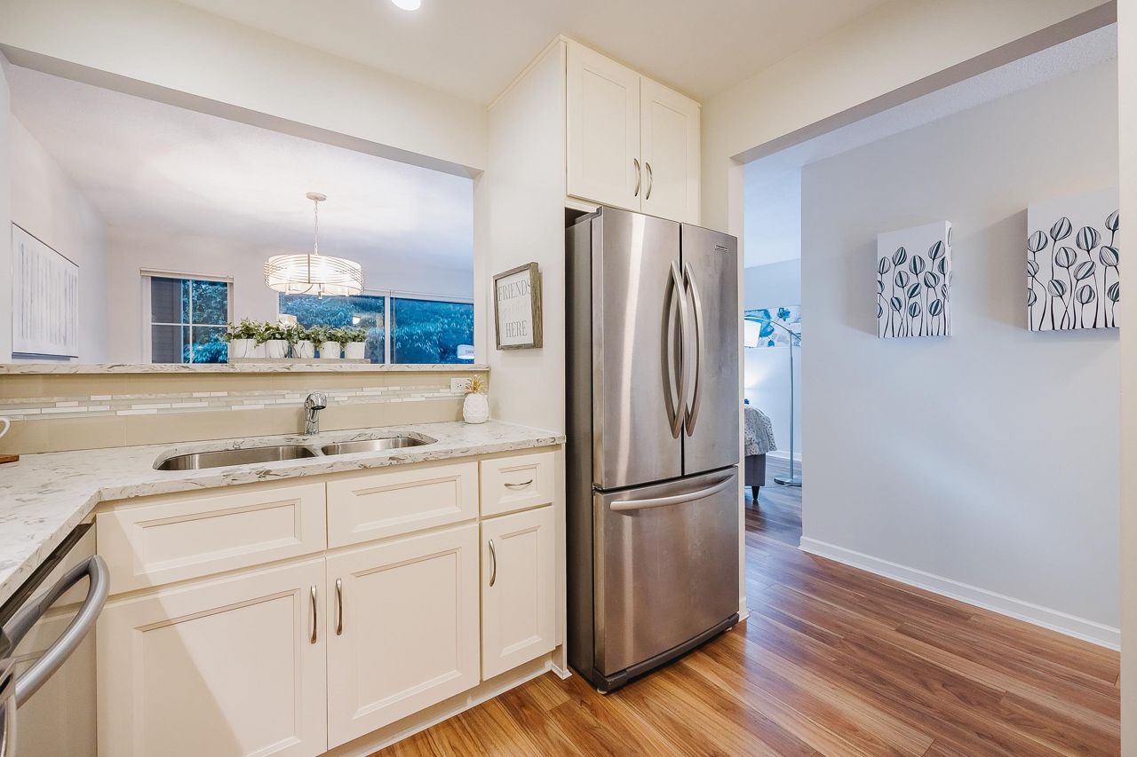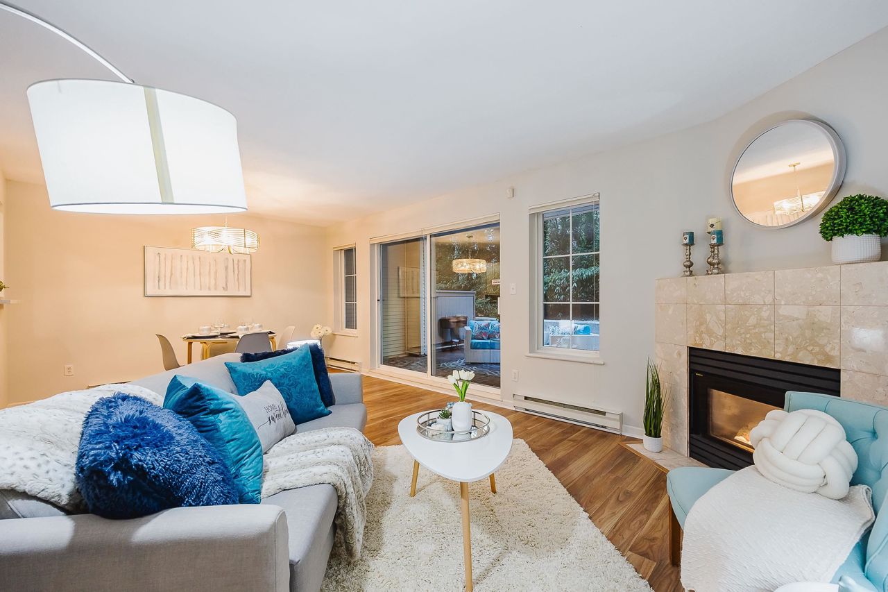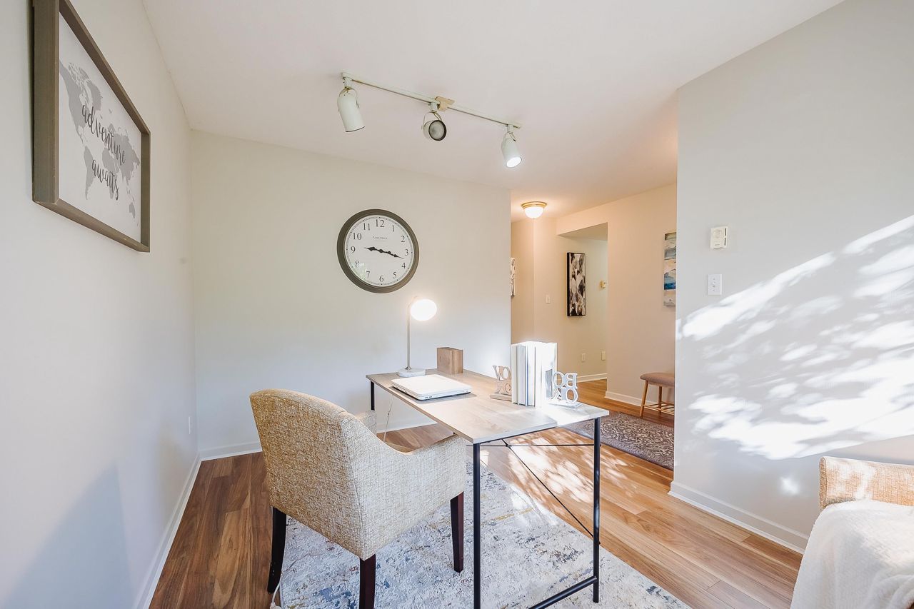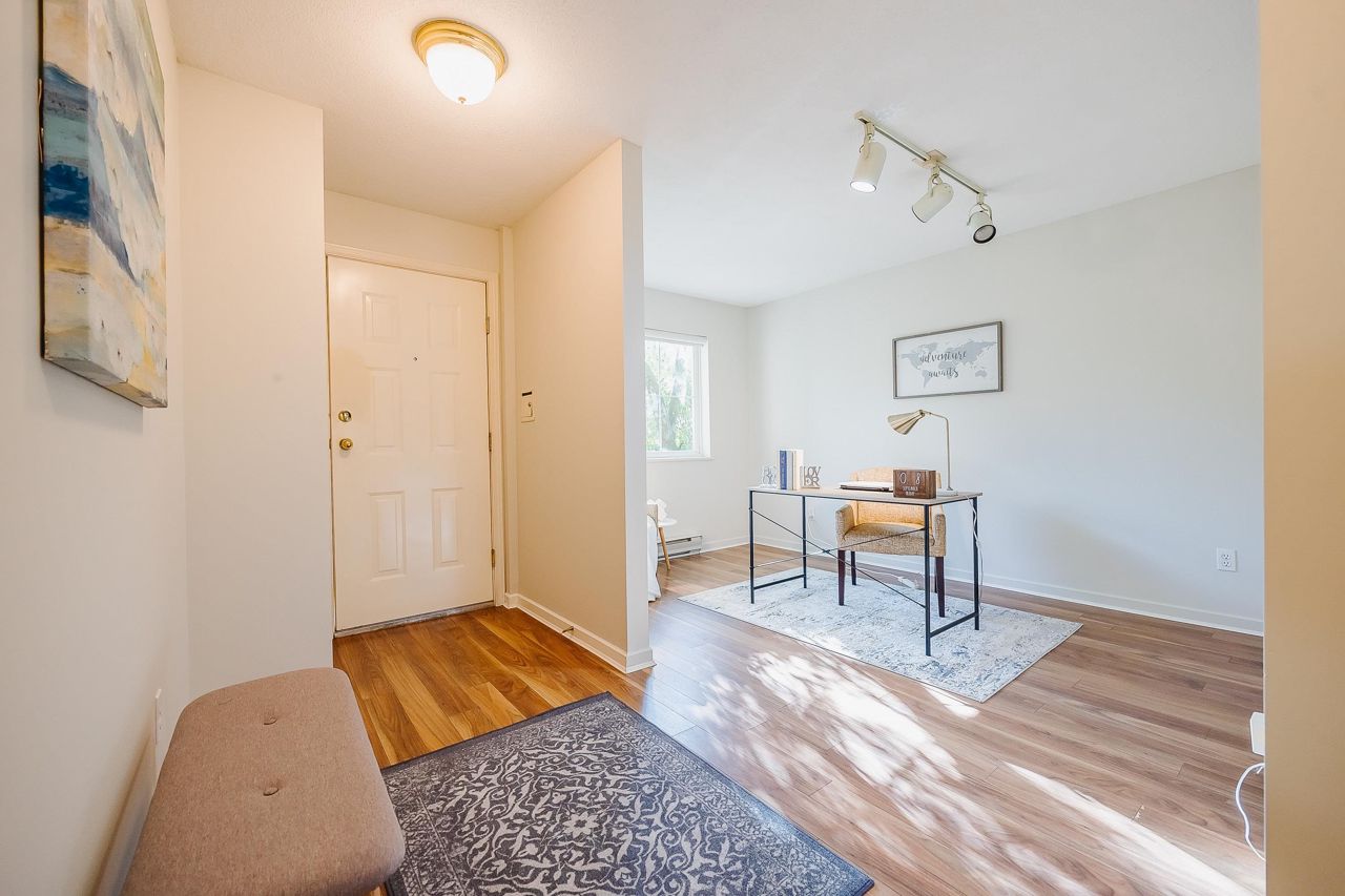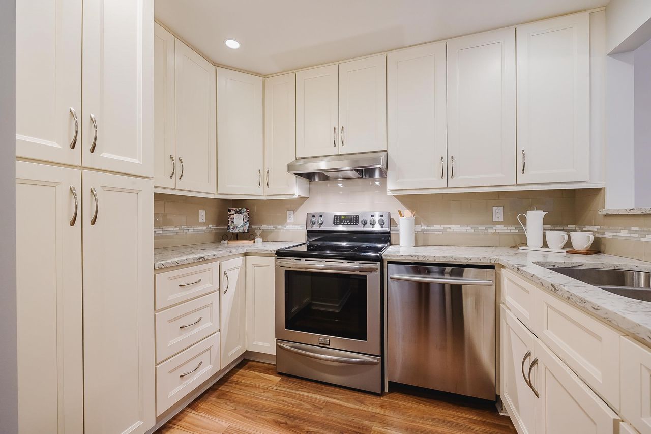 With over 1,200 sqft this 2 BDRM + DEN & 2 FULL BATHS Rancher T/house is not to be missed! Fresh Paint, Updated white Kitch w/Quartz Counters & S/S Appl. Dining Rm opens to Lvg Rm w/a cozy corner gas f/p (included in strata fee). Sliders lead out to the Huge Private Patio that runs the full length of the unit! Full size Laundry Rm w/extra storage, Updated Main 4pce Bath, great size 2nd Bdrm. The Lovely & Spacious Primary Bdrm boasts patio access, New Carpet, Updated Spa-like Ensuite complete w/Heated tile flrs & huge walk-in glass Shower. The airy Den/Office makes working from home a breeze. Prime location too – so close to shopping, schools, entertainment & Hwy 1. Be quick and be in before Xmas!