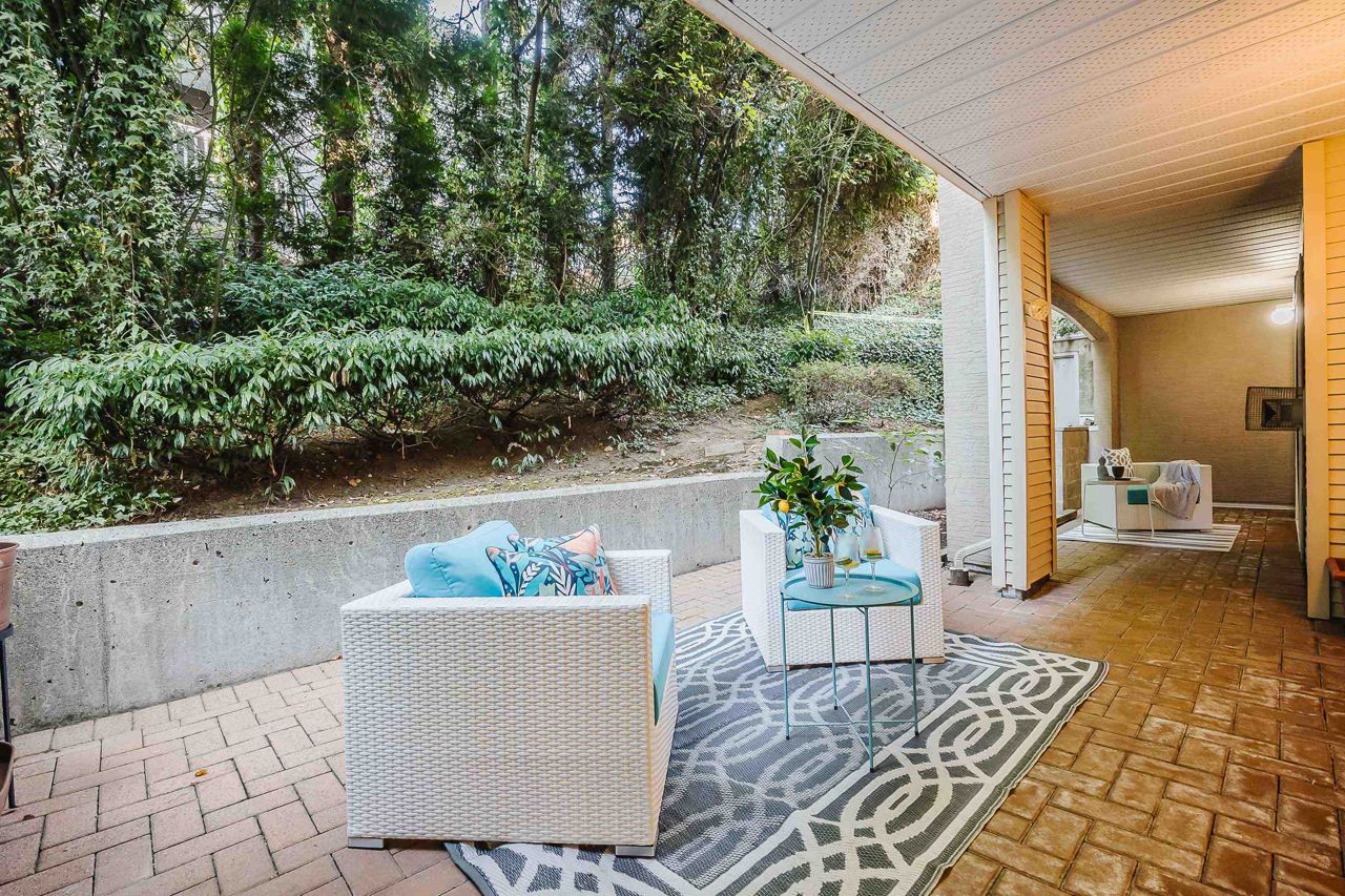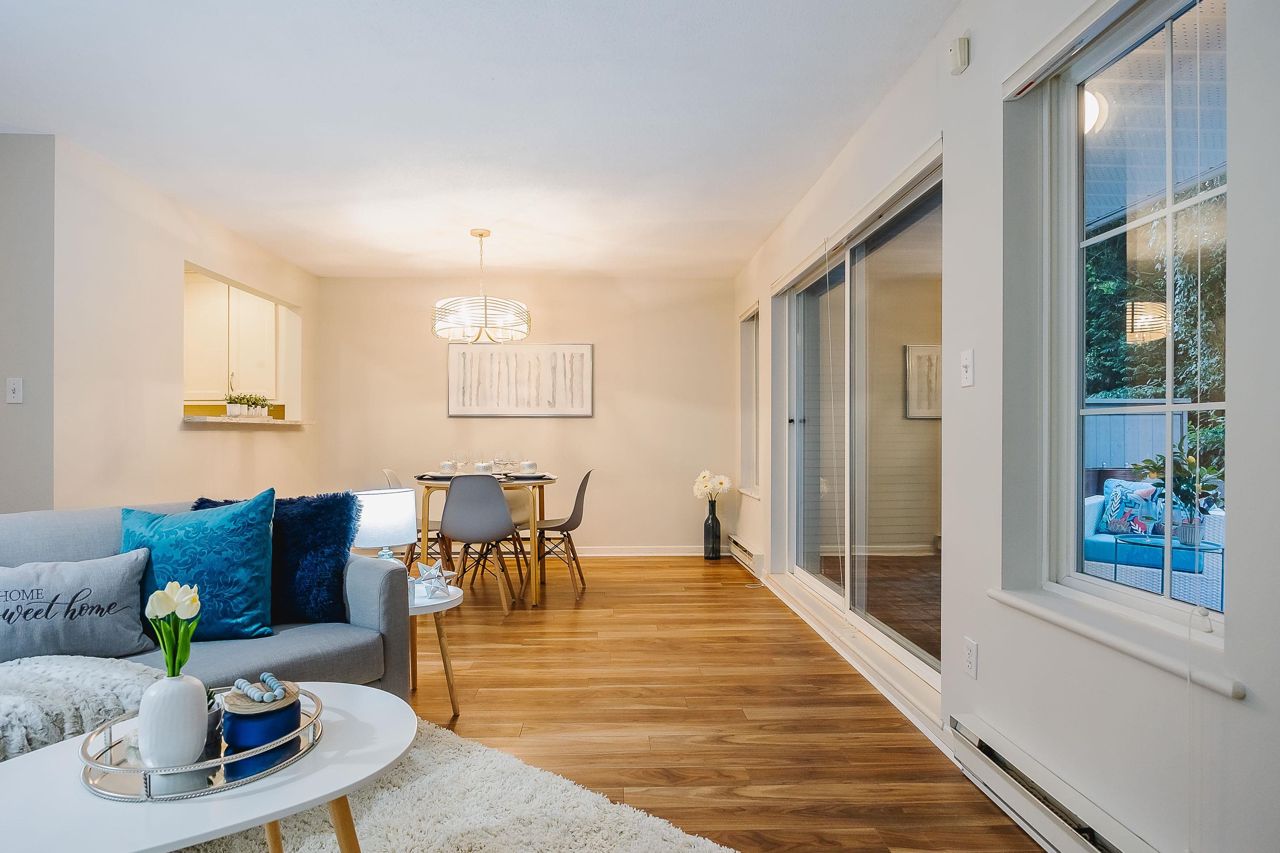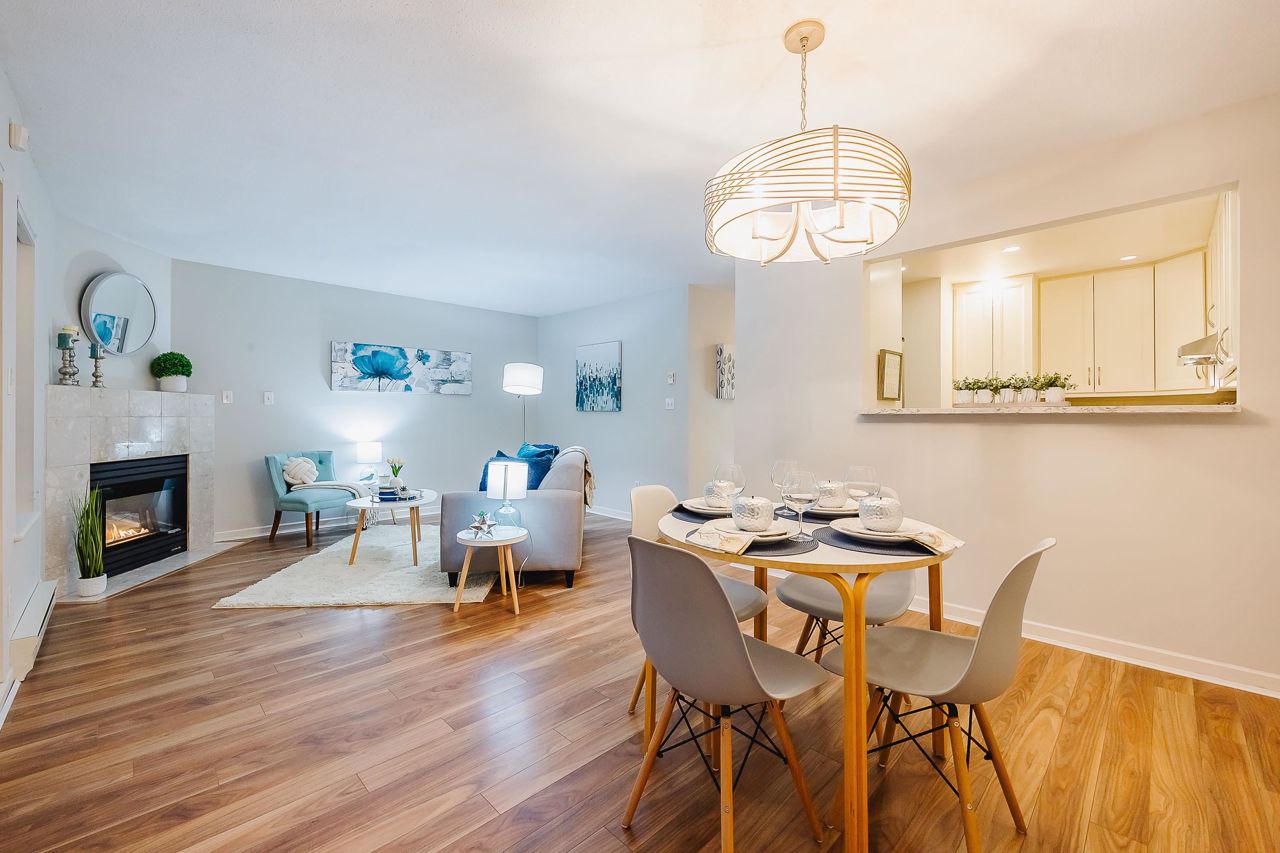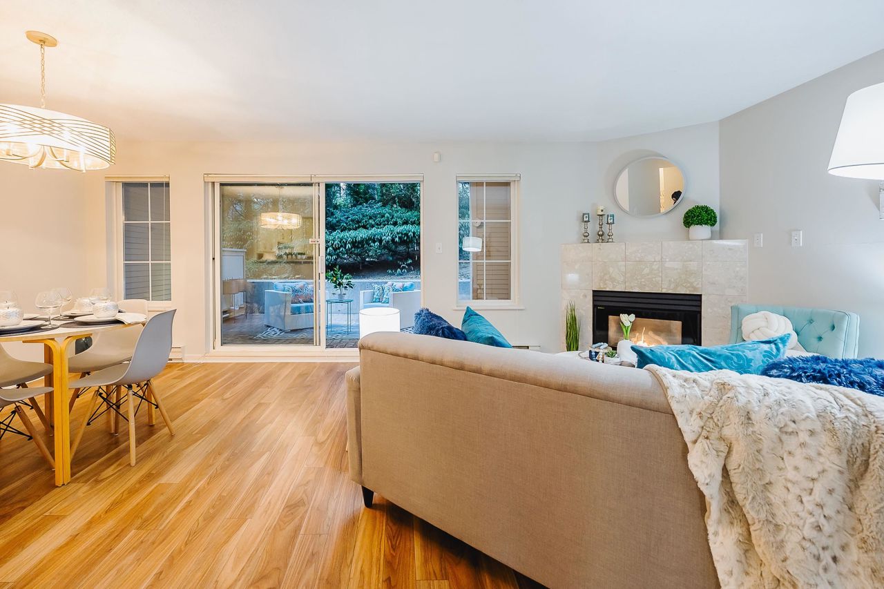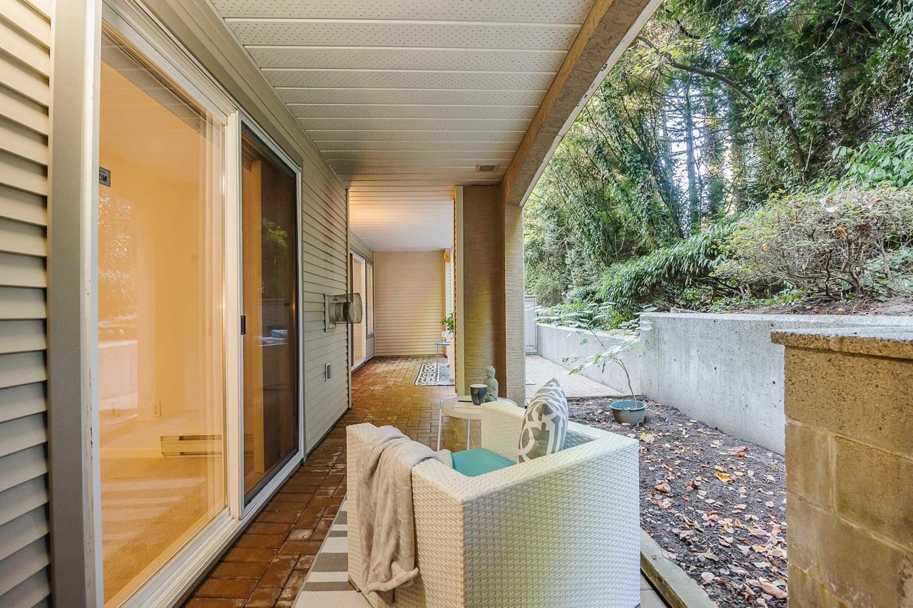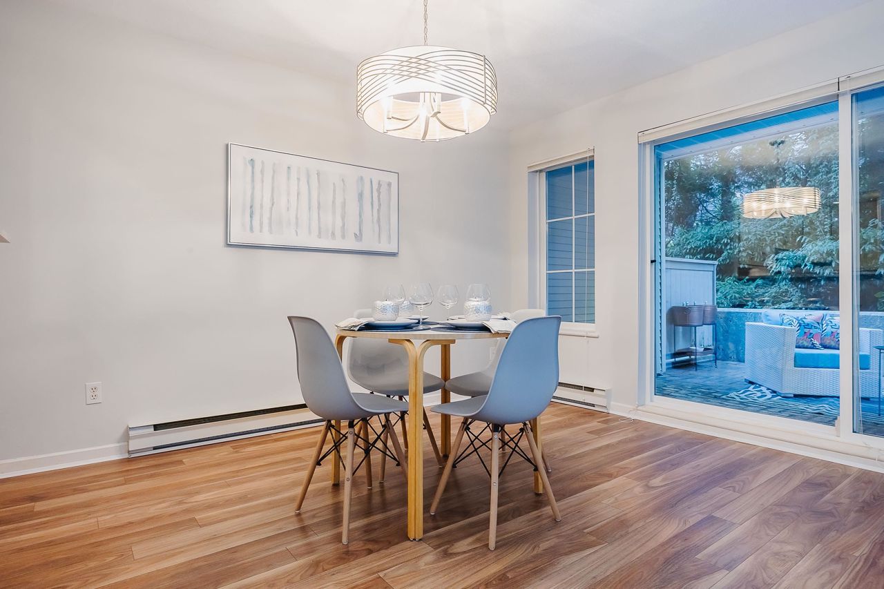 With over 1,200 sqft this 2 BDRM + DEN & 2 FULL BATHS Rancher T/house is not to be missed! Fresh Paint, Updated white Kitch w/Quartz Counters & S/S Appl. Dining Rm opens to Lvg Rm w/a cozy corner gas f/p (included in strata fee). Sliders lead out to the Huge Private Patio that runs the full length of the unit! Full size Laundry Rm w/extra storage, Updated Main 4pce Bath, great size 2nd Bdrm. The Lovely & Spacious Primary Bdrm boasts patio access, New Carpet, Updated Spa-like Ensuite complete w/Heated tile flrs & huge walk-in glass Shower. The airy Den/Office makes working from home a breeze. Prime location too – so close to shopping, schools, entertainment & Hwy 1. Be quick and be in before Xmas!