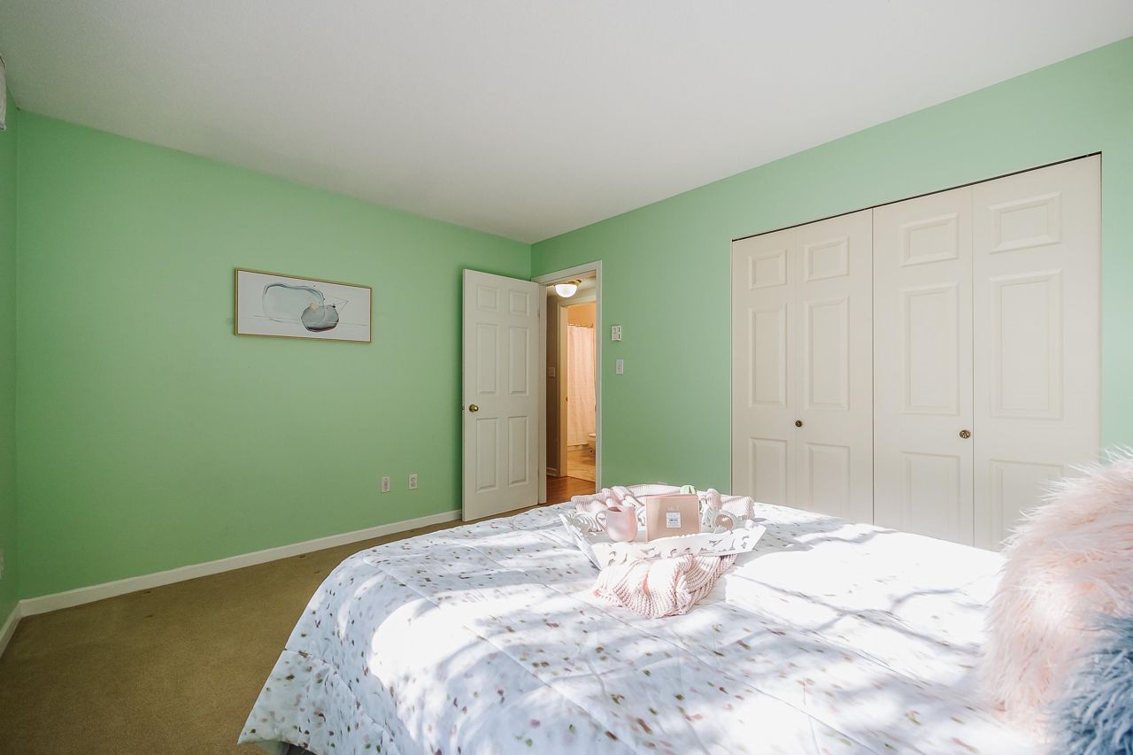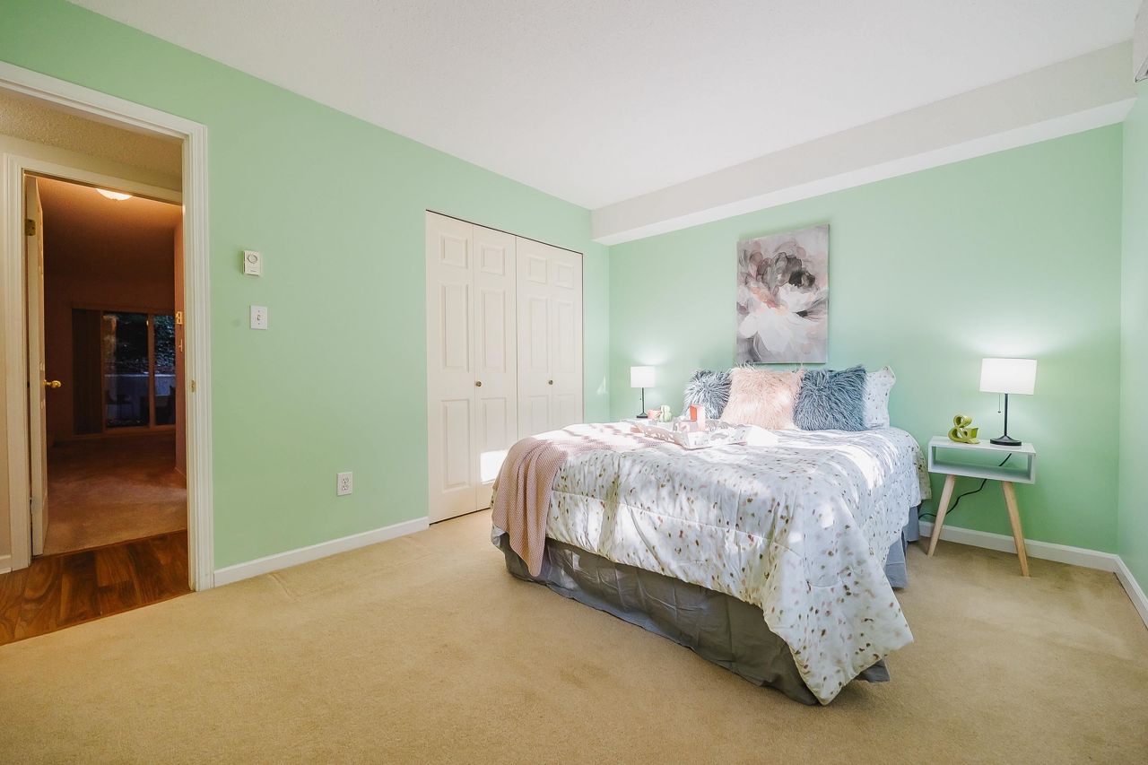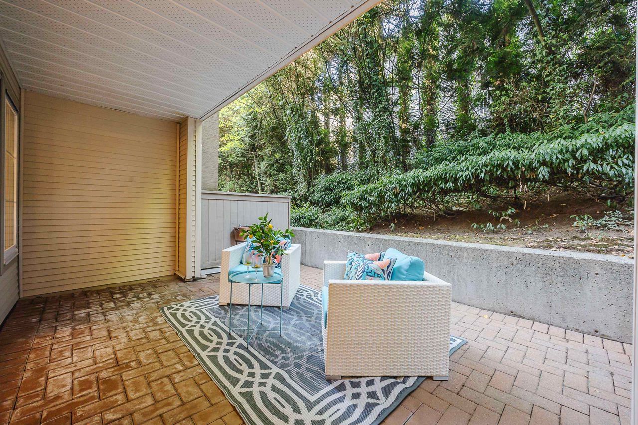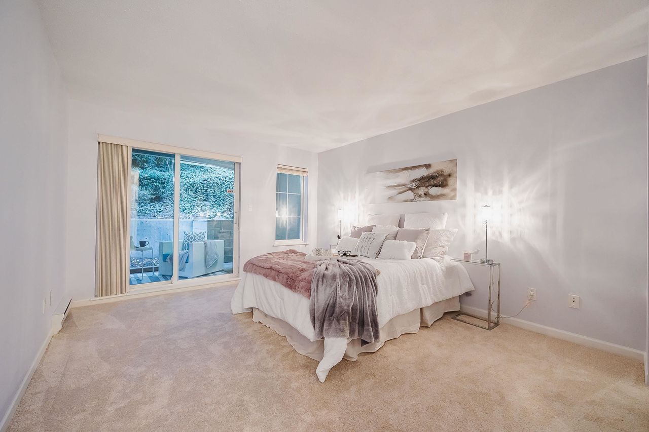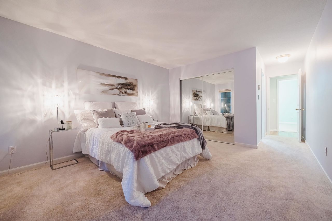 With over 1,200 sqft this 2 BDRM + DEN & 2 FULL BATHS Rancher T/house is not to be missed! Fresh Paint, Updated white Kitch w/Quartz Counters & S/S Appl. Dining Rm opens to Lvg Rm w/a cozy corner gas f/p (included in strata fee). Sliders lead out to the Huge Private Patio that runs the full length of the unit! Full size Laundry Rm w/extra storage, Updated Main 4pce Bath, great size 2nd Bdrm. The Lovely & Spacious Primary Bdrm boasts patio access, New Carpet, Updated Spa-like Ensuite complete w/Heated tile flrs & huge walk-in glass Shower. The airy Den/Office makes working from home a breeze. Prime location too – so close to shopping, schools, entertainment & Hwy 1. Be quick and be in before Xmas!