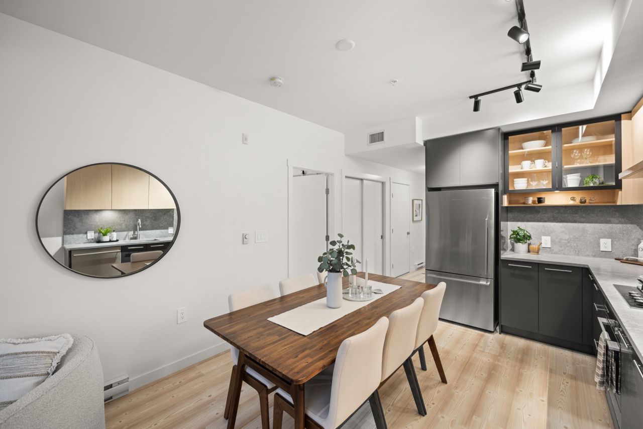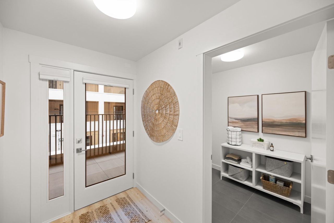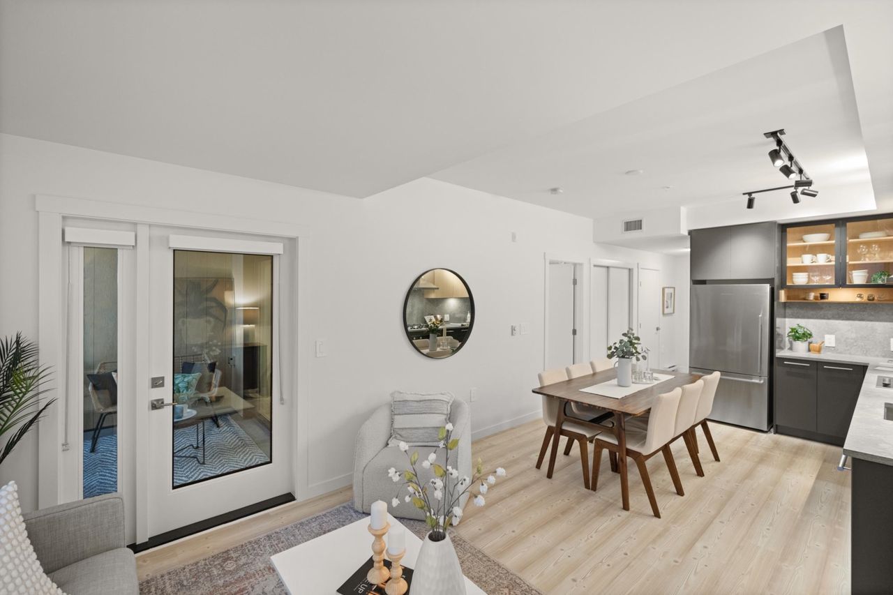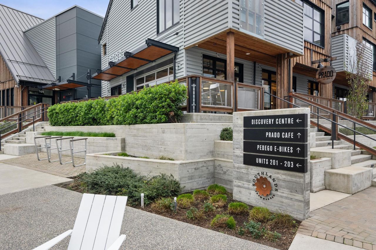 DISTRICT FLATS at Southlands, Beach community in Boundary Bay. This XL 1 bdrm w/ample storage, over-height ceilings, 713sqft of interior space+large, covered balcony w/gas hook-up is absolutely dreamy. Bdrm that fits king sized bed, spacious bathroom w/in-floor heating & window, glass entry door allows light to flood your home from East & West. Refined industrial interior design w/premium finishes, Fisher & Paykel appl. Shared courtyard & outdoor dining area design by van der Zalm. In the heart of Market District w/Prado Coffee, The Hub Refillery, Pedego E-bikes, Red Barn, Farmers Market, The Grange, Amphitheatre, Earthwise Garden & Farm. Steps to The Best Beach in Lower Mainland if you ask me (and I only tell those I like). Upsizing? Downsizing? Come by to appreciate it!
