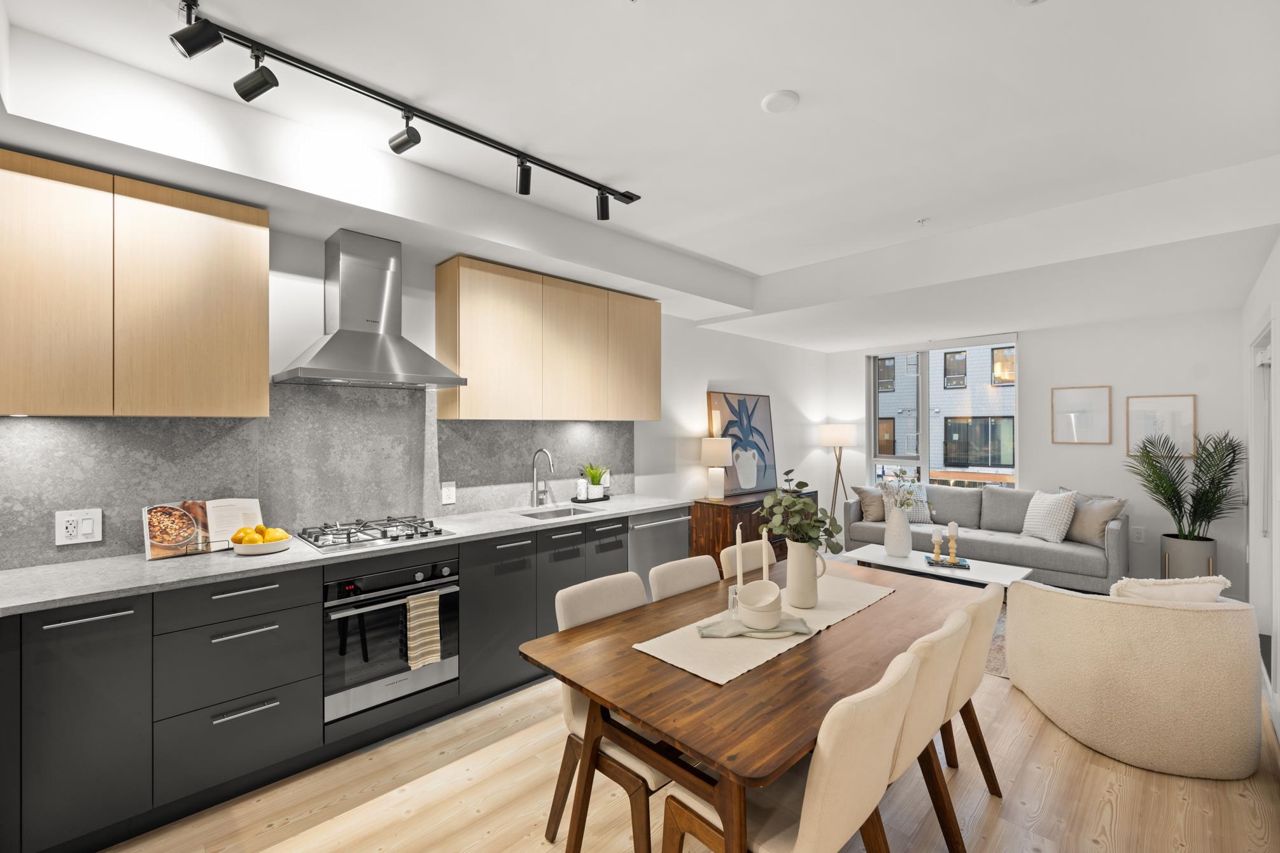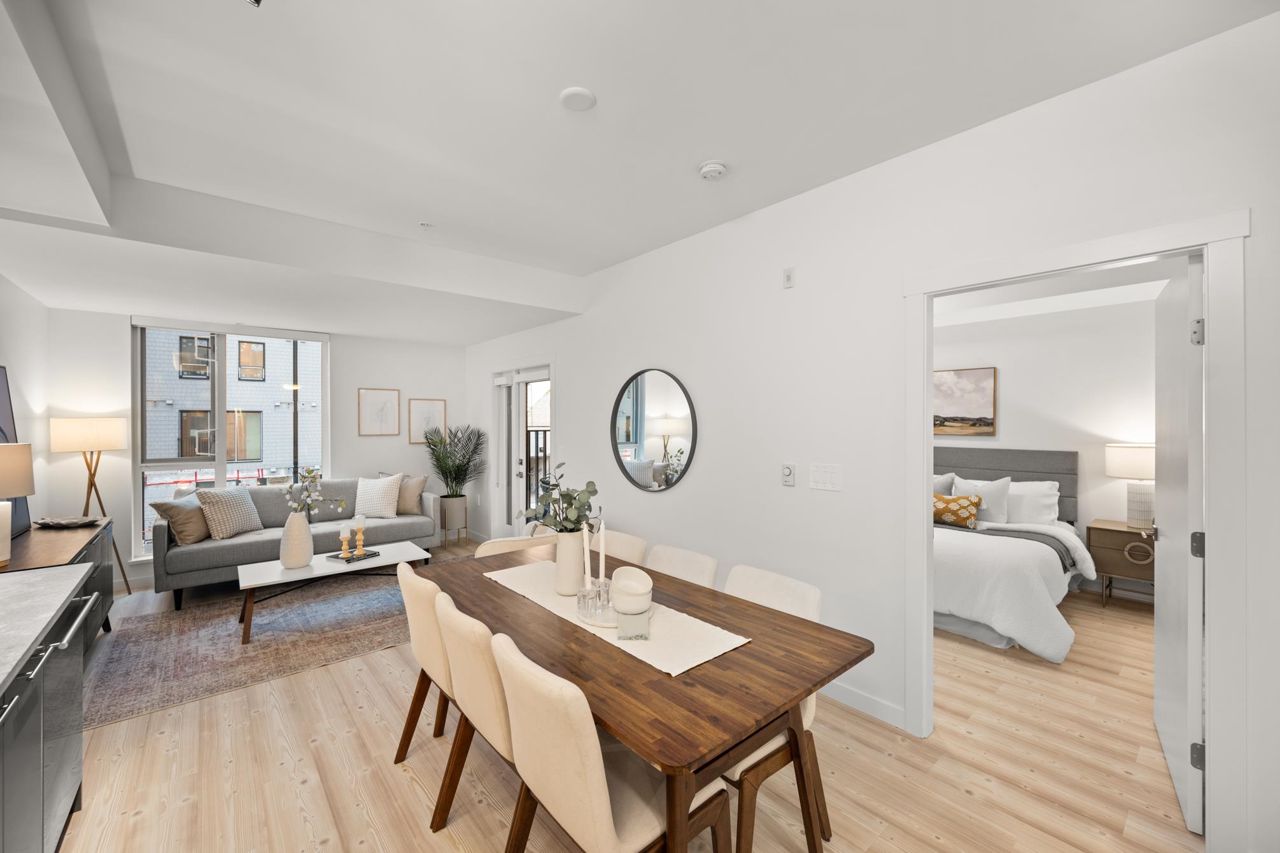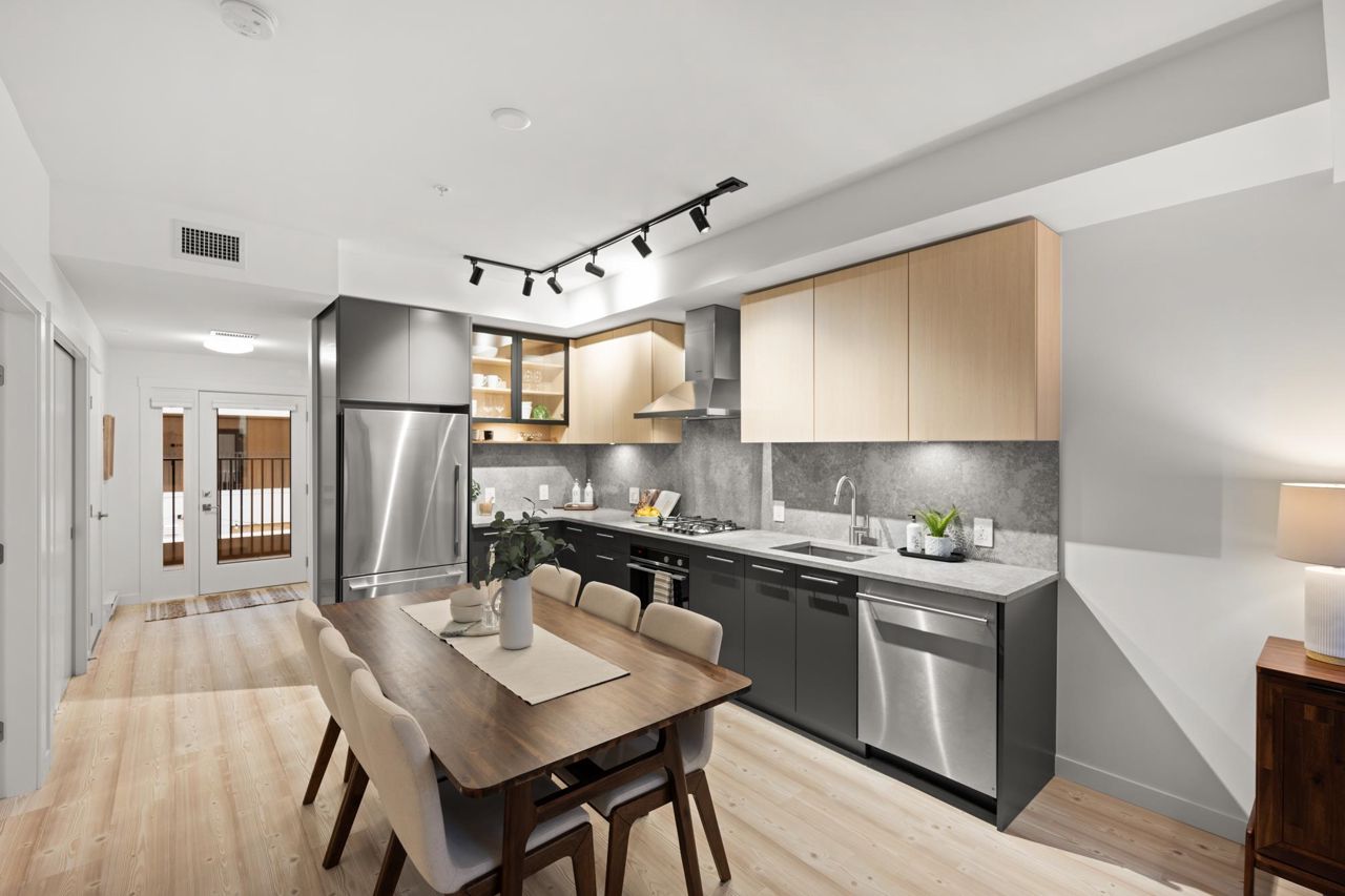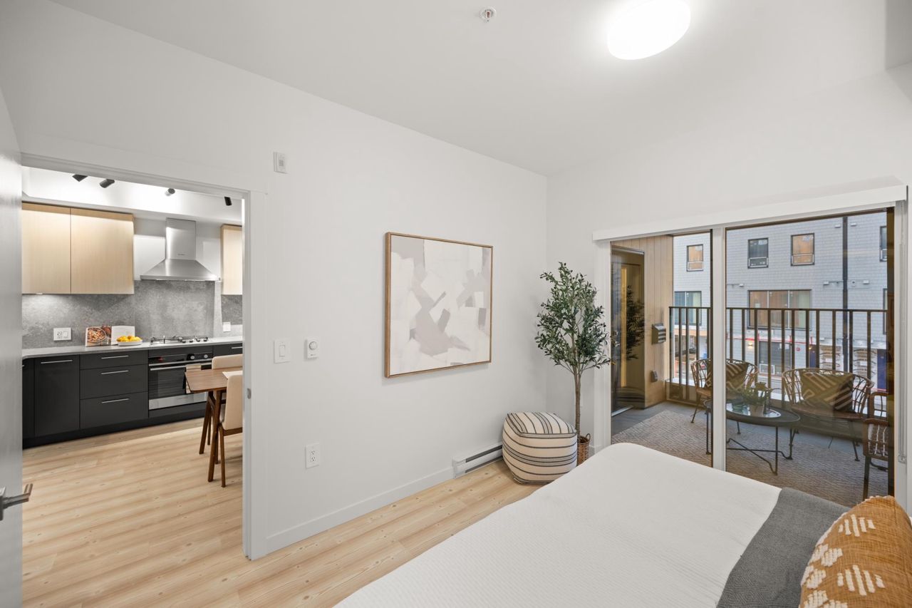 DISTRICT FLATS at Southlands, Beach community in Boundary Bay. This XL 1 bdrm w/ample storage, over-height ceilings, 713sqft of interior space+large, covered balcony w/gas hook-up is absolutely dreamy. Bdrm that fits king sized bed, spacious bathroom w/in-floor heating & window, glass entry door allows light to flood your home from East & West. Refined industrial interior design w/premium finishes, Fisher & Paykel appl. Shared courtyard & outdoor dining area design by van der Zalm. In the heart of Market District w/Prado Coffee, The Hub Refillery, Pedego E-bikes, Red Barn, Farmers Market, The Grange, Amphitheatre, Earthwise Garden & Farm. Steps to The Best Beach in Lower Mainland if you ask me (and I only tell those I like). Upsizing? Downsizing? Come by to appreciate it!