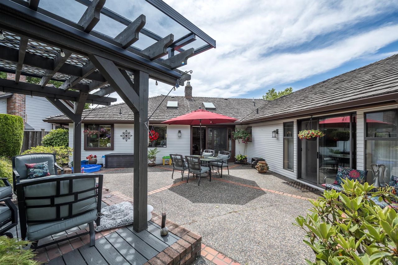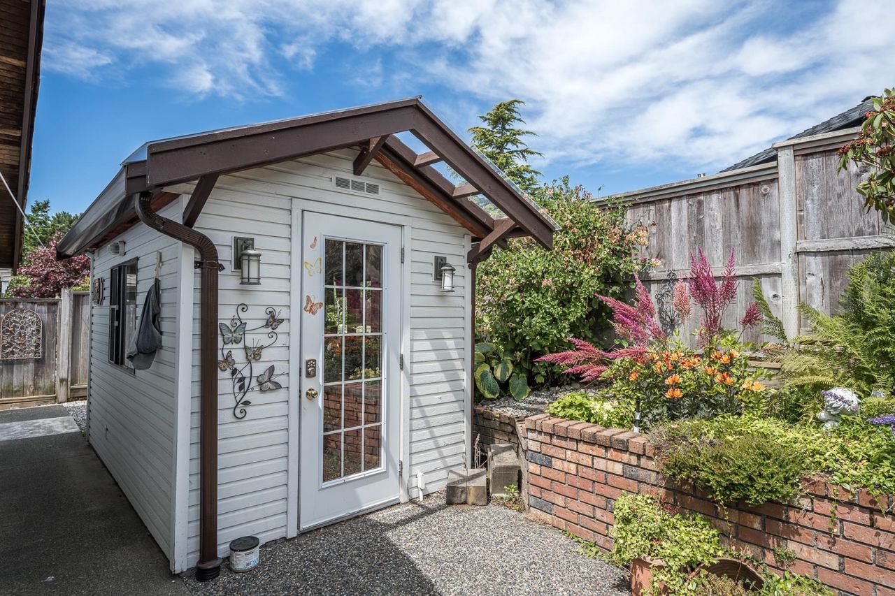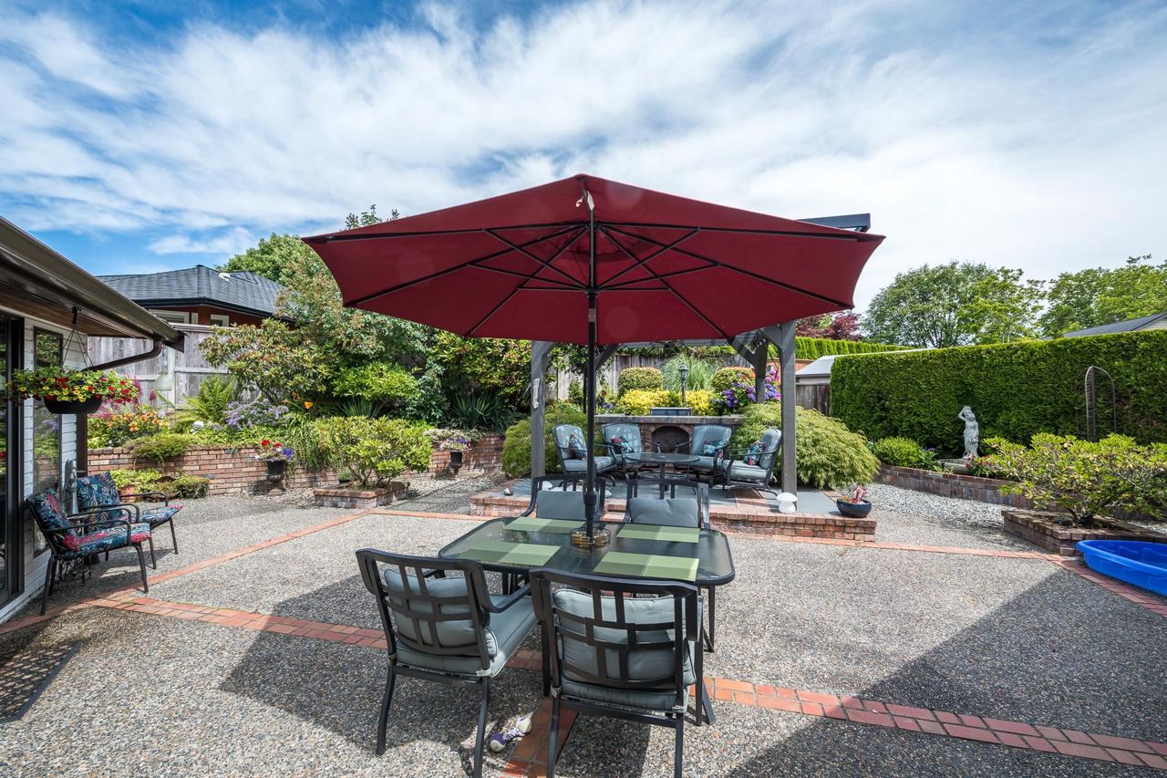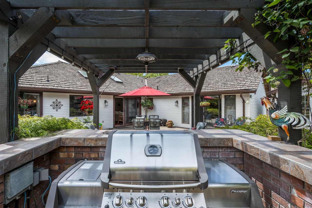 4 Bedroom Rancher – Quality built & beautifully maintained in Forest By The Bay. This home offers an extremely functional floor plan with grand living dining and family room space open to a beautiful manicured private back garden. The outdoor living space offers year-round enjoyment with aggregate patios, mature perennial landscaping, covered pergola with bbq area, and full irrigation. Upgrades include eucalyptus hardwood flooring in main living areas, updated ensuite w/seamless glass shower, new gas fireplace inserts, remote blinds, new perimeter drainage, new exterior paint , Navien hot water, newer garage doors. separate outdoor artists' studio with heat and electric. 5 min walk to town center, lawn bowling and rec center!