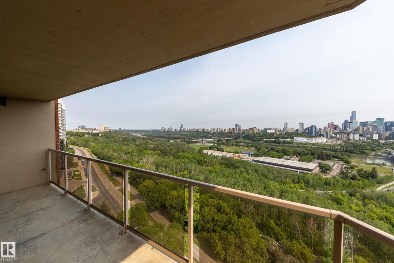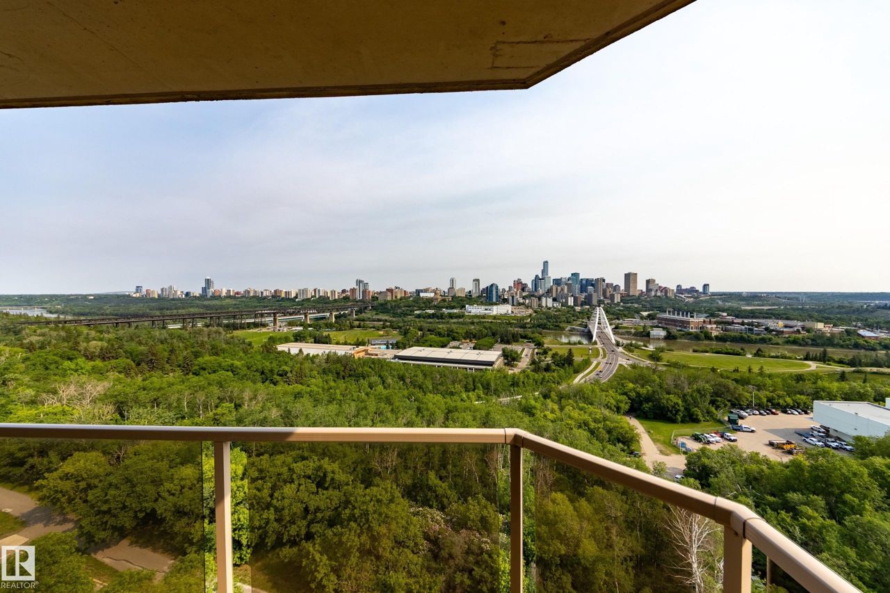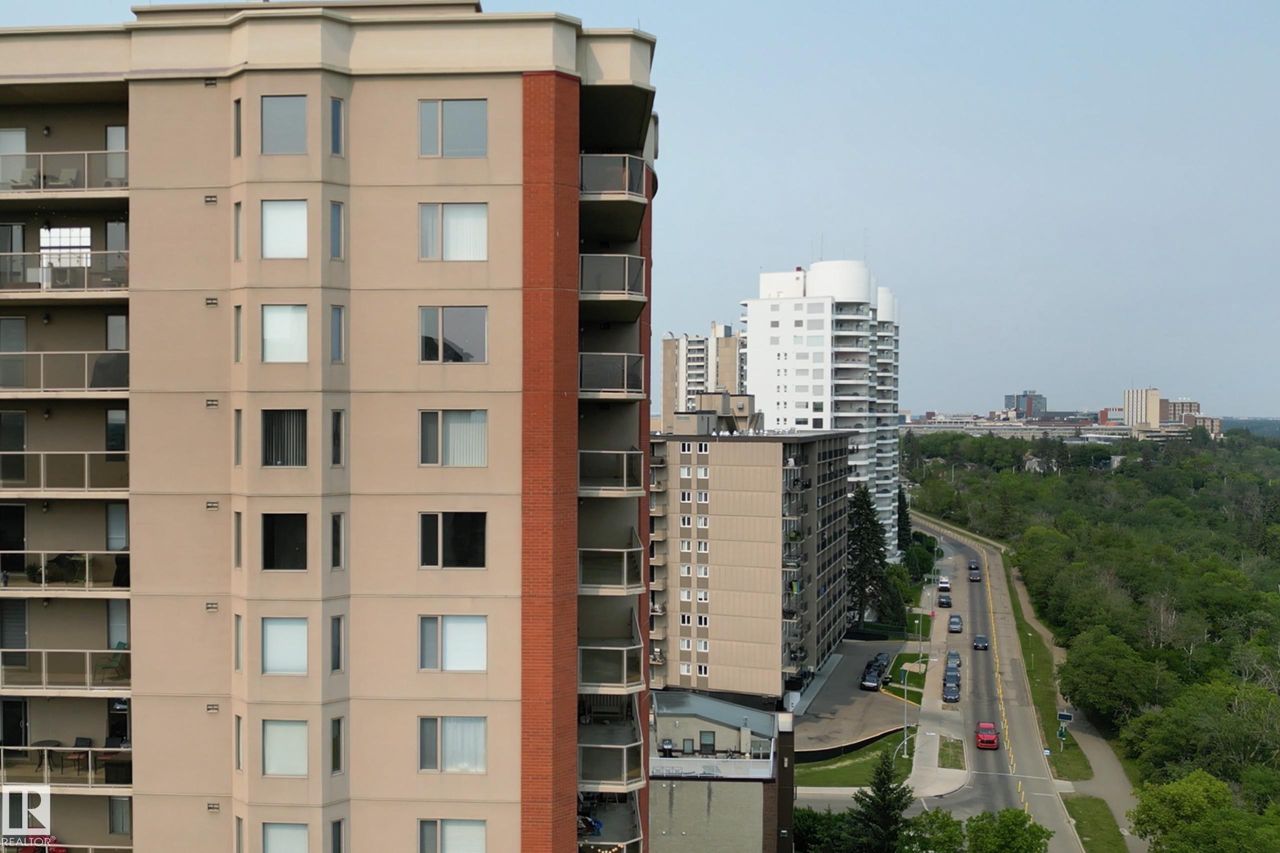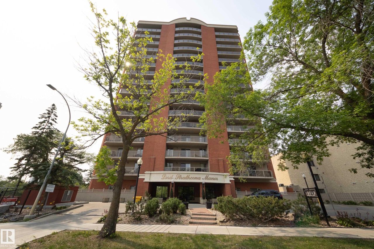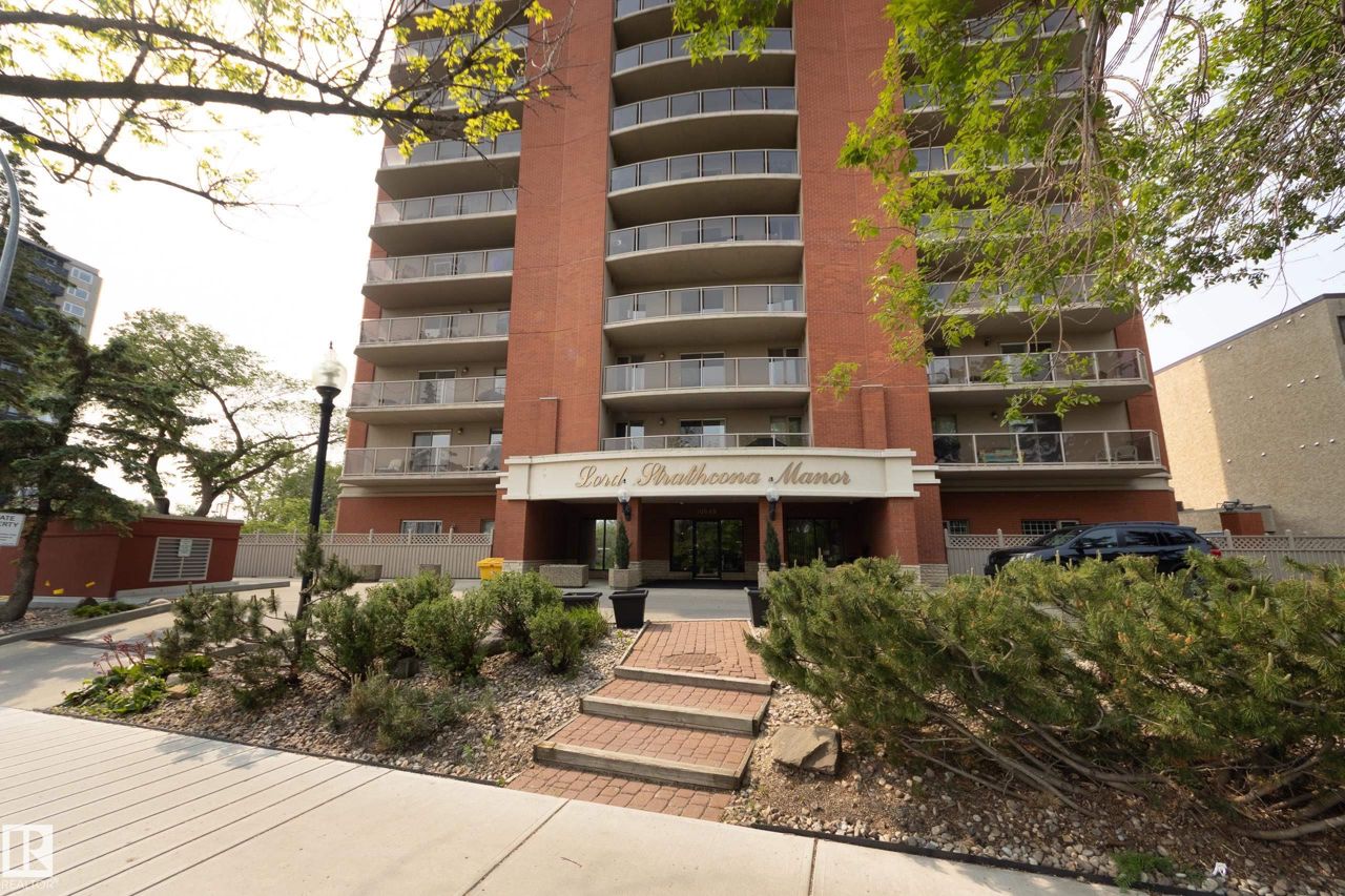 Spectacular RIVER VALLEY VIEW, in this immaculate corner unit with TWO TITLED PARKING STALLS. The prestigious Lord Strathcona Manor welcomes you to your bright & spacious 1,041 sq ft 2 bedroom, 2 bath, corner unit. Enjoy sweeping views of the the scenic river valley & city skyline from your massive 12th floor balcony. This well-managed, PET-FRIENDLY, secure building is a short walk to U of A, downtown and Whyte Ave. Step inside your unit to the large foyer & enjoy plenty of natural light from two sides. Perfect for entertaining, there's a large living room with a corner fireplace to keep you cozy on cool nights, ample dining space and efficient kitchen, all with access to the balcony. The primary bedroom is large and features a sunny bow window, dual closets and a full ensuite. There's a good-sized second bedroom and another full 4-piece bath. And you'll love the convenience of in-suite laundry, an on-site fitness room bike storage and TWO TITLED UNDERGROUND STALLS. Fees cover all but power & cable.