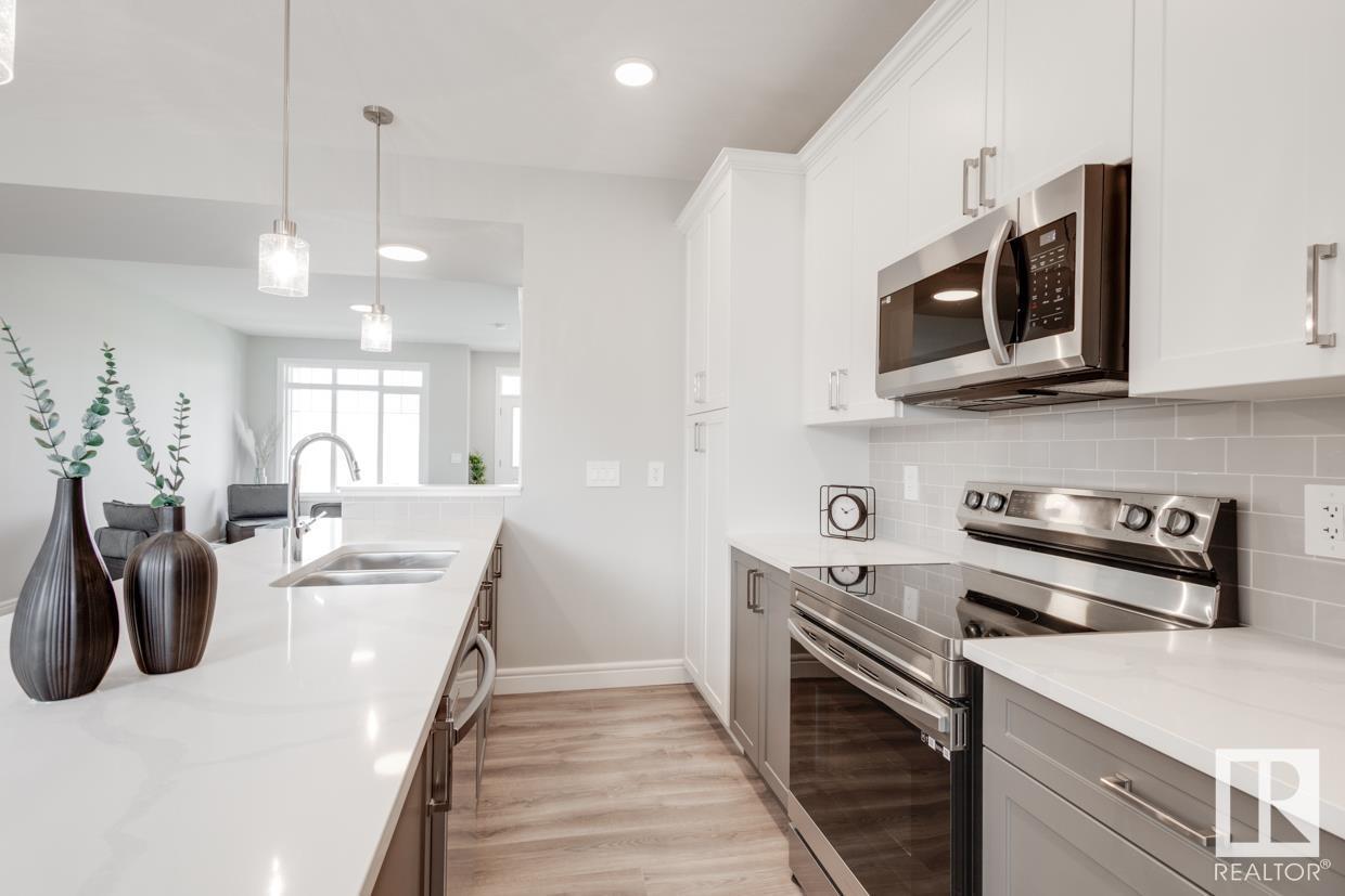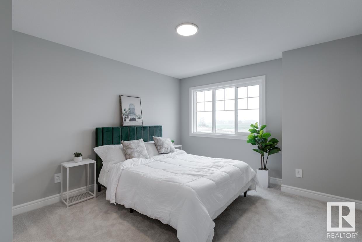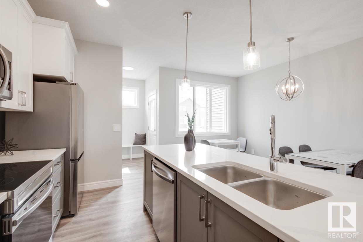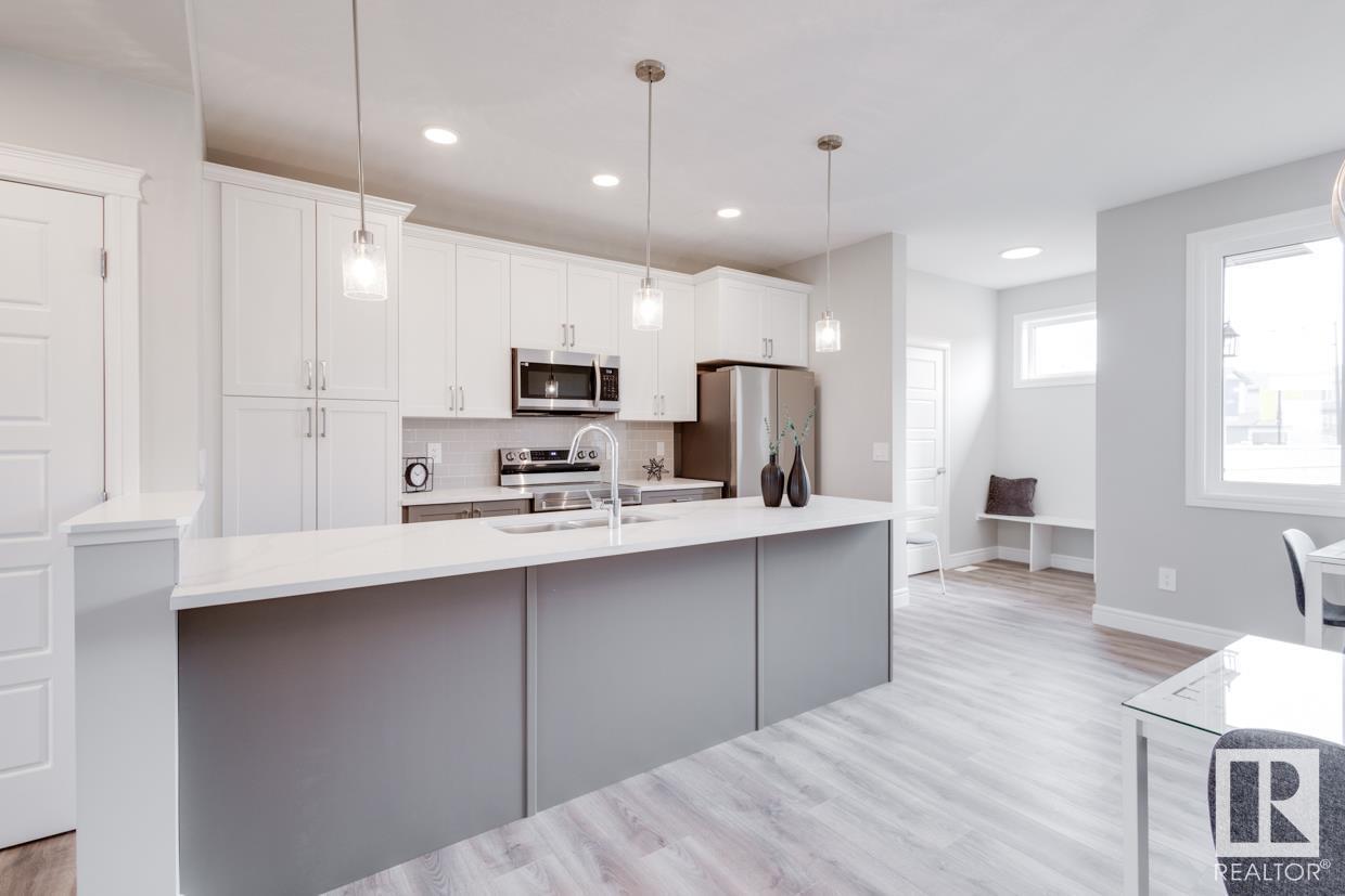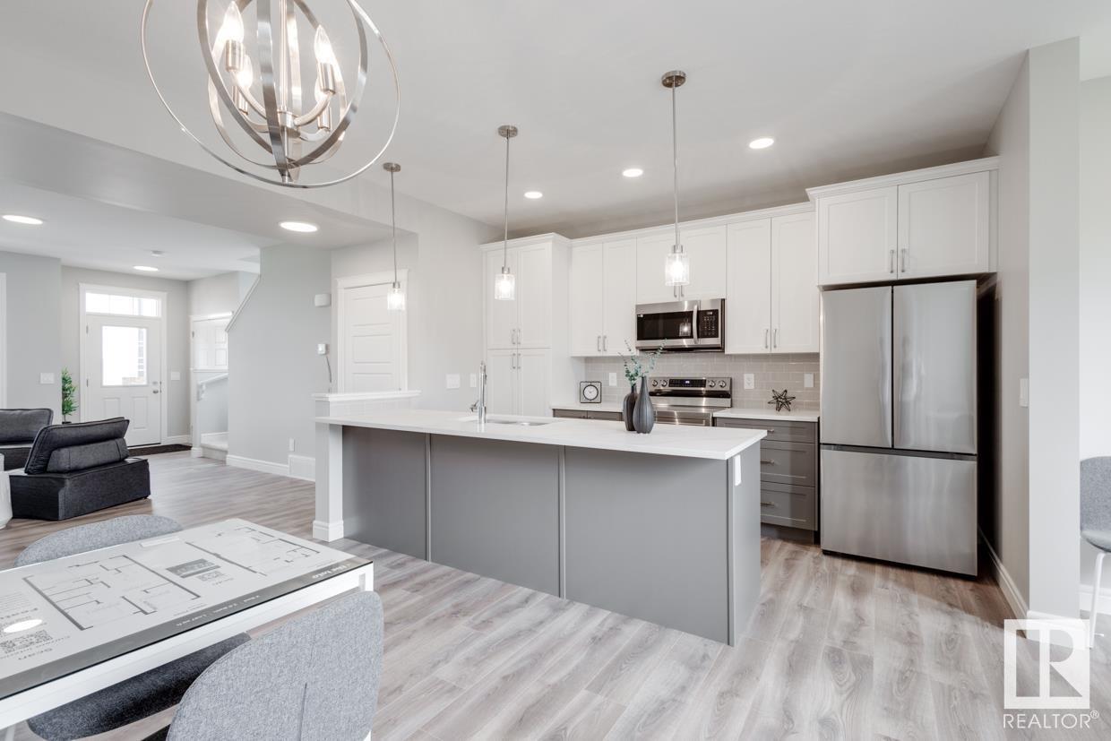END UNIT! SIDE ENTRY. NO CONDO FEES! Experience stylish living in Keswick. This beautiful 2 story townhouse offers modern finishes. The main floor features 9' ceilings and a convenient half bath, perfect for guests. The heart of the home is the beautifully designed kitchen, featuring upgraded 42 cabinets and quartz countertops. Upstairs, you'll find a laundry room, full 4-piece bathroom, 2 large bedrooms, and a master with a walk-in closet and luxurious ensuite. Enjoy the comfort and efficiency of this home with its double detached garage, $3,000 appliance allowance, unfinished basement with painted floor, high-efficiency furnace, and triple-pane windows. This townhouse has NO CONDO FEES & is FULLY LANDSCAPED. Plus, the separate side entrance and legal suite rough ins offer the potential for added income or the perfect space for extended family. Don't miss this incredible opportunity to own a piece of Keswick. Photos are of the showhome. Appliances NOT included. HOA TBD. (id:22211)