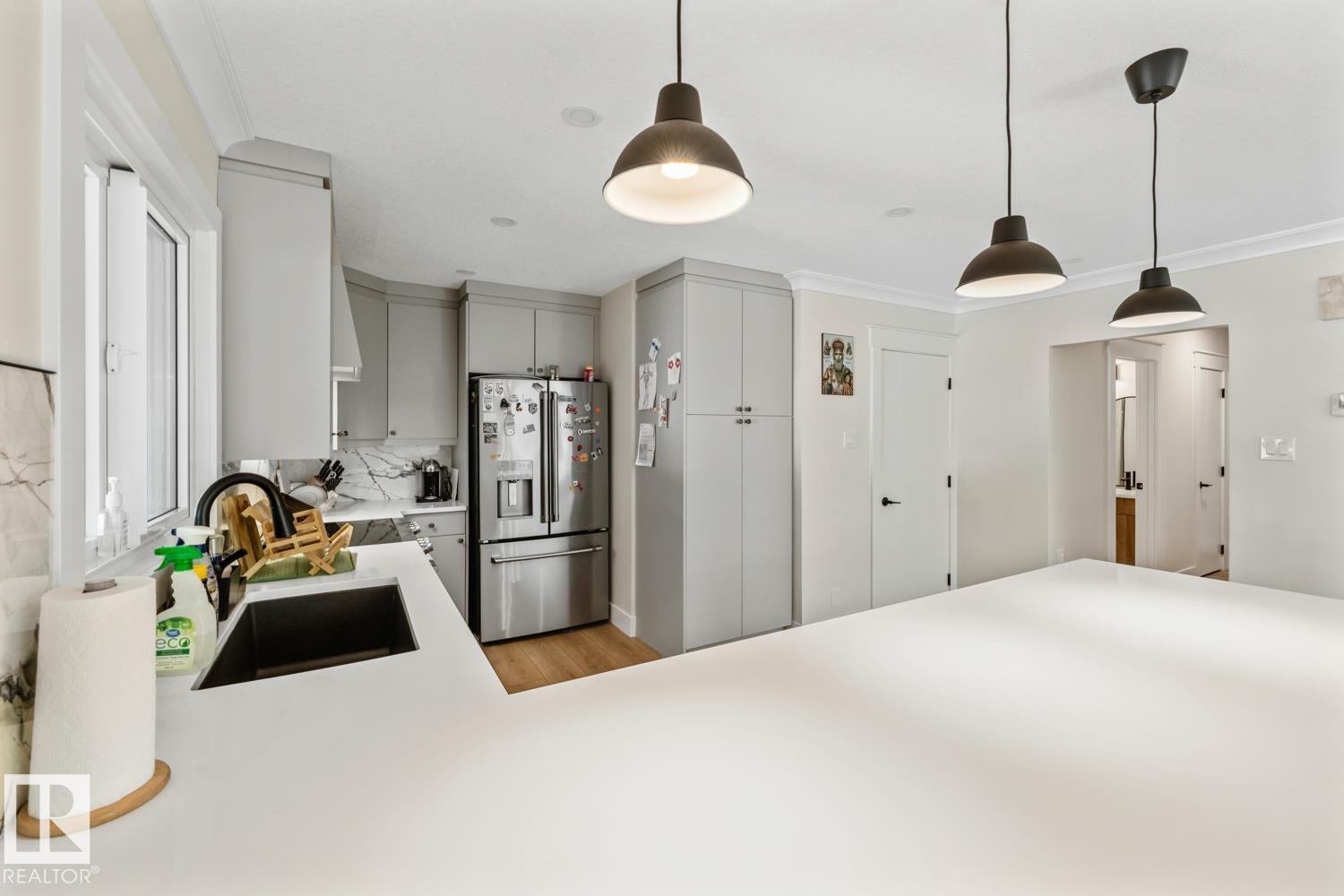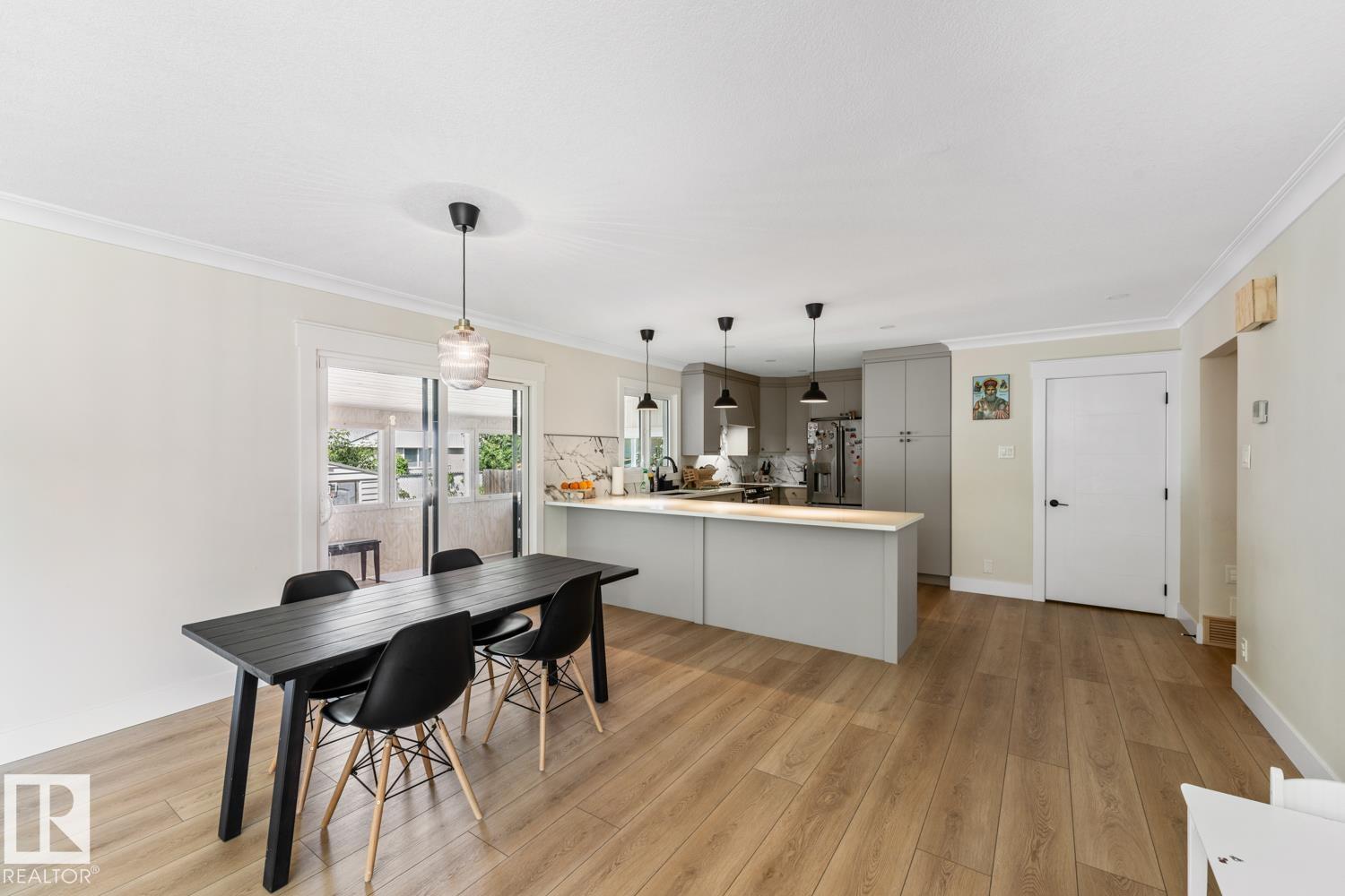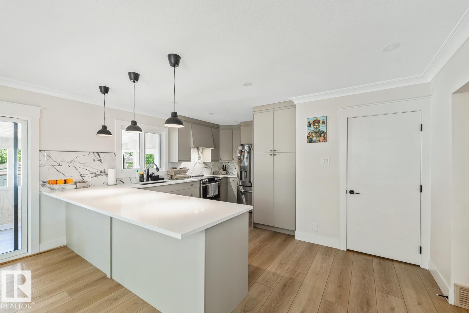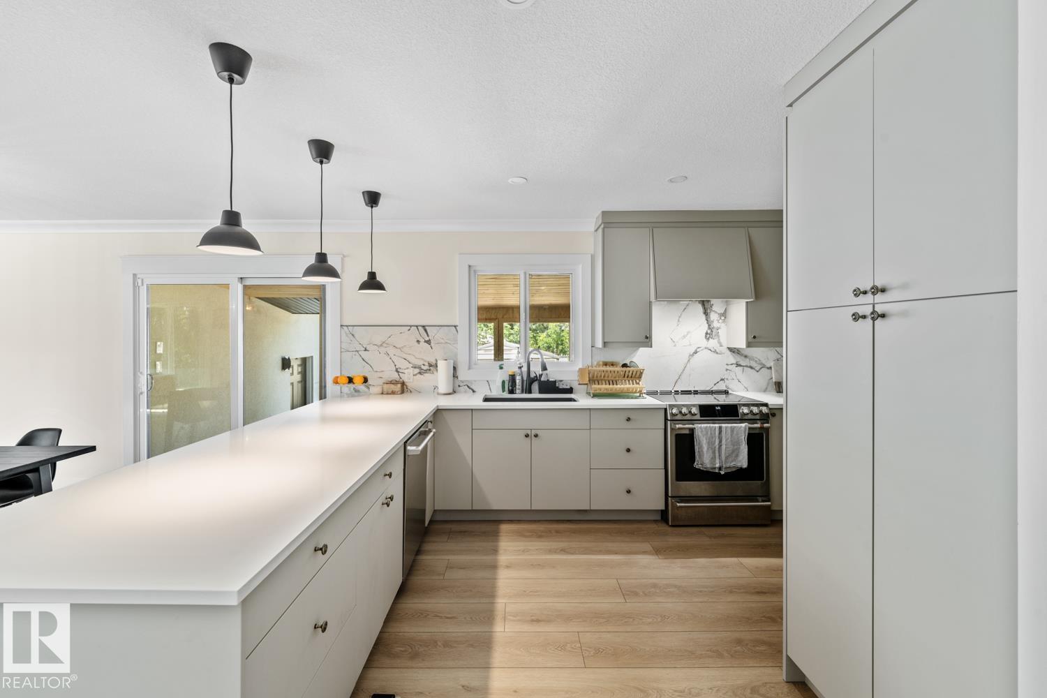 This charming, fully renovated bungalow in the heart of Laurier Heights offers over 2300 sqft of developed living space. Upstairs has a bright open concept with a modern kitchen perfect for family get-togethers, featuring stainless steel appliances and large peninsula. There are two spacious bedrooms and 5 piece bathroom. The fully finished basement has a large rec room, 2 additional bedrooms, laundry and second full bathroom. The extensive renovations include: new flooring, new windows, new roof, newer hot water tank and new exterior stucco. Lastly there is a double attached garage w/ new electrical and drywall, A/C and bright sunroom off the kitchen overlooking the backyard. Located in one of Edmonton's best neighborhoods, close to great schools and a walk away from Laurier Heights playground. This home is ready to welcome its new owners!