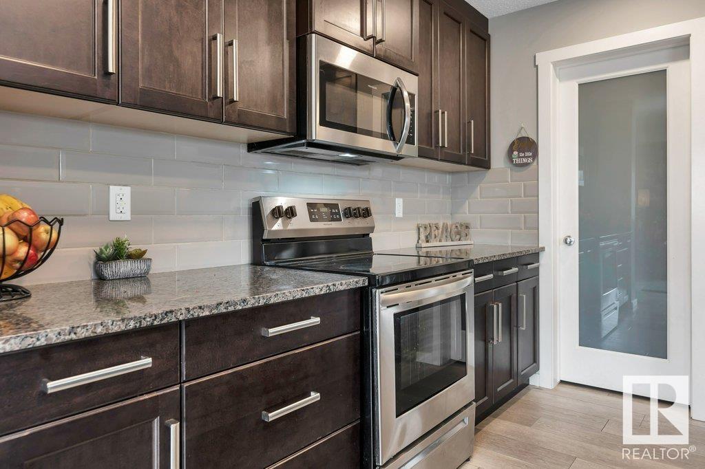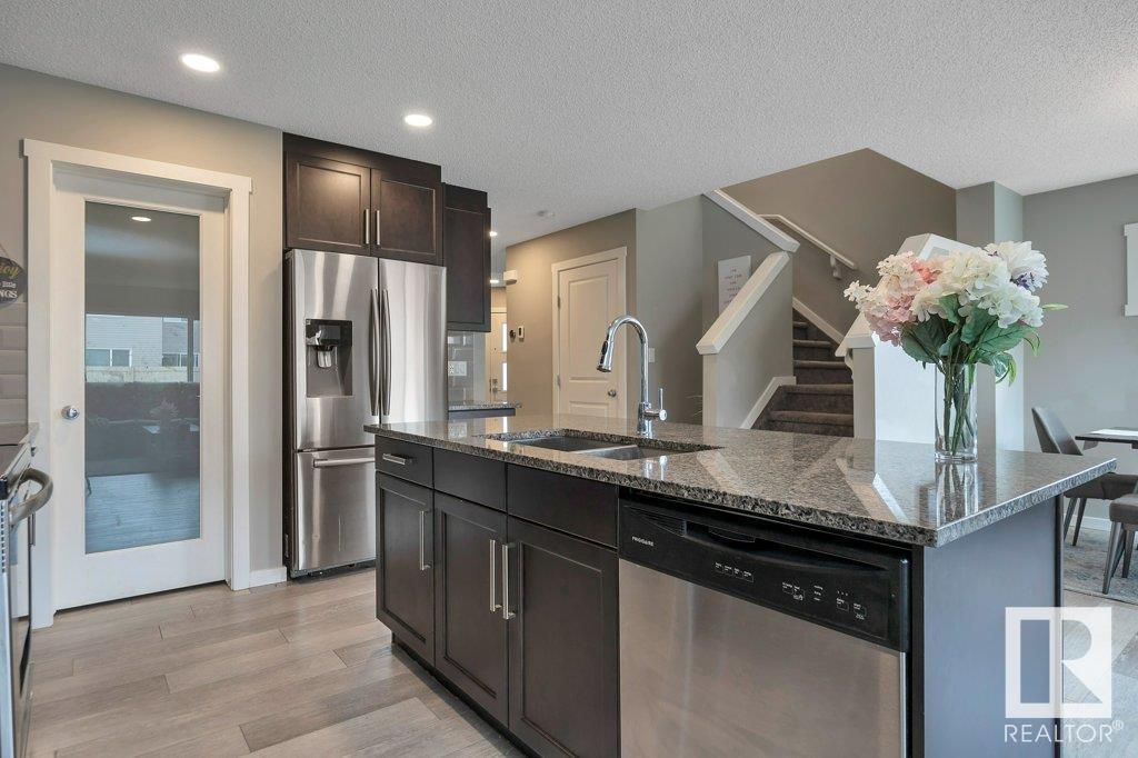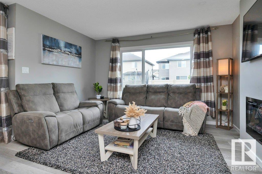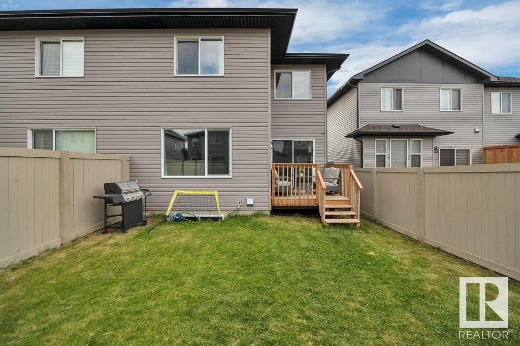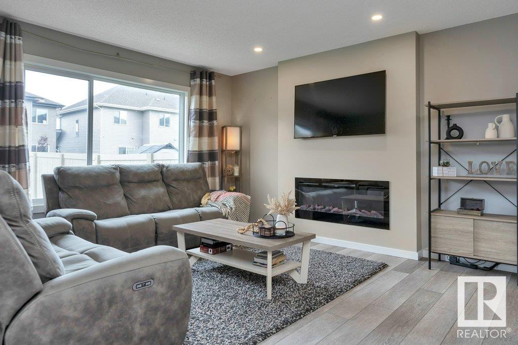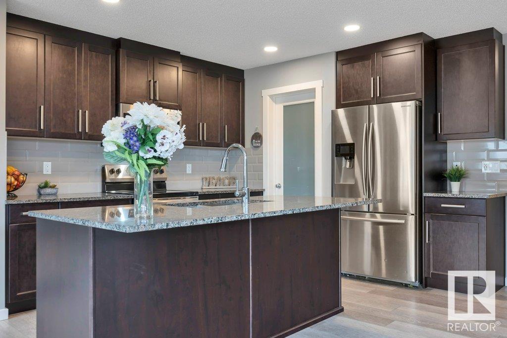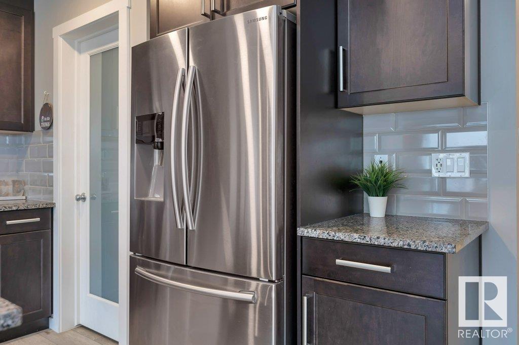 MODERN 1641sqft home with NO CONDO fees!. Situated at the end of a cul-de-sac in popular Maple close to everything! Extra Long driveway is a great feature with backyard. As soon as you enter the home you will notice the SPACIOUS ENTRANCE with OPEN-TO-ABOVE extra high ceiling and mudroom for coats, shoes and more. The Livingrm with FIREPLACE is open to the kitchen with everything you've been looking for like the large ISLAND, WALK -IN PANTRY, an abundance of ESPRESSO CABINETRY. PLus: QUARTZ COUNTER TOPS, VINYL PLANK main floor, OPEN DESIGN with WARM Neutral DECOR, STAINLESS STEEL appliances including a massive FRENCH DOOR FRIDGE! Upstairs in the Primary Suite with HUGE Walk-IN Closet, ENSUITE with 4' SHOWER, UPSTAIRS LAUNDRY for quick & easy access. A total of 3 SPACIOUS bedrooms and 2 1/2 Bathrooms. The OVERSIZED garage is 23.5' ft LONG! You can have a Truck and now have a place to park it. Maple is full of parks, PONDS, & PLAYGROUNDS, walking trails and stores with easy access to the Whitemud and Henday. (id:22211)