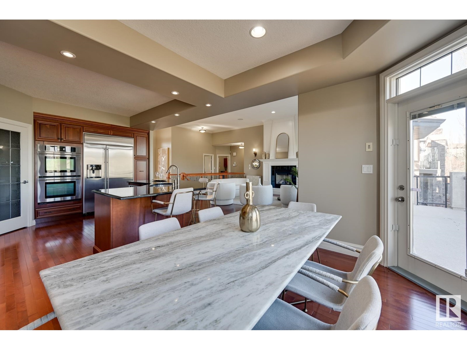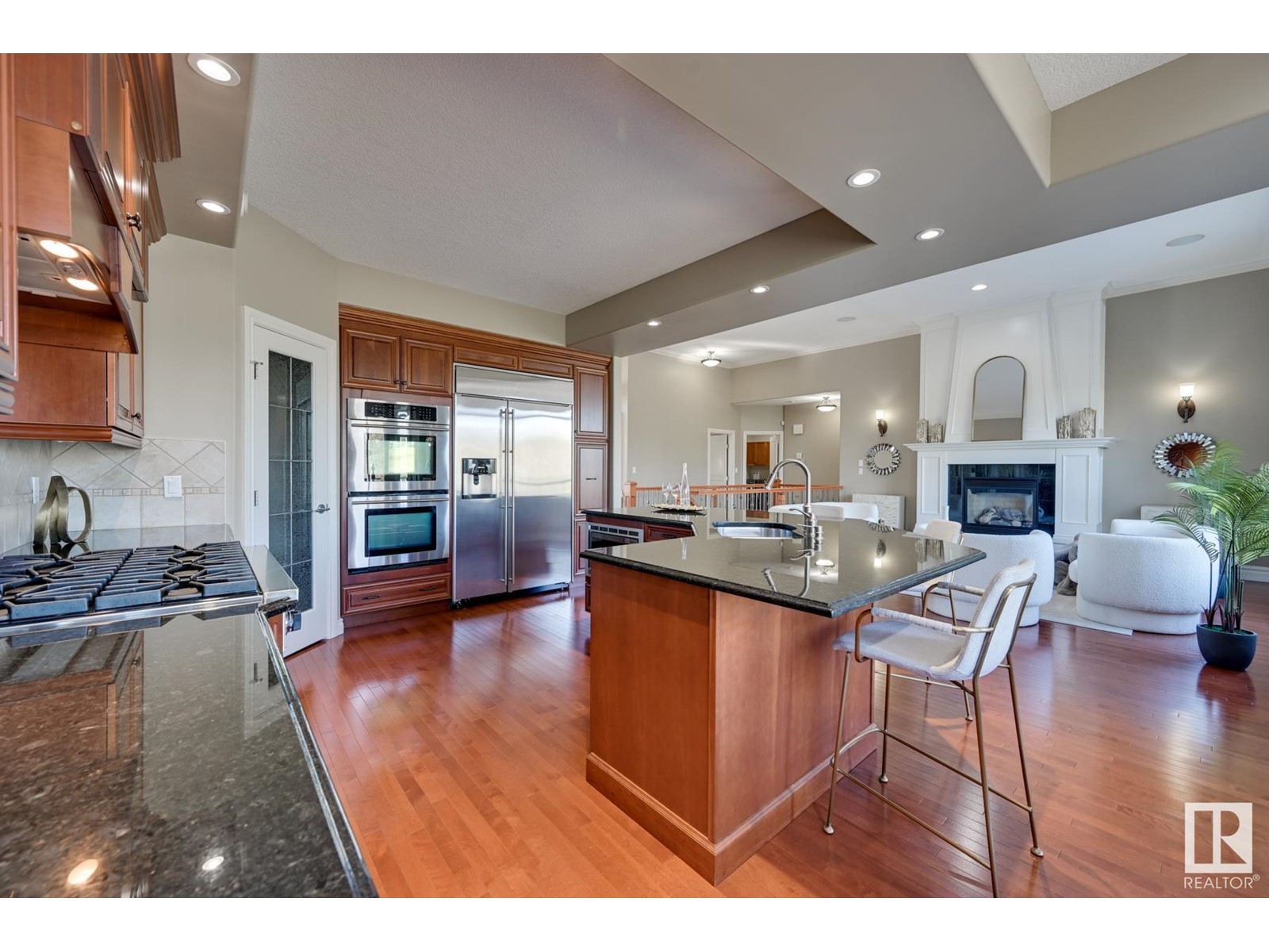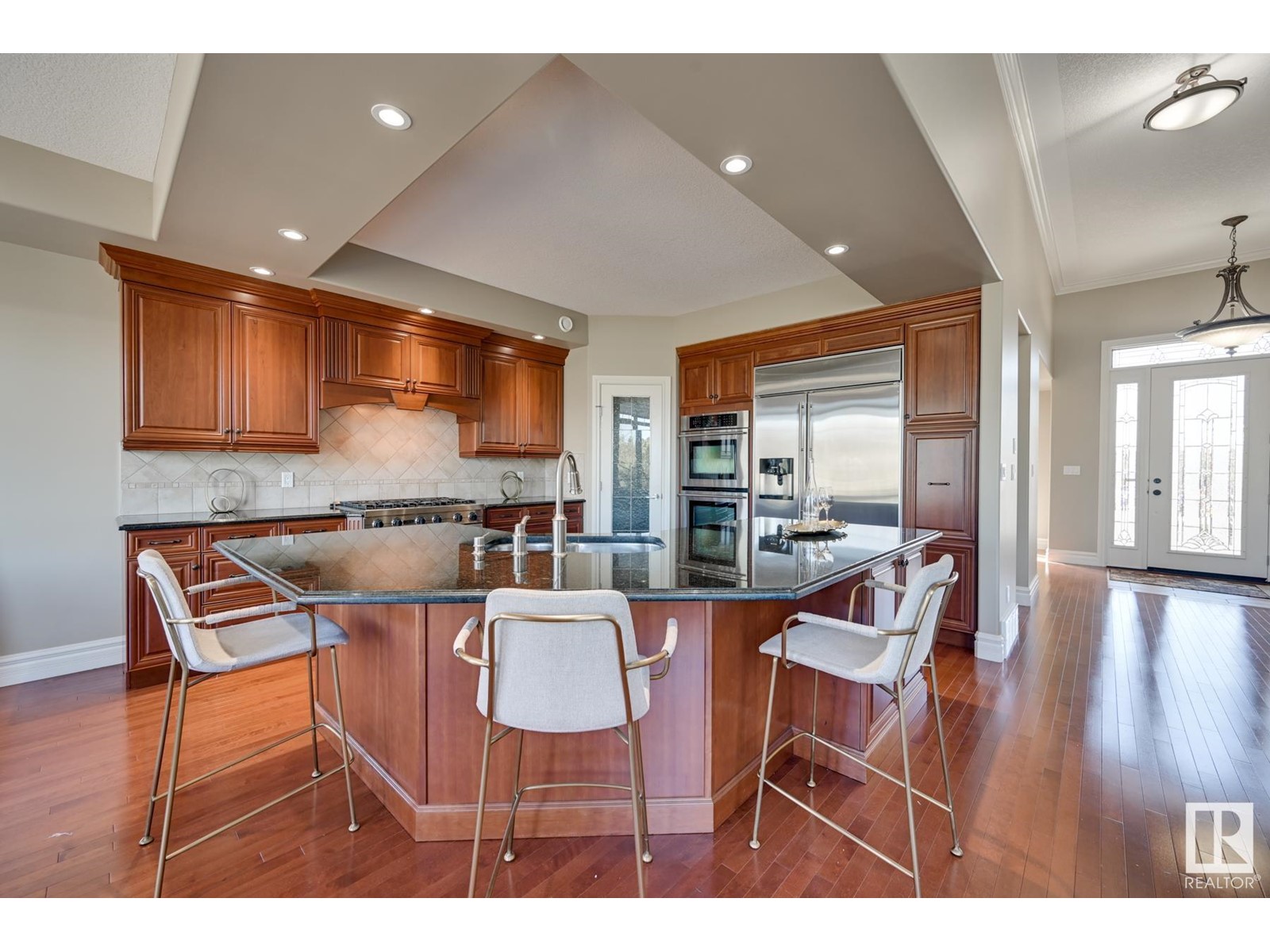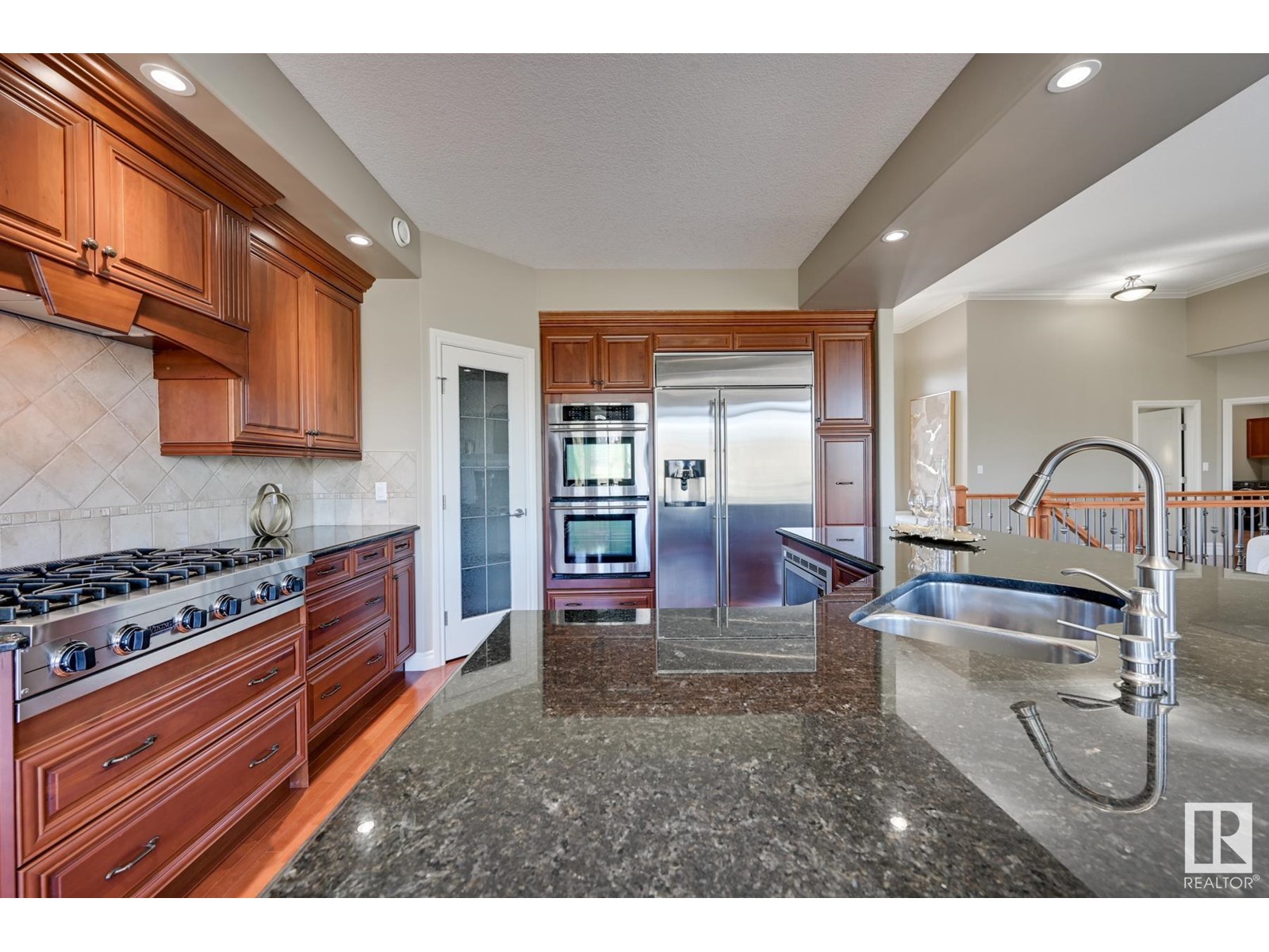 Immaculate Walkout bungalow by Perry Built Homes in Magrath Summit backing onto greenspace/tranquil stream. Steps to ponds & ravine. Fantastic curb appeal w/aggregate driveway & triple garage. 12' ceilings with an open floorplan & naturally lit throughout. Gleaming hardwood welcomes you through a sunny formal dining room, great room with a beautiful fireplace feature wall. Kitchen boasts upgraded appliances, prep island, corner pantry & a dining nook with direct access to a privatebalcony. Main floor den is perfect for a home office or library. Primary bedroom will fit a king sized set & features a 5pc spa ensuite complete with 10mil glass shower, soaker tub & dual faucets. Walk-in closet with custom built-in organizers. Walkout level is perfect for entertaining. Wet bar, patio & dual lounge recreational space will accommodate any seating arrangement. Additional 2 bedrooms & 5pc bathroom for extended guest stays. Generous sized hobby rooms. Immediate possession available. **4 Virtually staged photos** (id:22211)