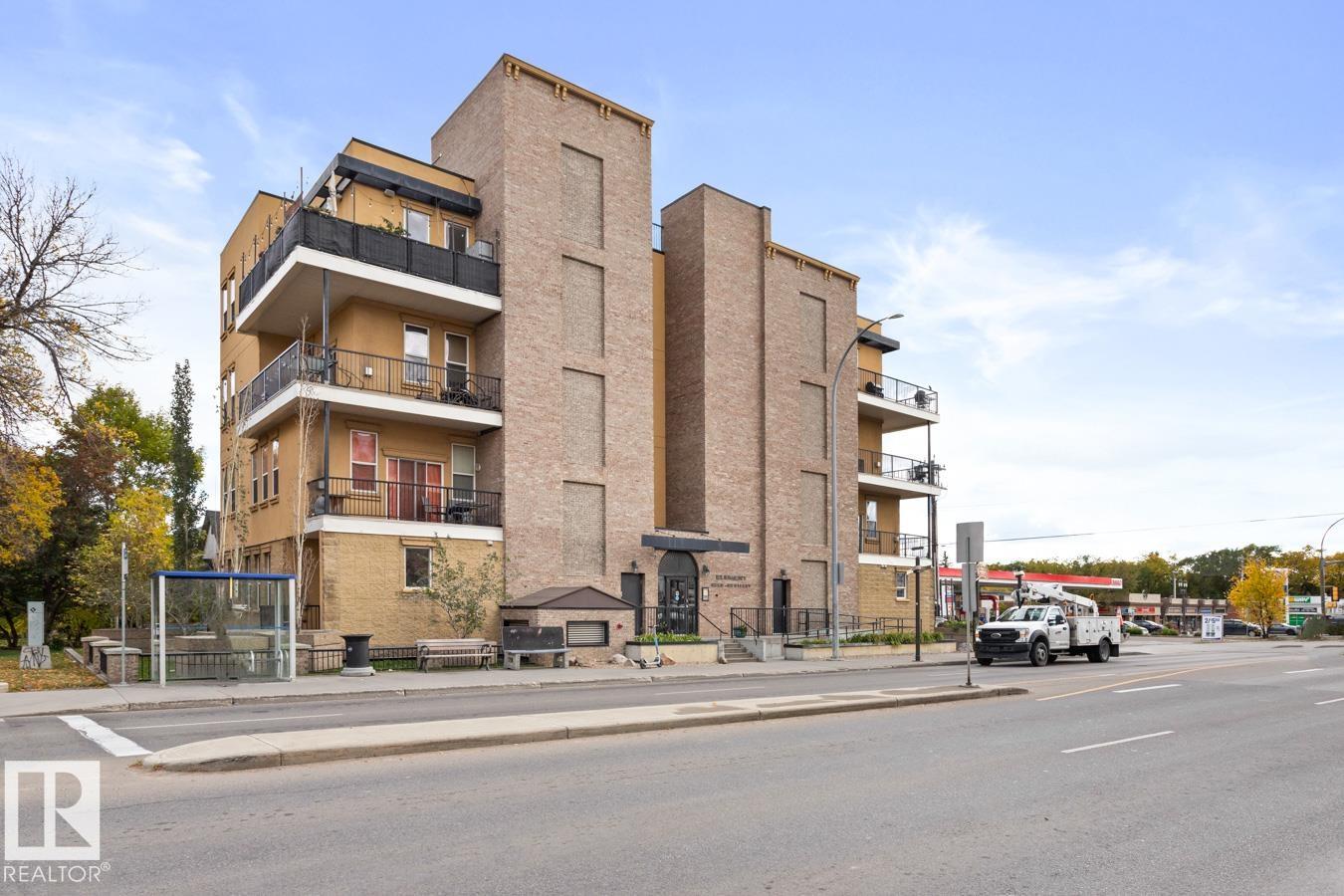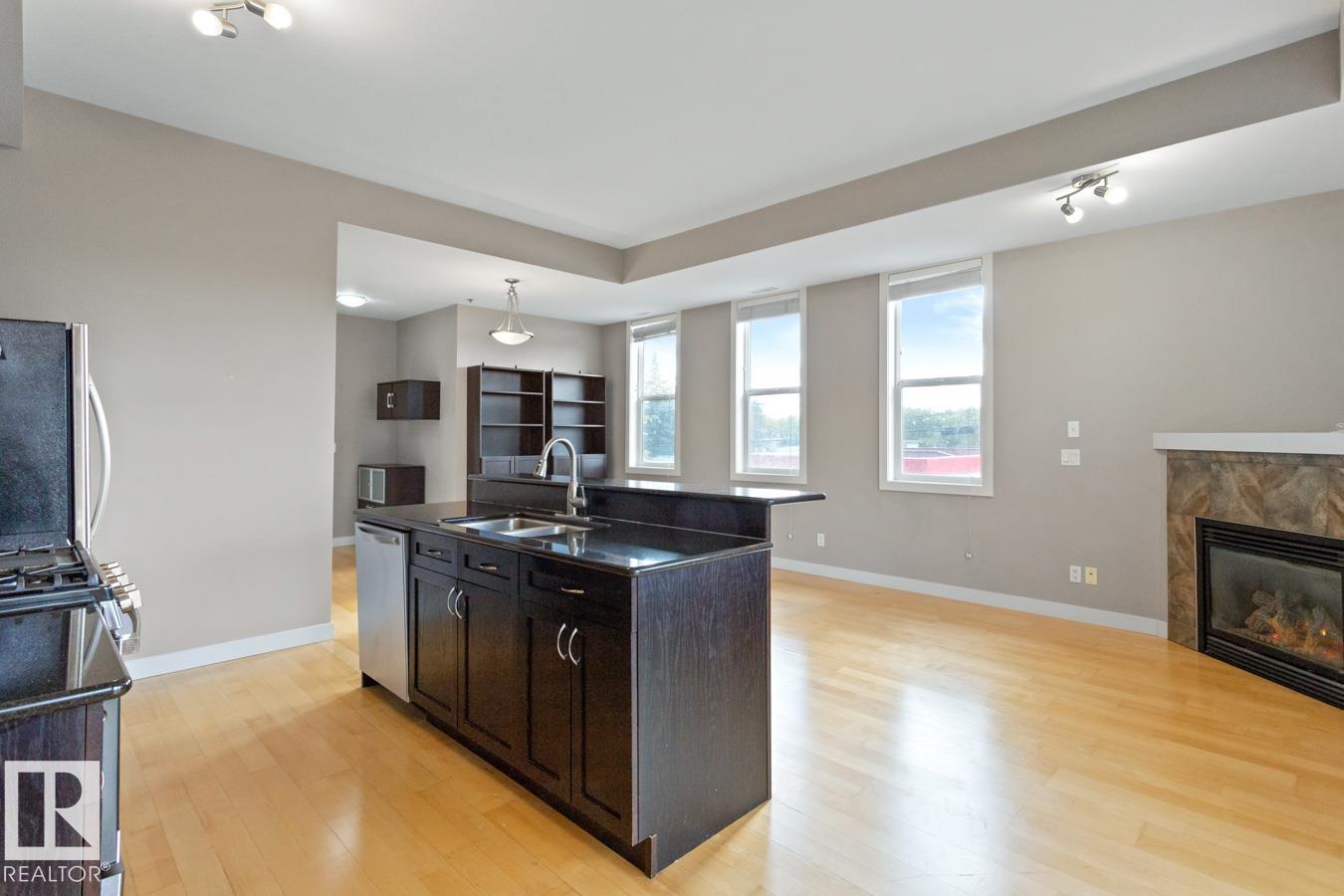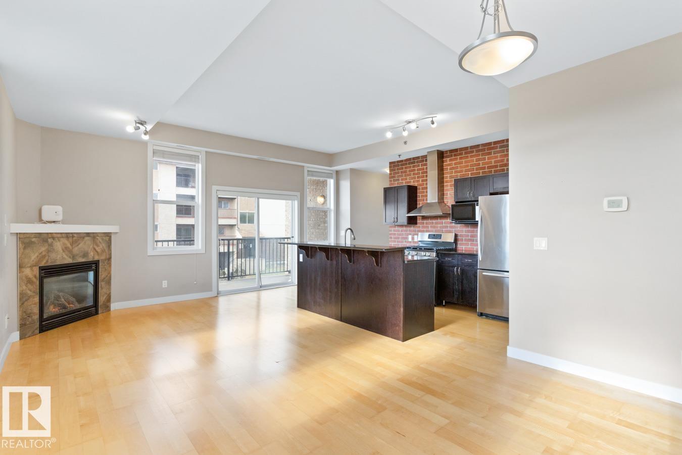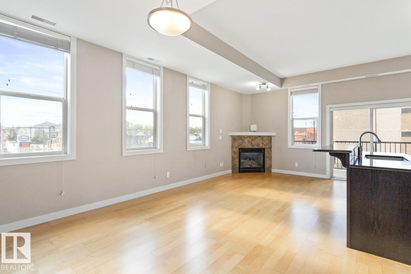 Welcome to this fantastic 1-bedroom condo in Strathcona! This contemporary building has only 14 units, offering a safe and comfortable feel. The suite has a spacious, open layout featuring 10ft ceilings and large windows that let in tons of natural light. The kitchen is bright and stylish, featuring a brick backsplash, stainless steel appliances, a professional-grade gas stove, and granite countertops. Enjoy the cozy gas fireplace in the winter months and the large, sunny west-facing balcony in the summer. The bedroom includes a spacious walk-in closet, while the generous in-suite laundry room offers additional storage space for your convenience. Plus, enjoy the added perks of a separate storage locker and your own titled, heated underground parking spot. Conveniently located just steps from Whyte Avenue, near the River Valley, University of Alberta, public transit, restaurants, shopping, and more!