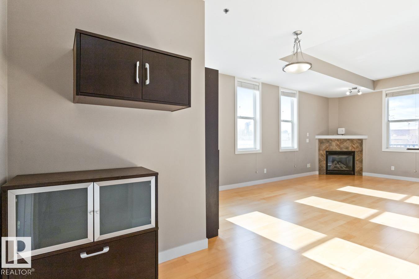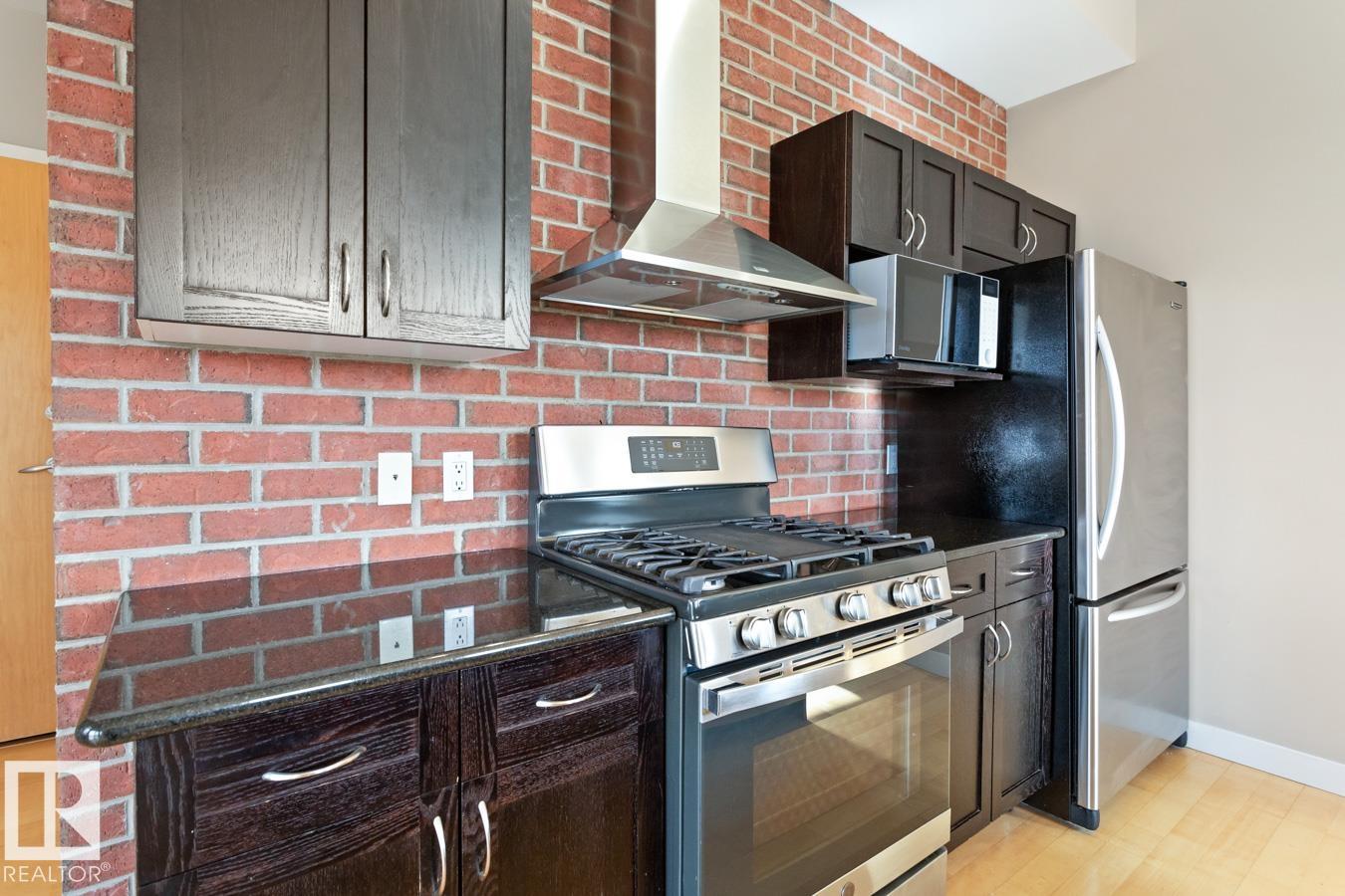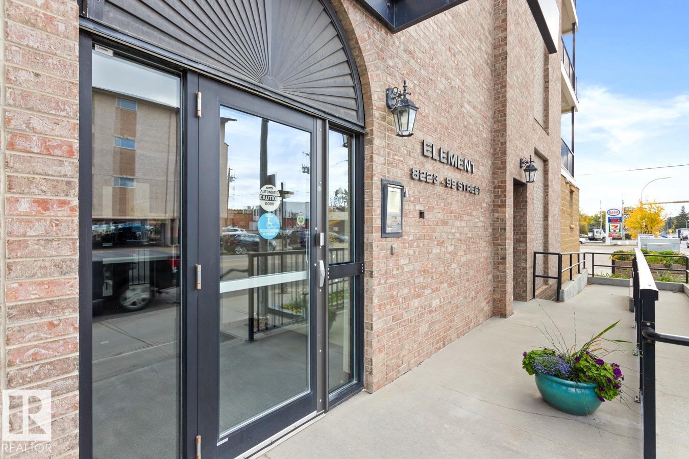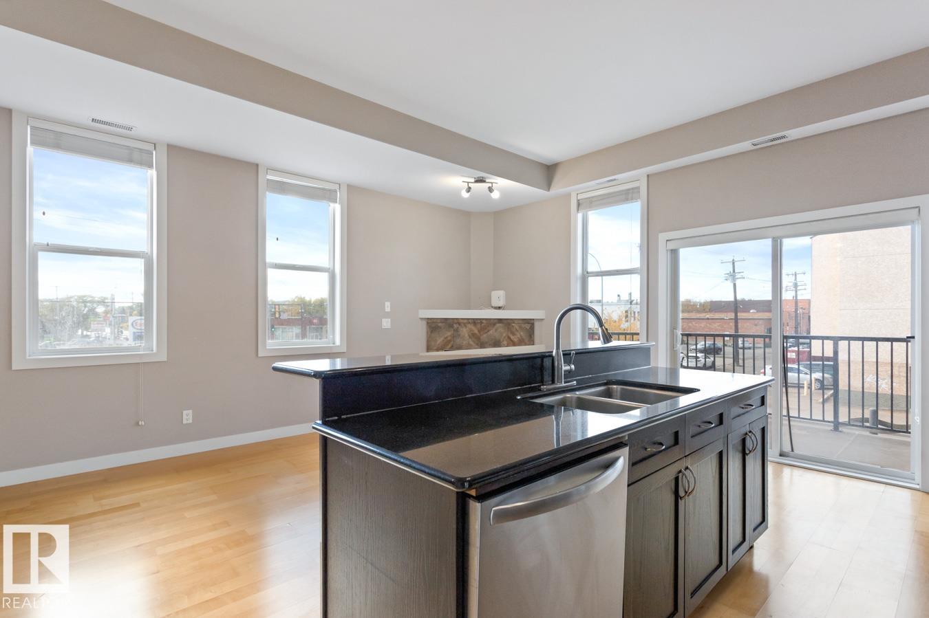 Welcome to this fantastic 1-bedroom condo in Strathcona! This contemporary building has only 14 units, offering a safe and comfortable feel. The suite has a spacious, open layout featuring 10ft ceilings and large windows that let in tons of natural light. The kitchen is bright and stylish, featuring a brick backsplash, stainless steel appliances, a professional-grade gas stove, and granite countertops. Enjoy the cozy gas fireplace in the winter months and the large, sunny west-facing balcony in the summer. The bedroom includes a spacious walk-in closet, while the generous in-suite laundry room offers additional storage space for your convenience. Plus, enjoy the added perks of a separate storage locker and your own titled, heated underground parking spot. Conveniently located just steps from Whyte Avenue, near the River Valley, University of Alberta, public transit, restaurants, shopping, and more!