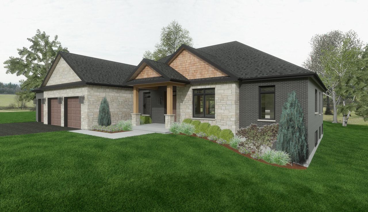 Spectacular New Custom Home by McManes Construction. Stone & Brick 2676 Sq Ft Bungalow W 7 Year Tarion Warranty. Nestled on a 1.40 Acre Estate Lot W Natural Gas, Drilled Well & Engineered Septic. Spacious Bedrooms W full ensuite baths and Large Closets. Massive Royal Primary Bedroom W Romanian Seamless Tile 5 Pc Bathroom, Heated Floor, Glass Enclosed Shower & Door, Freestanding Tub & Double Sink & W/I Closet. Vaulted Great Room Featuring Floor To Ceiling Tiled Intimate Gas Fireplace. California Style Sliding Doors Leading To Covered Balcony. Open Concept Kitchen, Quartz Counters & Centre Island, Breakfast Nook & Side Wet Bar. Stylish 6" Inch Hardwood Flooring Throughout Main Level. Separate Formal Dining Room.Full Unfinished 2600 + Sq Ft Basement W 9 Foot High Insulated Foundation Walls, R/I Drains/Sewage Injection For Future Bathroom/Bar/ Kitchen W Separate Stair Case Entrance From Garage.