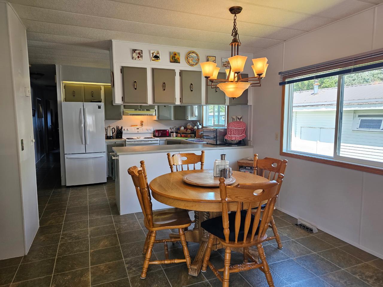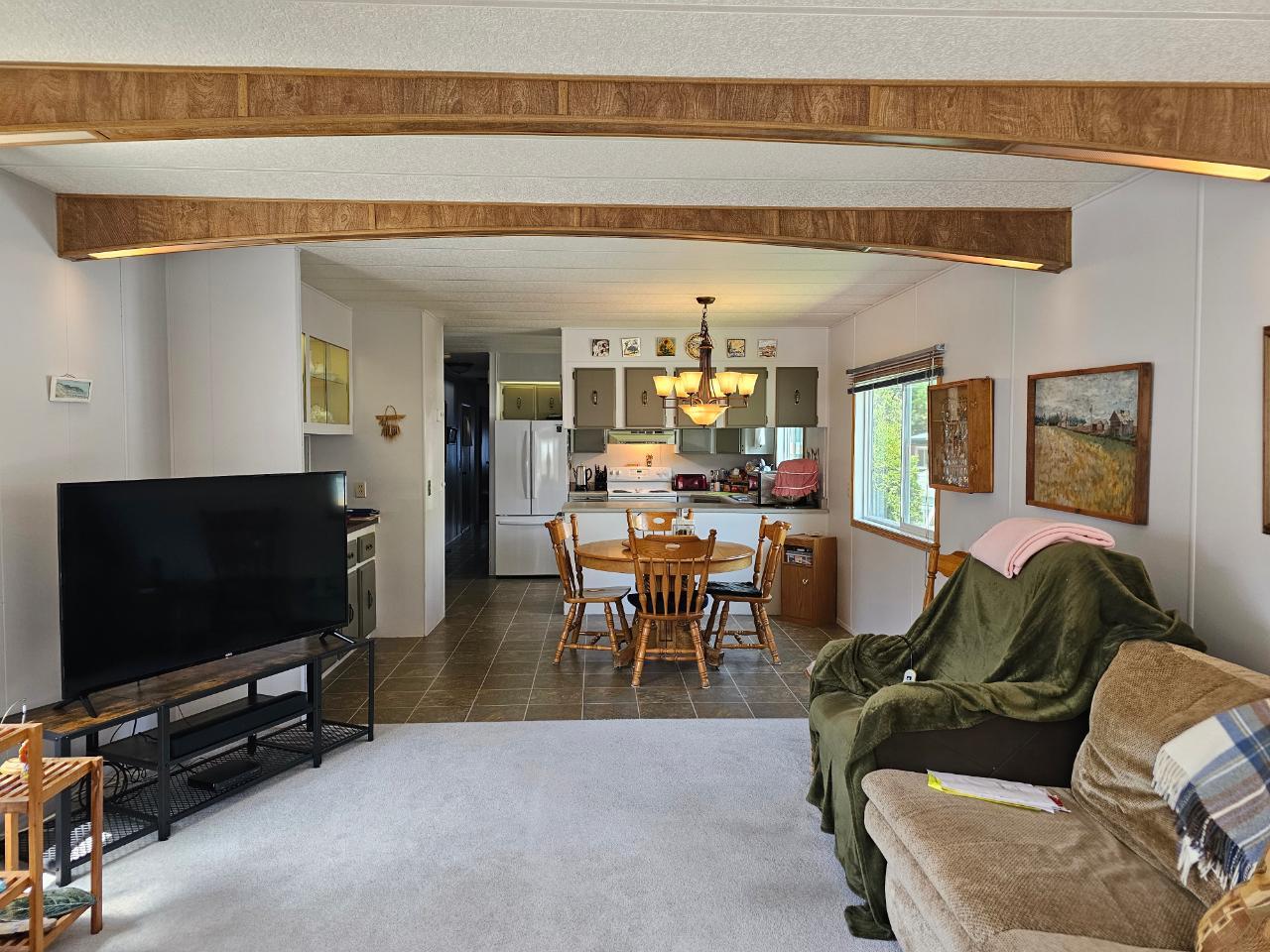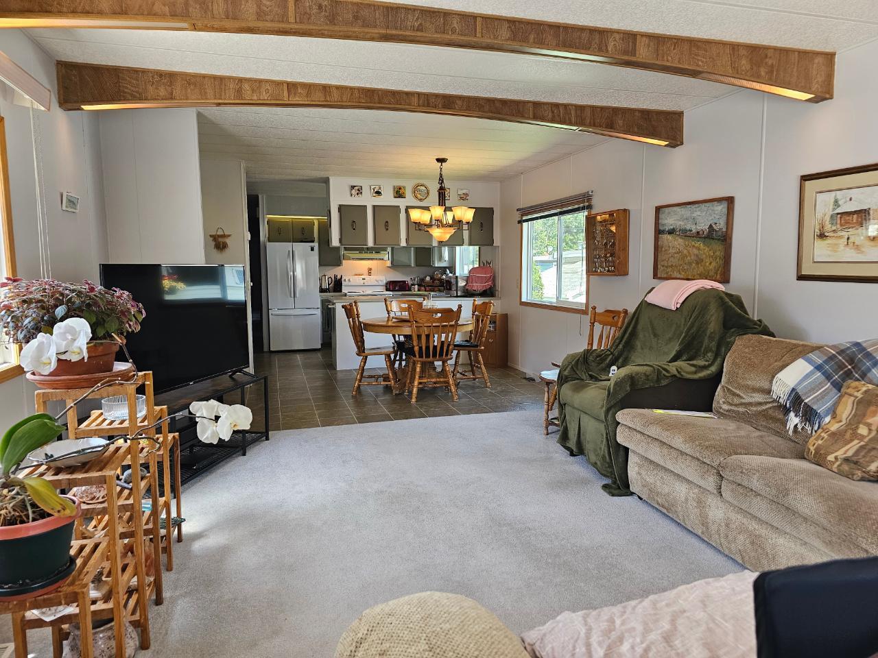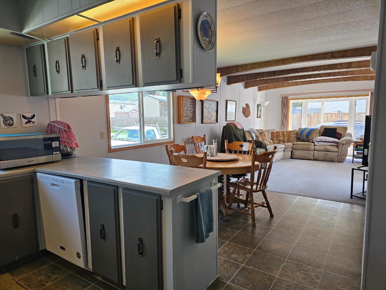 Spacious and affordable. This 1240 sq. ft home sits at the quiet end of the centrally located Fernie Mobile Home Park and has 3 bedrooms with updated bathroom. The very spacious living area has loads of natural light and is open concept to the dining area and kitchen. Built in sideboard area offers lots of storage and the beams in the living room have super cool built in vintage lighting! Primary bedroom at the back is the full width of the home, second bedroom in the addition is huge. Third bedroom is good for kids or would make a perfect office. Lots of paved parking leads to large entry way, enjoy the covered porch out back in the heat of the summer. Updates include new hot water tank in 2021,50 yr roof installed in 2010, furnaced replaced in 2012, and newer fridge and dishwasher. If you are looking for an affordable way to get into the Fernie market and don't want to pay someone else's mortgage then come check out this great home! (id:22211)