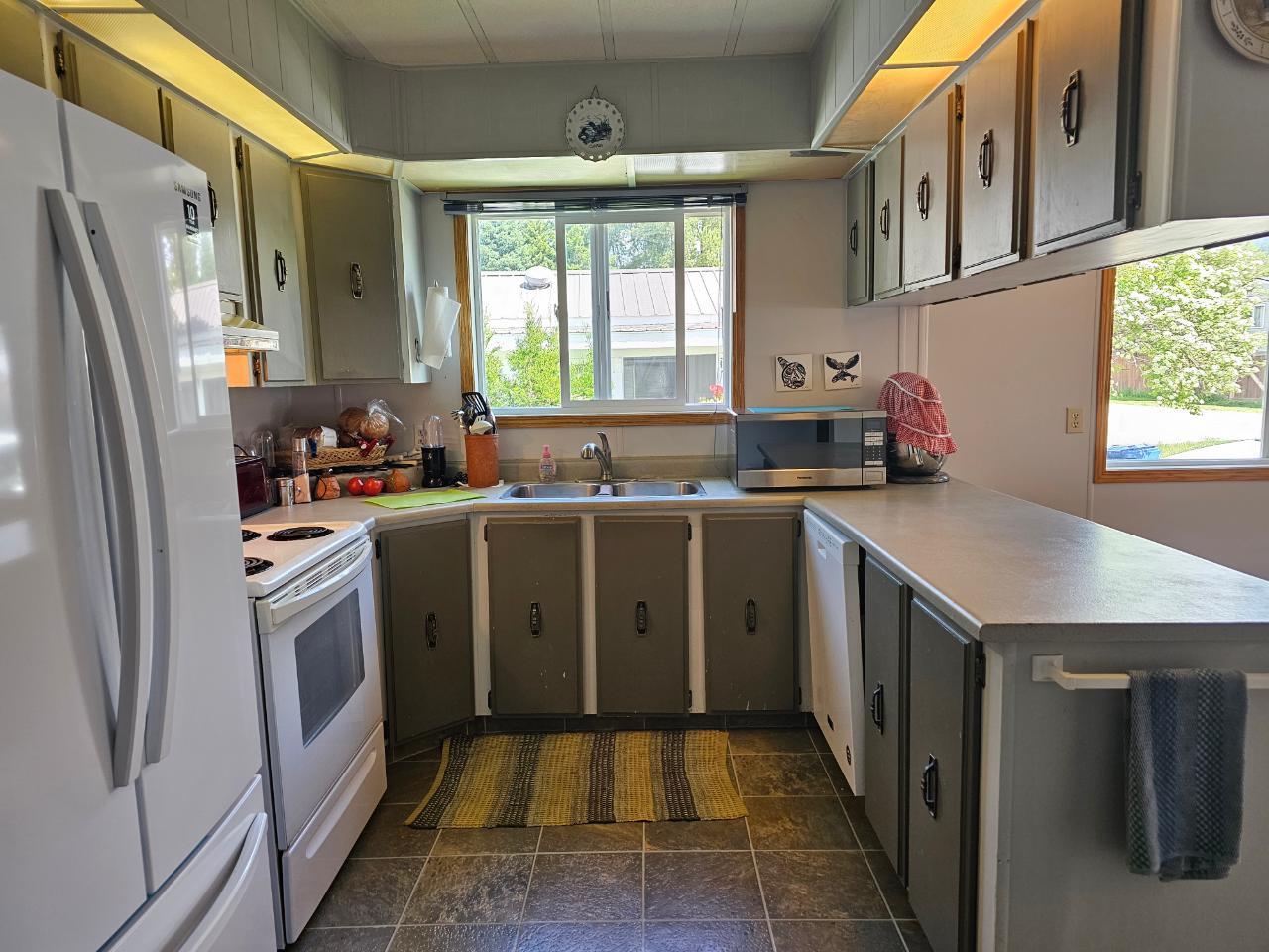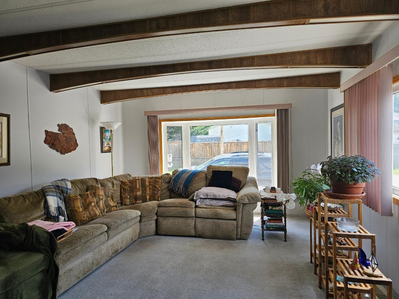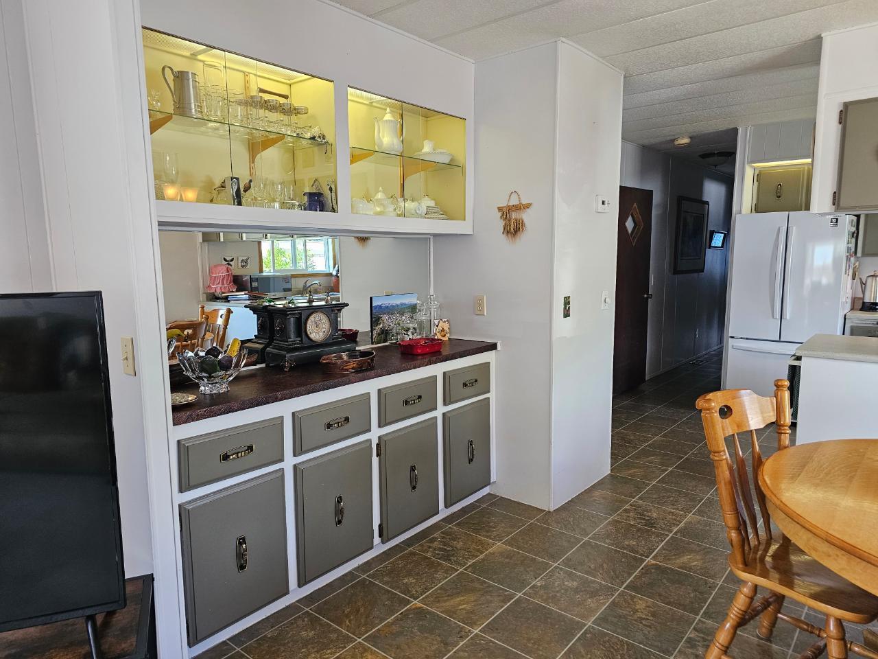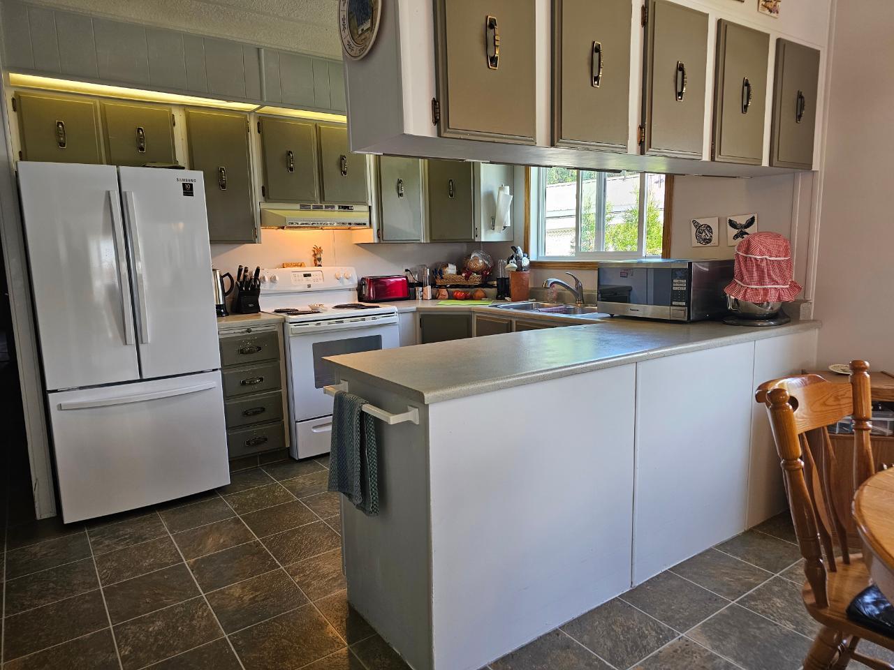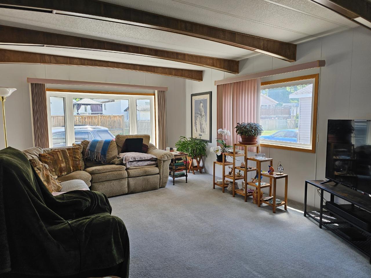 Spacious and affordable. This 1240 sq. ft home sits at the quiet end of the centrally located Fernie Mobile Home Park and has 3 bedrooms with updated bathroom. The very spacious living area has loads of natural light and is open concept to the dining area and kitchen. Built in sideboard area offers lots of storage and the beams in the living room have super cool built in vintage lighting! Primary bedroom at the back is the full width of the home, second bedroom in the addition is huge. Third bedroom is good for kids or would make a perfect office. Lots of paved parking leads to large entry way, enjoy the covered porch out back in the heat of the summer. Updates include new hot water tank in 2021,50 yr roof installed in 2010, furnaced replaced in 2012, and newer fridge and dishwasher. If you are looking for an affordable way to get into the Fernie market and don't want to pay someone else's mortgage then come check out this great home! (id:22211)