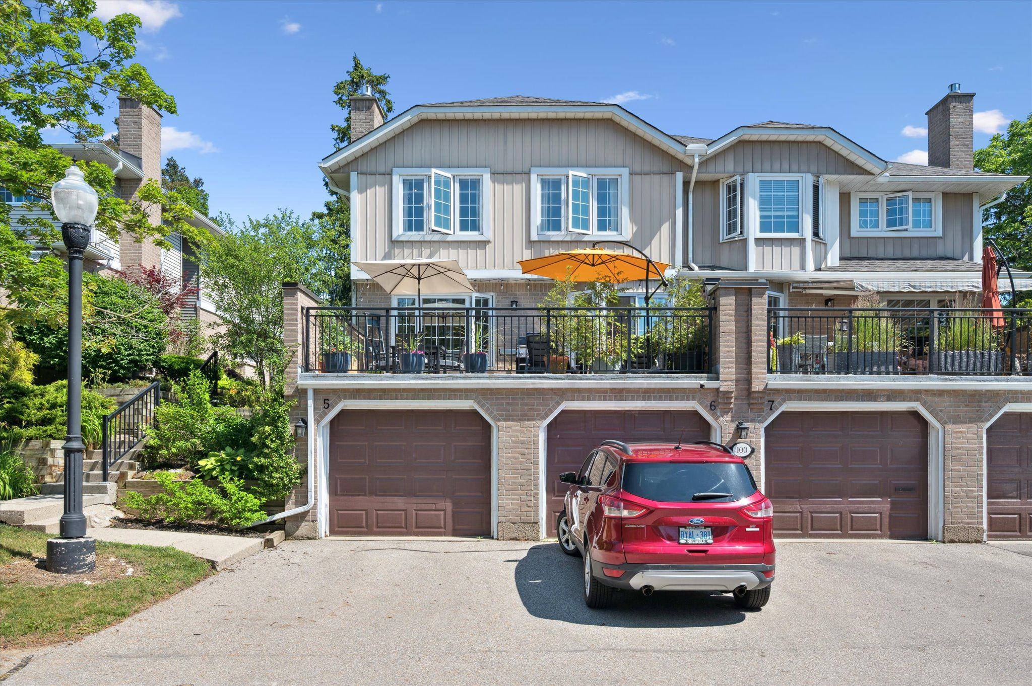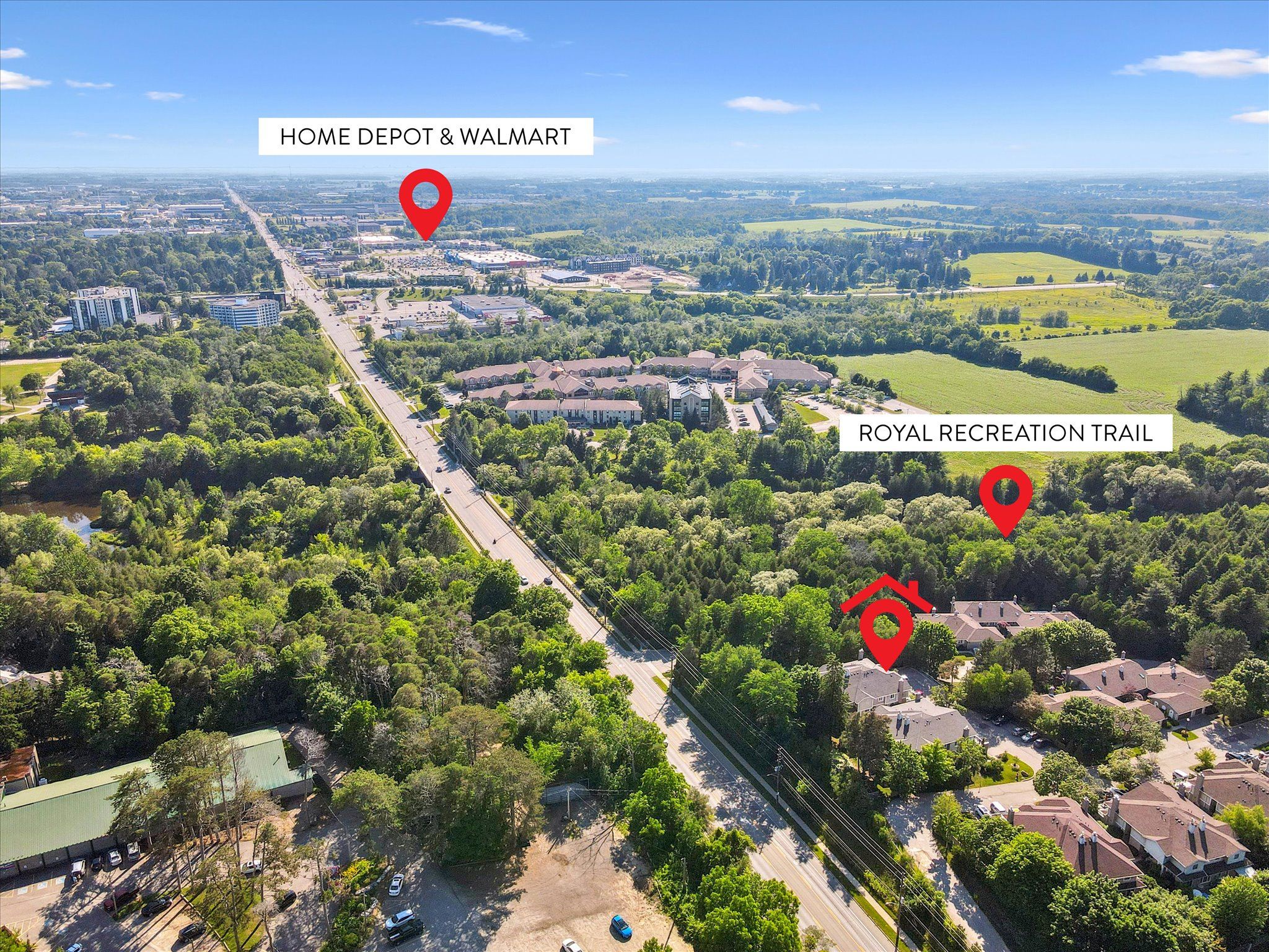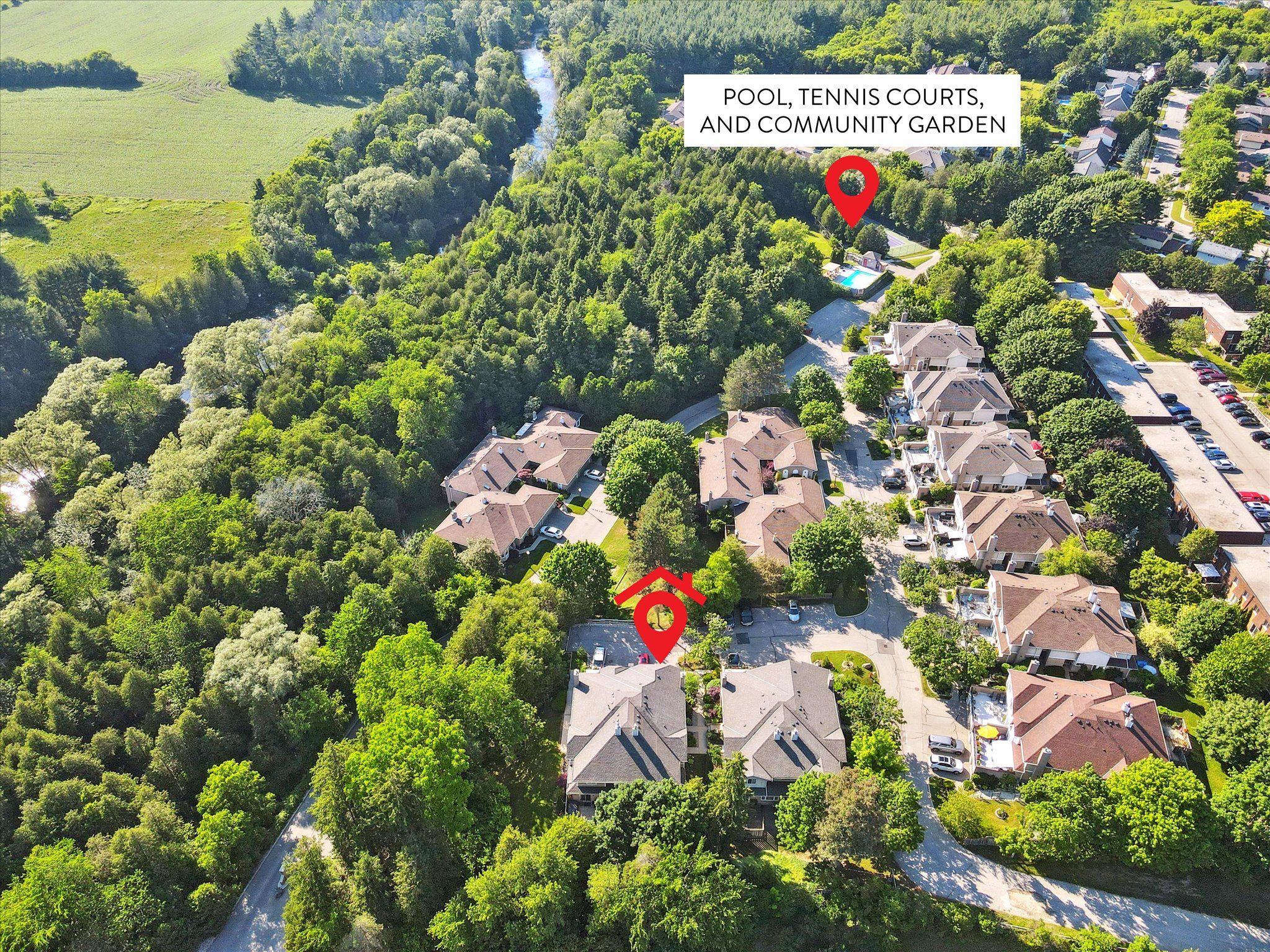 This one is special, tucked away in a serene setting by the river with nature at its doorstep in the sought-after River Ridge community. Welcome to this exceptional two bedroom, four bathroom townhouse nestled in Guelphs desirable north end- surrounded by mature trees and steps to Riverside Park, the Royal Recreation Trail, and Guelph Lake. This rare offering combines natural beauty with high-end living and an active, low-maintenance lifestyle. The sun drenched main floor boasts an excellent layout, filled with upscale finishes throughout. The bright living room comes complete with a beautifully redone gas fireplace and leads to a gorgeous newly renovated kitchen featuring maple wood cabinetry, quartz counters, heated floors, high-end appliances, and a seamless walkout to a massive west facing terrace- perfect for entertaining or enjoying breathtaking sunset views. Upstairs, the primary suite is a true retreat (created by combining 2 bedrooms into one which could be converted back), complete with a walk-in closet, cozy gas fireplace seating area, and a spa-like ensuite featuring a steam shower, granite counters and heated floors. The versatile lower level offers garage access, tons of storage, laundry, bathroom and a bonus space ideal for a home office, extra bedroom, or recreation room. This sought-after community is located around the corner from shopping, groceries, and restaurants and includes top notch amenities: a beautifully maintained outdoor pool, community garden, and newly resurfaced tennis/pickleball court. The condo fees cover snow removal, landscaping and all external maintenance including your roof, windows, doors and garage doors, giving you peace of mind. Units in this community rarely become available- don't miss your chance to live in one of Guelphs most peaceful and well-connected communities!