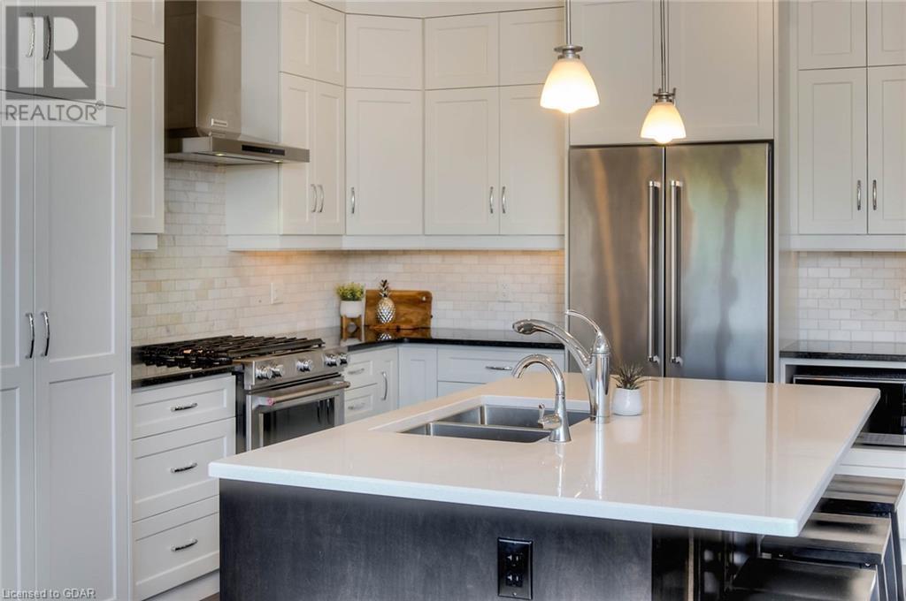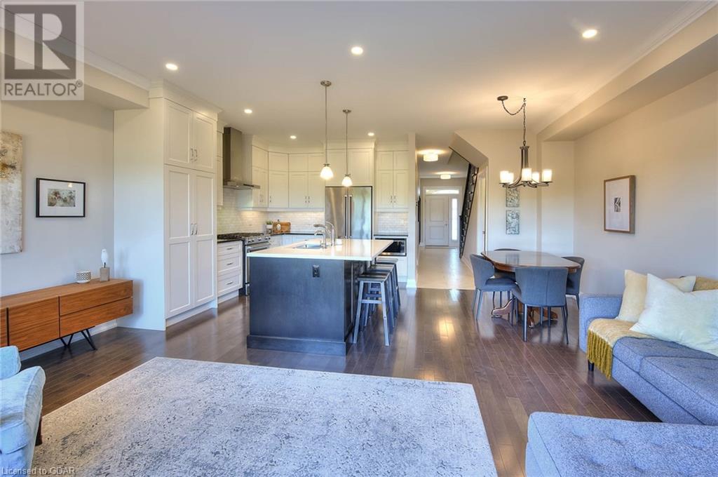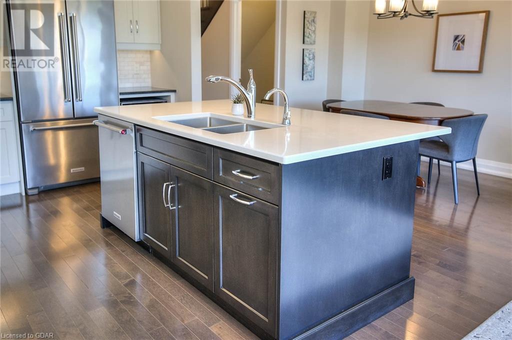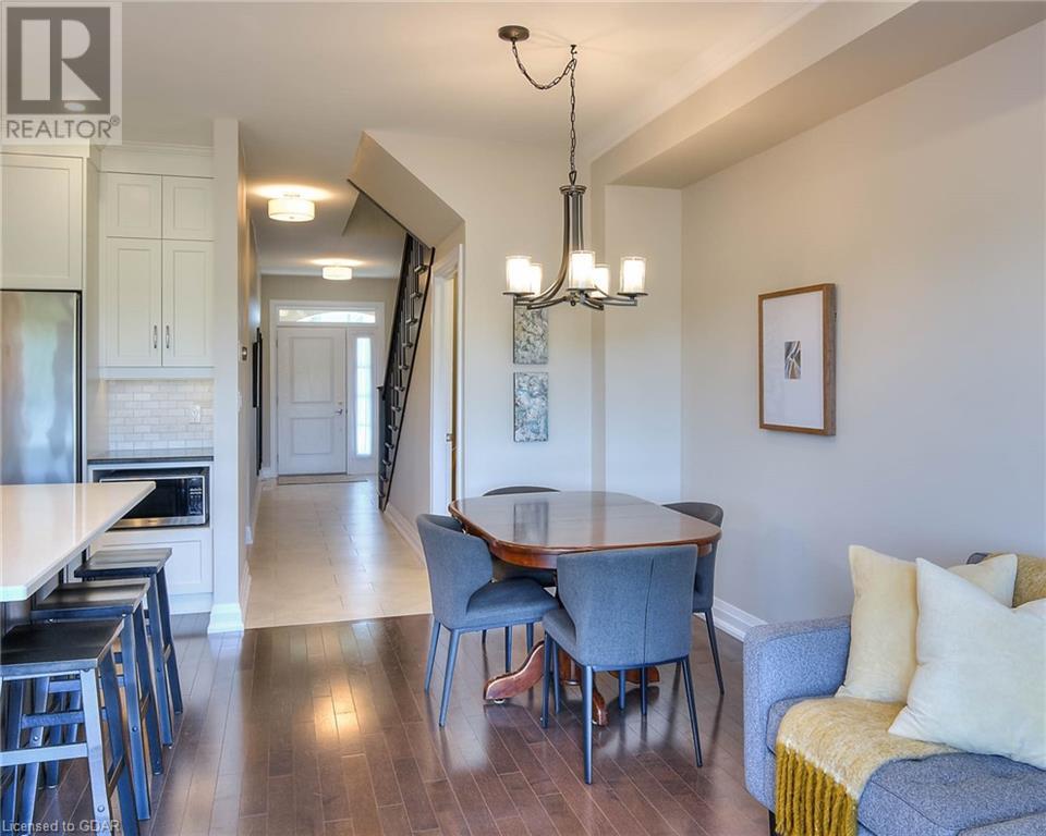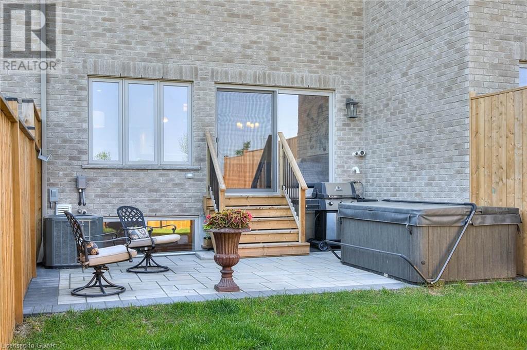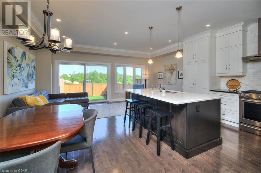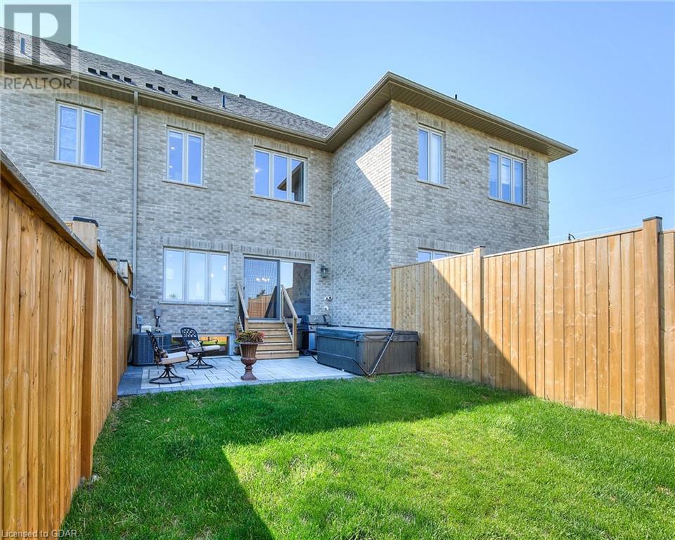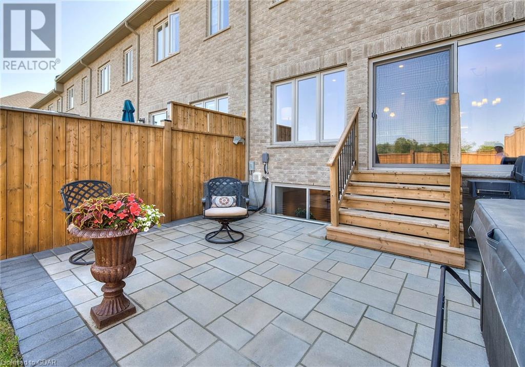 Welcome to one of Guelph's finest freehold townhomes near Guelph Lake! This three-bedroom, two-storey townhome embodies luxury and elegance. The main floor of this home showcases a gourmet kitchen that will inspire your inner chef. Extensive upgrades adorn the kitchen, including luxury stainless steel appliances, and a gas stove/range. The centerpiece of the kitchen is the elegant stone countertop on the centre island with double sink, providing ample space for meal preparation and social gatherings. A quick view of the walk-out to the backyard you will note the fully fenced-in area, which is so very hard to find in a townhouse but allows for your furry companion to have access to much needed outdoor space. The backyard is also finished with a quality hard scaped patio defining your outdoor dining area. Ascending to the second floor, you'll discover the expansive master bedroom, a true sanctuary of comfort, overlooking the tree line of Guelph Lake Conservation Area. This retreat features a spacious walk-in closet, ensuring abundant storage for your wardrobe and personal belongings. The master ensuite is a true masterpiece, with double-sinks, and tiled shower and an upgraded sliding glass door, adding a touch of sophistication to your daily routine. Bathed in natural light streaming through an oversized glass window, the finished basement is perfect for hosting family gatherings, creating a home theater, or designing a personal fitness area. Beyond the quality interiors, the exterior of this property is equally impressive. The stone facade on the front exterior exudes a timeless elegance, enhancing the curb appeal of this townhome. Completing the picture is the contemporary garage door, adding a touch of modernity to the overall aesthetic. Situated in Guelph's north end, you'll immerse yourself in the natural beauty of the surroundings, with superior access to hiking trails, fishing, boating, and managed mountain bike trails at Guelph Lake Conservation Area. (id:22211)