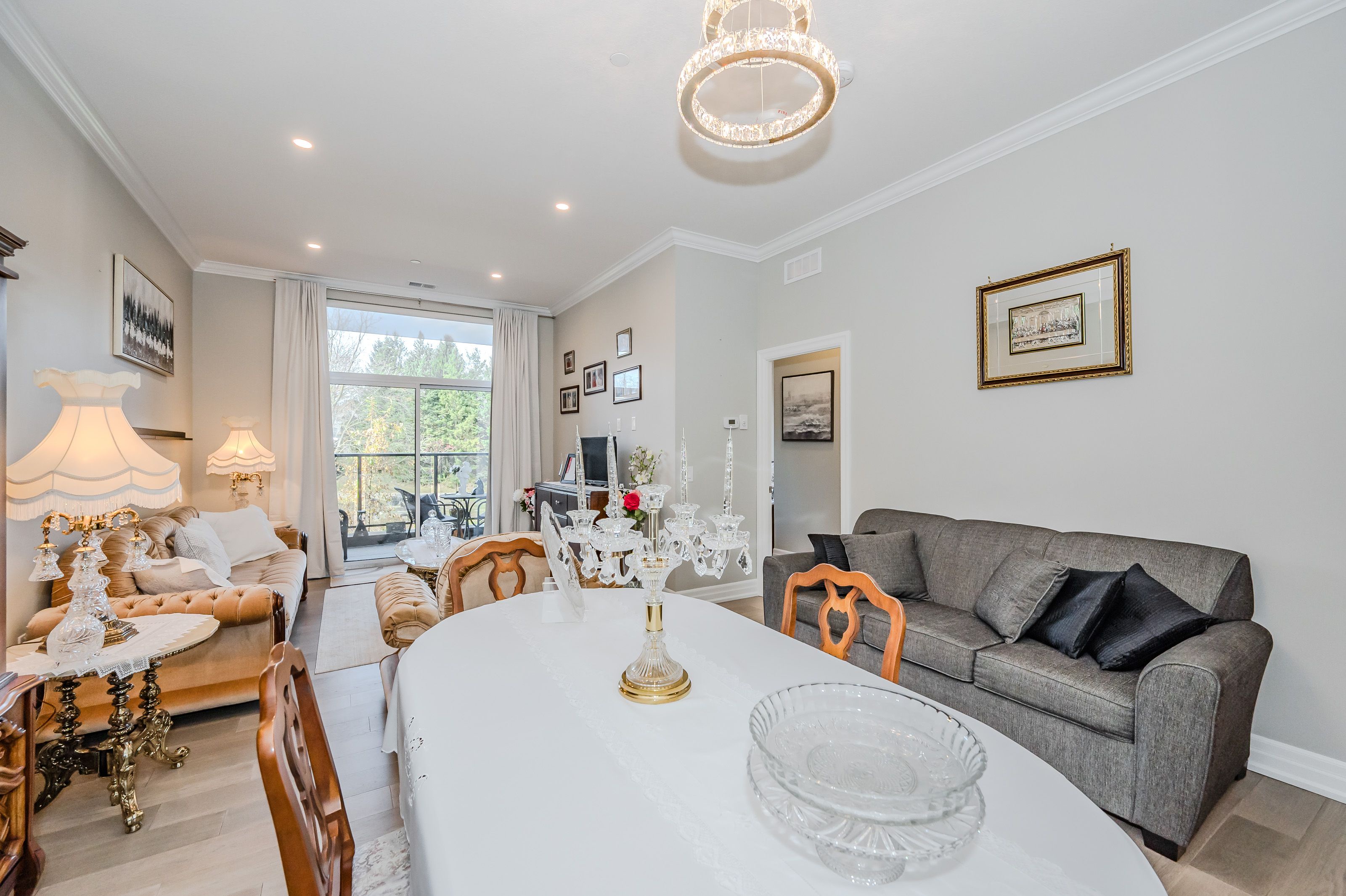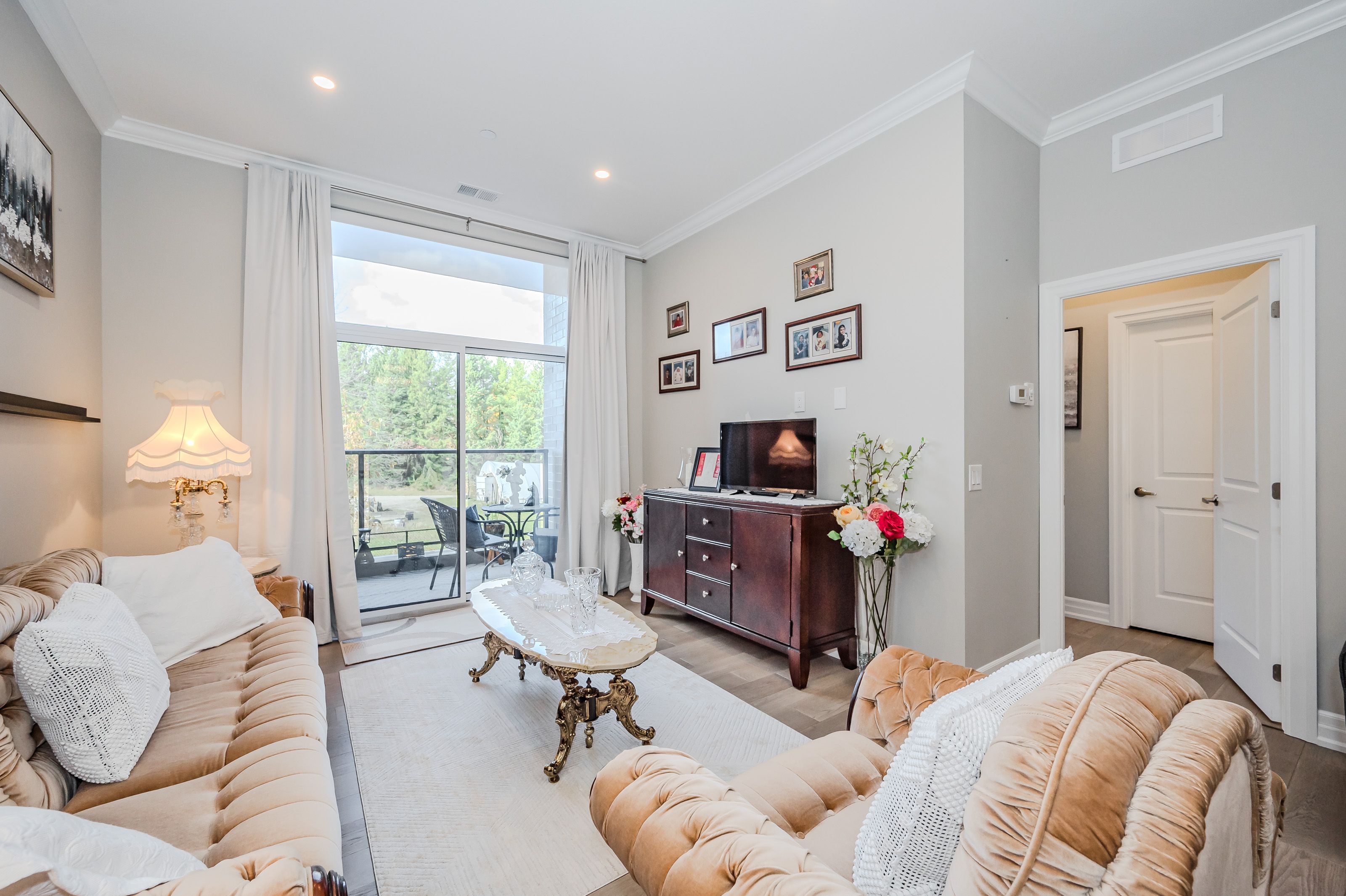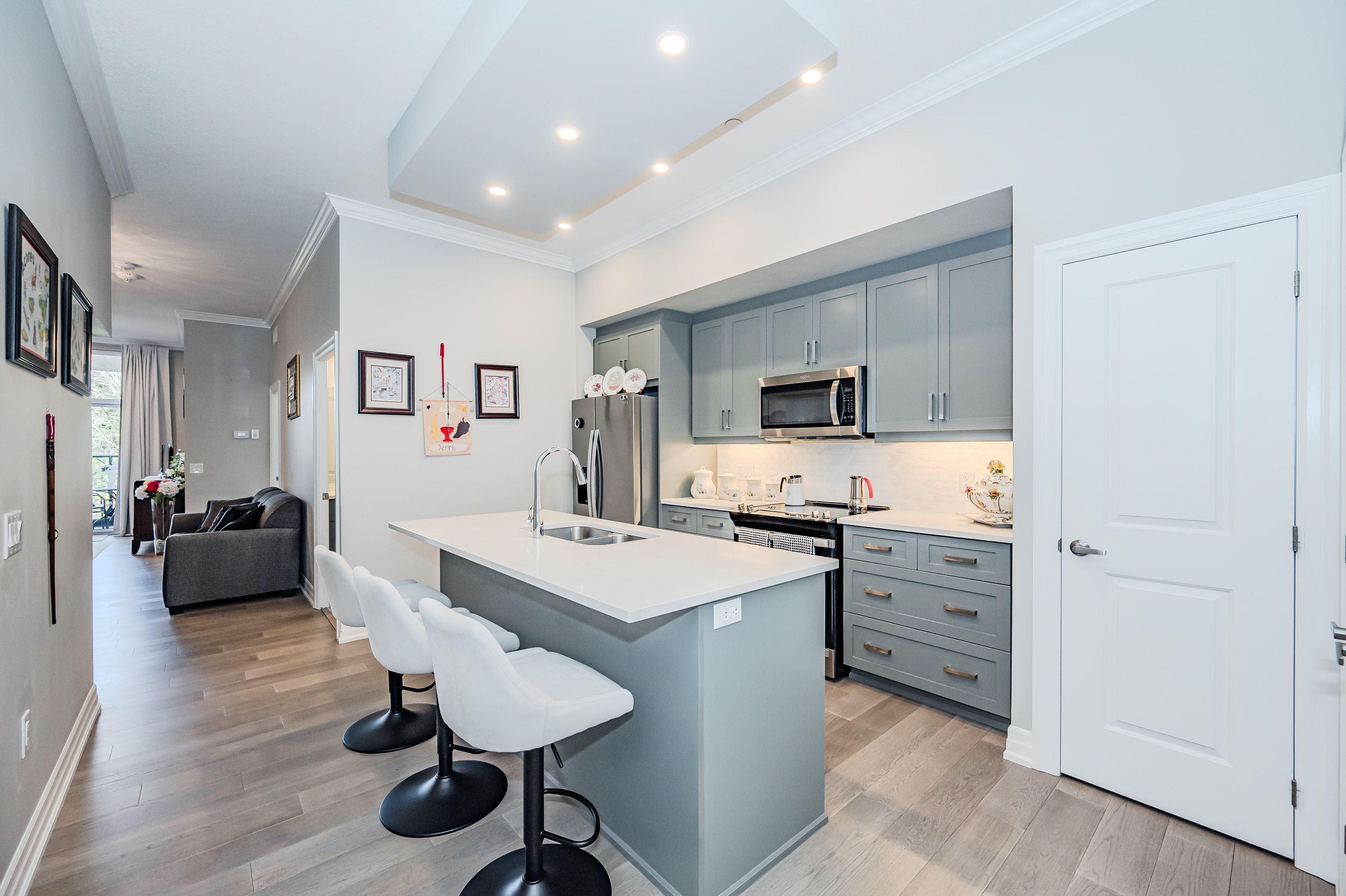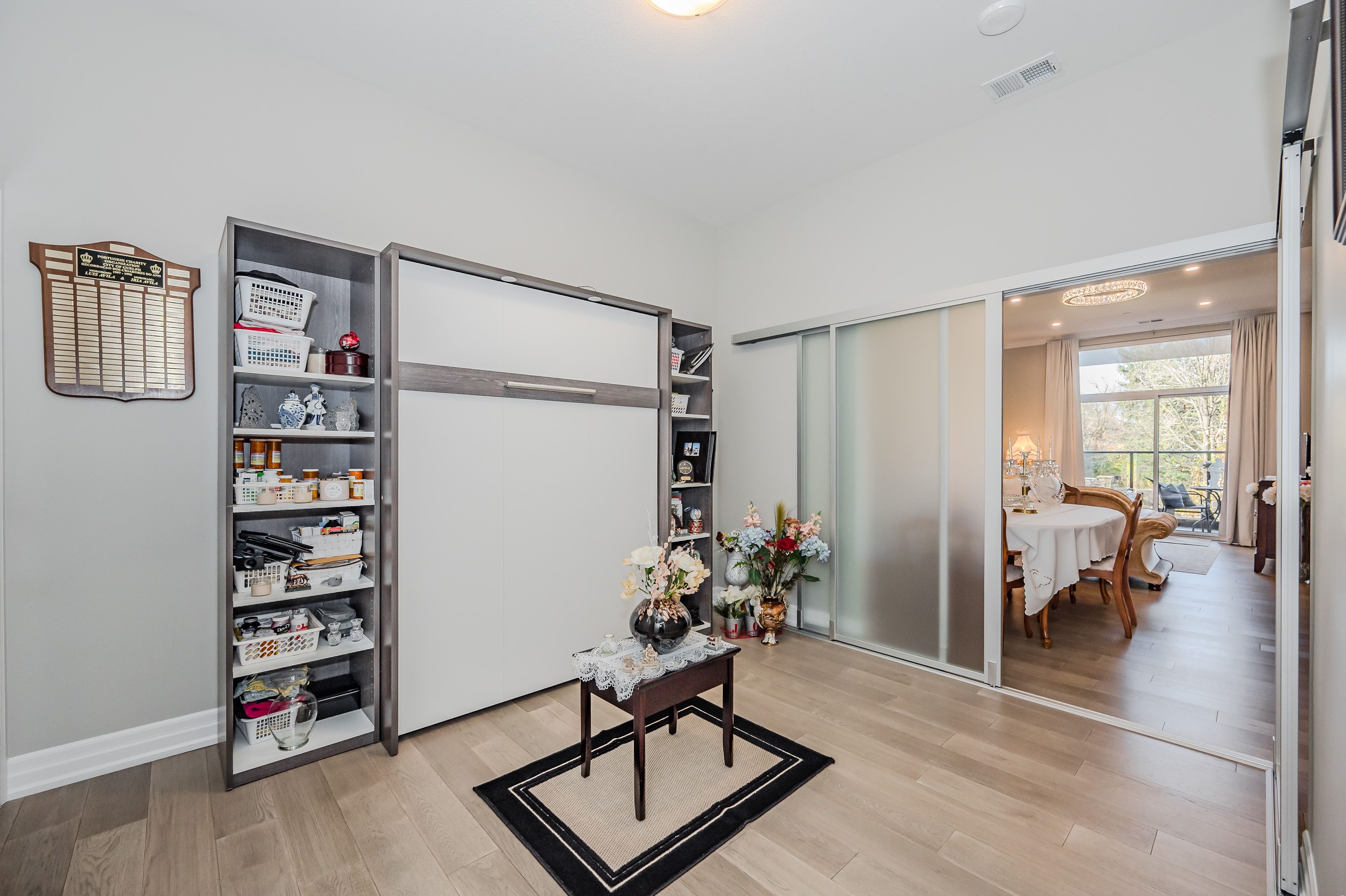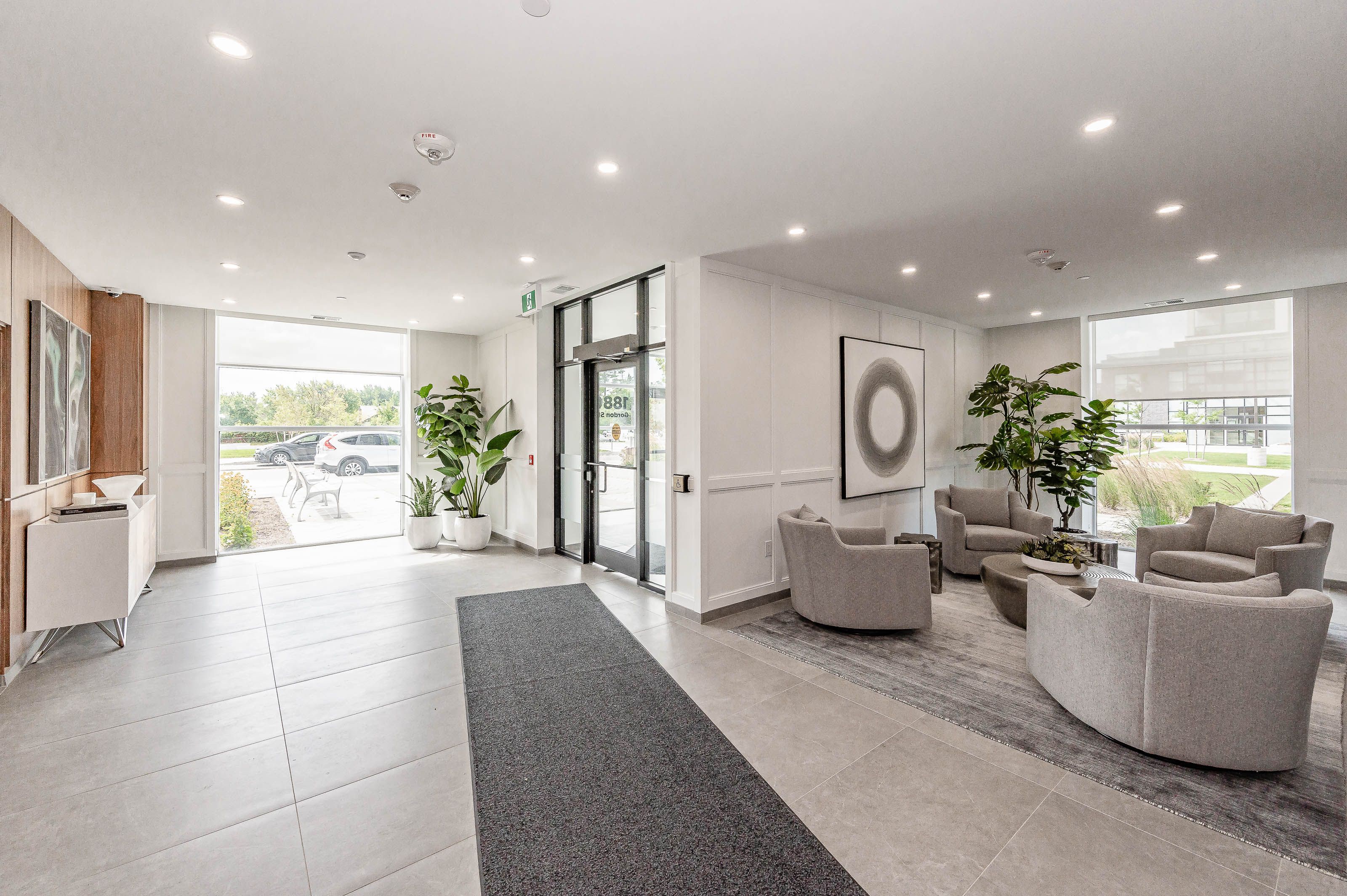 Make this gorgeous ground-floor condo located in the prestigious south end of Guelph your home. Professionally designed 2-bedroom, 2-bathroom suite with luxurious upgrades and TWO underground parking spaces. The 10' ceilings bring in more natural light and make the open-concept floor plan feel very spacious. With stunning finishes and a great layout, spending time at home is relaxing and joyful. The modern kitchen has plenty of cabinets, numerous drawers and a walk-in pantry for additional storage. Undermount lighting, built-in stainless steel appliances, a stylish backsplash, and a large island complete the kitchen. The spacious dining area overlooks the living room. A cute living room with large sliding doors leads to a private balcony. Enjoy a morning coffee or afternoon tea in your secluded outdoor space. The large primary bedroom has a walk-in closet and a luxurious ensuite bathroom with a floor-to-ceiling glass shower and heated flooring. With glass sliding doors that open up to the living/dining room, you will be pleased with the functionality of a second bedroom. With a Murphy bed already installed, it can be used as an office and/or a bedroom. The main 4-piece bath with heated floors and in-suite laundry completes this suite. Quartz counters and hardwood flooring throughout, crown molding, and pot lights are a bonus. This building has amazing amenities. With an HD golf simulator, a very well-equipped gym, a guest suite, bicycle storage, and a gorgeous 14th-floor resident lounge with a separate bar area, games room, and a balcony with panoramic views and great scenery. If you are expecting more guests, you can also book the building's guest suite. Located in Guelph's desirable south end, this beautiful condo is just steps away from great shopping, restaurants, banks, and cinema. Easy access to HWY 401 and on a bus route to UoG.