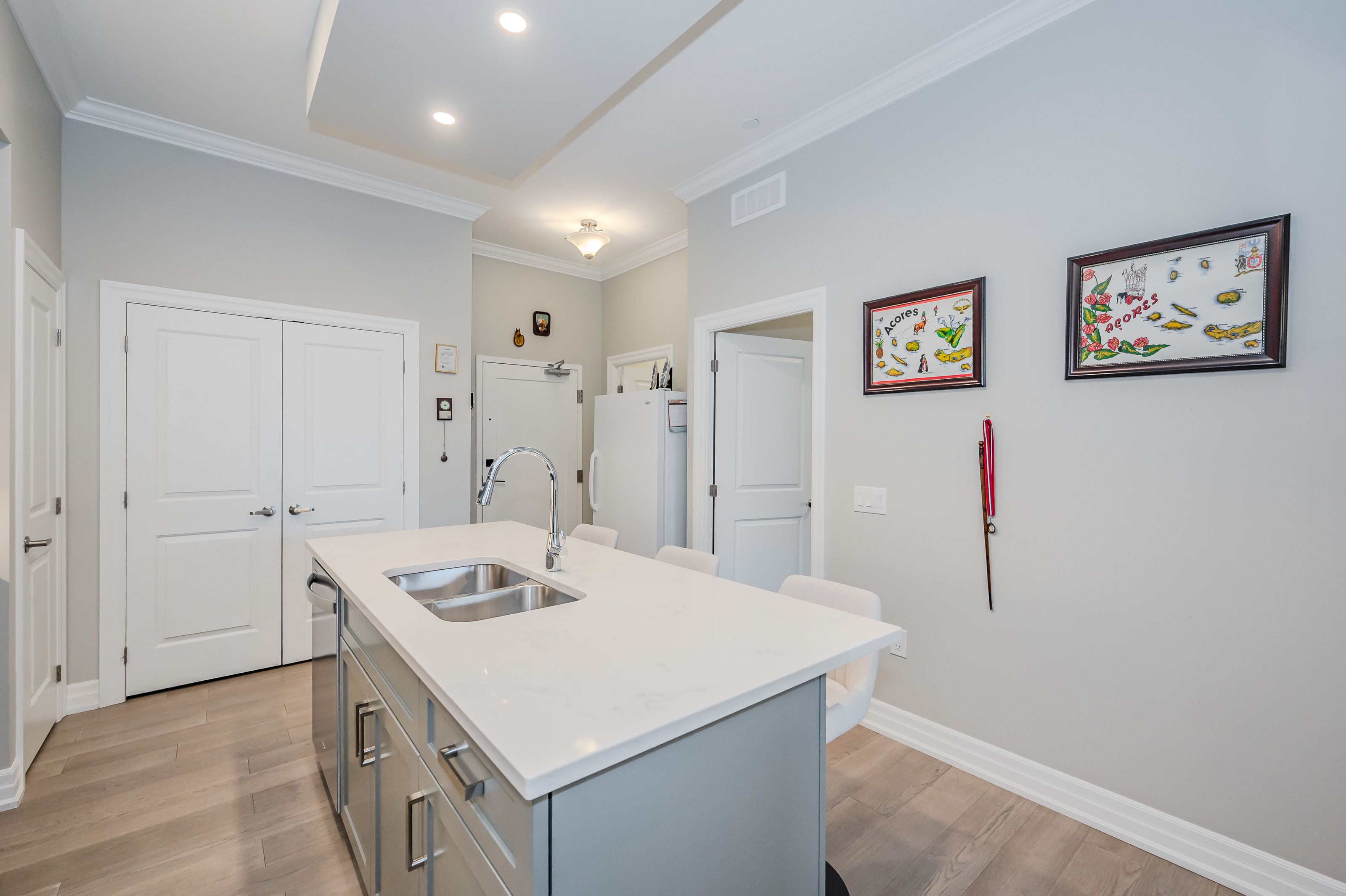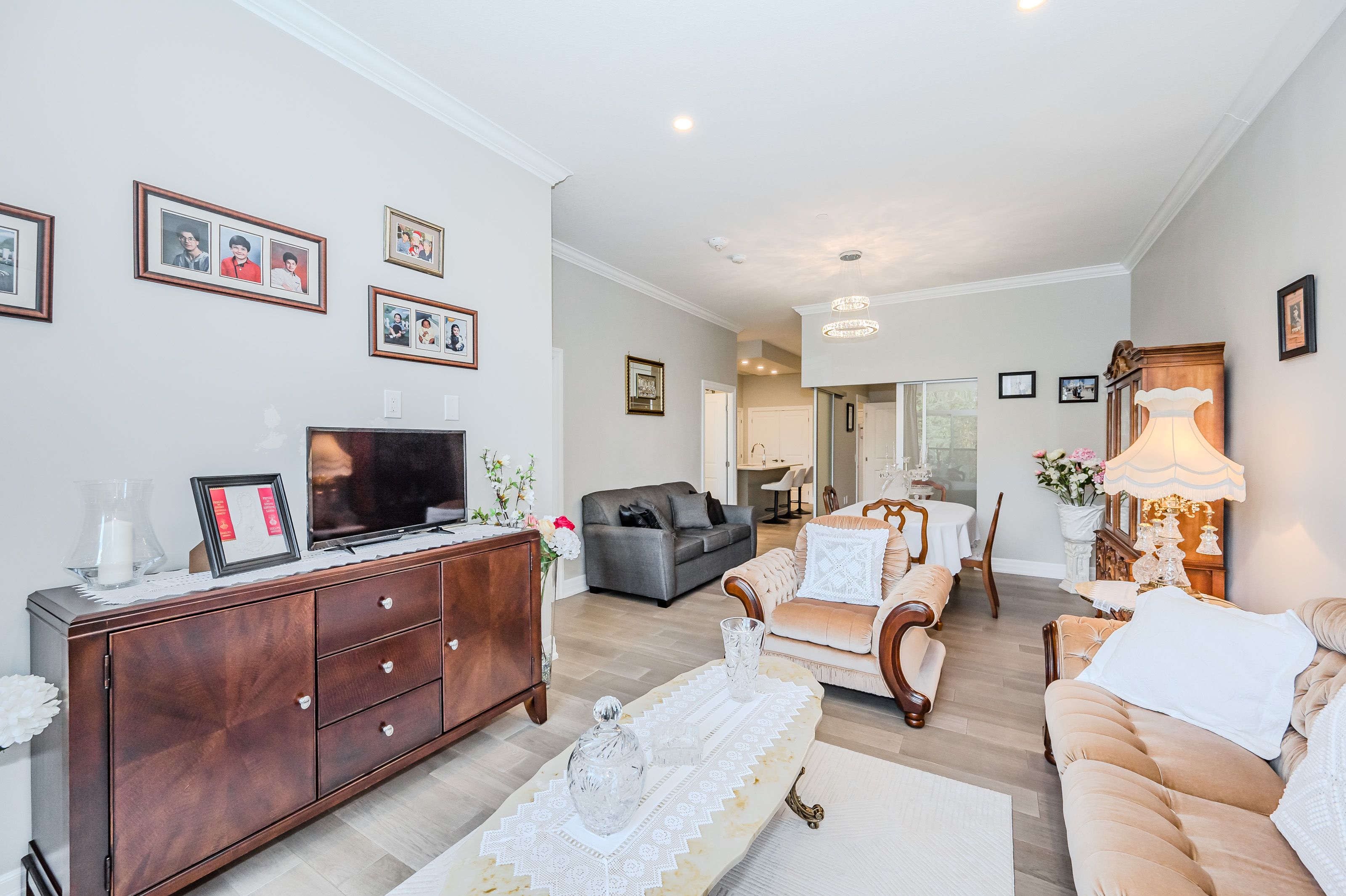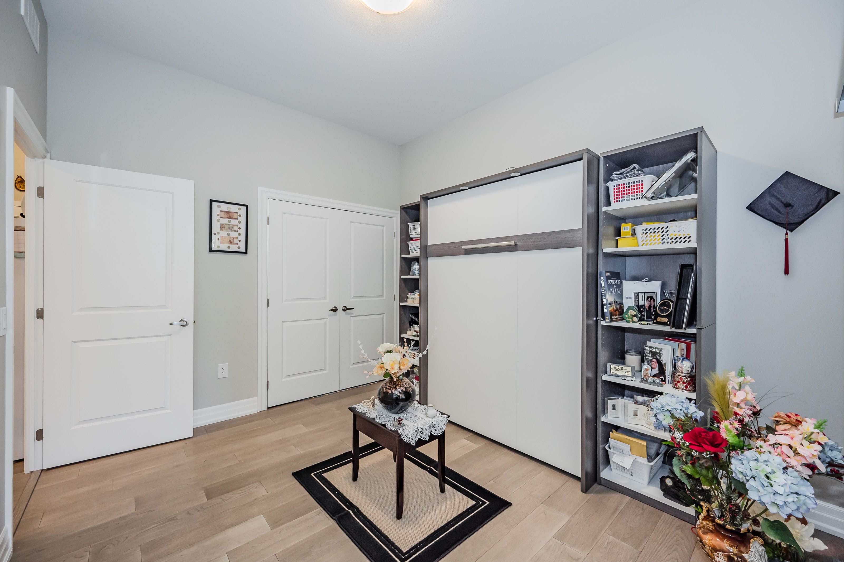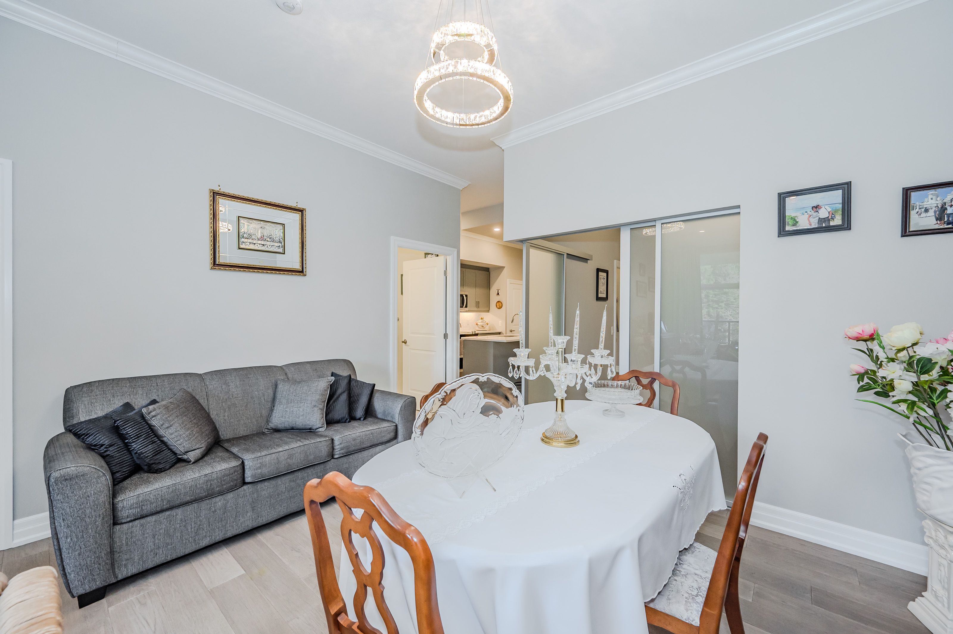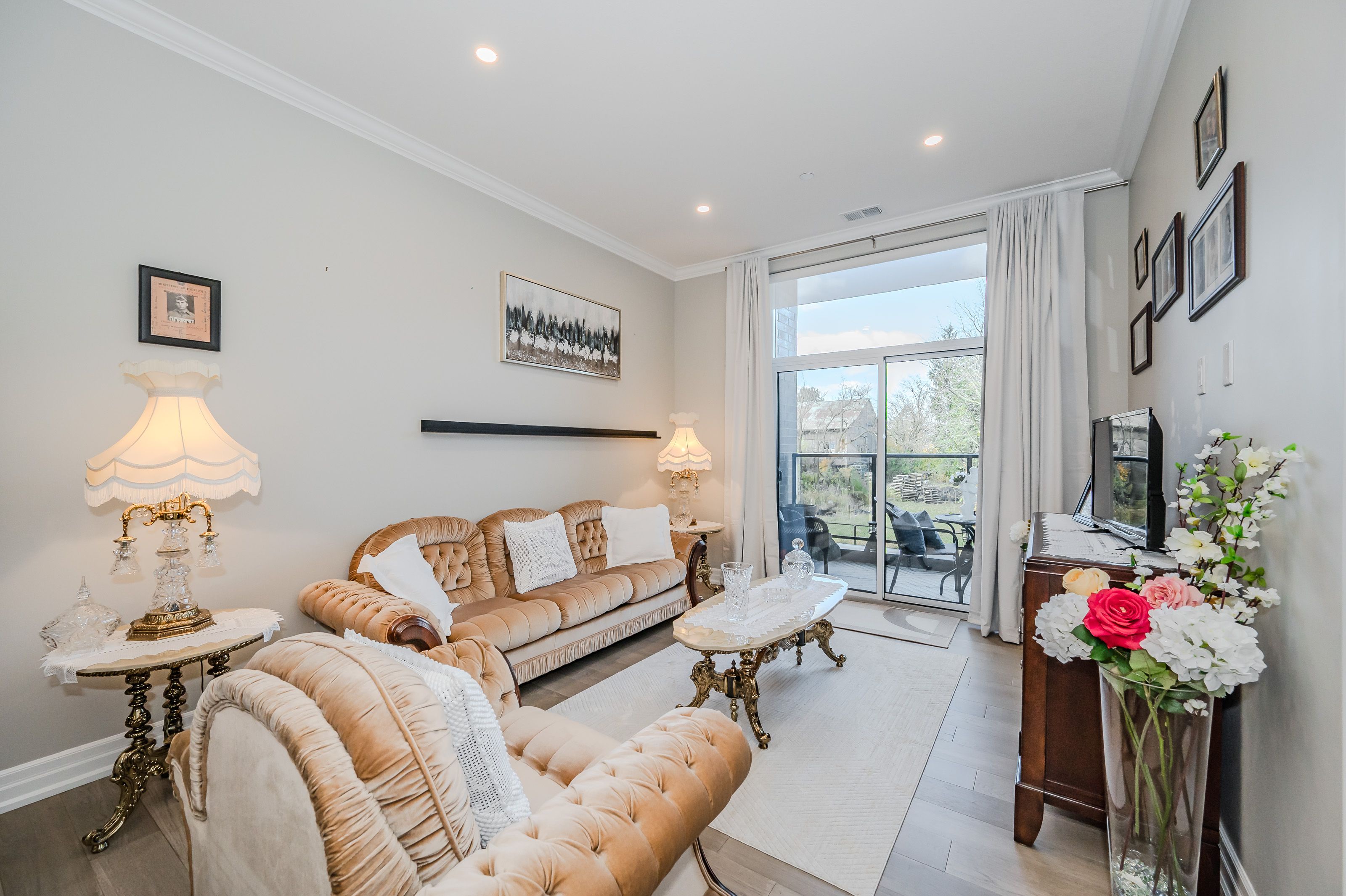 Make this gorgeous ground-floor condo located in the prestigious south end of Guelph your home. Professionally designed 2-bedroom, 2-bathroom suite with luxurious upgrades and TWO underground parking spaces. The 10' ceilings bring in more natural light and make the open-concept floor plan feel very spacious. With stunning finishes and a great layout, spending time at home is relaxing and joyful. The modern kitchen has plenty of cabinets, numerous drawers and a walk-in pantry for additional storage. Undermount lighting, built-in stainless steel appliances, a stylish backsplash, and a large island complete the kitchen. The spacious dining area overlooks the living room. A cute living room with large sliding doors leads to a private balcony. Enjoy a morning coffee or afternoon tea in your secluded outdoor space. The large primary bedroom has a walk-in closet and a luxurious ensuite bathroom with a floor-to-ceiling glass shower and heated flooring. With glass sliding doors that open up to the living/dining room, you will be pleased with the functionality of a second bedroom. With a Murphy bed already installed, it can be used as an office and/or a bedroom. The main 4-piece bath with heated floors and in-suite laundry completes this suite. Quartz counters and hardwood flooring throughout, crown molding, and pot lights are a bonus. This building has amazing amenities. With an HD golf simulator, a very well-equipped gym, a guest suite, bicycle storage, and a gorgeous 14th-floor resident lounge with a separate bar area, games room, and a balcony with panoramic views and great scenery. If you are expecting more guests, you can also book the building's guest suite. Located in Guelph's desirable south end, this beautiful condo is just steps away from great shopping, restaurants, banks, and cinema. Easy access to HWY 401 and on a bus route to UoG.