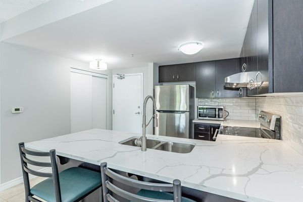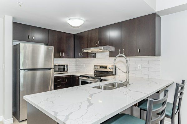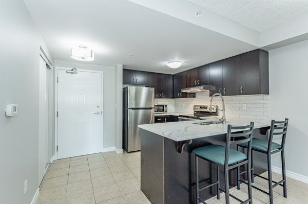 Here's a great opportunity in the south end of Guelph. An immaculate unit awaits you that has been freshly painted and situated on the ground floor for your convenience. This unit showcases one bedroom, one 4pc bathroom and one surface level parking space. The kitchen has floor tiling throughout with barstool seating, quartz countertops, a fresh white backsplash and stainless steel appliances. There is a stackable washer and dryer, owned water softener and a rental hot water heater. This is your chance to get into the market at a comfortable entry level price point in a unit that offers a lot of value. 43 Goodwin Drive is so close to the thriving south end with tons of amenities; grocery stores, movie theatre, medical offices, schools, parks and so much more. Call your Realtor today and book a showing!