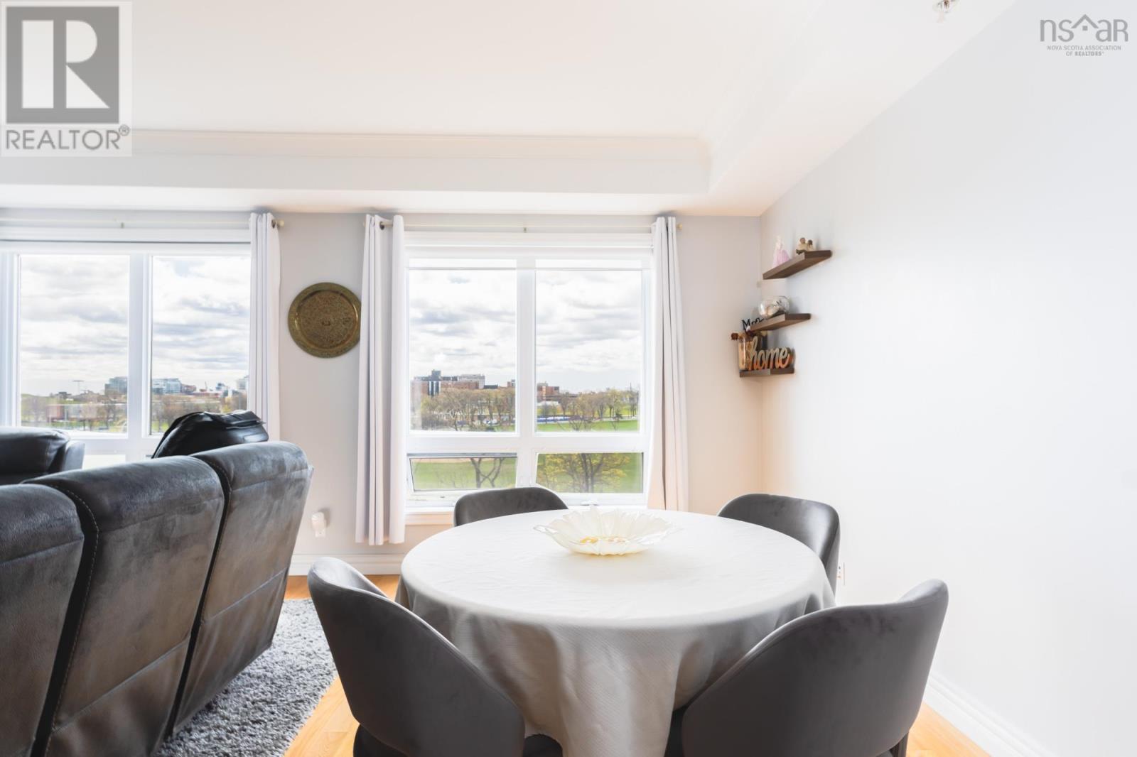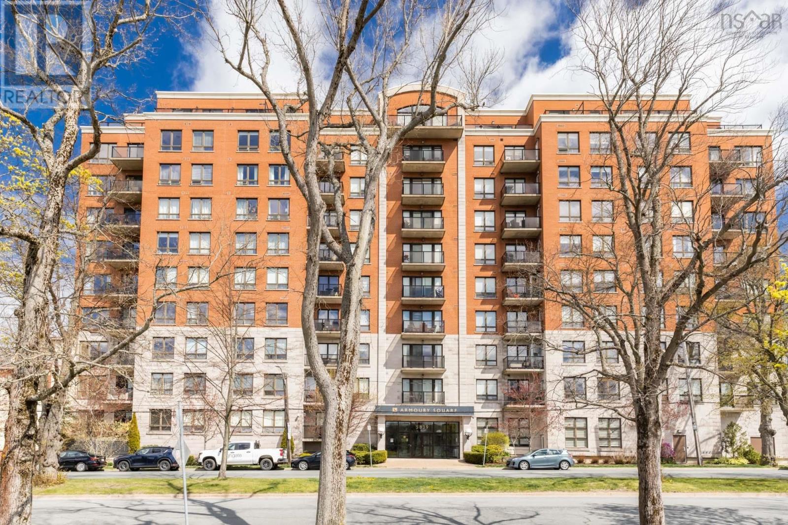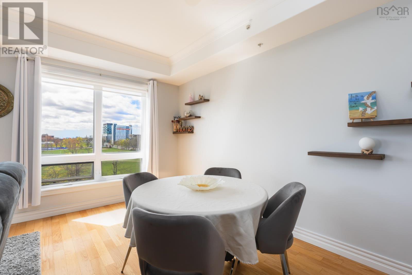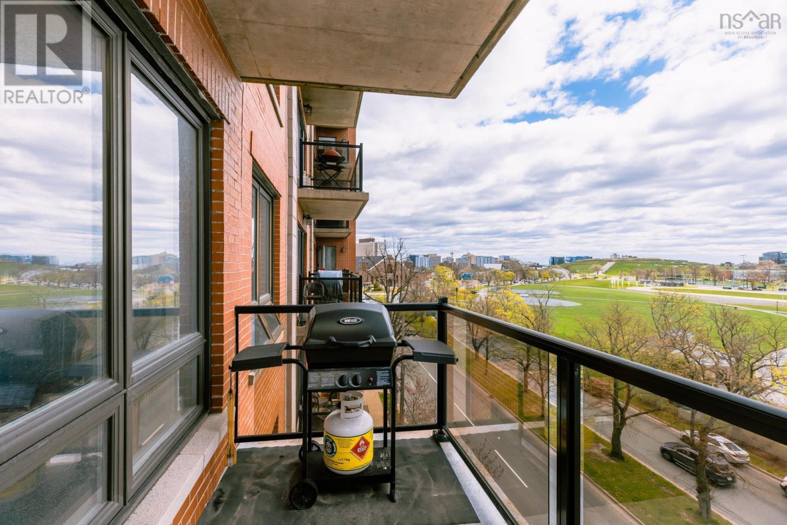 Welcome to a panoramic view of the Halifax Commons and Citadel Hill in this sunny, spacious, 2 bedroom + 2 full bath + den condo at Armoury Square in the heart of the peninsula, at the cusp of downtown Halifax. The unit features 1284 square feet of space, high ceilings, large windows, open-concept living, in-suite laundry, a storage locker, underground parking and a balcony to enjoy Halifax?s vibrant summer. Nestled on the 5th floor above a lush canopy of trees, this unit has a view from every room and is across the street from the Commons. Let the sunlight flood into the living room as you gaze over the Commons coffee in hand straight from the breakfast bar. Bring out your inner chef in the large kitchen with abundant counter-space. Wake up to the morning light in the primary bedroom (which fits a king-side bed with ample space to spare) with an attached 6-piece bath and walk-in closet. Host guests or set up a play pen in the secondary bedroom with an adjacent 3-piece bath. Get creative and set up your own office, library, or bar in the den! As one of the city?s most respected buildings, Armoury Square boasts a recreation centre, an enclosed garden, a gym, secured access, and bike storage included in a low condo fee that covers heat, water, A/C, landscaping and maintenance. Enjoy a summer barbecue from the comfort of your balcony. Or if you can find the heart to leave home, take a walk through the trendy North End, grab brunch at Agricola Street Brasserie or play fetch at the Commons with your furry friend. Take a bike ride up to the Citadel Hill or get in a workout at nearby North Endurance. With a host of options a stone?s throw away, Armoury Square really does have it all. If you love sunny homes with high ceilings, large windows, a spacious balcony, views from every room, all in a well-managed, respectable condo with low monthly fee, in a central and trendy location, this is it for you! View 3D tour here: https://my.matterport.com/show/?m=uv4YWxrskpC (id:22211)