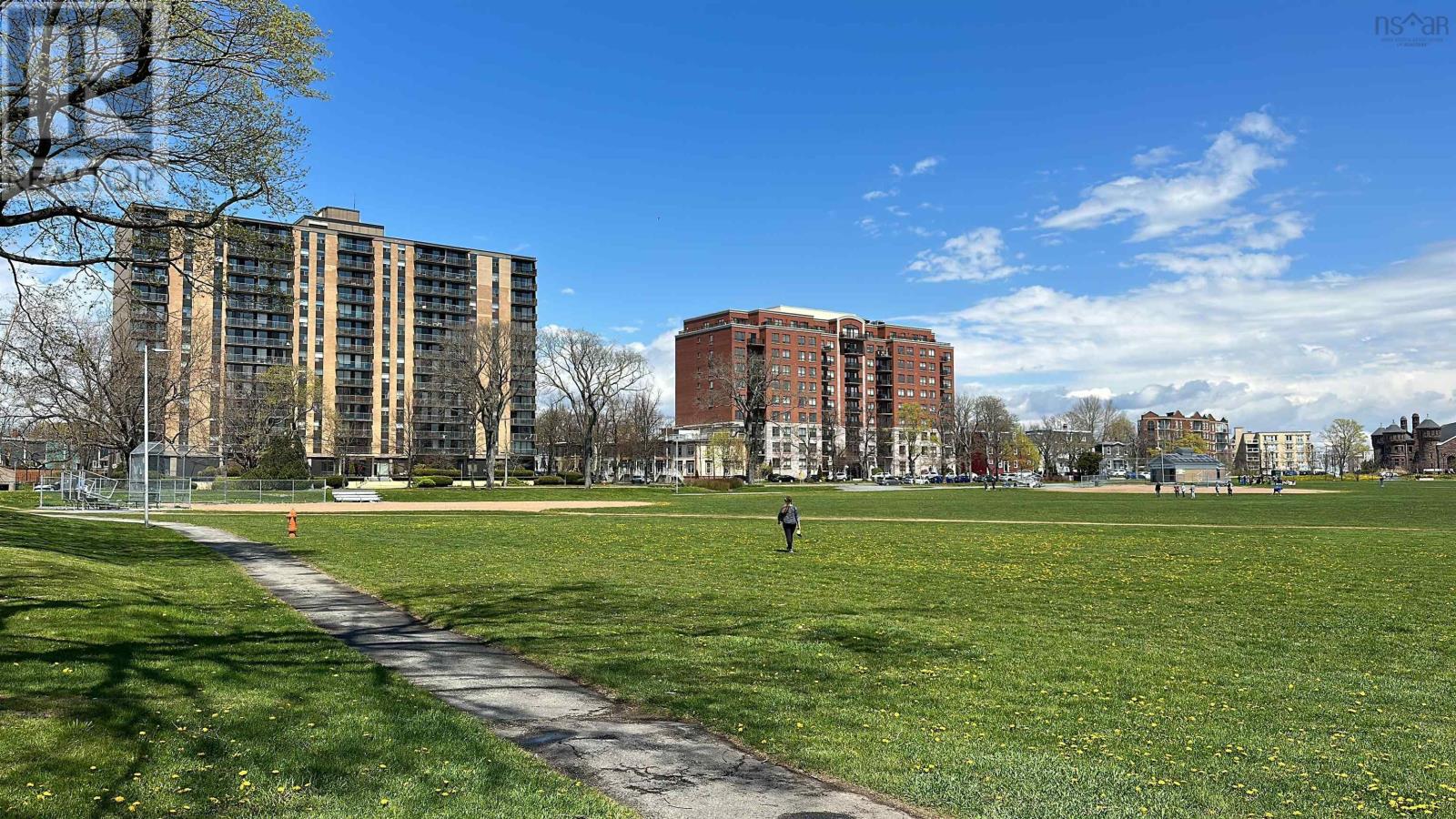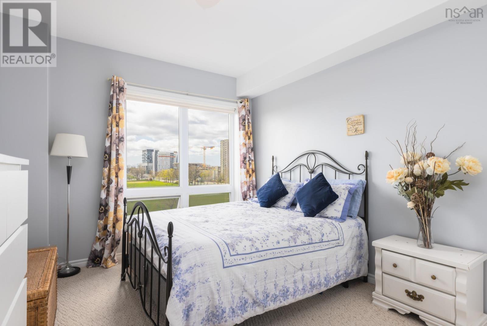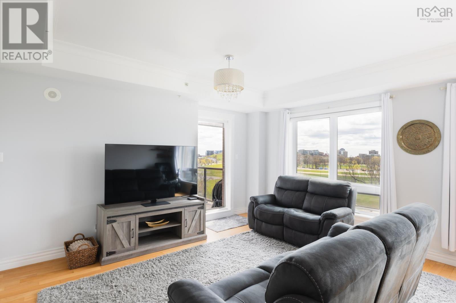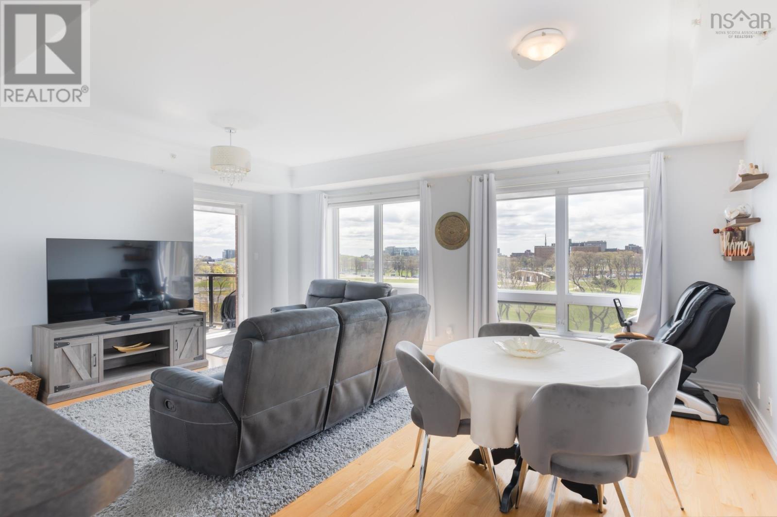 Welcome to a panoramic view of the Halifax Commons and Citadel Hill in this sunny, spacious, 2 bedroom + 2 full bath + den condo at Armoury Square in the heart of the peninsula, at the cusp of downtown Halifax. The unit features 1284 square feet of space, high ceilings, large windows, open-concept living, in-suite laundry, a storage locker, underground parking and a balcony to enjoy Halifax?s vibrant summer. Nestled on the 5th floor above a lush canopy of trees, this unit has a view from every room and is across the street from the Commons. Let the sunlight flood into the living room as you gaze over the Commons coffee in hand straight from the breakfast bar. Bring out your inner chef in the large kitchen with abundant counter-space. Wake up to the morning light in the primary bedroom (which fits a king-side bed with ample space to spare) with an attached 6-piece bath and walk-in closet. Host guests or set up a play pen in the secondary bedroom with an adjacent 3-piece bath. Get creative and set up your own office, library, or bar in the den! As one of the city?s most respected buildings, Armoury Square boasts a recreation centre, an enclosed garden, a gym, secured access, and bike storage included in a low condo fee that covers heat, water, A/C, landscaping and maintenance. Enjoy a summer barbecue from the comfort of your balcony. Or if you can find the heart to leave home, take a walk through the trendy North End, grab brunch at Agricola Street Brasserie or play fetch at the Commons with your furry friend. Take a bike ride up to the Citadel Hill or get in a workout at nearby North Endurance. With a host of options a stone?s throw away, Armoury Square really does have it all. If you love sunny homes with high ceilings, large windows, a spacious balcony, views from every room, all in a well-managed, respectable condo with low monthly fee, in a central and trendy location, this is it for you! View 3D tour here: https://my.matterport.com/show/?m=uv4YWxrskpC (id:22211)