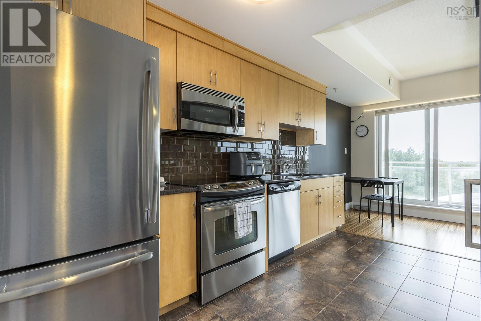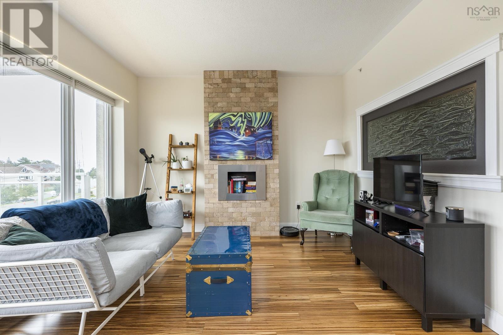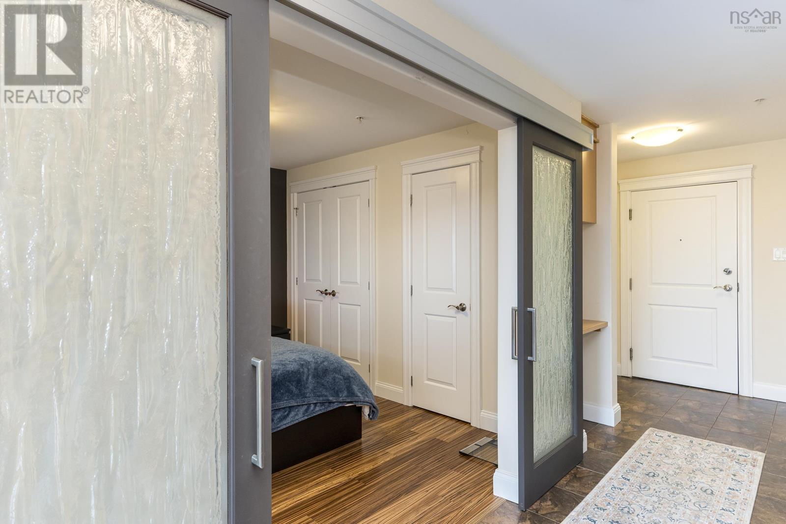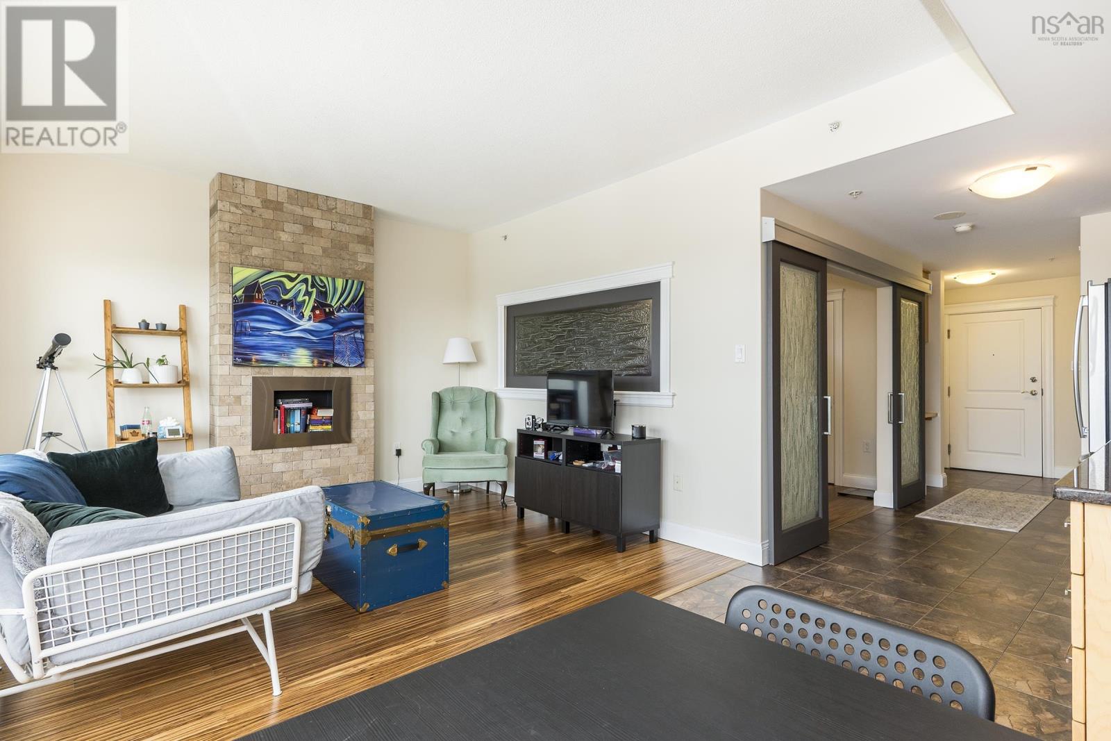 Feel like you are living in an upscale hotel suite in this 1 bedroom condo. Located only minutes to Downtown or to Bayers Lake. It was thoughtfully laid out with a stylish design. The open concept living space is flooded with light from the wall to ceiling windows going the whole width of the unit. The kitchen has lots of cabinets decked out with granite countertops. Stainless steel appliances including a microwave range and dishwasher. You can access the balcony from the patio doors off of the dining area. The living room has a fireplace as the main focal point and cozy hardwood floors. There is an obscured glass wall inlay that acts as an art piece while also bringing light into the bedroom. The bedroom doors have the same glass in the double barn style doors for the entrance. There is lots of storage space between the dual closets. A full bathroom with floating shelves. In suite laundry is tucked away. The condo fees include heat, water, and air conditioning. The current tenant is on a fixed lease until March but why not secure your investment now and take time to plan your move. (id:22211)