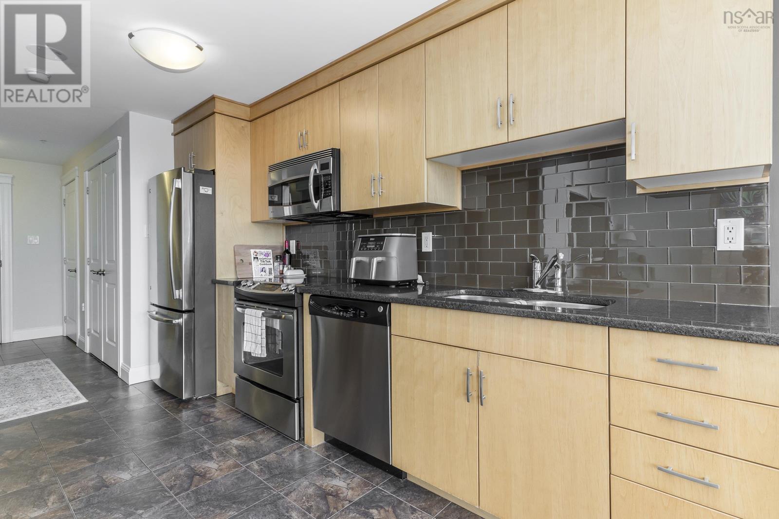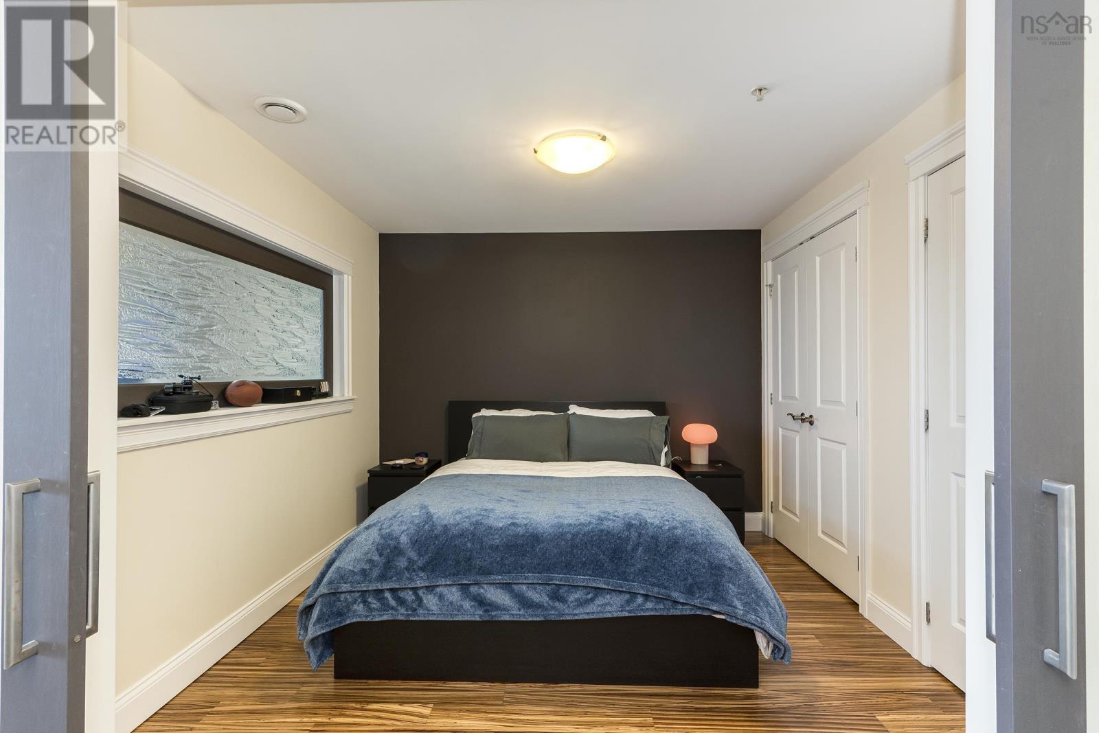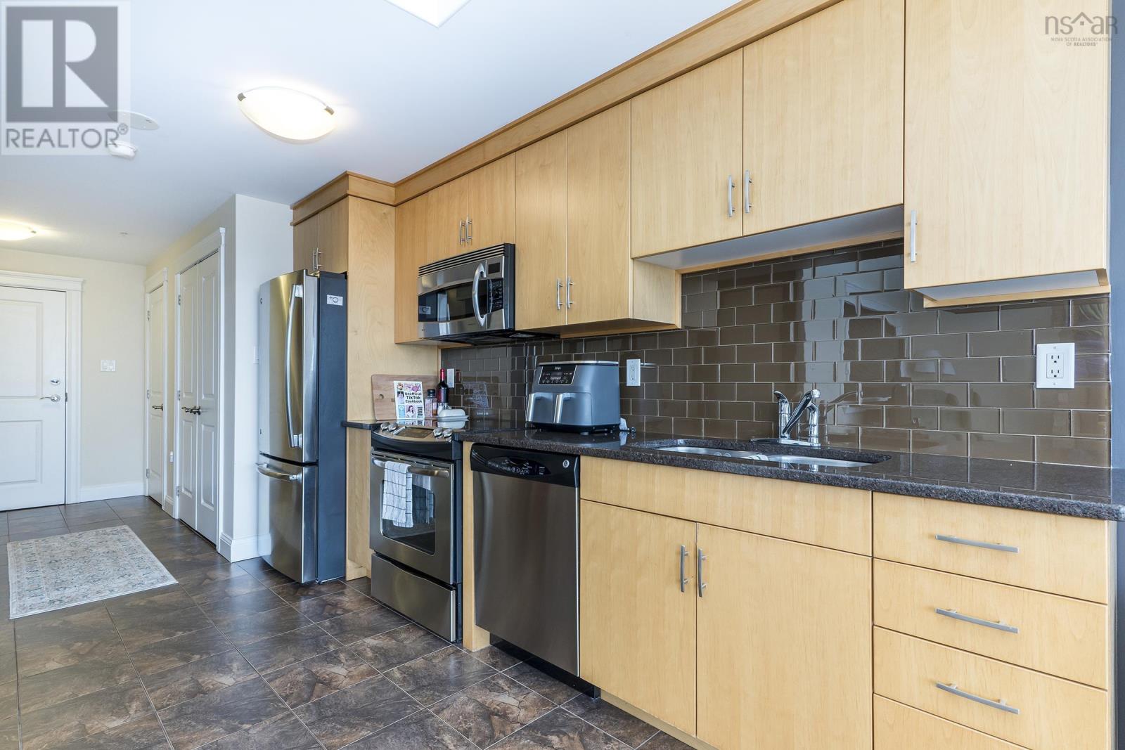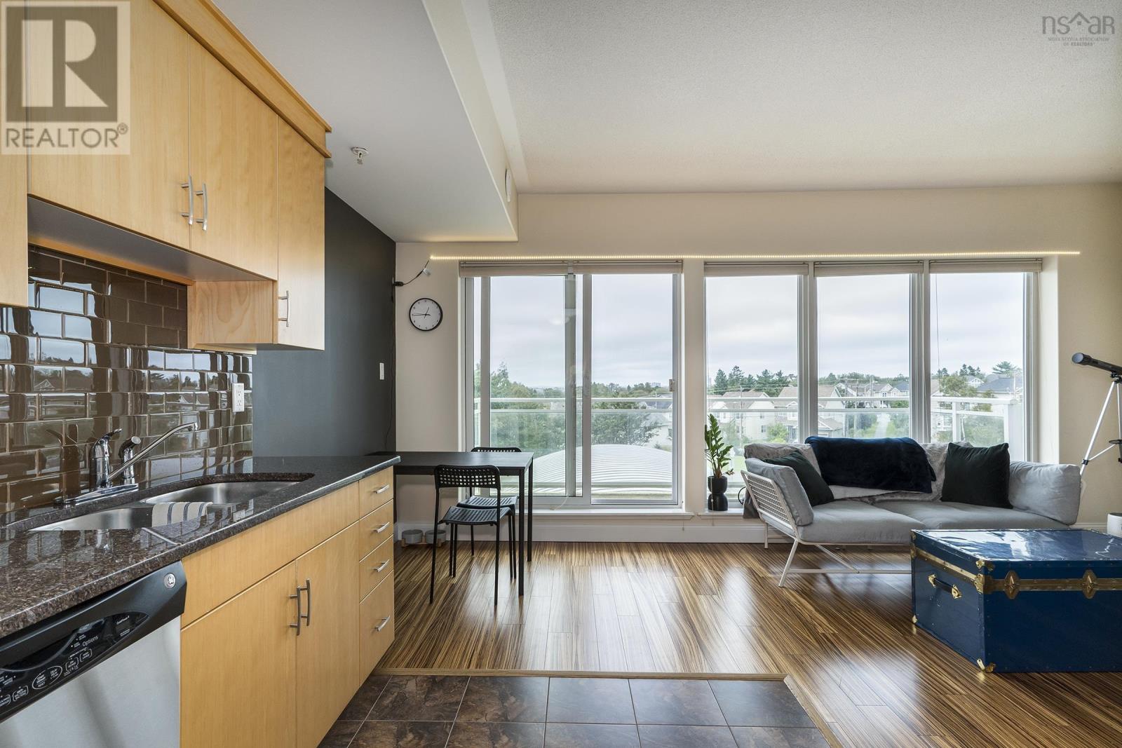 Feel like you are living in an upscale hotel suite in this 1 bedroom condo. Located only minutes to Downtown or to Bayers Lake. It was thoughtfully laid out with a stylish design. The open concept living space is flooded with light from the wall to ceiling windows going the whole width of the unit. The kitchen has lots of cabinets decked out with granite countertops. Stainless steel appliances including a microwave range and dishwasher. You can access the balcony from the patio doors off of the dining area. The living room has a fireplace as the main focal point and cozy hardwood floors. There is an obscured glass wall inlay that acts as an art piece while also bringing light into the bedroom. The bedroom doors have the same glass in the double barn style doors for the entrance. There is lots of storage space between the dual closets. A full bathroom with floating shelves. In suite laundry is tucked away. The condo fees include heat, water, and air conditioning. The current tenant is on a fixed lease until March but why not secure your investment now and take time to plan your move. (id:22211)