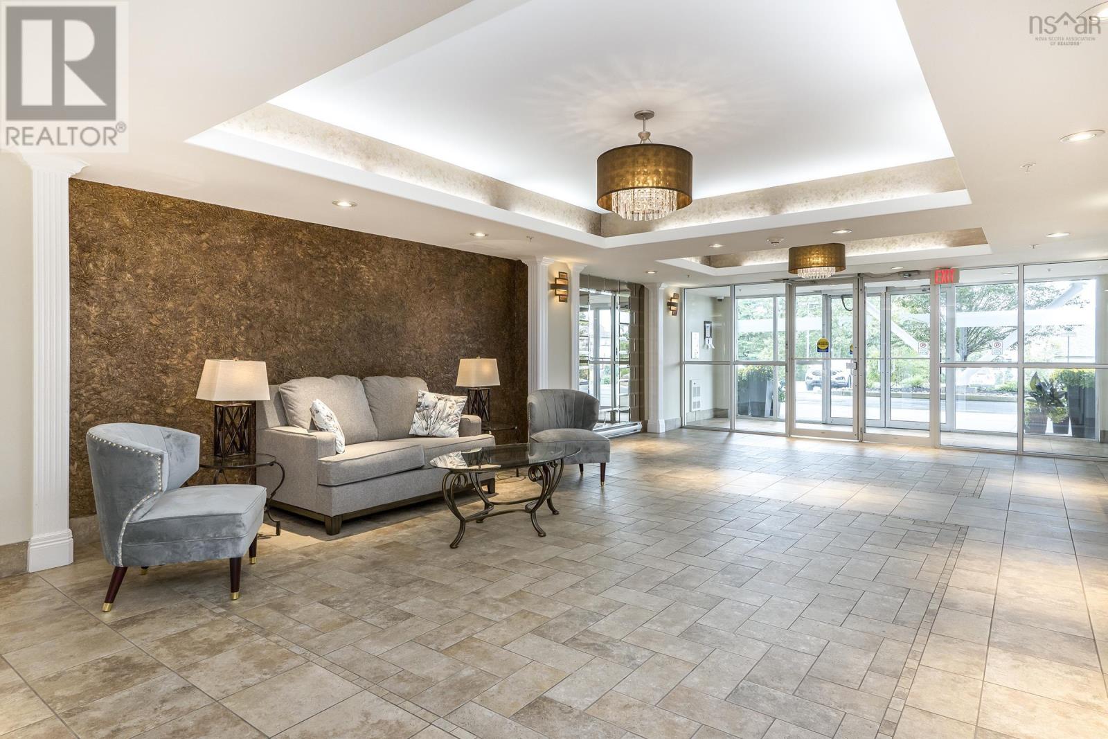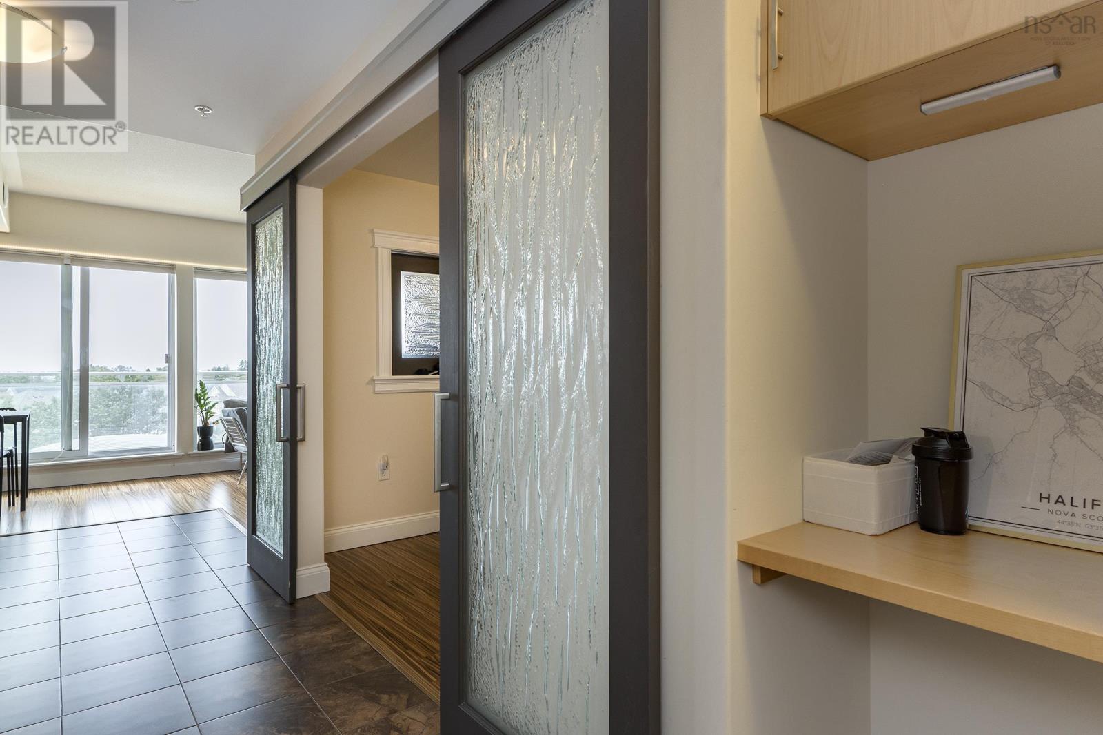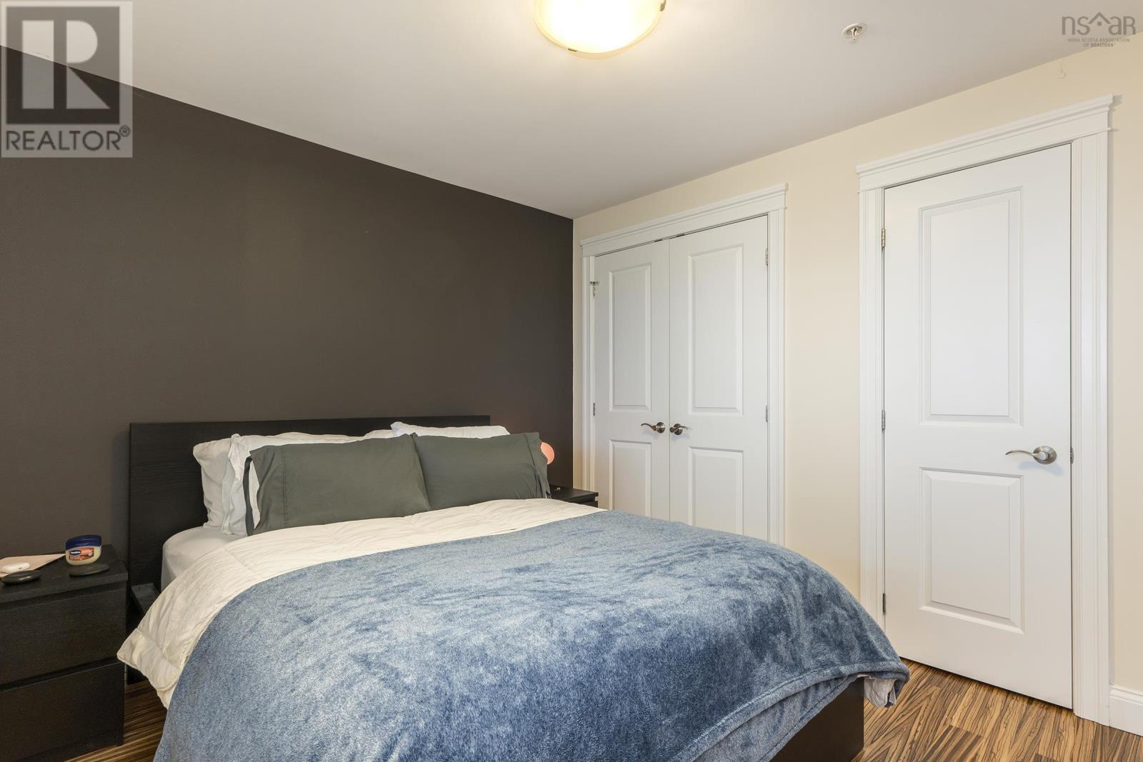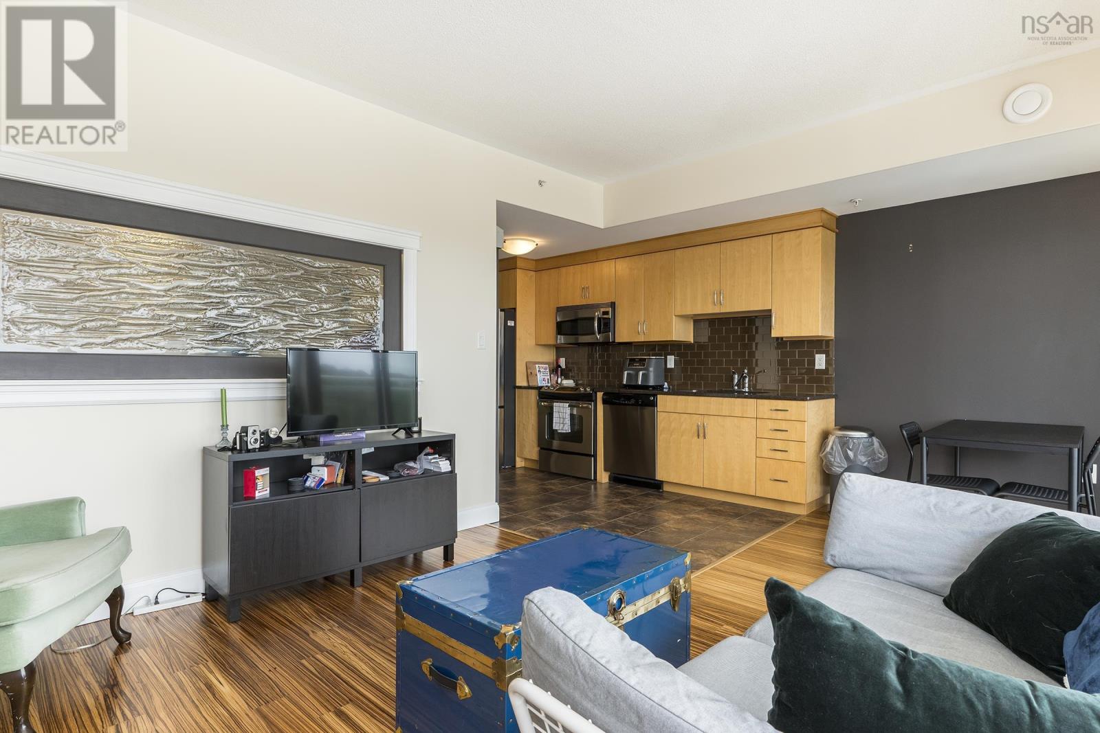 Feel like you are living in an upscale hotel suite in this 1 bedroom condo. Located only minutes to Downtown or to Bayers Lake. It was thoughtfully laid out with a stylish design. The open concept living space is flooded with light from the wall to ceiling windows going the whole width of the unit. The kitchen has lots of cabinets decked out with granite countertops. Stainless steel appliances including a microwave range and dishwasher. You can access the balcony from the patio doors off of the dining area. The living room has a fireplace as the main focal point and cozy hardwood floors. There is an obscured glass wall inlay that acts as an art piece while also bringing light into the bedroom. The bedroom doors have the same glass in the double barn style doors for the entrance. There is lots of storage space between the dual closets. A full bathroom with floating shelves. In suite laundry is tucked away. The condo fees include heat, water, and air conditioning. The current tenant is on a fixed lease until March but why not secure your investment now and take time to plan your move. (id:22211)