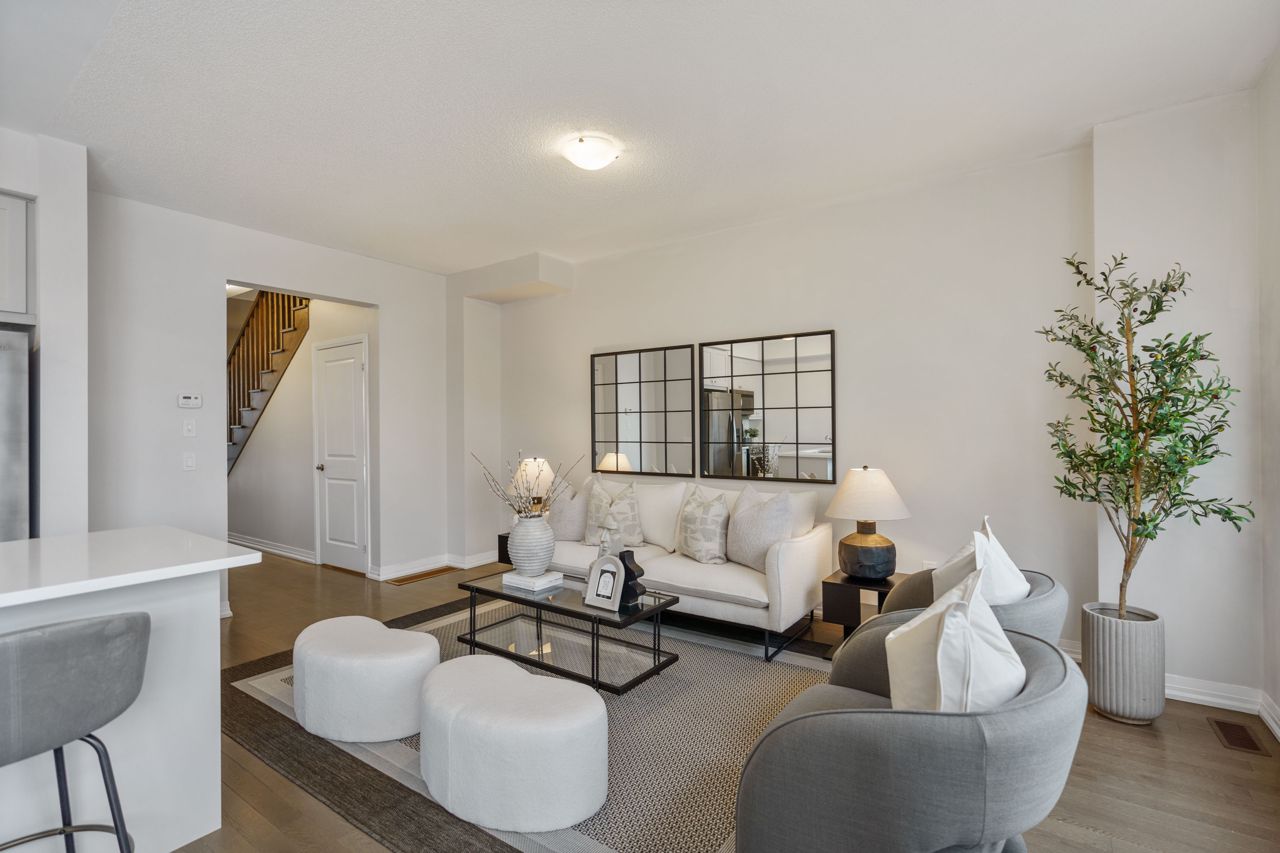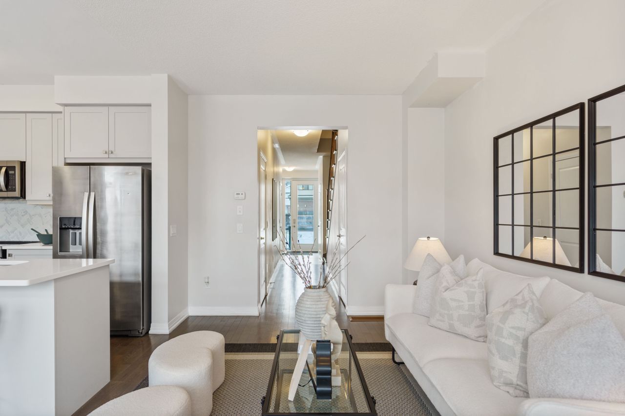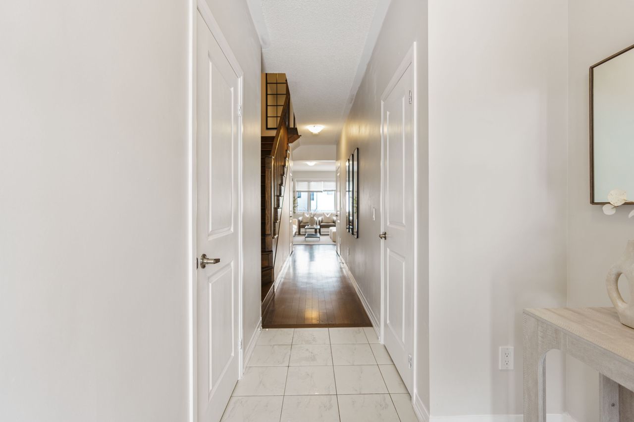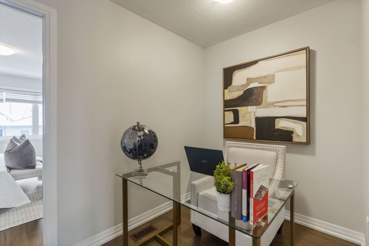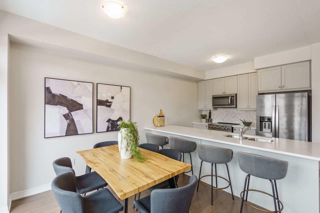 This gorgeous townhouse blends modern living with luxury upgrades, offering a perfect blend of comfort and style. The beautifully upgraded eat-in kitchen features extended quartz countertops, herringbone backsplash, built-in pantries, and direct garage access through a mudroom. A sliding door leads to a charming deck and backyard, ideal for outdoor living. The home boasts 9-ft ceilings and upgraded hardwood floors on the main level. Upstairs you will find 3 generously sized carpet free bedrooms. The primary bedroom suite includes a spa-inspired ensuite with double sinks, custom cabinetry, and a glass-enclosed shower. Two additional bedrooms are bright and spacious, and the den is perfect to use as a study or WFH office. With no condo fees, a well-maintained exterior, and a prime location in a vibrant community, this home is perfect for first-time buyers, young families, or those seeking to downsize. Don't miss this rare opportunity to own a gem in a highly sought-after neighbourhood!
