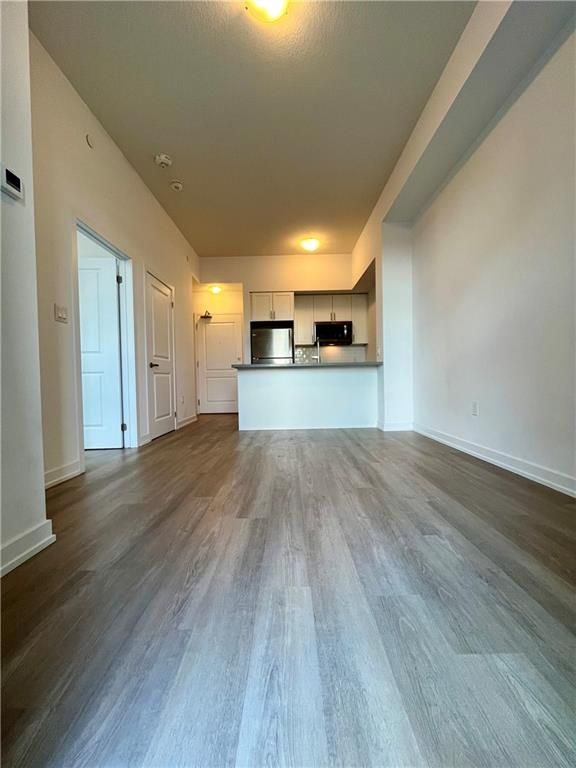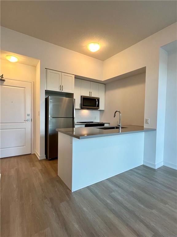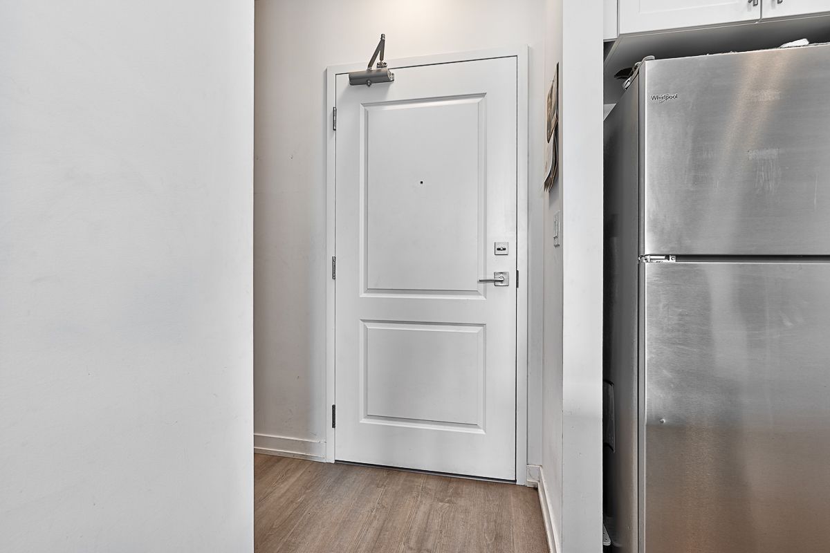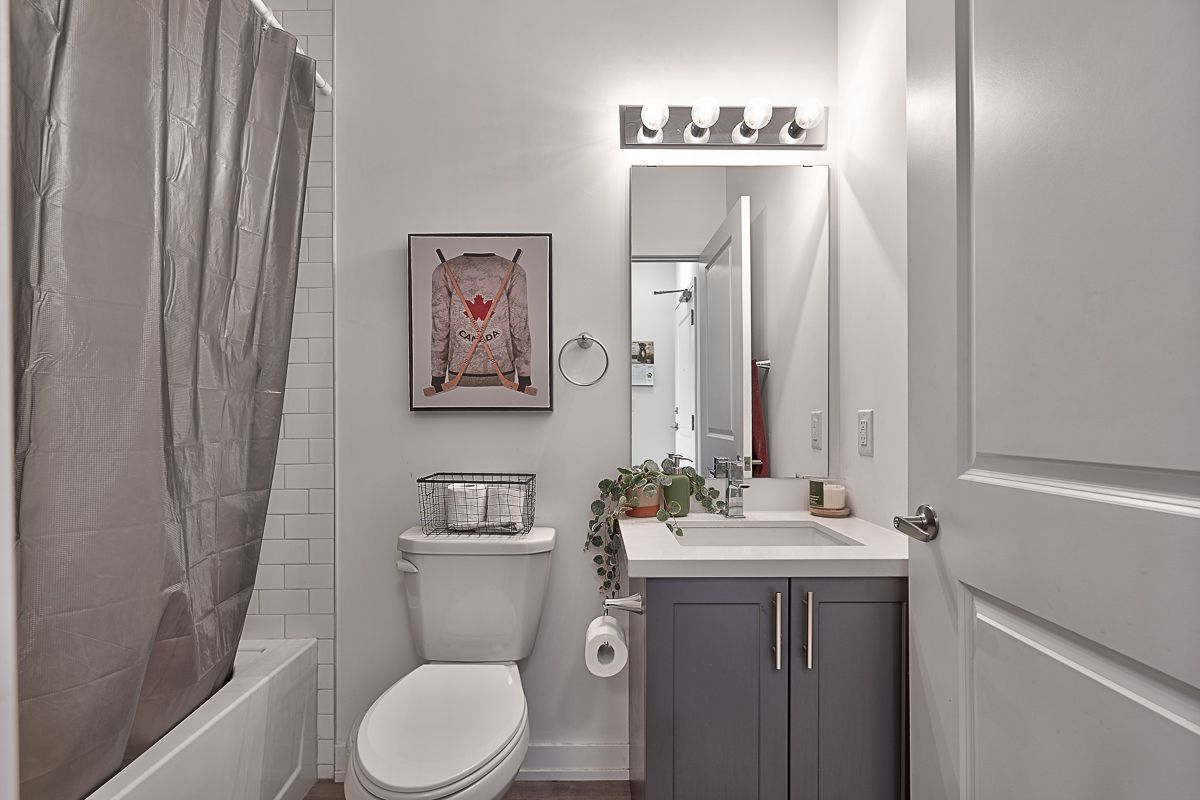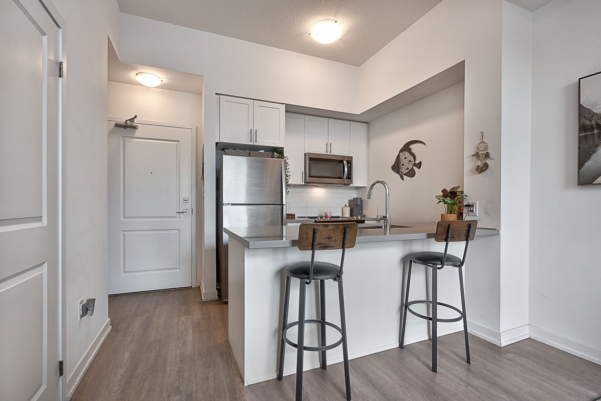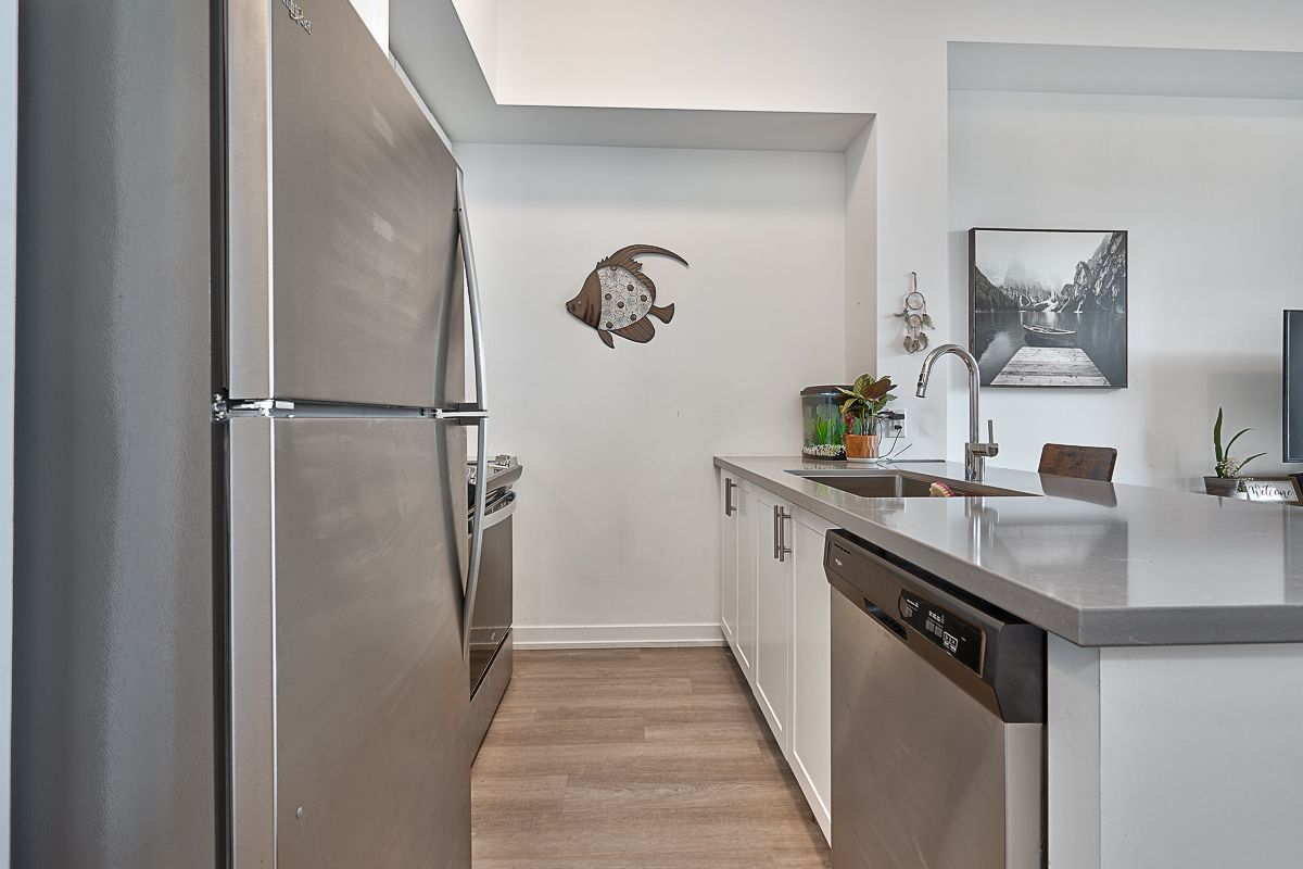 Bright and open main floor suite with 1 parking and locker included! This spacious unit features upgraded stainless steel appliances including a built-in microwave/fan and breakfast bar, and an open-concept living room with upgraded flooring. The primary bedroom is a quiet retreat with generous-sized closet & floor to ceiling windows that let in a ton of natural light. You'll also love the 4-piece bathroom, in-suite washer and dryer & balcony. The low condo fee covers geothermal heating and air conditioning, maintenance, building insurance, parking, and access to all of Trend's top notch amenities like party rooms, modern fitness facilities, rooftop patios, bike storage, BBQ area, and visitors parking. 1 parking spot and 1 locker included.