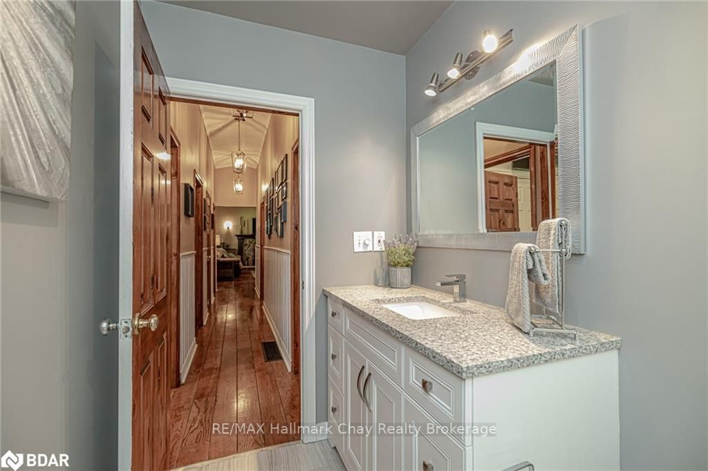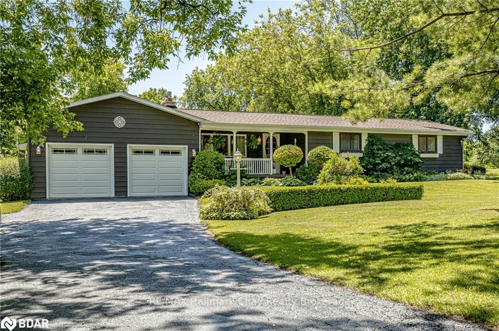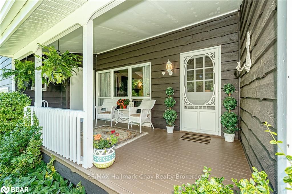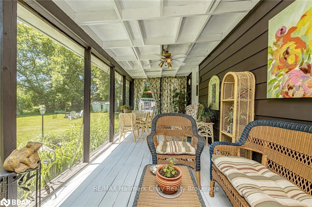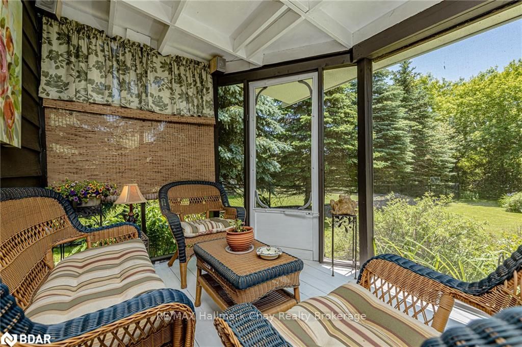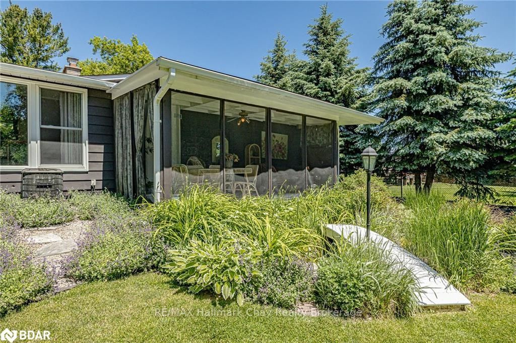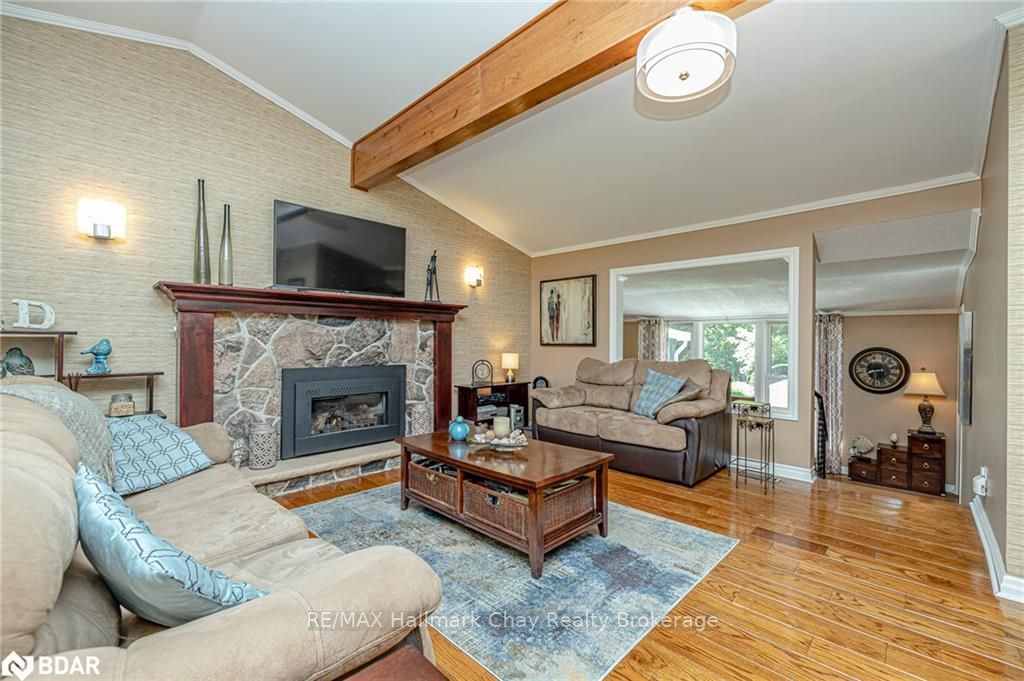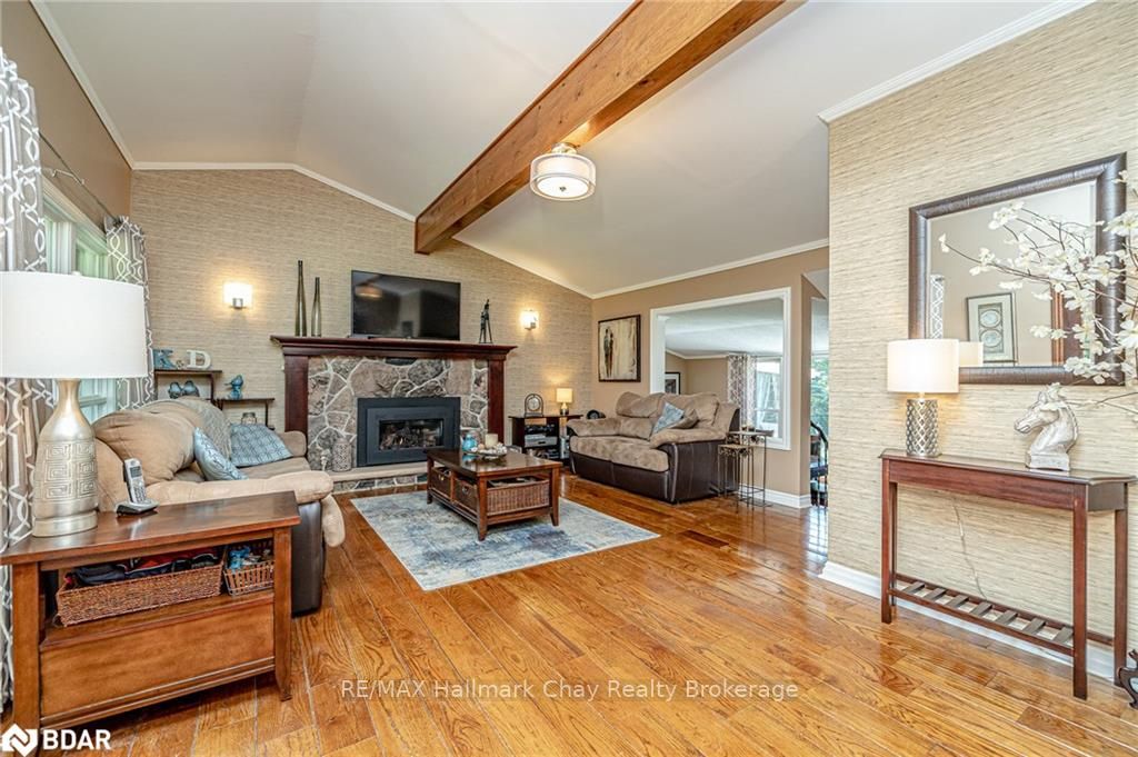 Welcome to 1335 Gilford Road, located in the desirable community of Gilford, just steps from the beautiful shores of Lake Simcoe with it's marinas, beaches and parks. This unique bungalow with just over 2,000 sq ft is one of a kind in the neighbourhood. Sitting on a great sized lot, beautifully landscaped backing onto a mature treed area. The interior of this home features hardwood floors, vaulted ceilings throughout and incredible charm! A grand gas fireplace with stone surround, and exposed wood architectural beam over-looking the sunken dining room, a large eat-in kitchen with quartz counter tops, under mount sink, tile backsplash and pantry, a bright family room with walk-out to deck. Down the hall you'll find the master bedroom with his-&-hers closets, 2 additional bedrooms as well as a newly renovated main bath with granite vanity and beautiful tile. Off of the dining room you'll find the 4th bedroom and 3pc bath as well as walk-out to the large three season sunroom, fully screen