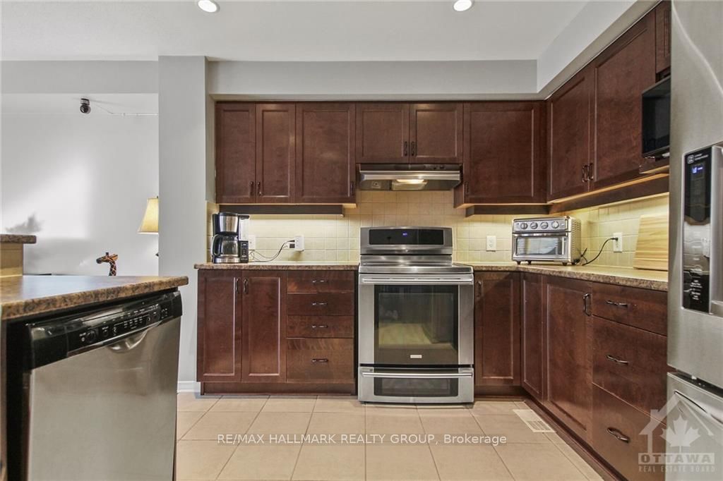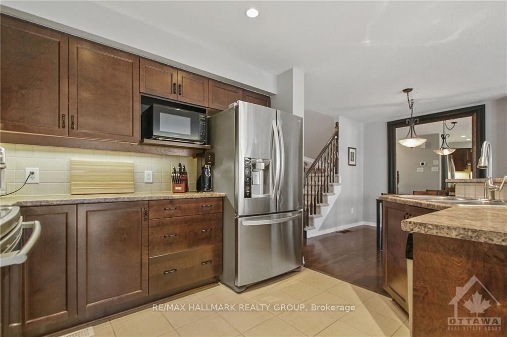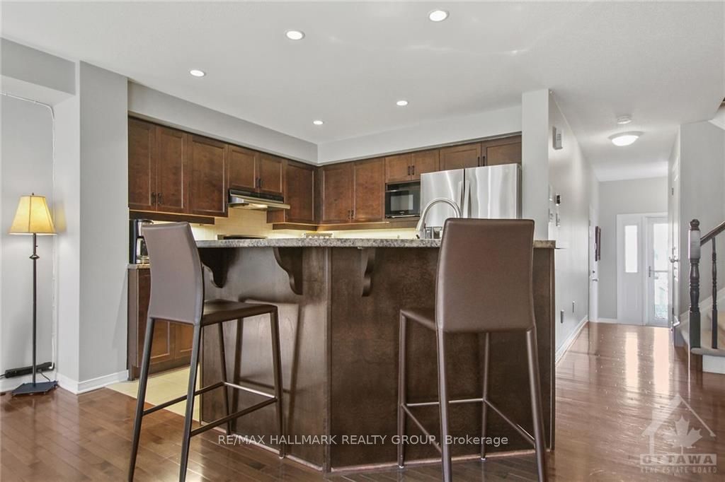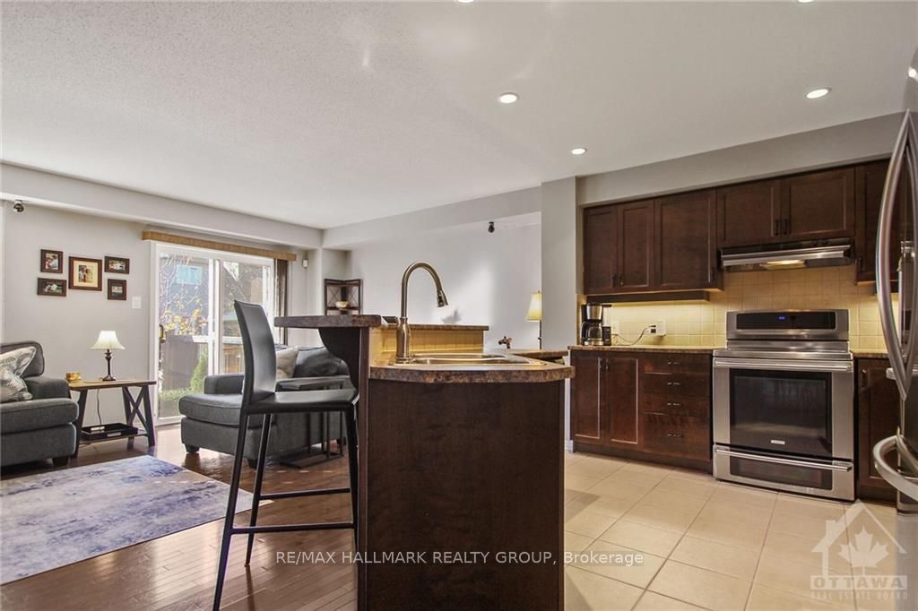 Flooring: Hardwood, Flooring: Ceramic, Nicely updated + spacious 3 bedroom, 3 bathroom freehold townhouse with 2nd Level loft/den- perfect for home based business! Great location in heart of "Hi-Tech Alley" close to shops, pubs, restaurants, parks, schools, Richcraft Rec Centre + public transit. The Henley Model by Holitzner Homes characterized by open concept design. Large living/dining room area accented by hardwood floors + gas fireplace, gourmet kitchen with Shaker cabinets, pot lights, stainless steel appliances, island with breakfast nook. The 2nd Level features updated berber carpets + recently painted throughout. Primary bedroom features vaulted ceiling, walk in closet + luxury ensuite with double sink, roman tub + glass shower. Lower level features huge recroom/workout room with laminate floors, functional laundry room + tons of storage. Private fenced backyard features gazebo, indoor/outdoor turf + storage shed. Single attached garage with automatic opener. Perfect for First Time Buyers or Investors. Great value!, Flooring: Carpet Wall To Wall