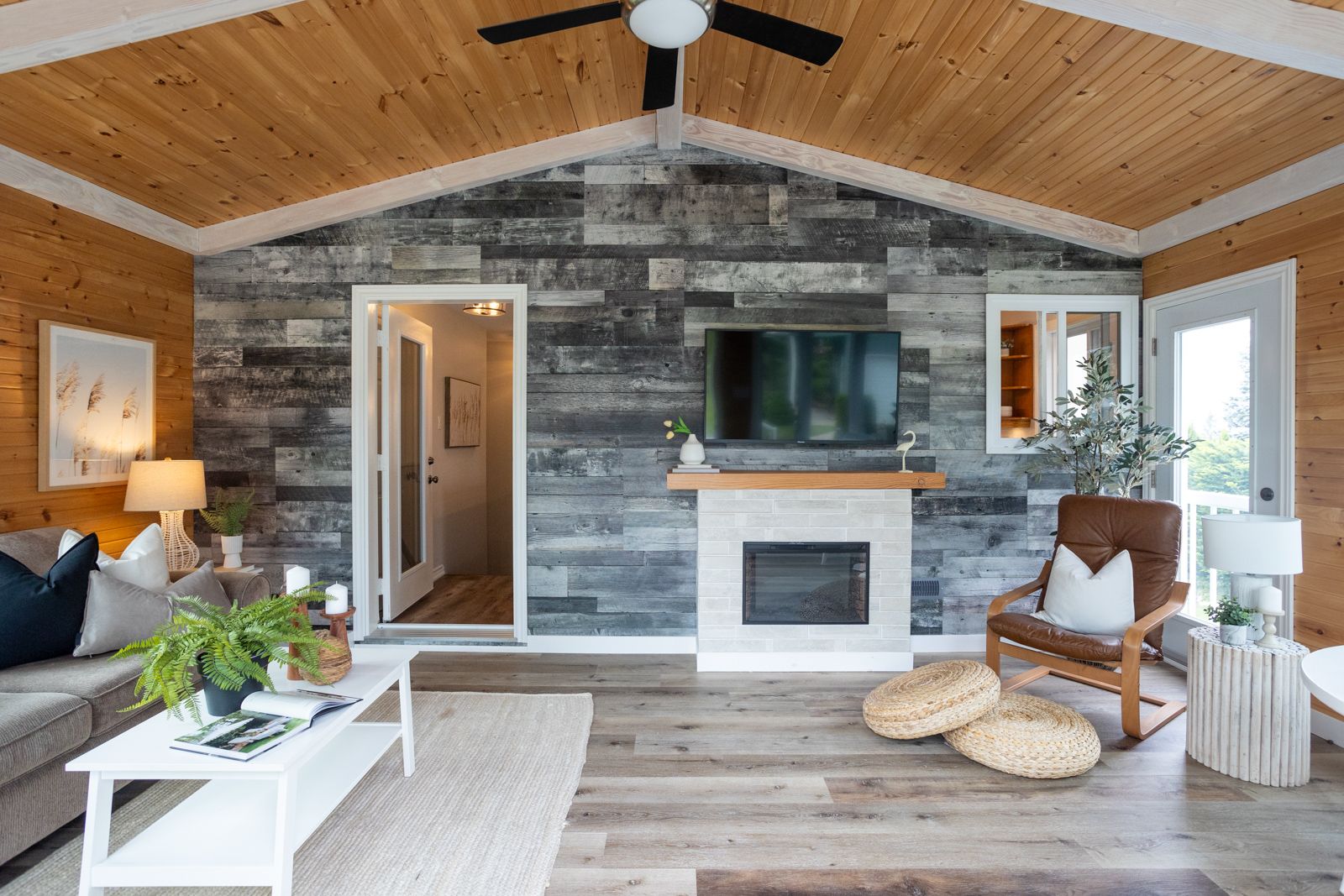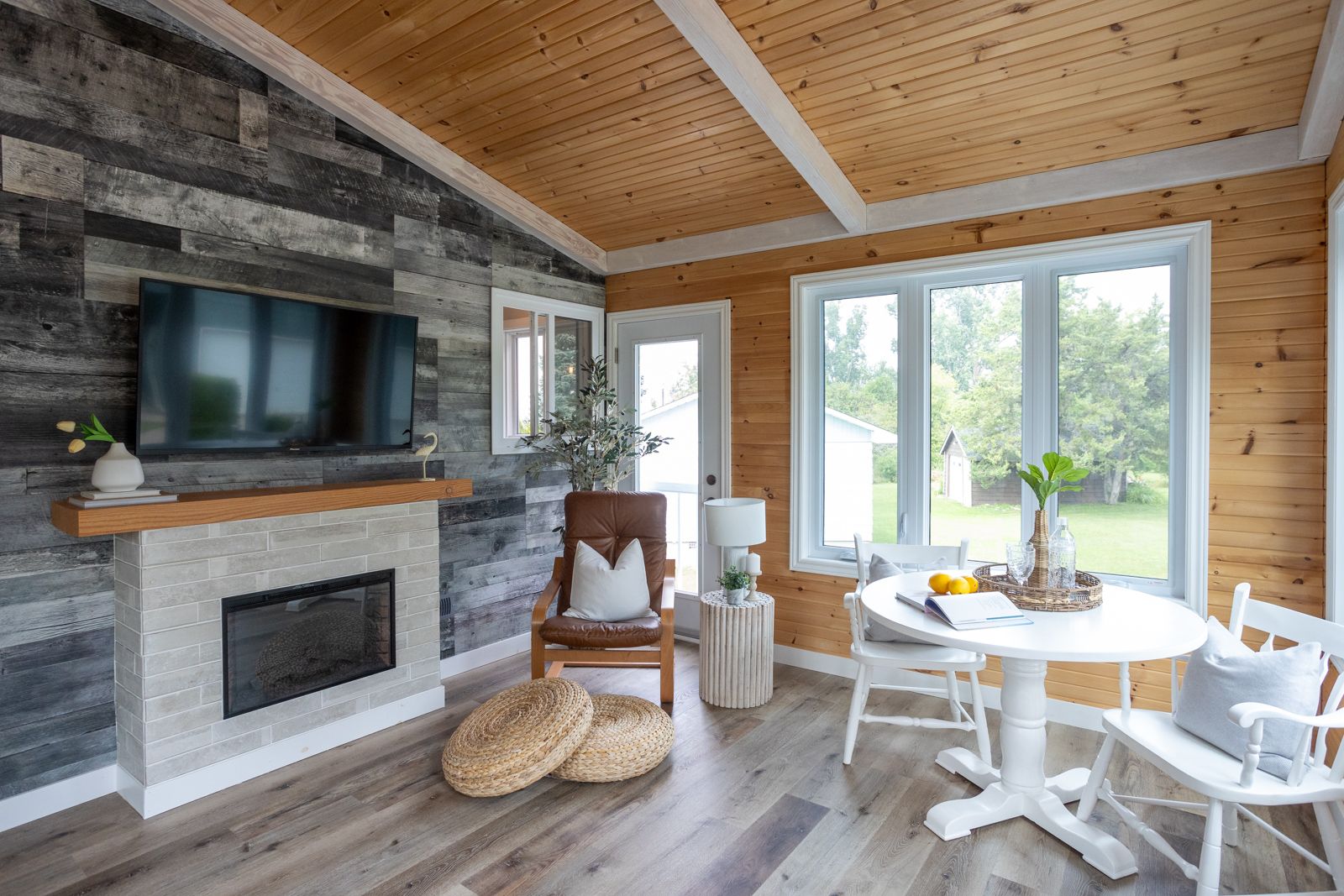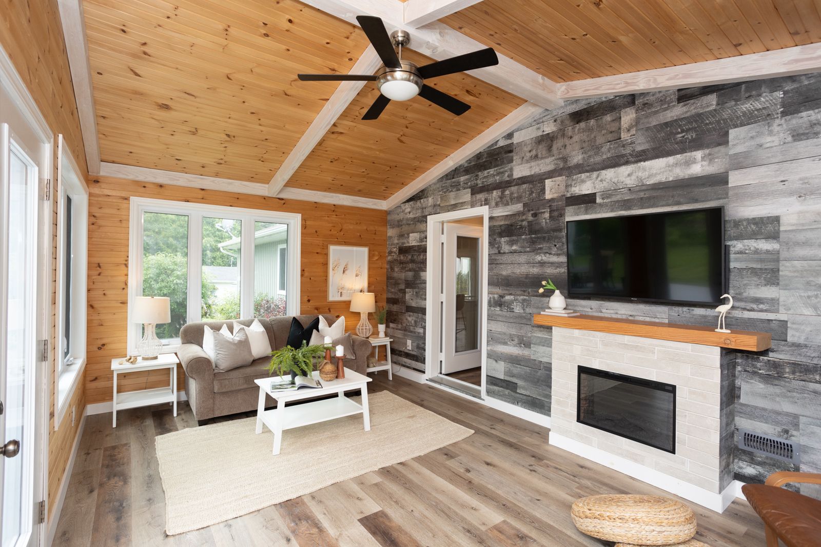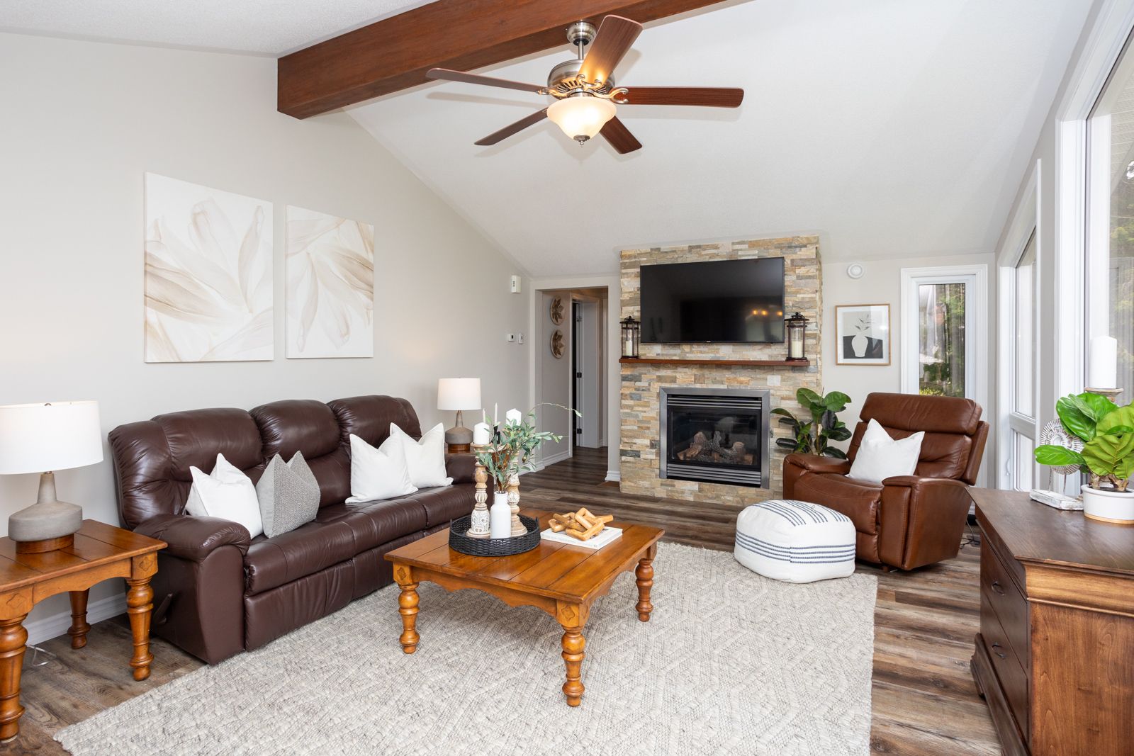 Fireplace, Cathedral Ceilings & A Frame Windows overlooking landscaping & Sunset Lake views. Two large Main Floor