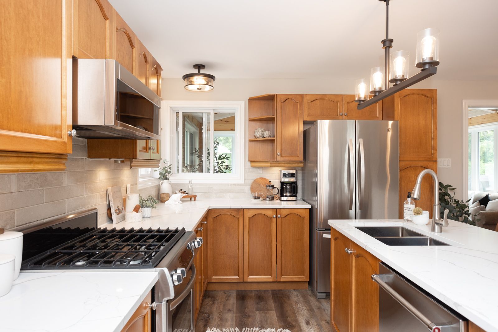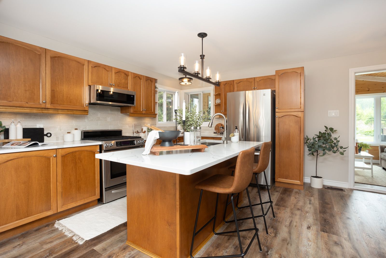 concept Kitchen w/ SS Appliances, quartz countertops, large island, w/ W/O to cozy fully insulated 4 Season Sunroom w/