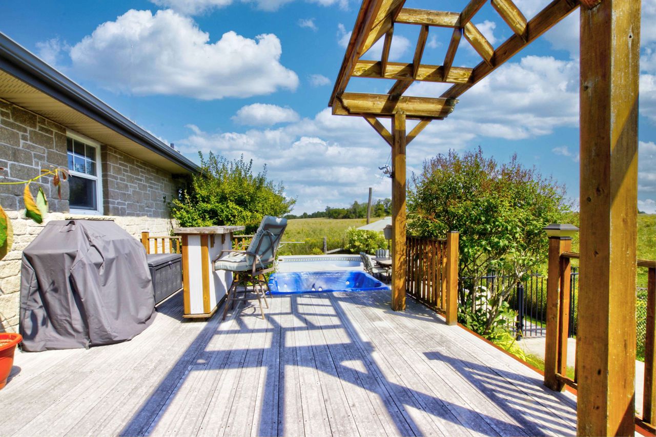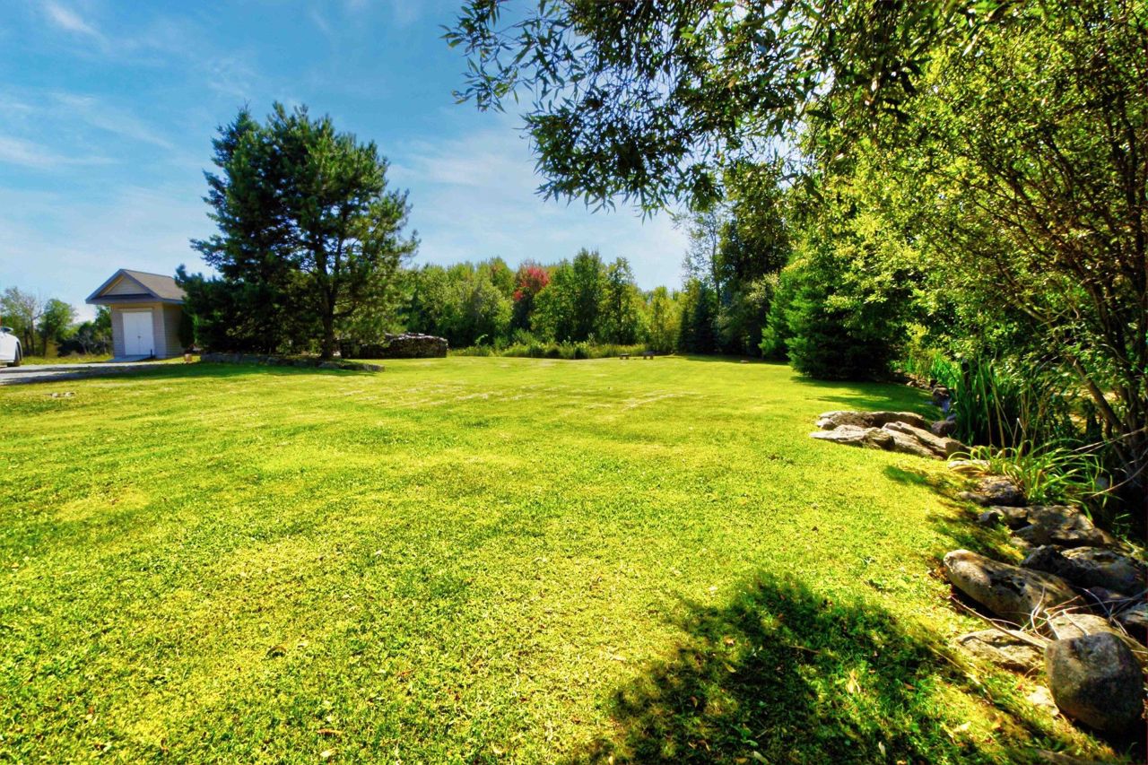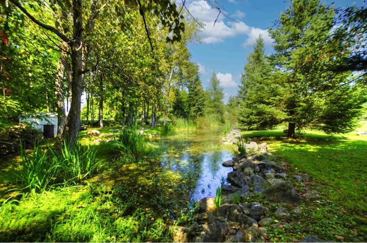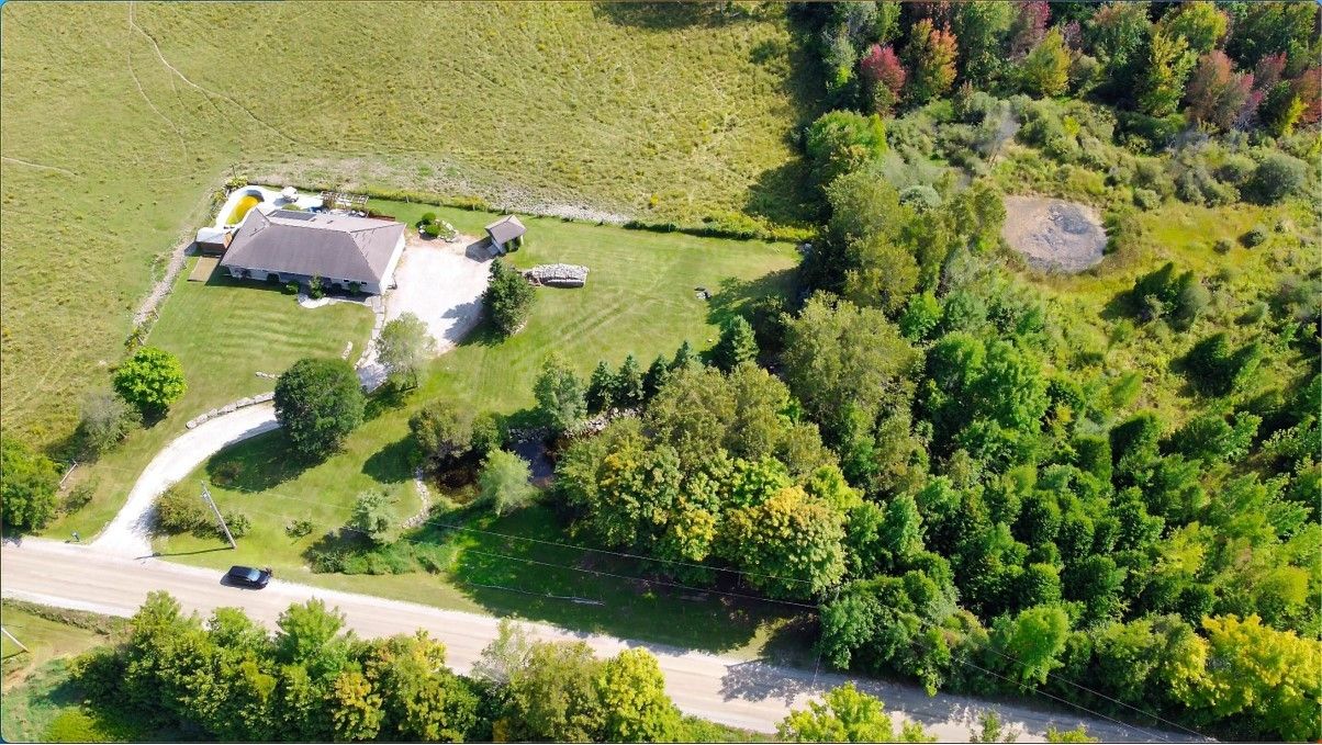 **Totally private 1.24 acre lot with mature trees and a scenic pond - surrounded by farm fields - great location - mins to Fenelon Falls & Lindsay**custom built home by respected local builder in 2001 - stone bungalow with fully finished bsmt* 3+ bdrms and 3 full baths* hardwood floors with vaulted ceiling - open concept* hand crafted cherry kitchen with center island with butcher block top and breakfast bar with walk-out to sun deck overlooking open farm land* sky lights* huge family rm with woodstove and bar* 26' Inground pool with 12'x 8' cabana* 43' sundeck* Extensive limestone landscaping plus 150' spring fed pond and mature evergreens* 2 garden sheds* Oversized attached garage measuring 33'x 21' with entry into house and separate entrance to finished basementRecently updated oil tank